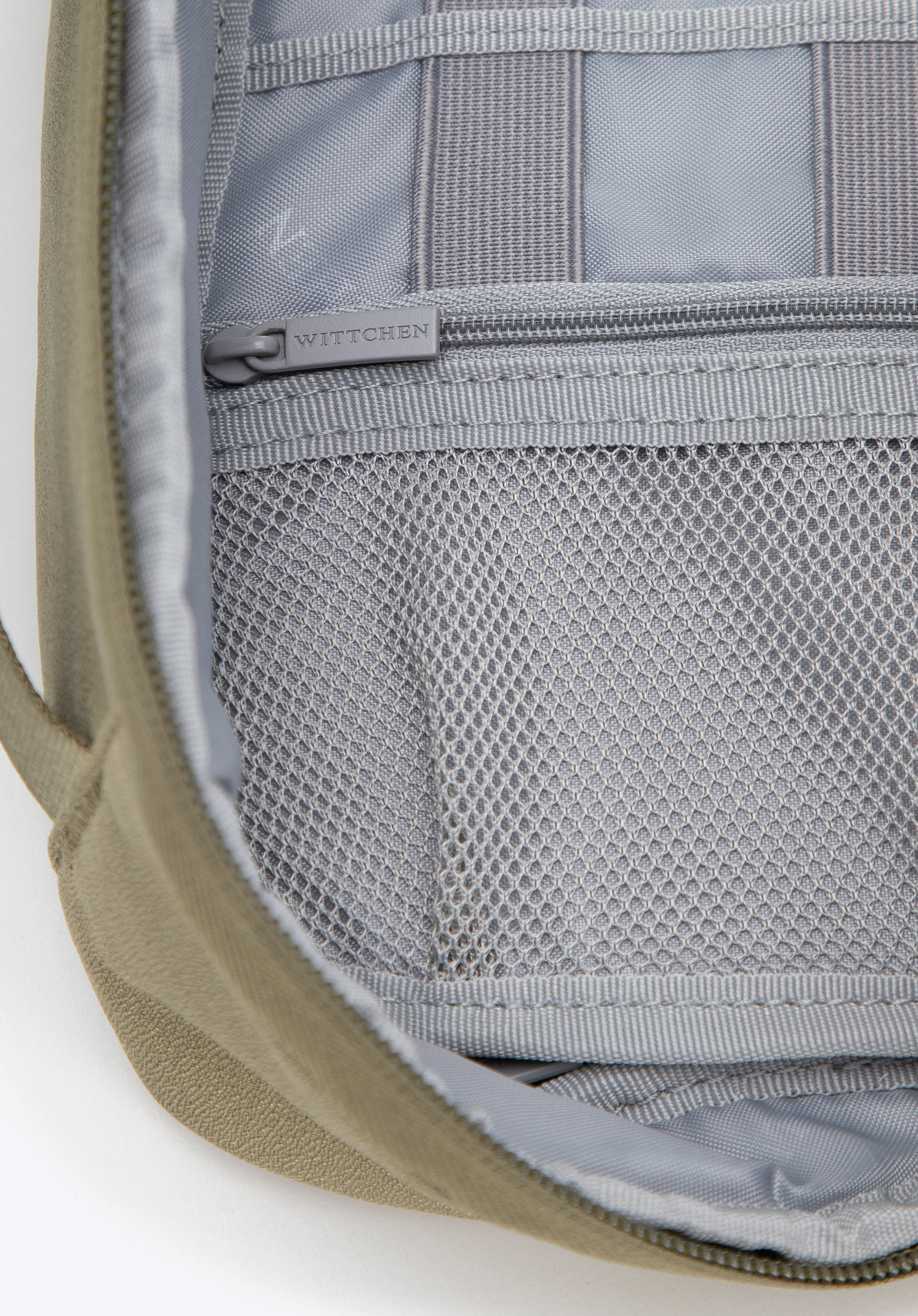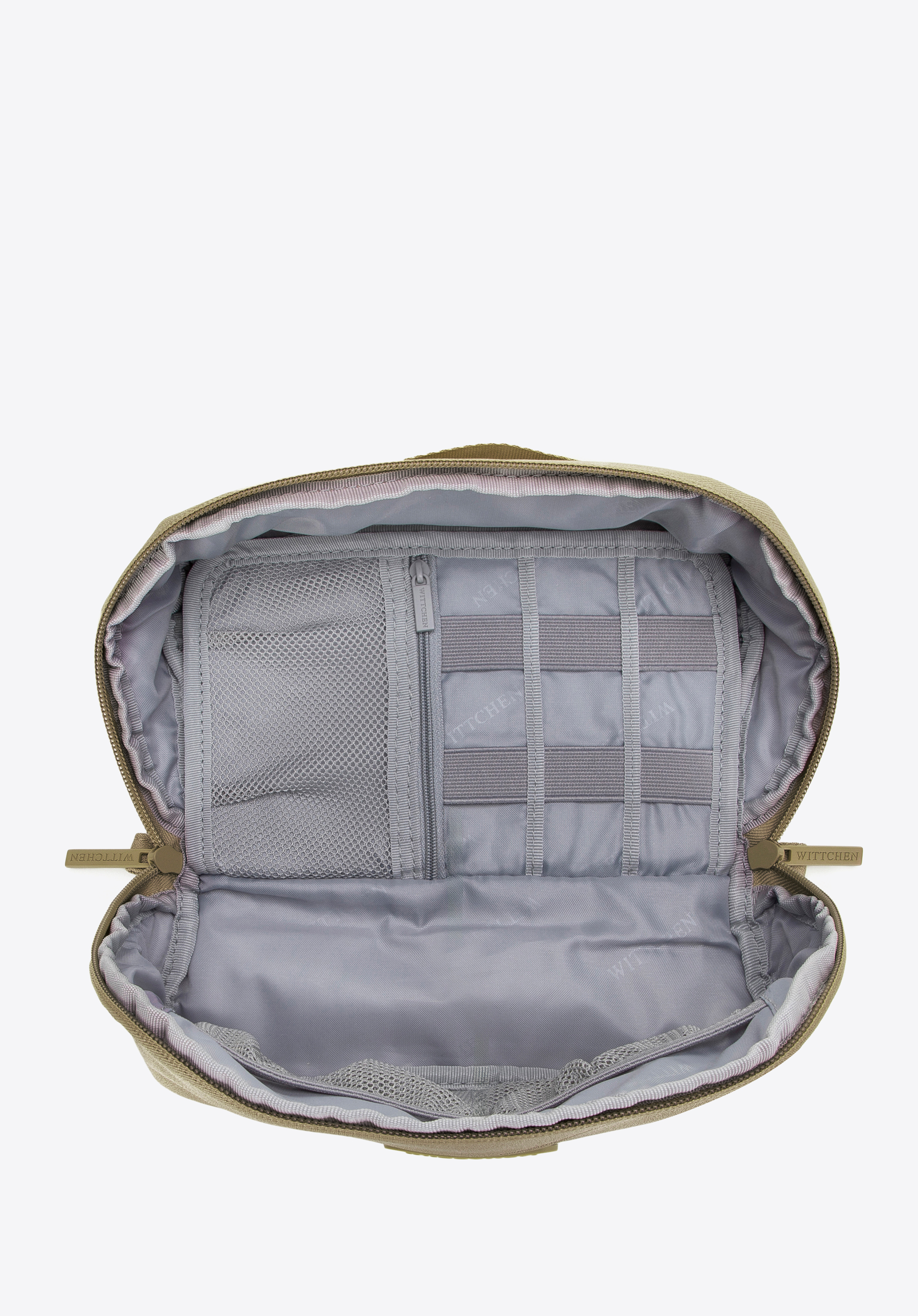 - Kieszenie: Pierwsza część zawiera jedną kieszeń siatkowaną na suwak oraz dwie dodatkowe otwarte kieszonki po drugiej stronie. Obok znajduje się sześć gumowych przeszyć idealnych do przechowywania ładowarek, kabli czy słuchawek.
