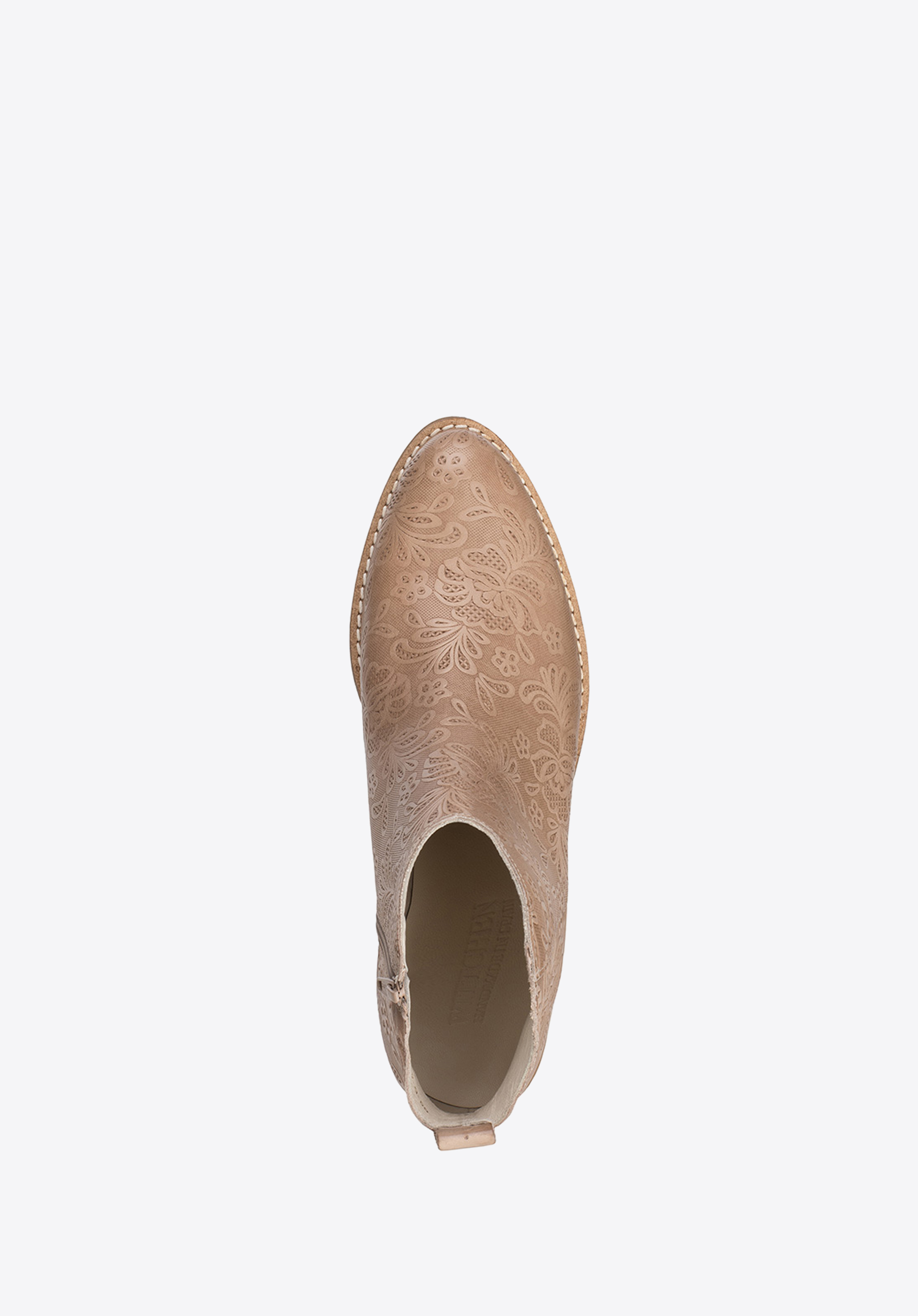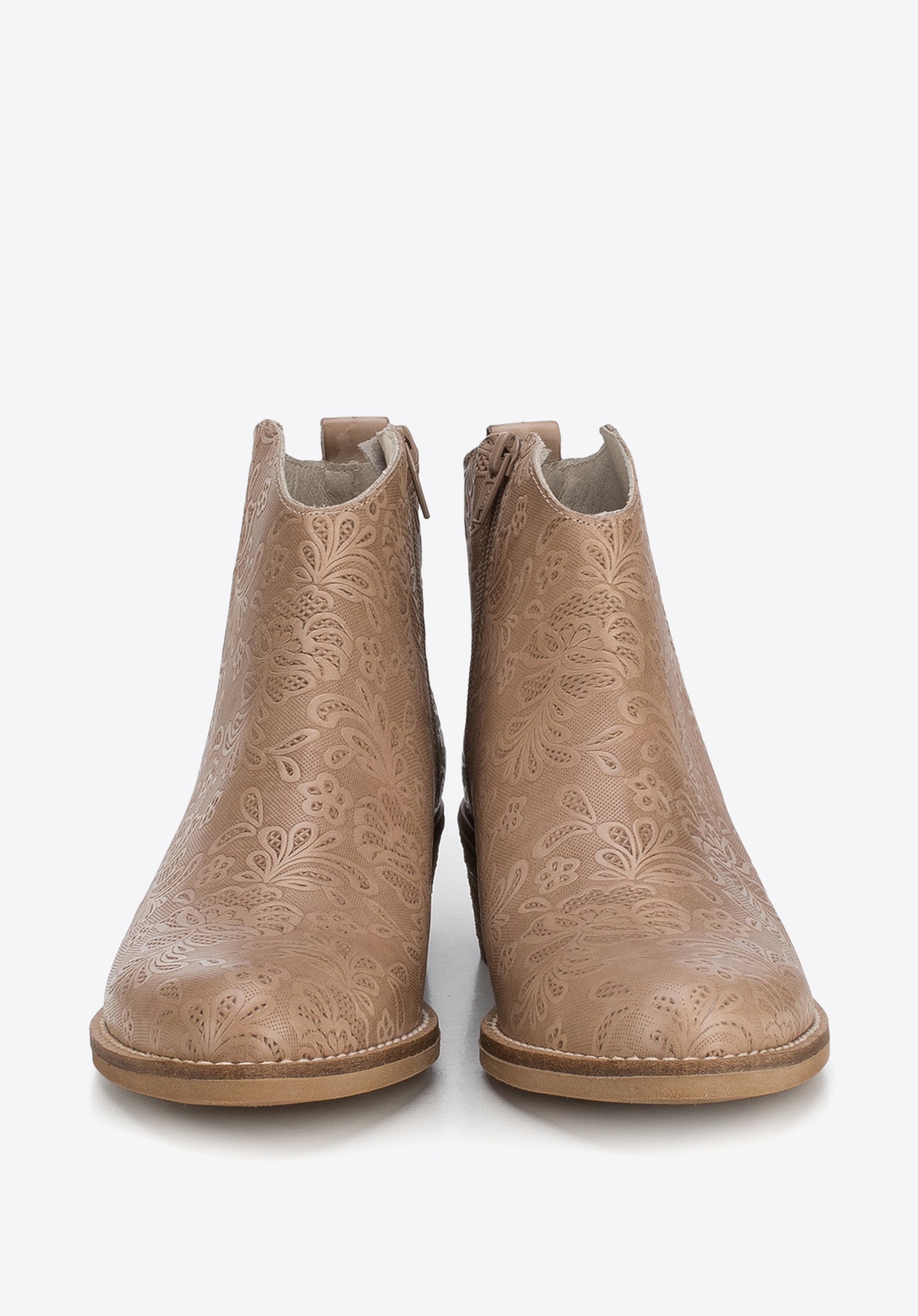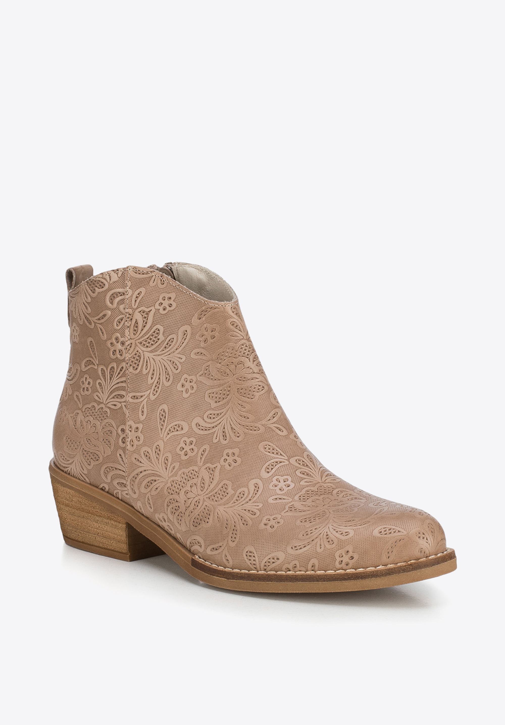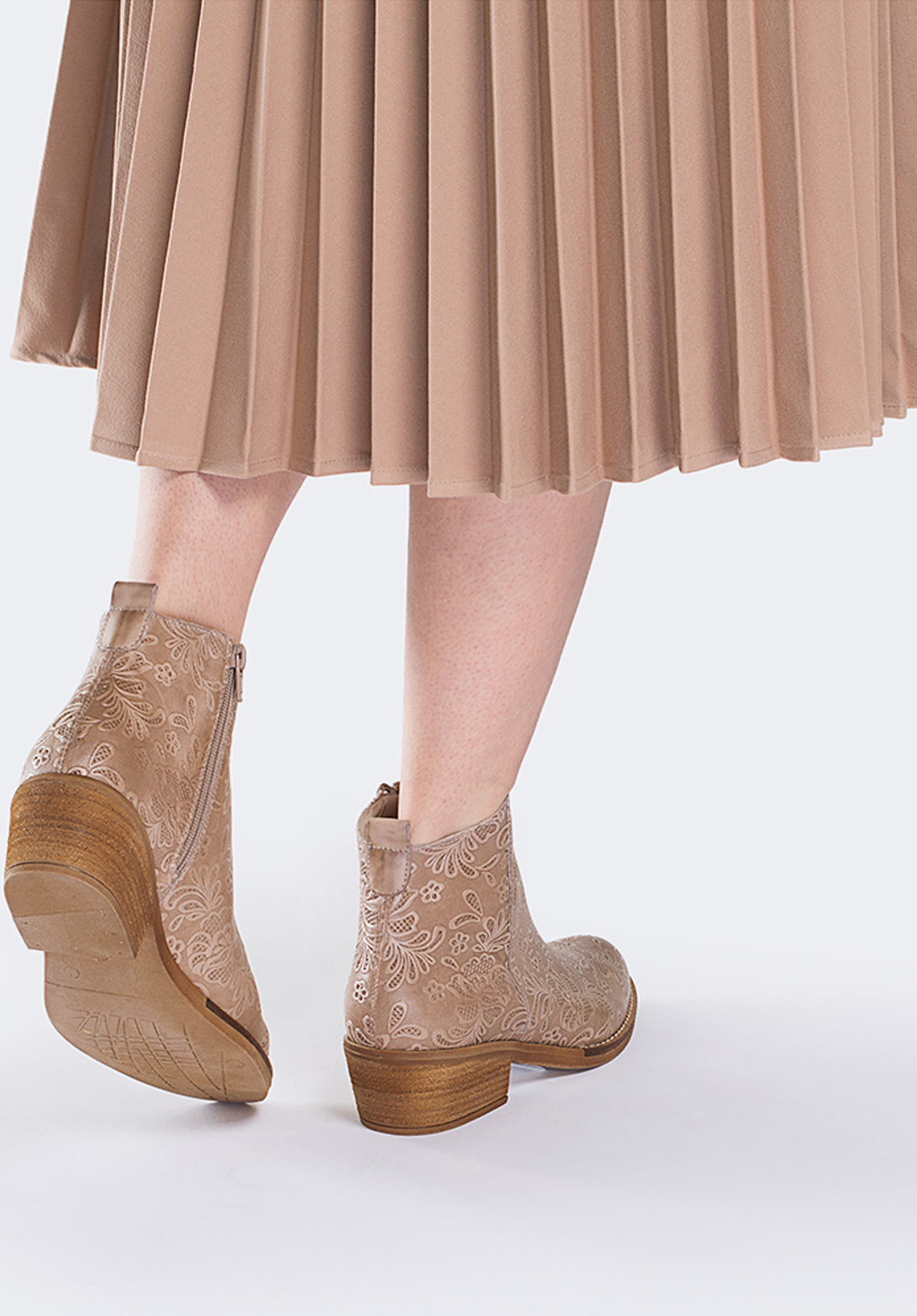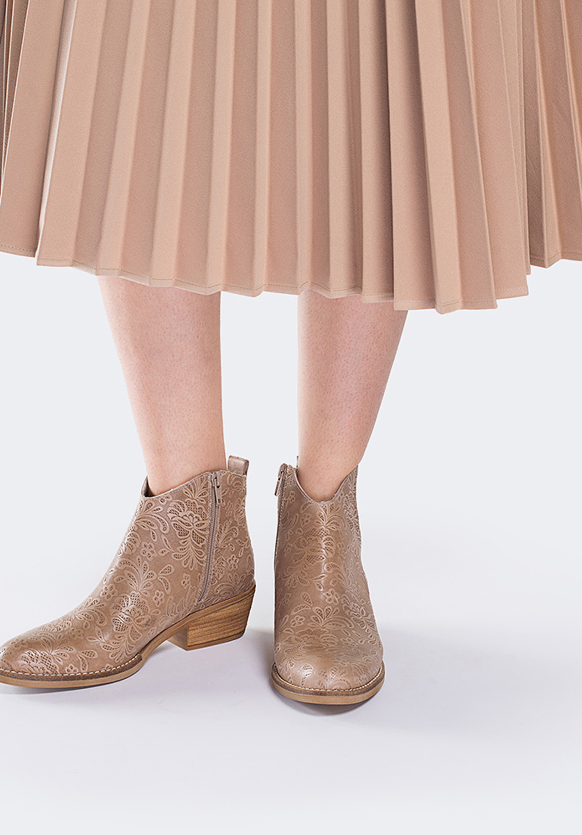 kwiecistą fakturą przeplataną drobną krateczką. Ponadczasowy model w czarnym lub jasnobrązowym odcieniu, z podwyższoną cholewką i funkcjonalnym suwakiem. Bardzo wygodne i praktyczne dzięki swojej precyzyjnie wyprofilowanej wkładce i niezbyt wysokim obcasom.