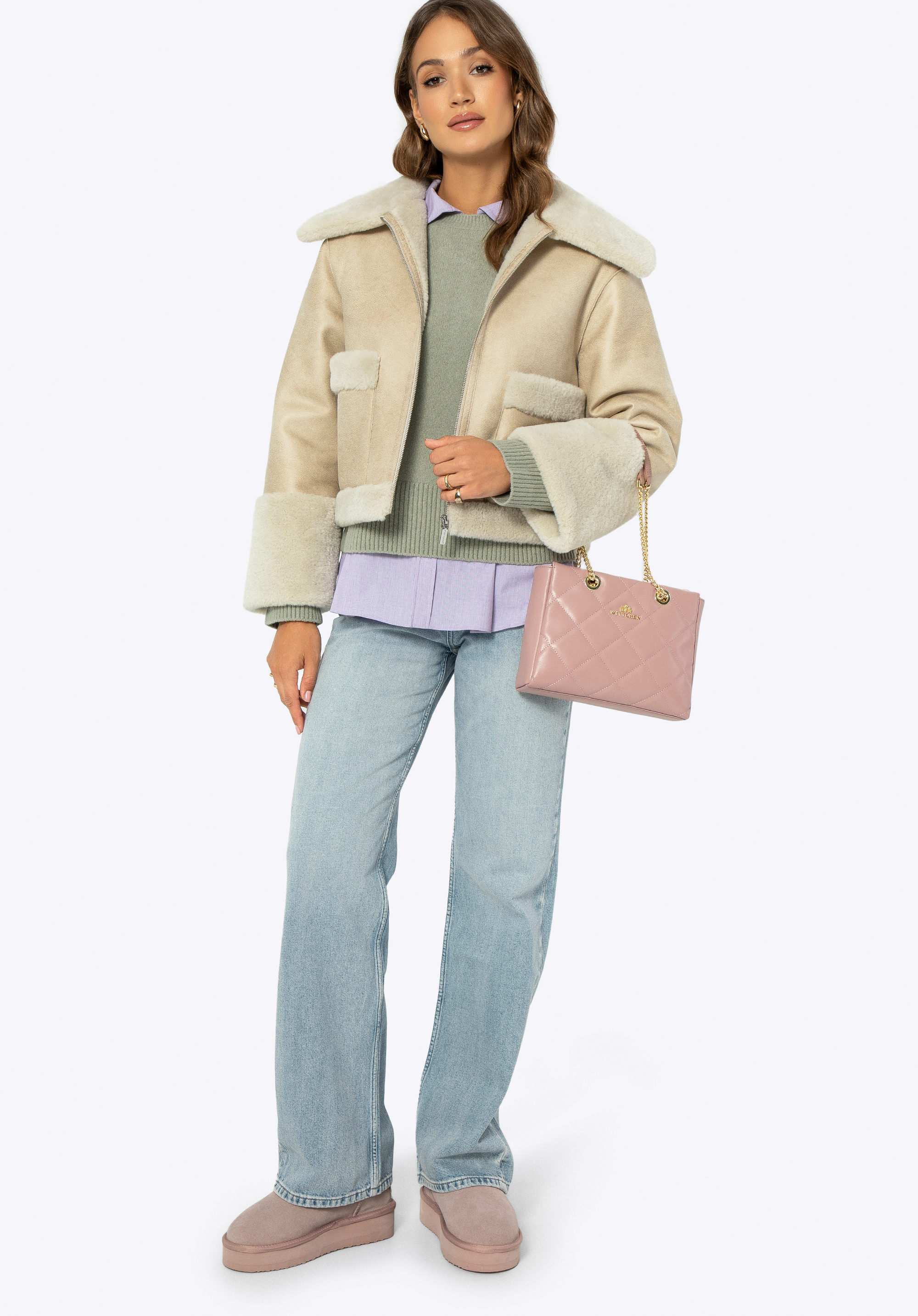 Oto nasza najnowsza propozycja dla miłośniczek elegancji i funkcjonalności – damska kurtka z imitacją futerka, która nie tylko zapewnia ciepło, ale także wzbogaca Twoją garderobę o niepowtarzalny styl. Naszą kurtkę wyróżnia wyściełany kołnierz, zapewniający dodatkową ochronę przed wiatrem i chłodem oraz gwarantujący komfort nawet w najbardziej nieprzewidywalne pogodowo dni. Sztuczne futro dodaje nie tylko elegancji, ale także wygody, co sprawia, że jest idealna na zimowe spacery i wieczorne wyjścia. Kurtka jest zapinana na suwak i posiada dwie prostokątne kieszenie, które z pewnością przypadną do gustu wszystkim, którzy cenią sobie funkcjonalność. Idealne na klucze, telefon czy drobne przedmioty, które chcesz mieć zawsze pod ręką.