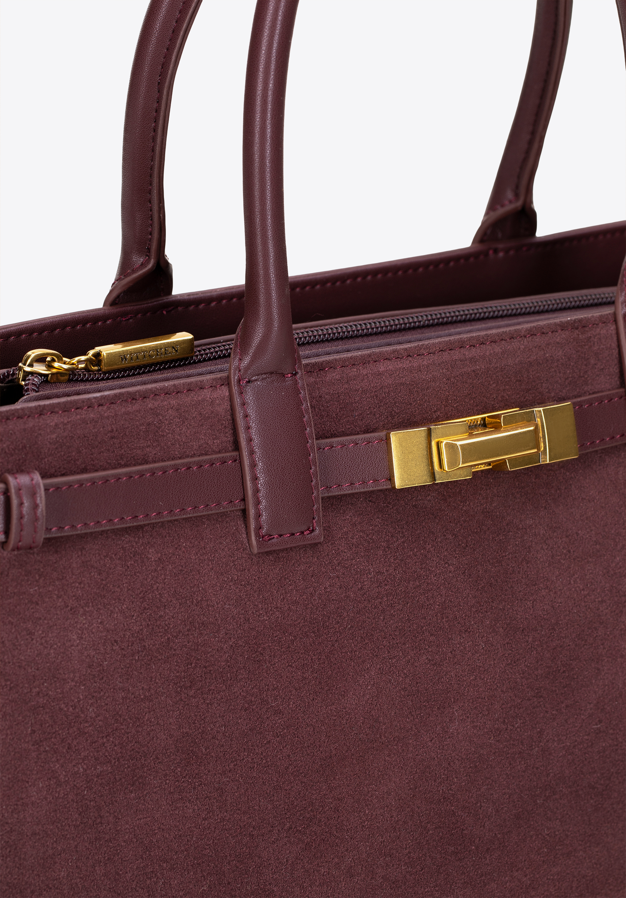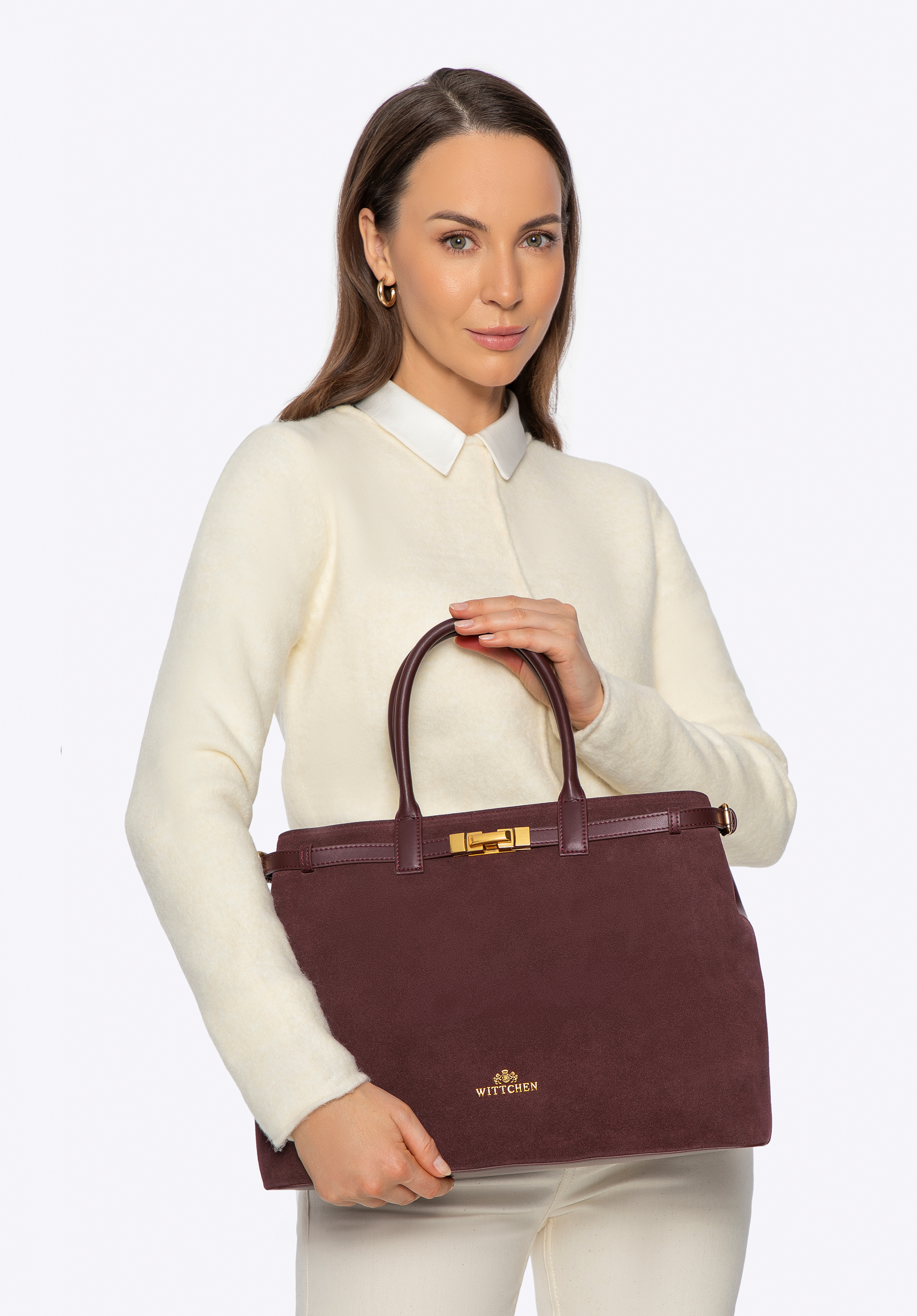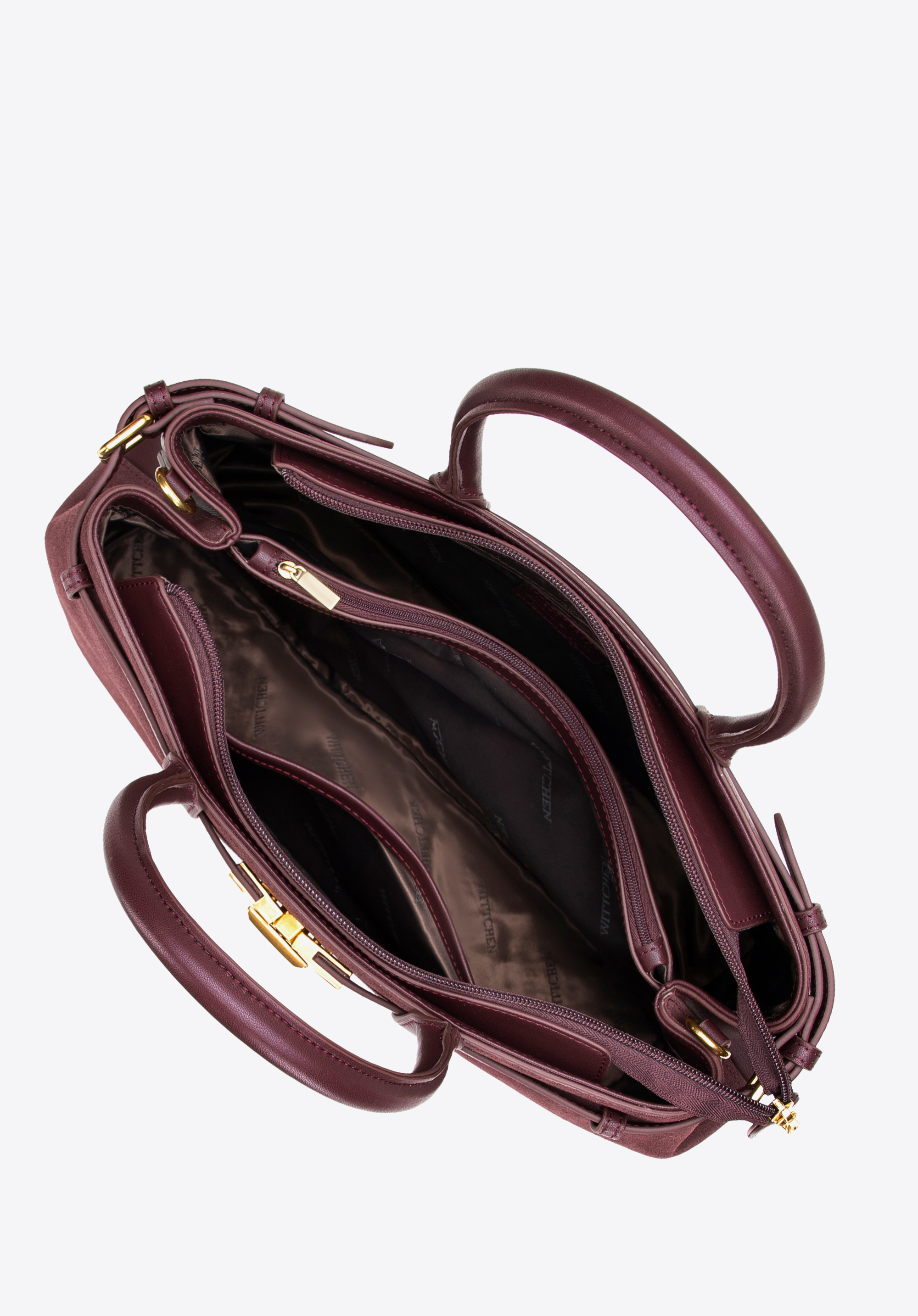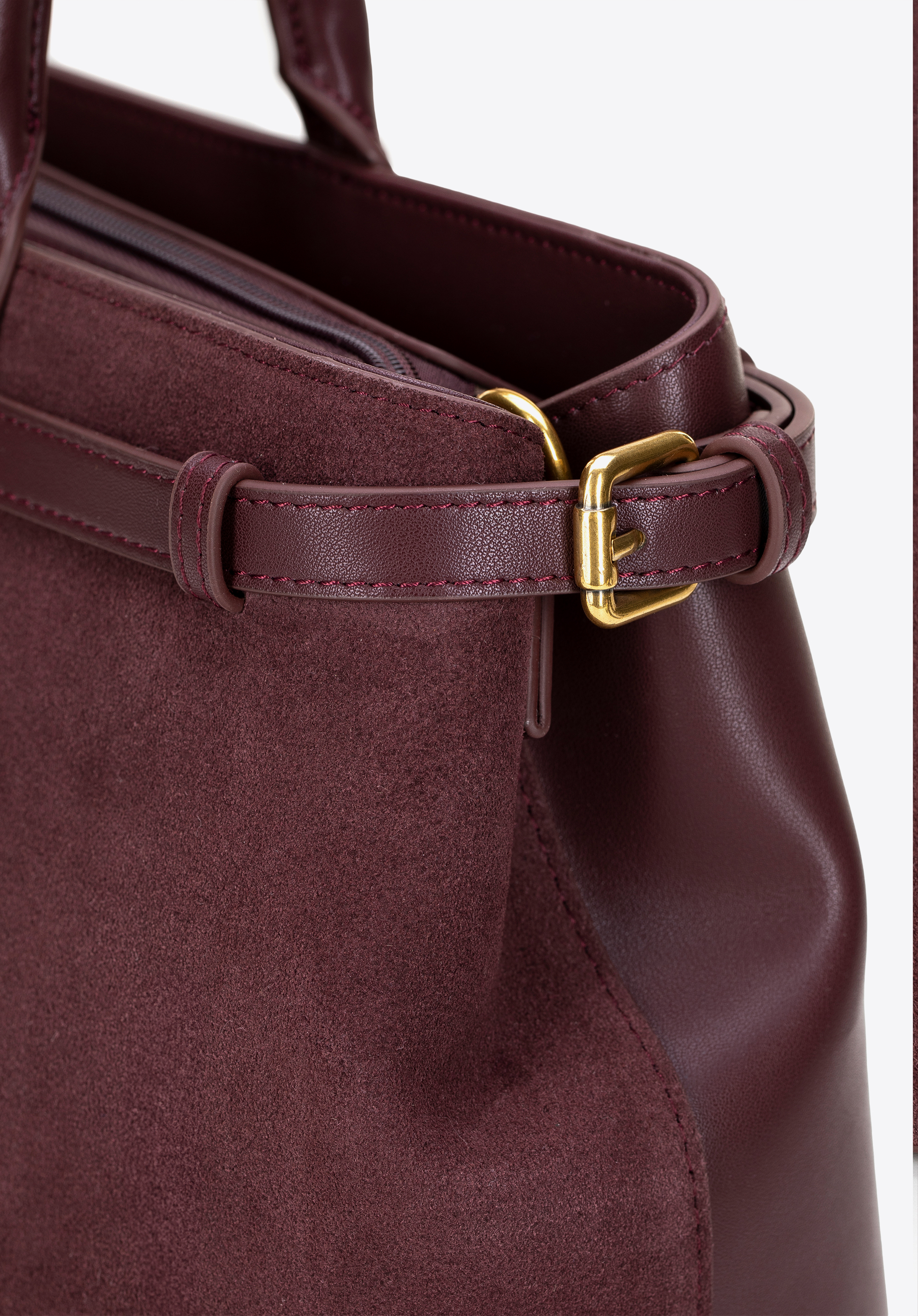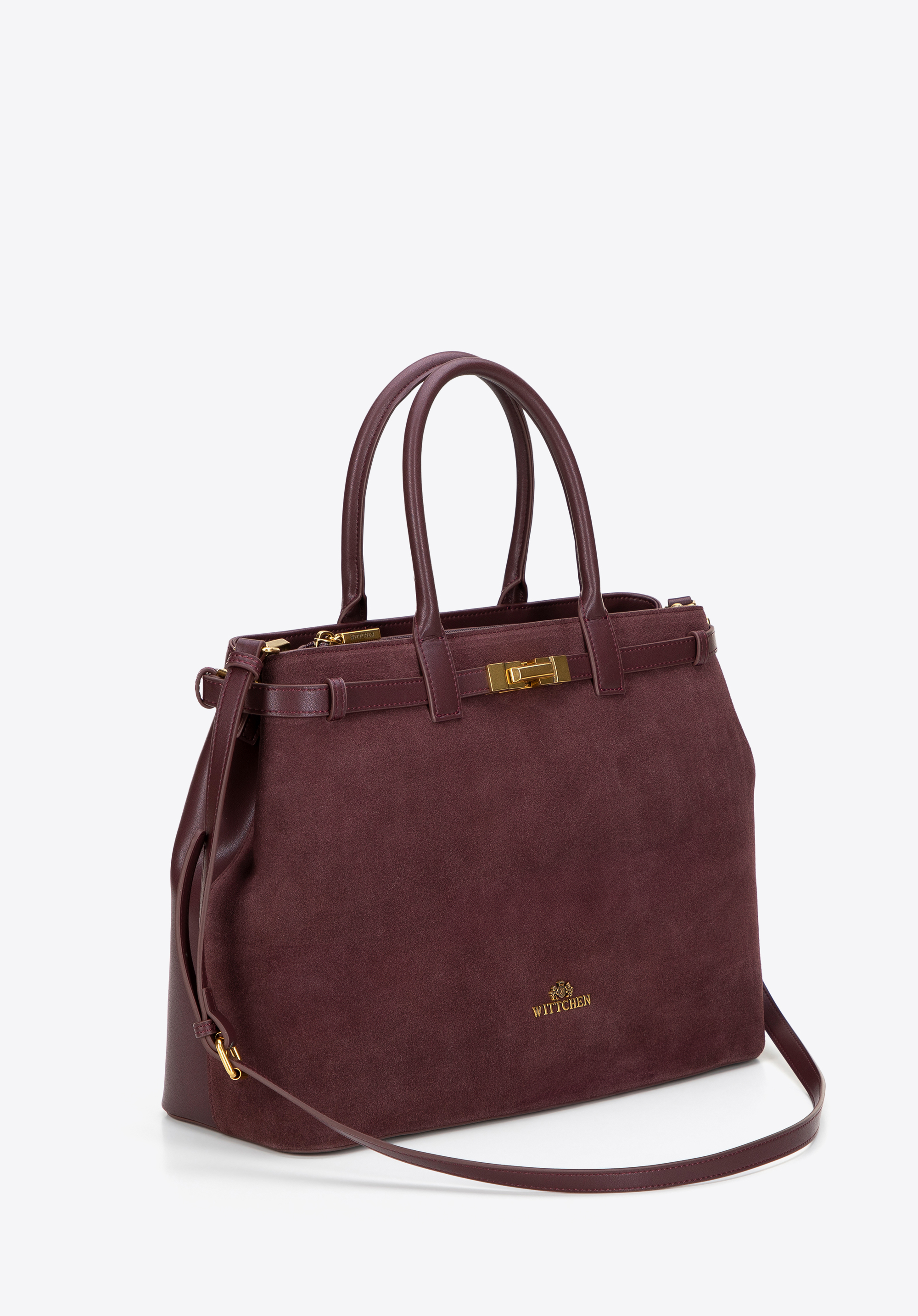 - Materiał: Przód torby ze skóry zamszowej nadaje kuferkowi miękkości i elegancji, a reszta korpusu z gładkiej skóry naturalnej zapewnia trwałość i dopracowany wygląd. Rączki, odpinany pasek, dno torebki, wewnętrzne wykończenia oraz dekoracyjny pasek wykonano z mikrofibry, gwarantującej komfort noszenia.