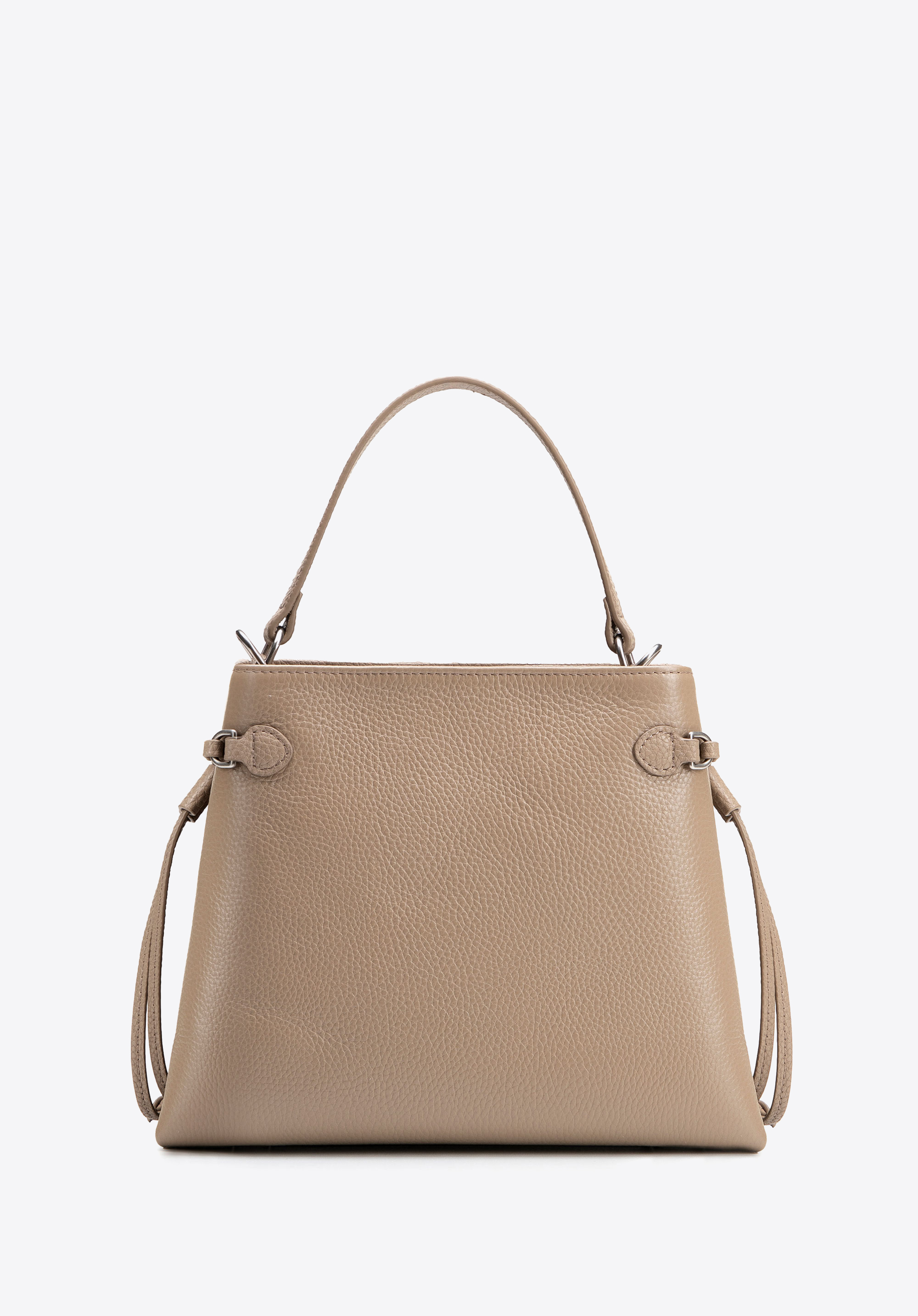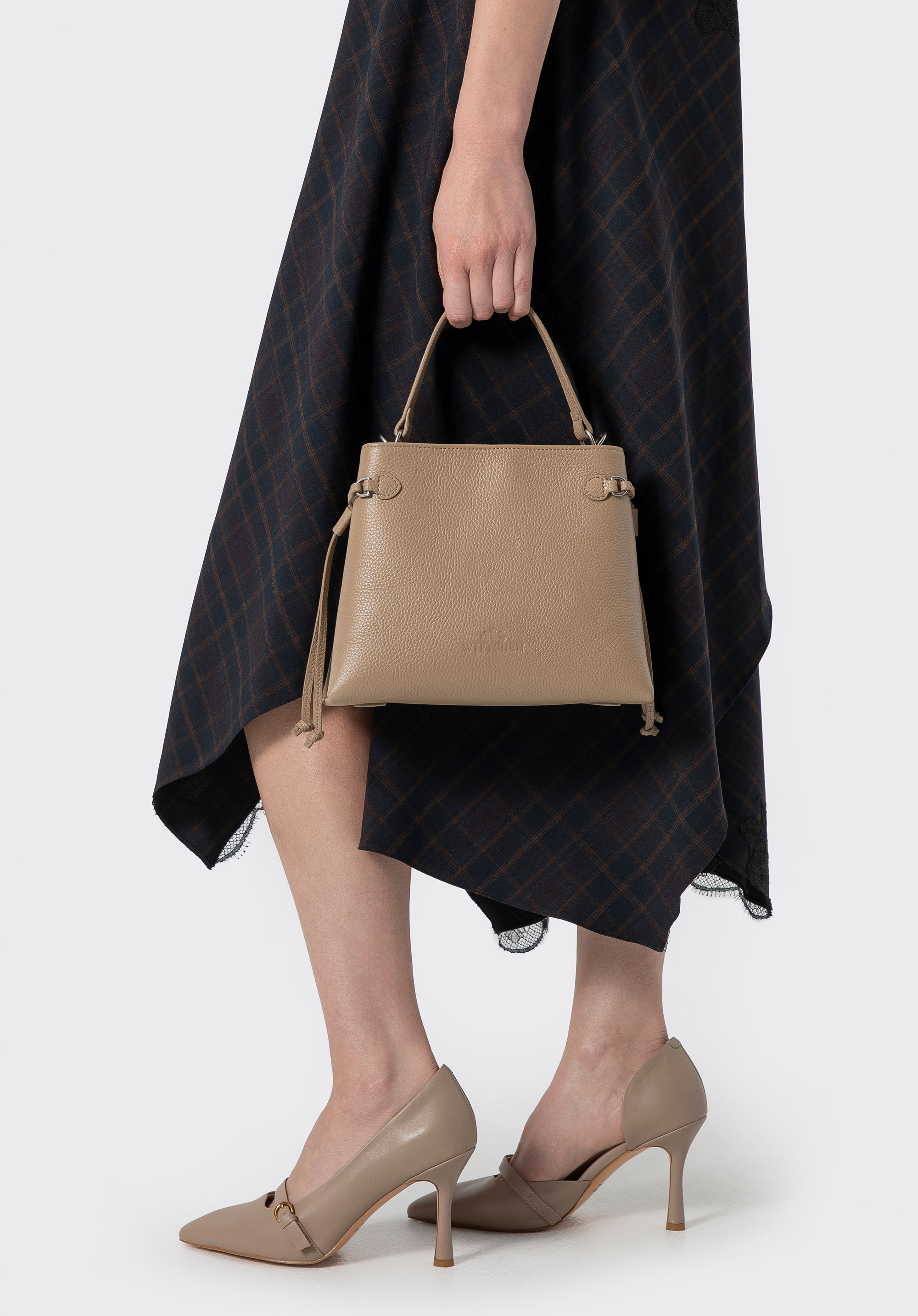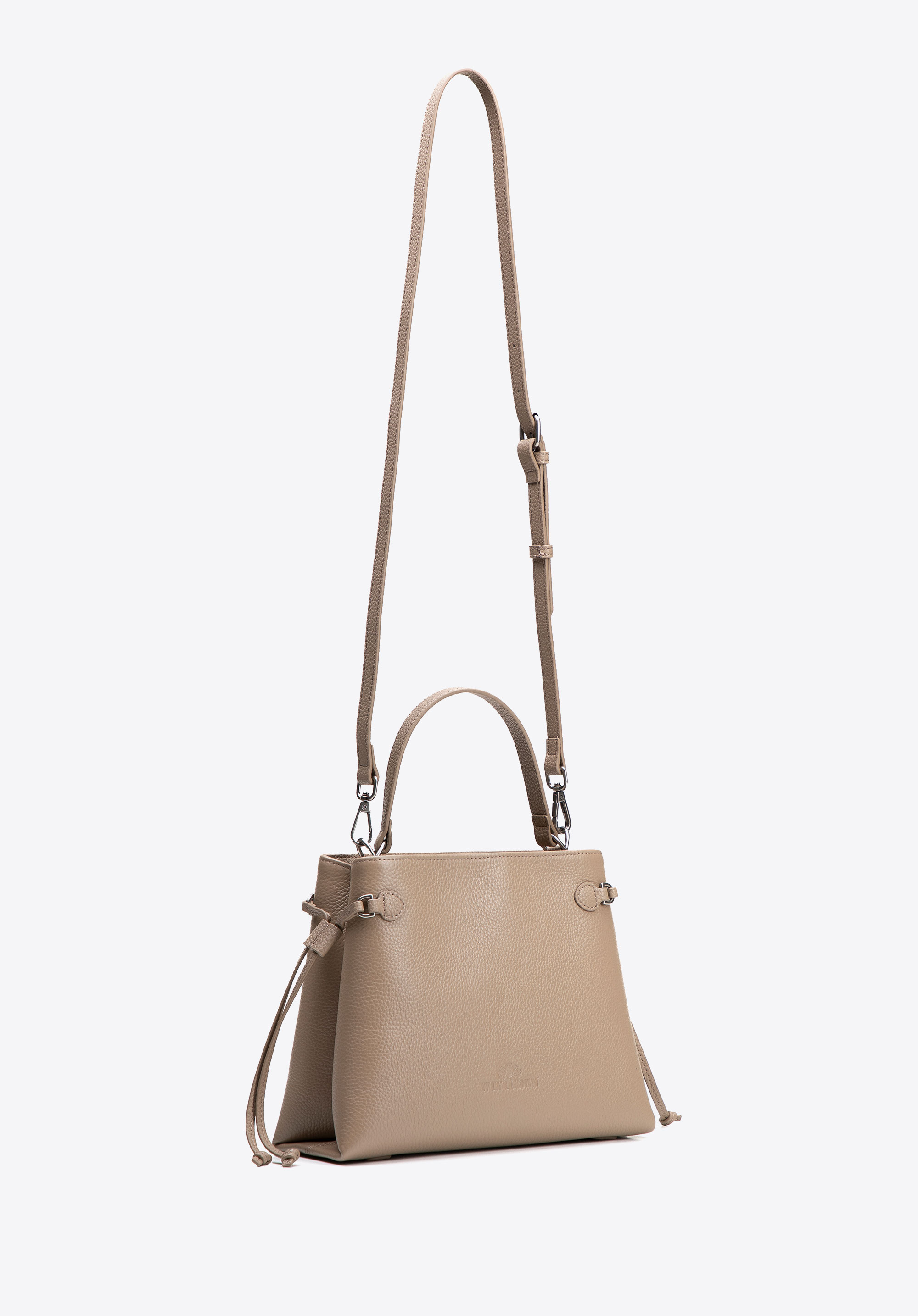 - Materiał: Korpus wykonany z wysokiej jakości skóry naturalnej, natomiast rączka, pasek i wewnętrzne wykończenia — z imitacji skóry, co zapewnia elegancki wygląd przy zachowaniu lekkości.