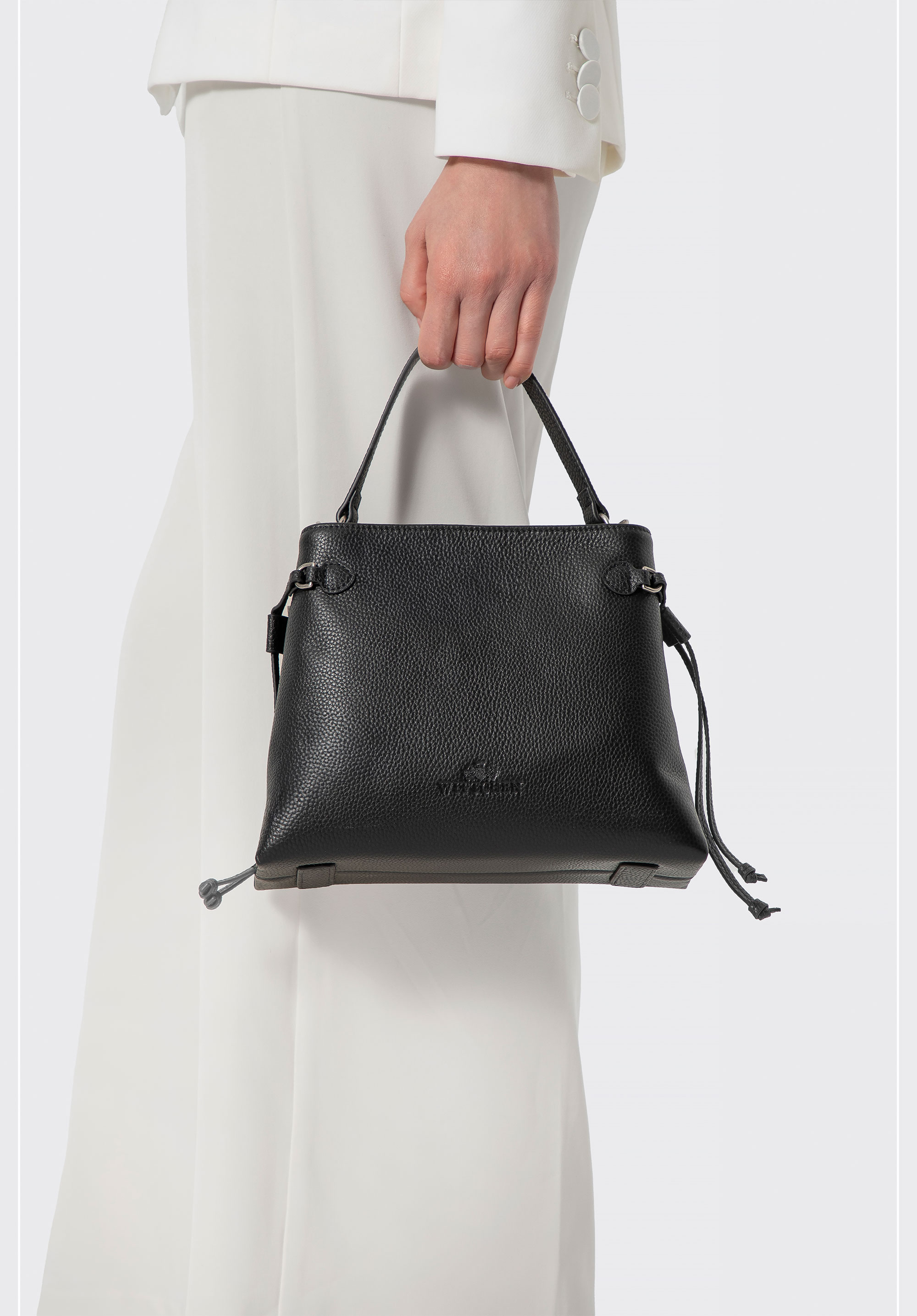 - Wyjątkowe detale: Tłoczone logo producenta na froncie oraz na suwakach podkreśla luksusowy charakter torebki, a dekoracyjne troczki po bokach dodają jej lekkości i modowego akcentu.