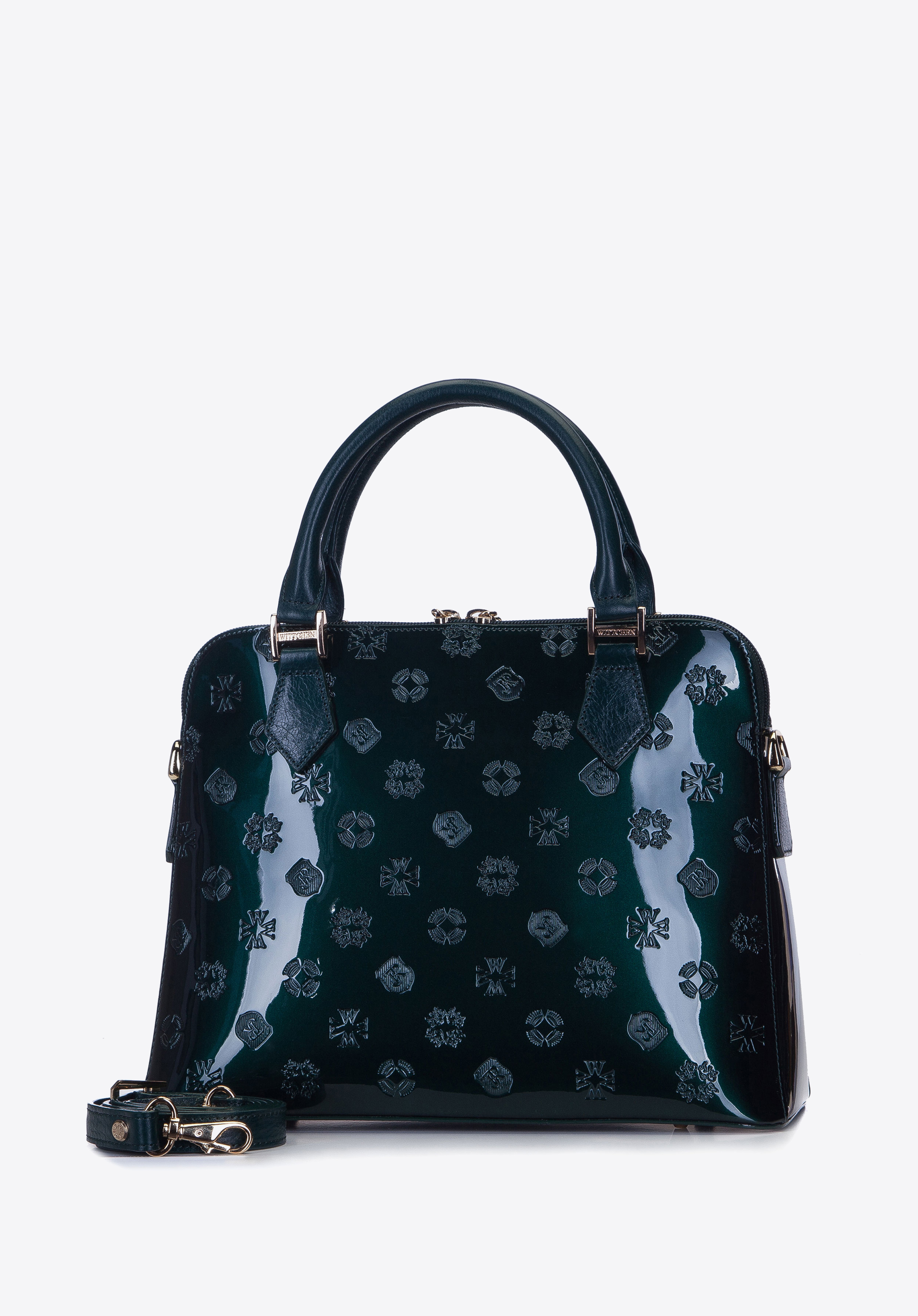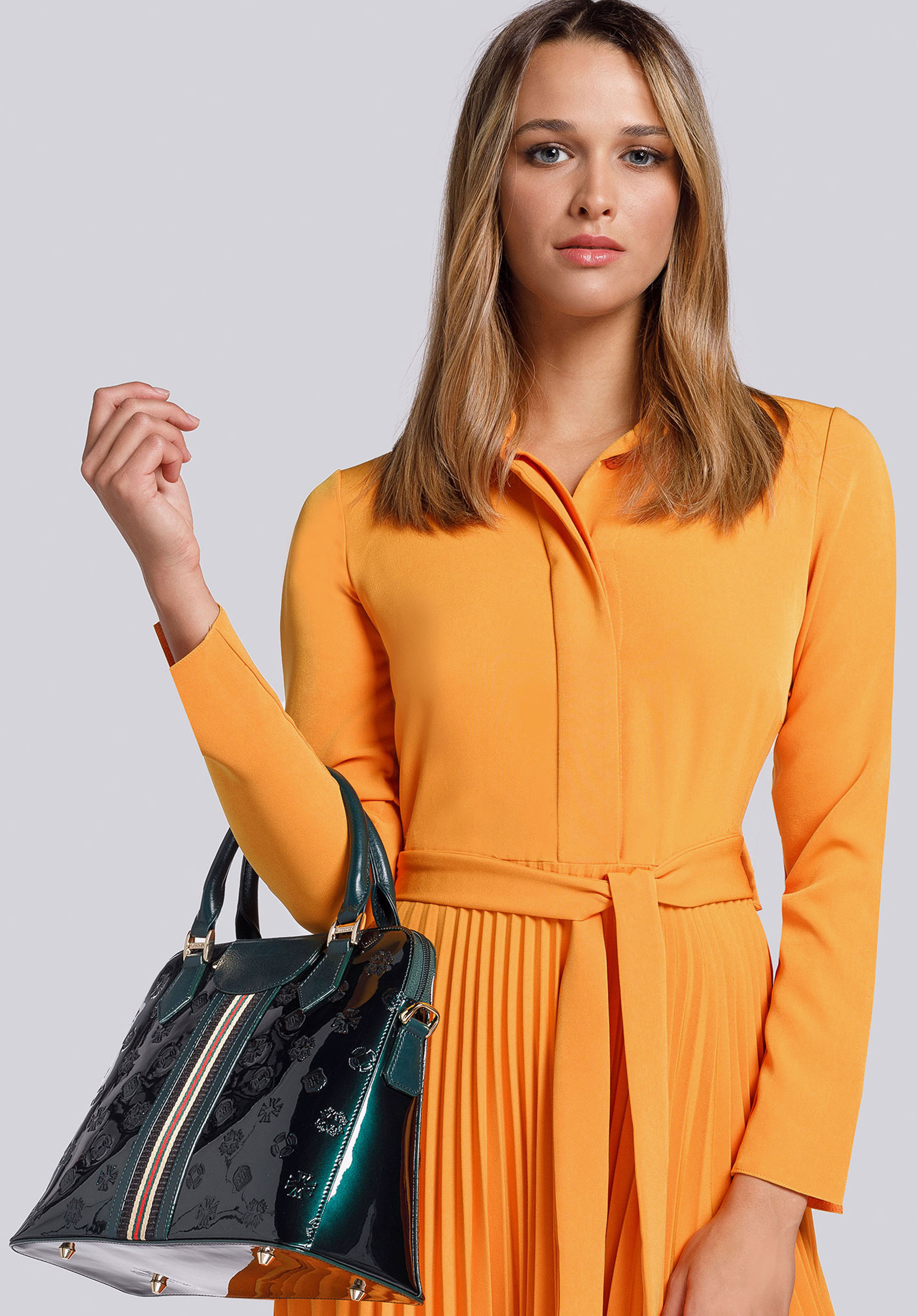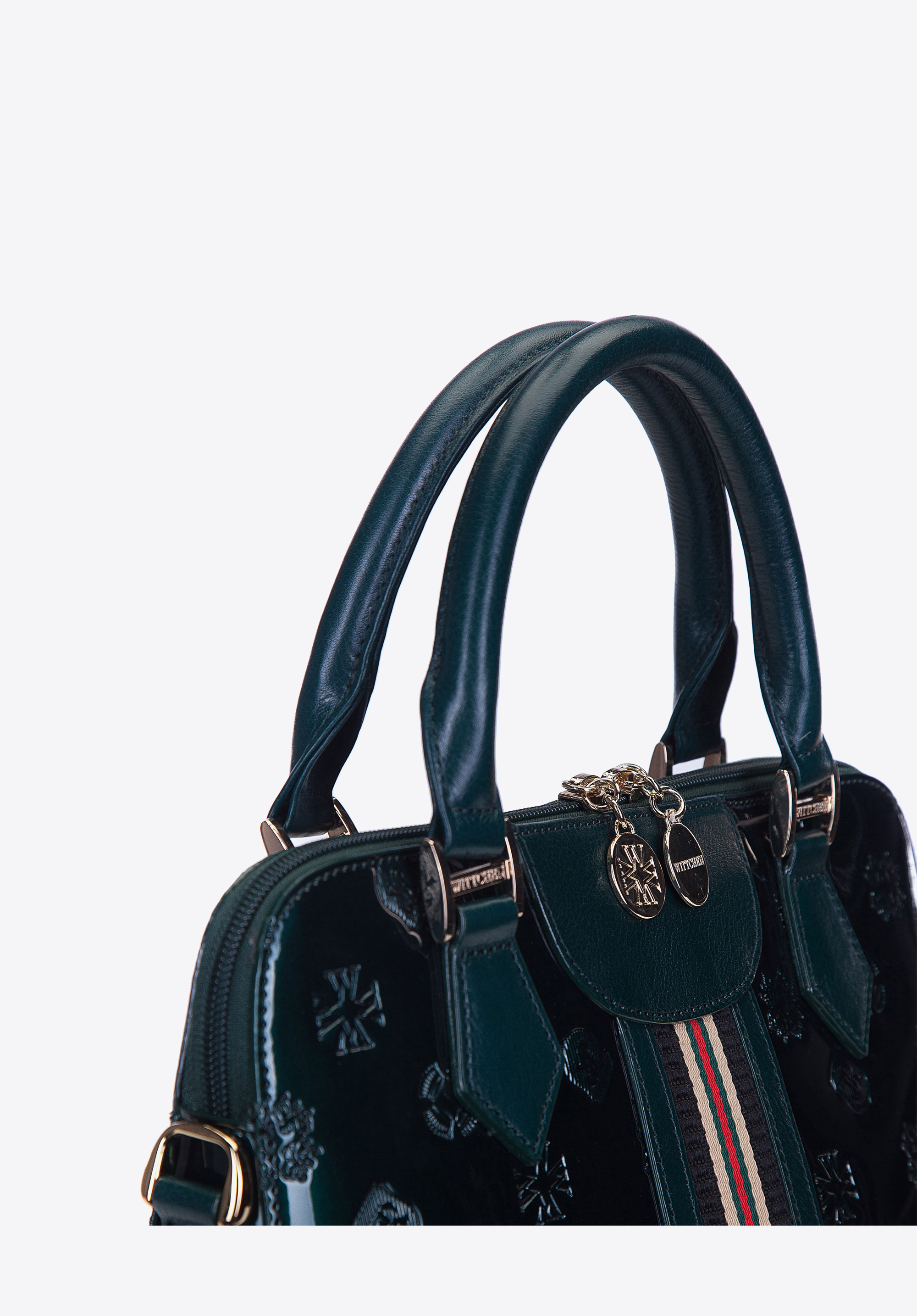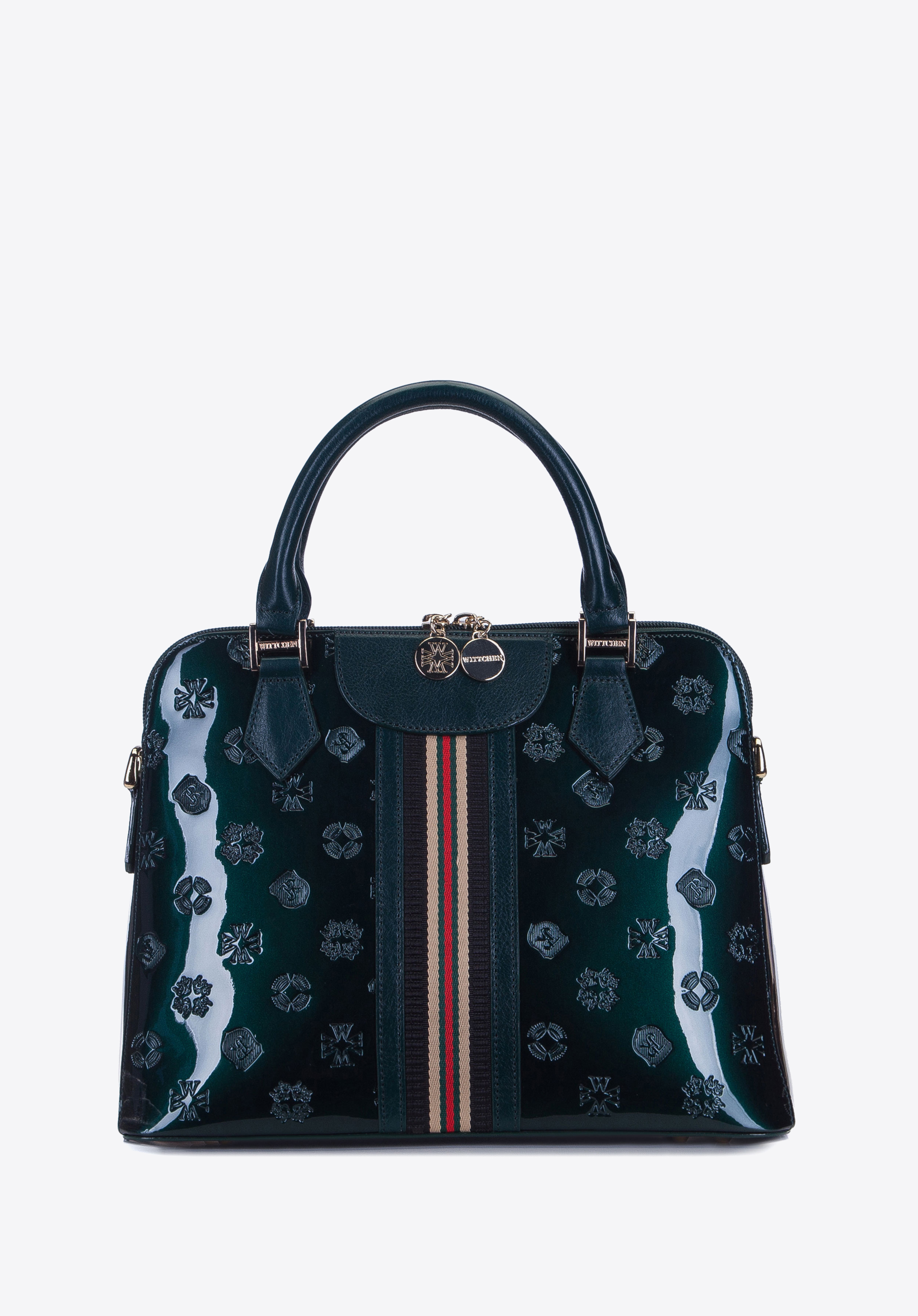 Torebka o pięknym połysku dla pań, które chętnie noszą do swoich stylizacji nietuzinkowe dodatki z klasą. Wartość wizerunkową modelu stanowi nie tylko usztywniona skóra lakierowana, przyciągająca wzrok tłoczonym monogramem charakterystycznym dla kultowej linii Signature, lecz także głęboka kolorystyka okraszona złotymi okuciami. Na pierwszy plan spośród wszystkich akcentów ozdobnikowych, nasi projektanci wysunęli kolorowy lampas. W ten sposób przełamali nieco tradycyjny ton i nadali całości nowoczesnego sznytu. Wewnątrz znajdują się bardzo praktyczne trzy kieszenie, z których jedna zamyka się na suwak. W niej znajdziesz wystarczająco dużo miejsca, aby wszystkie drobiazgi i cenne rzeczy były zabezpieczone. Kuferek ze skóry z lampasem i tłoczeniami wpisze się w ponadczasowy anturaż każdej pory roku, podkreślając elegancki charakter Twojej garderoby.
