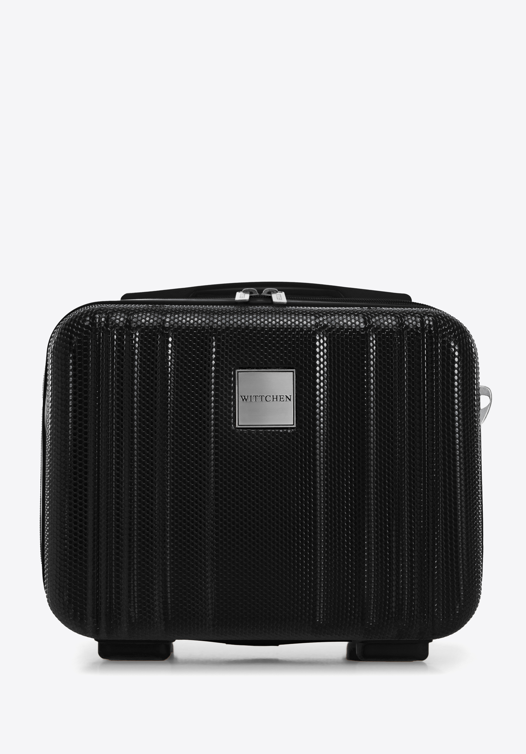 - Kosmetyczka: Wyposażona w uchwyt do przenoszenia, odpinany i regulowany pasek na ramię oraz elastyczny pas umożliwiający zamocowanie na rączce walizki.