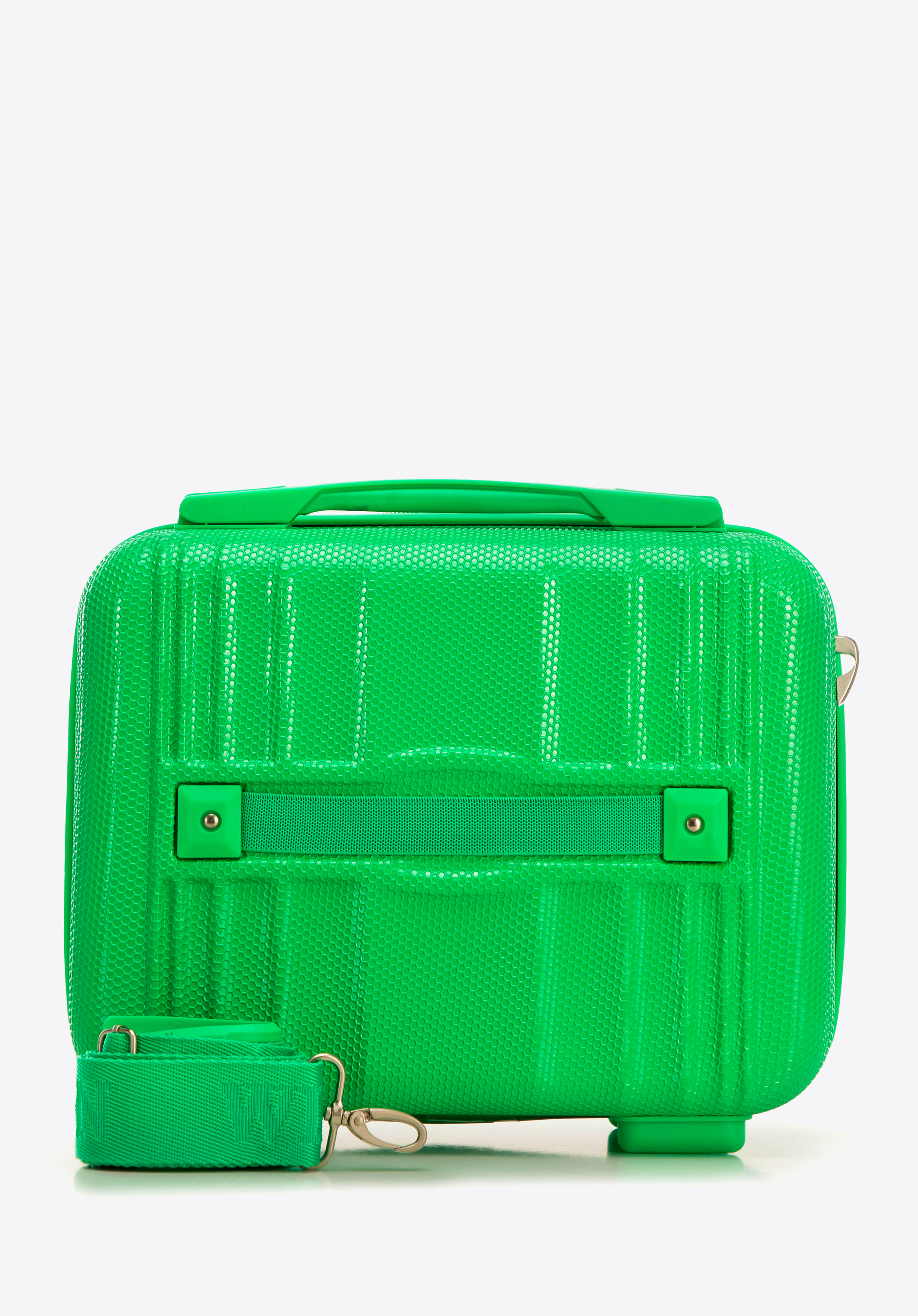 - Kosmetyczka: Wyposażona w uchwyt do przenoszenia, odpinany i regulowany pasek na ramię oraz elastyczny pas umożliwiający zamocowanie na rączce walizki.