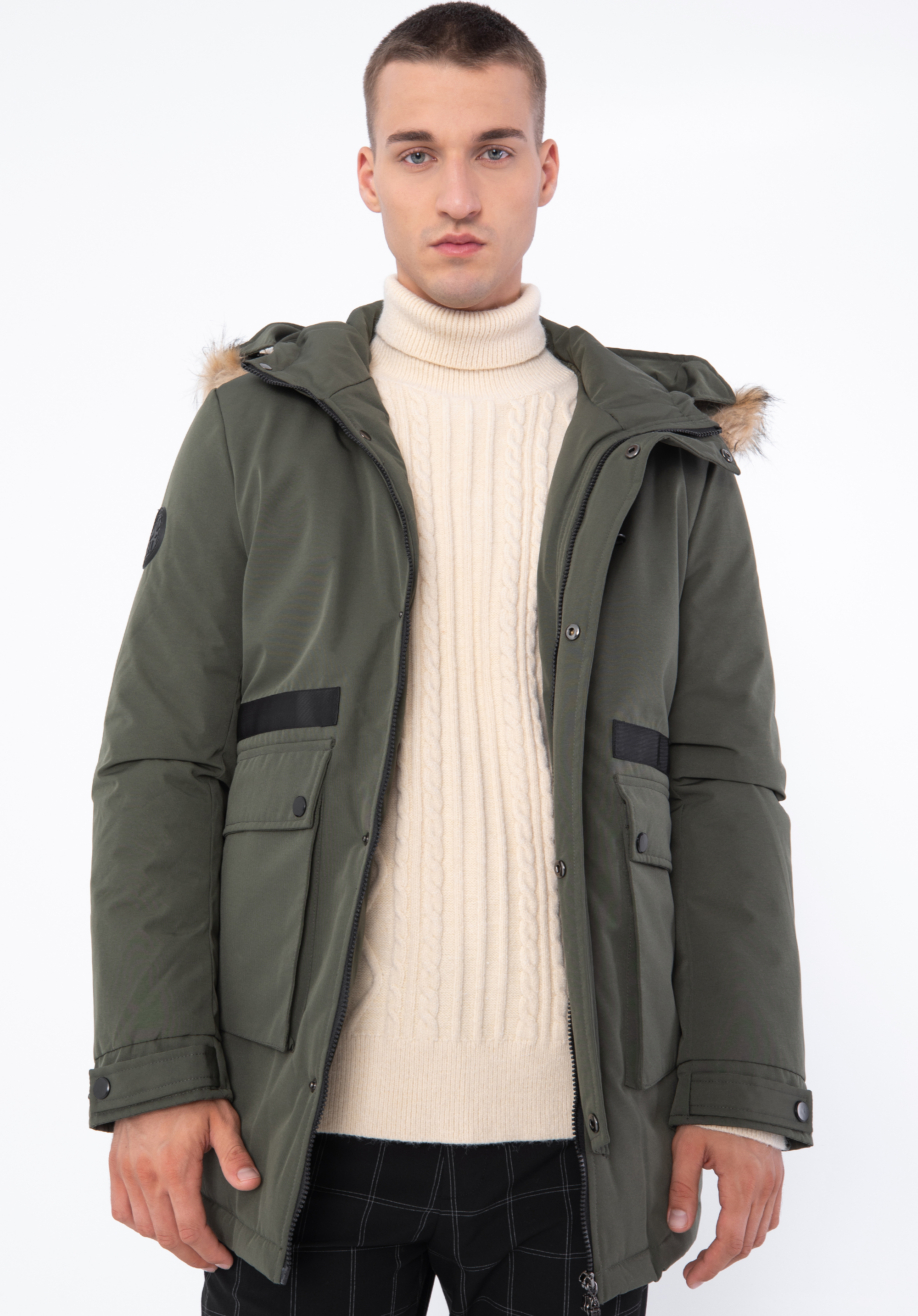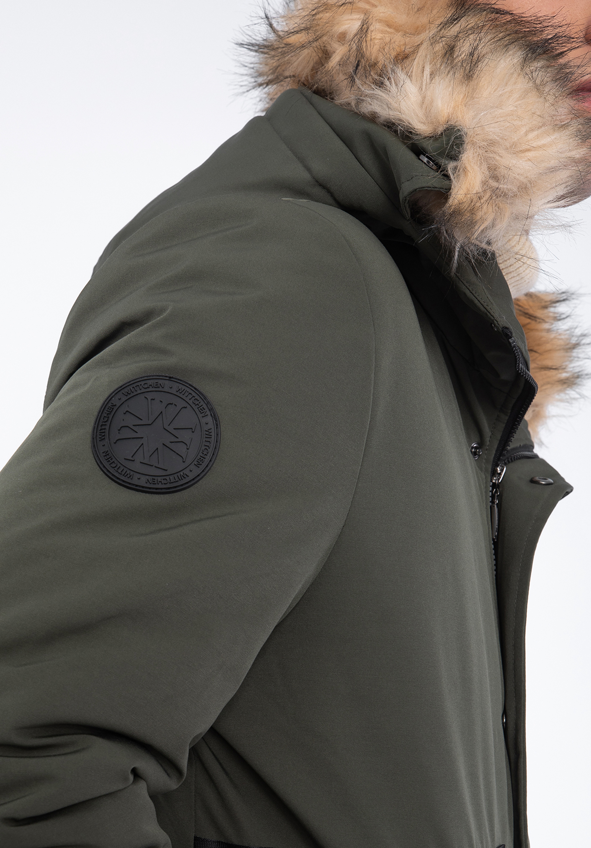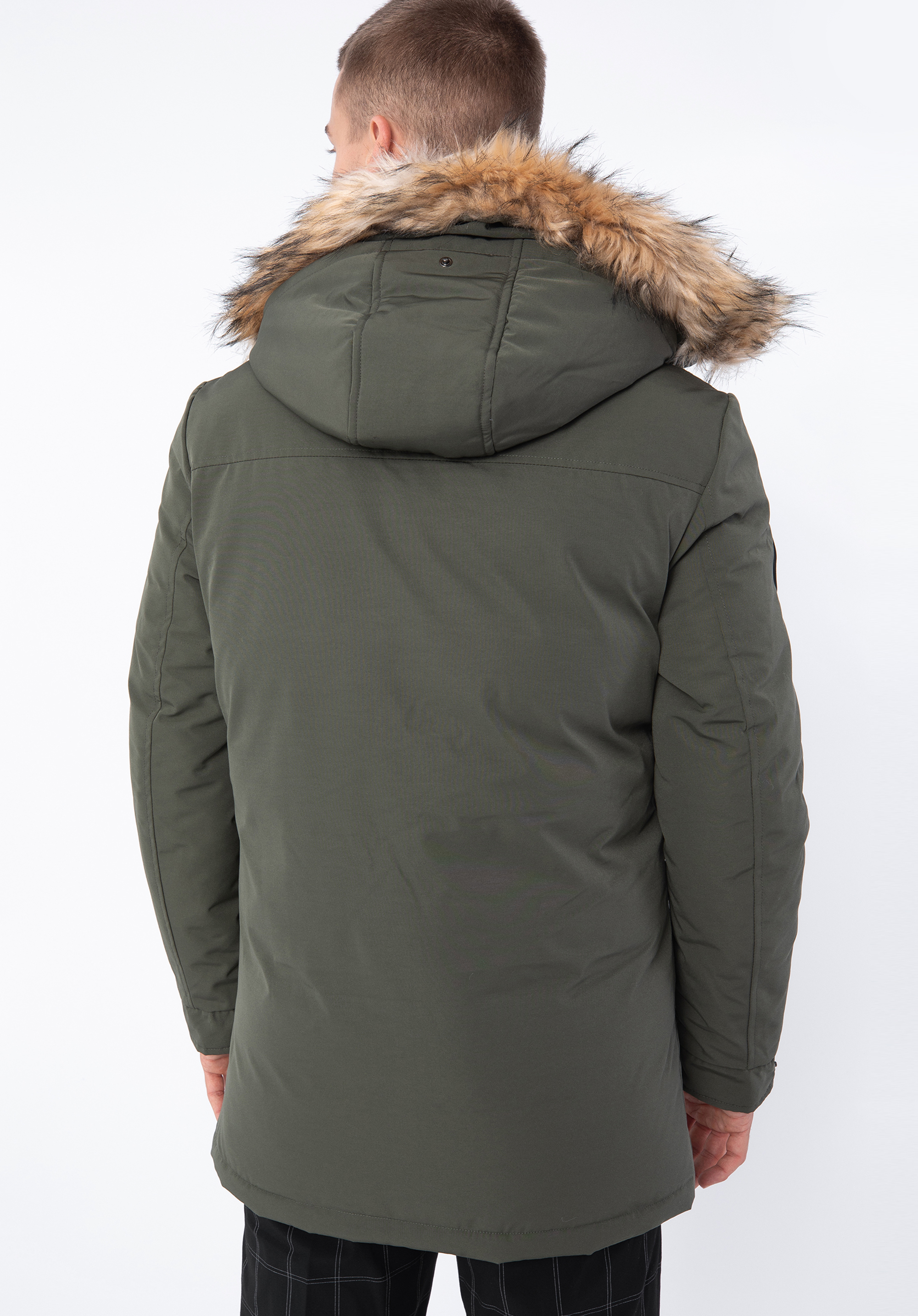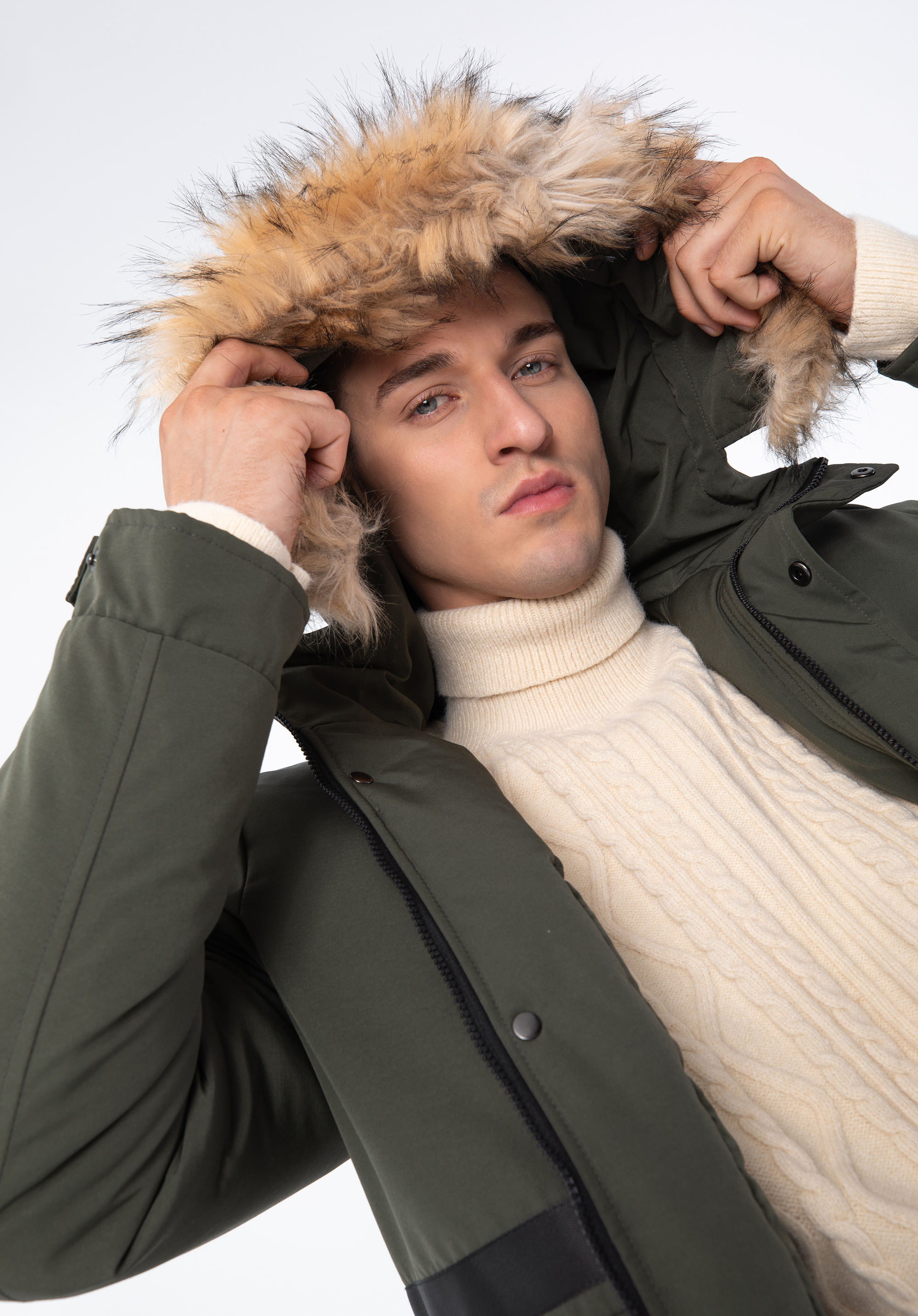- nieodczepiany kaptur z odpinanym na guziki sztucznym futerkiem;