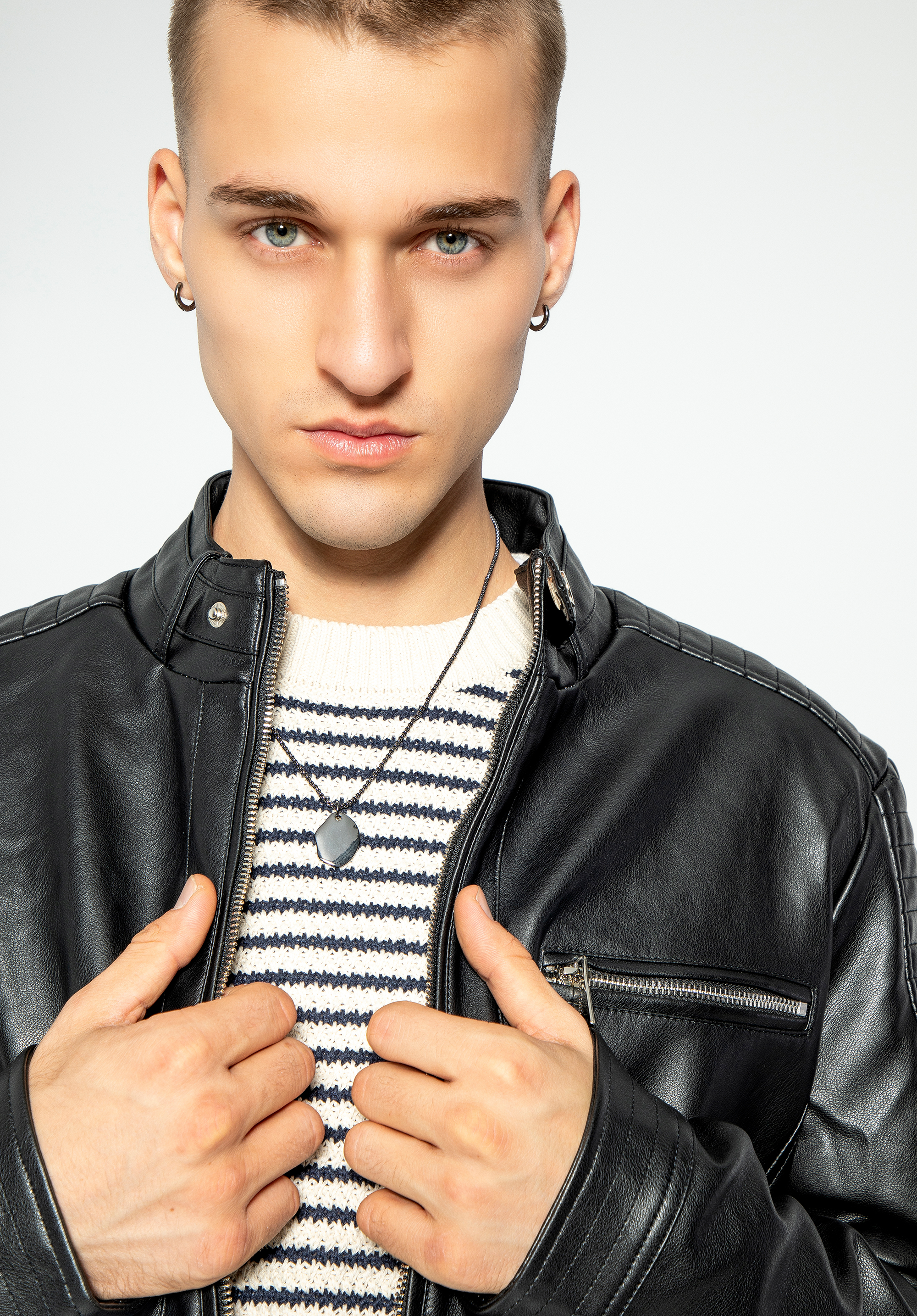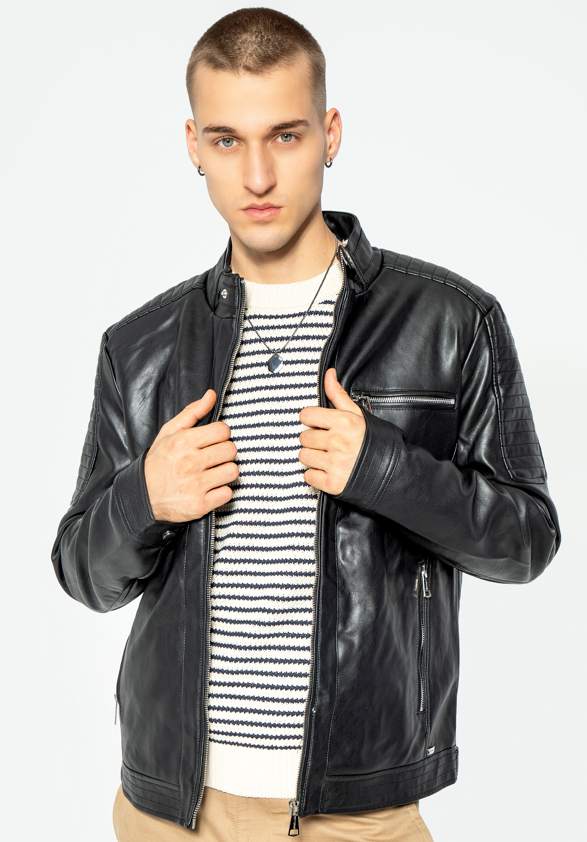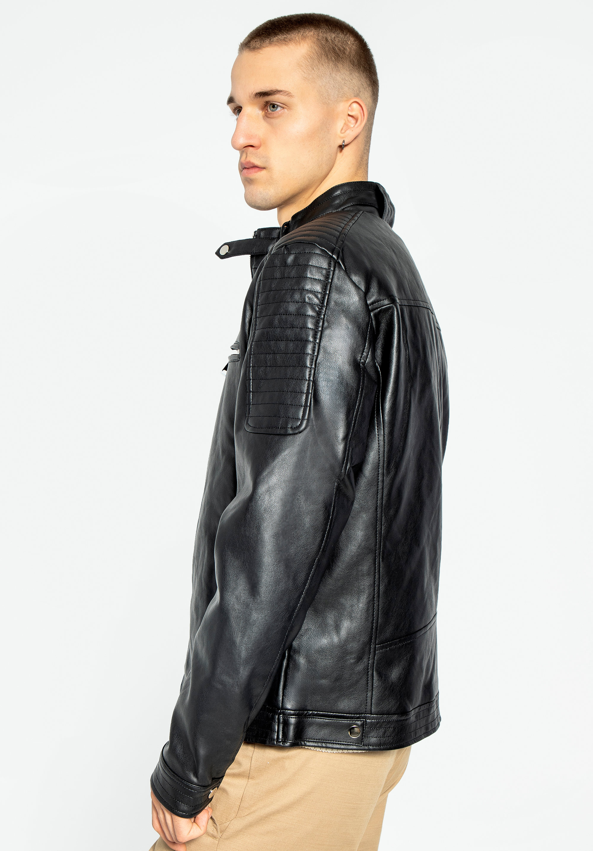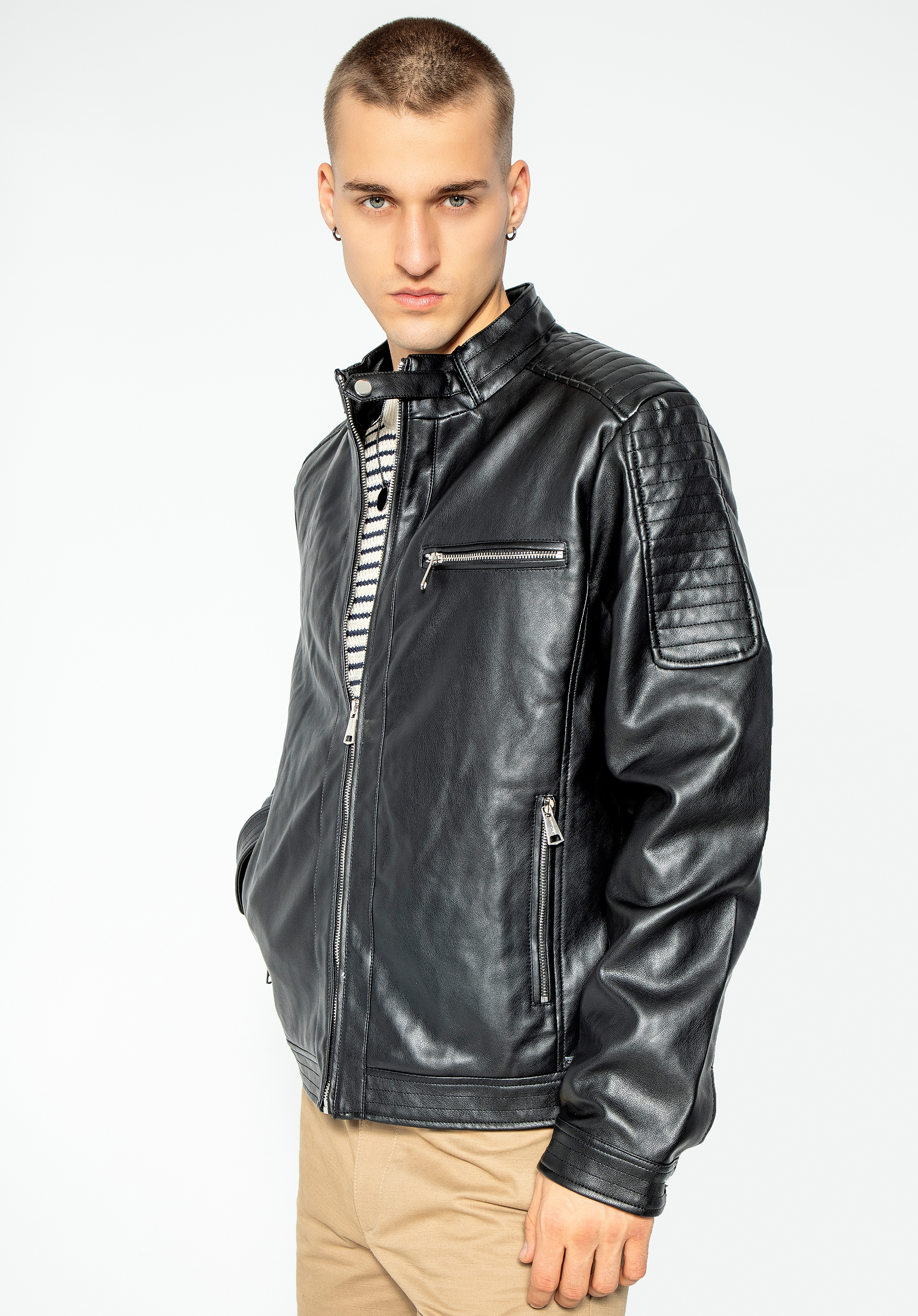 Męska kurtka z ekoskóry z ozdobną stójką to ponadczasowy wybór dla każdego nowoczesnego mężczyzny.
