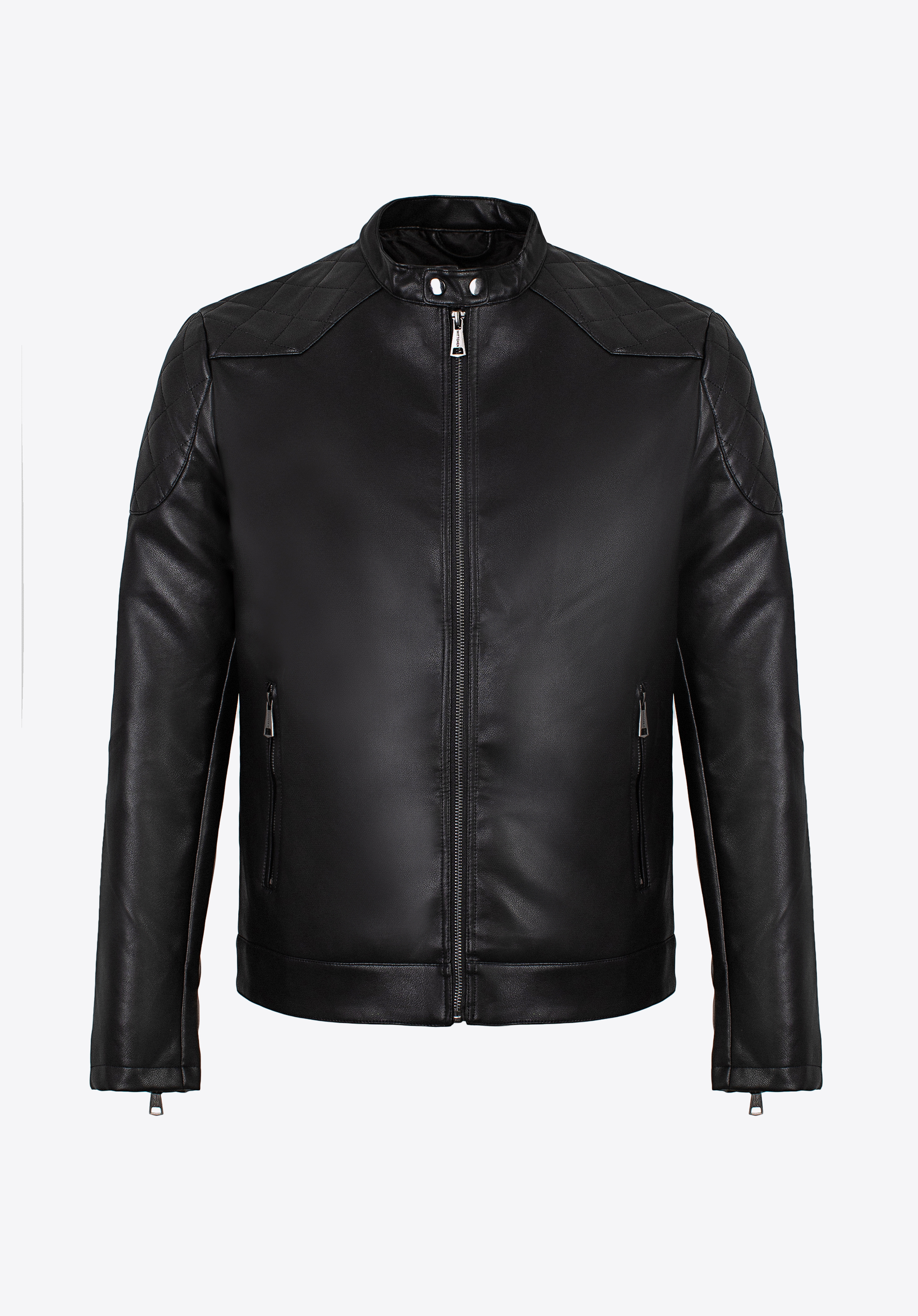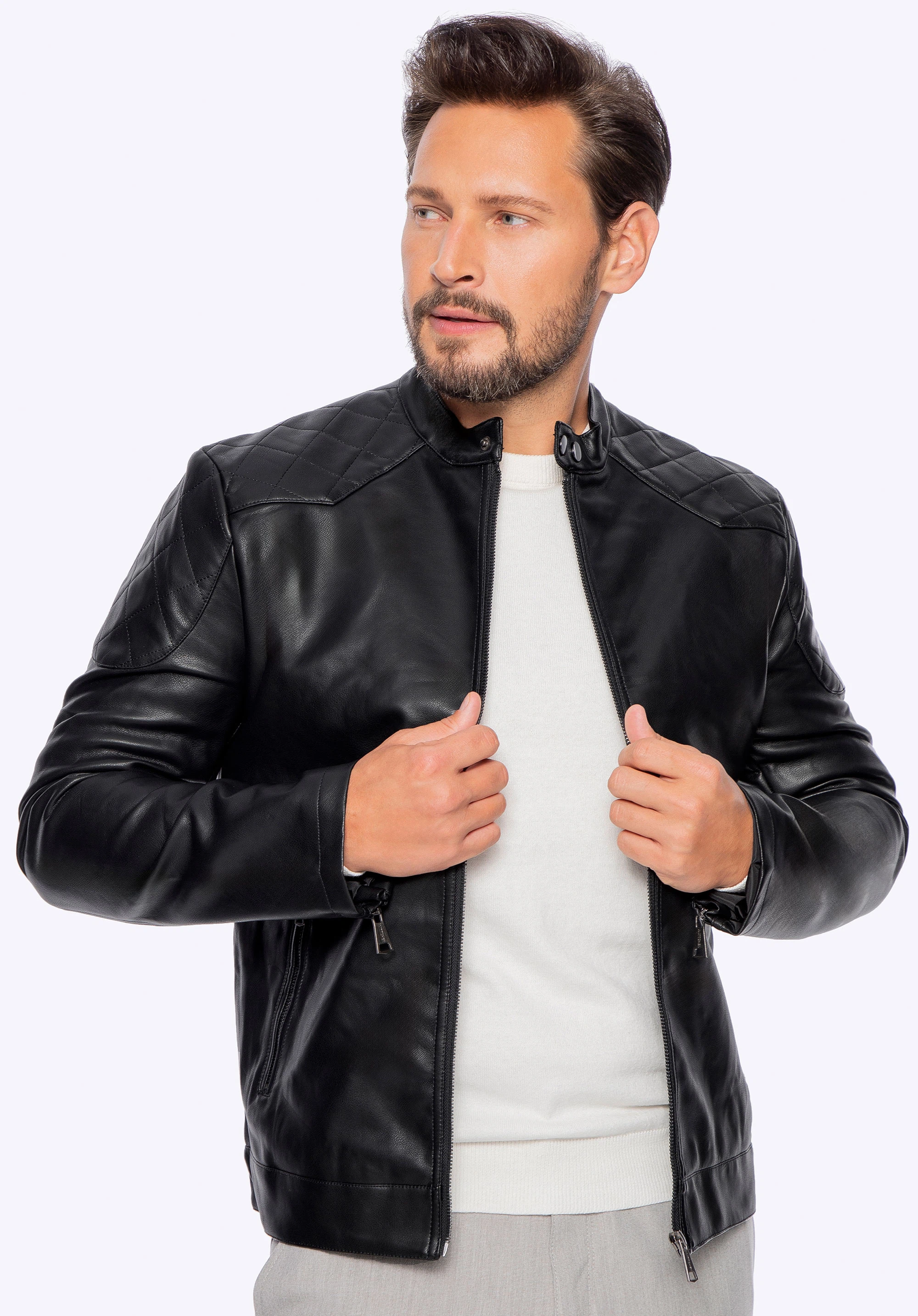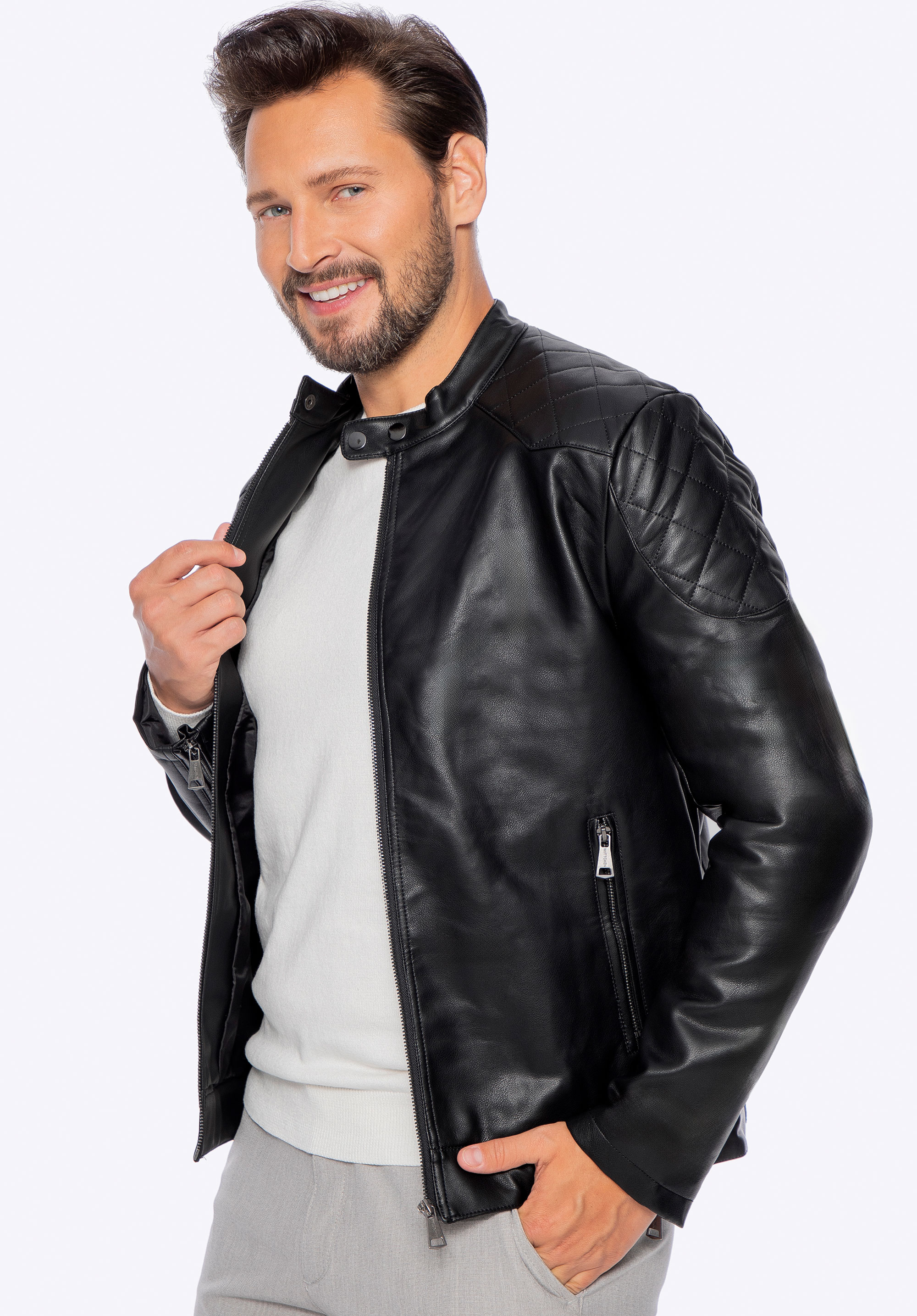 Męska kurtka z ekoskóry z pikowaniem na ramionach czarna