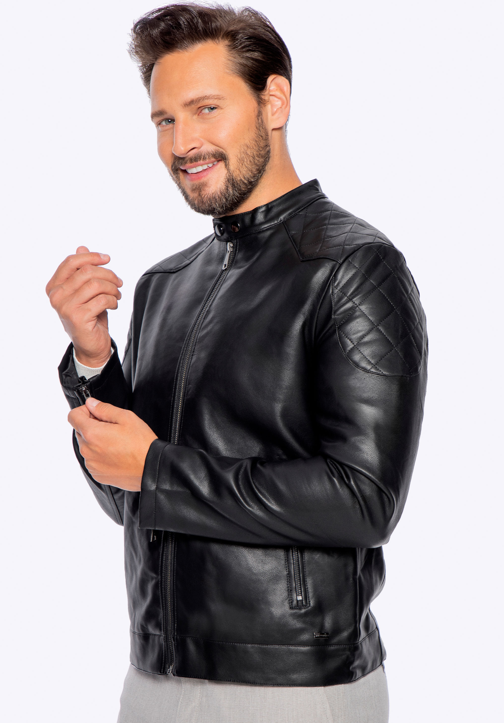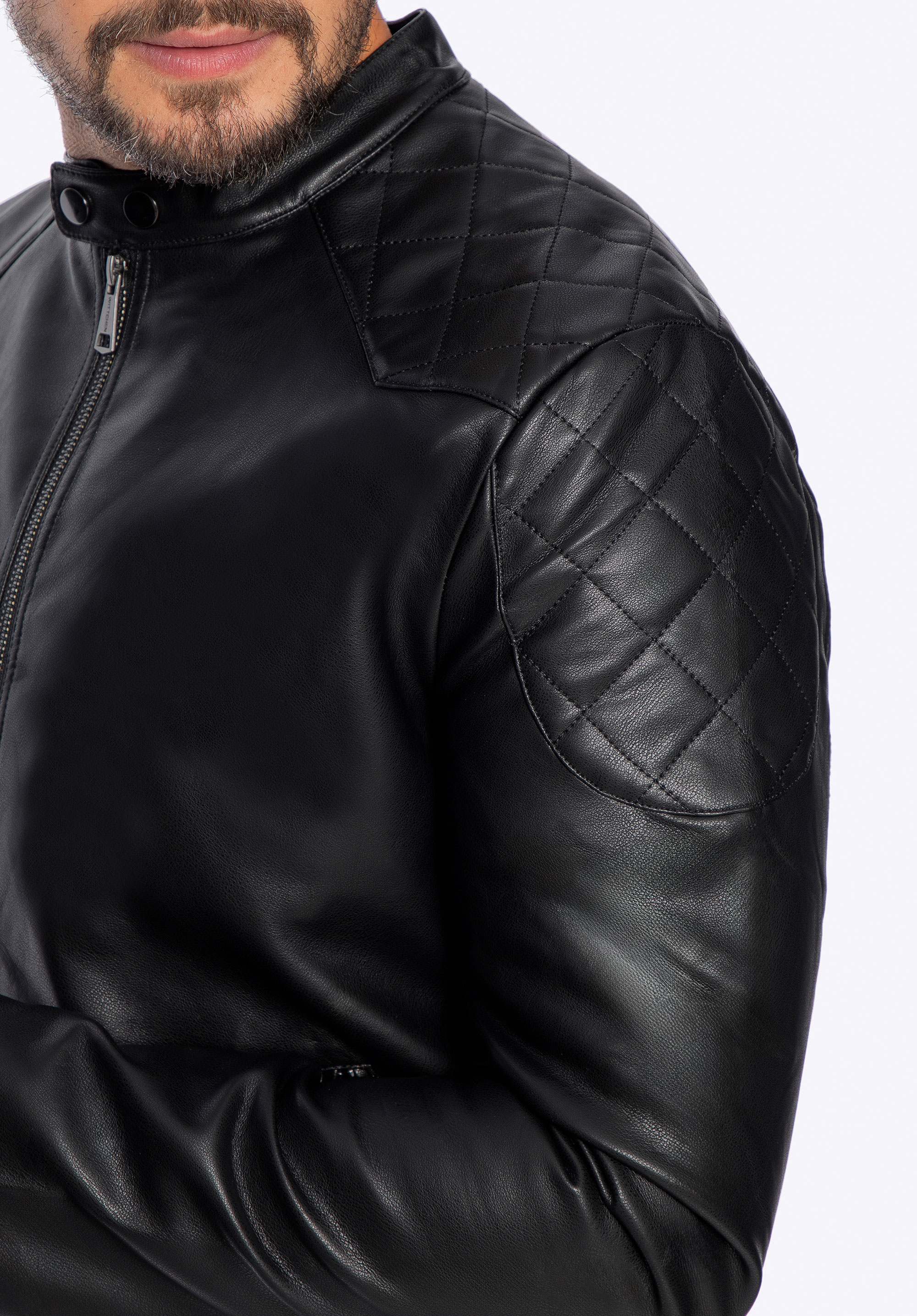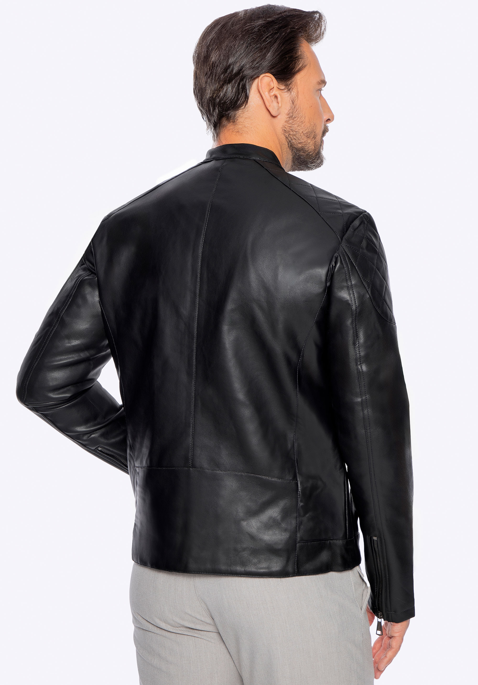 Męska kurtka z ekoskóry z pikowaniem na ramionach czarna