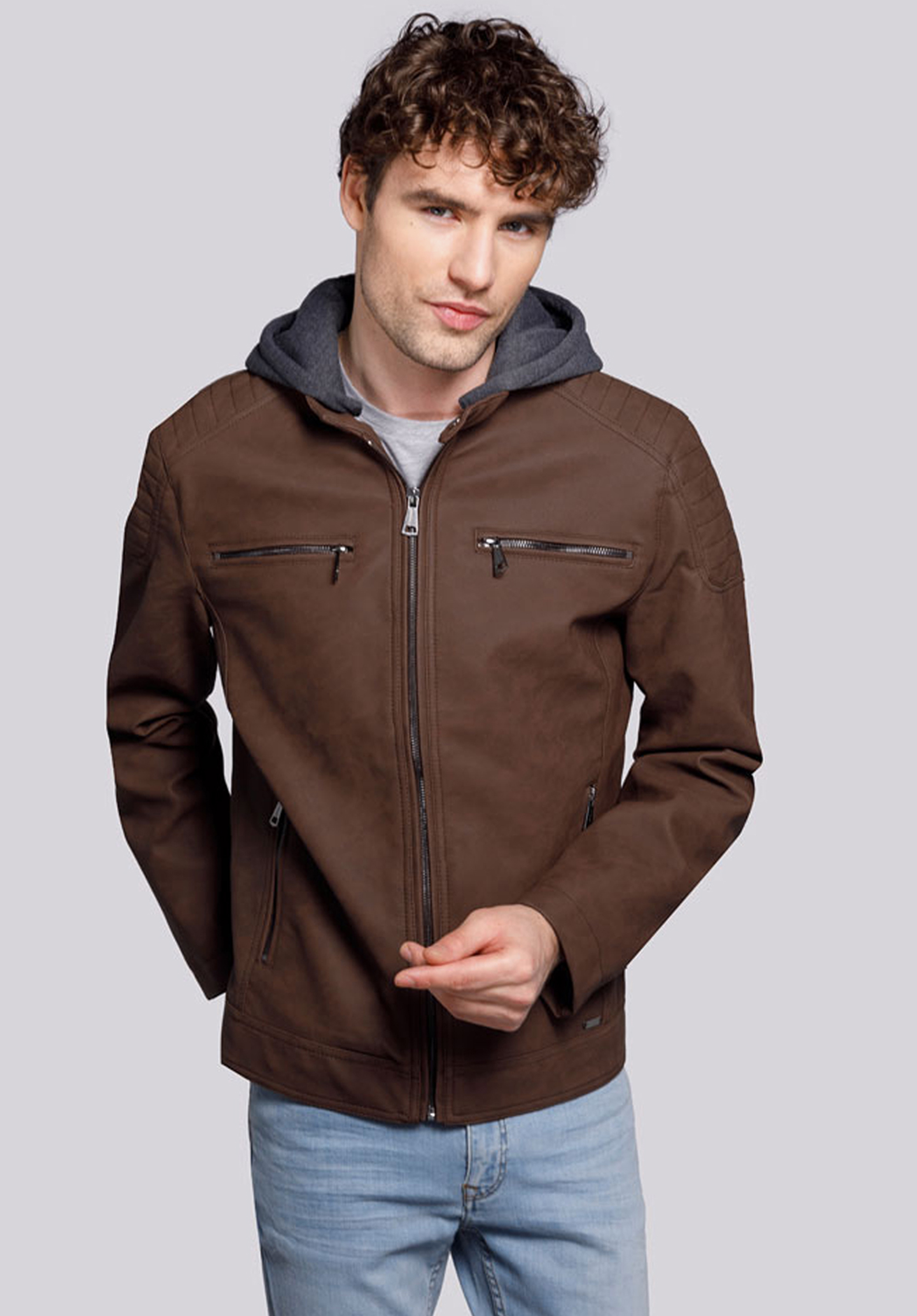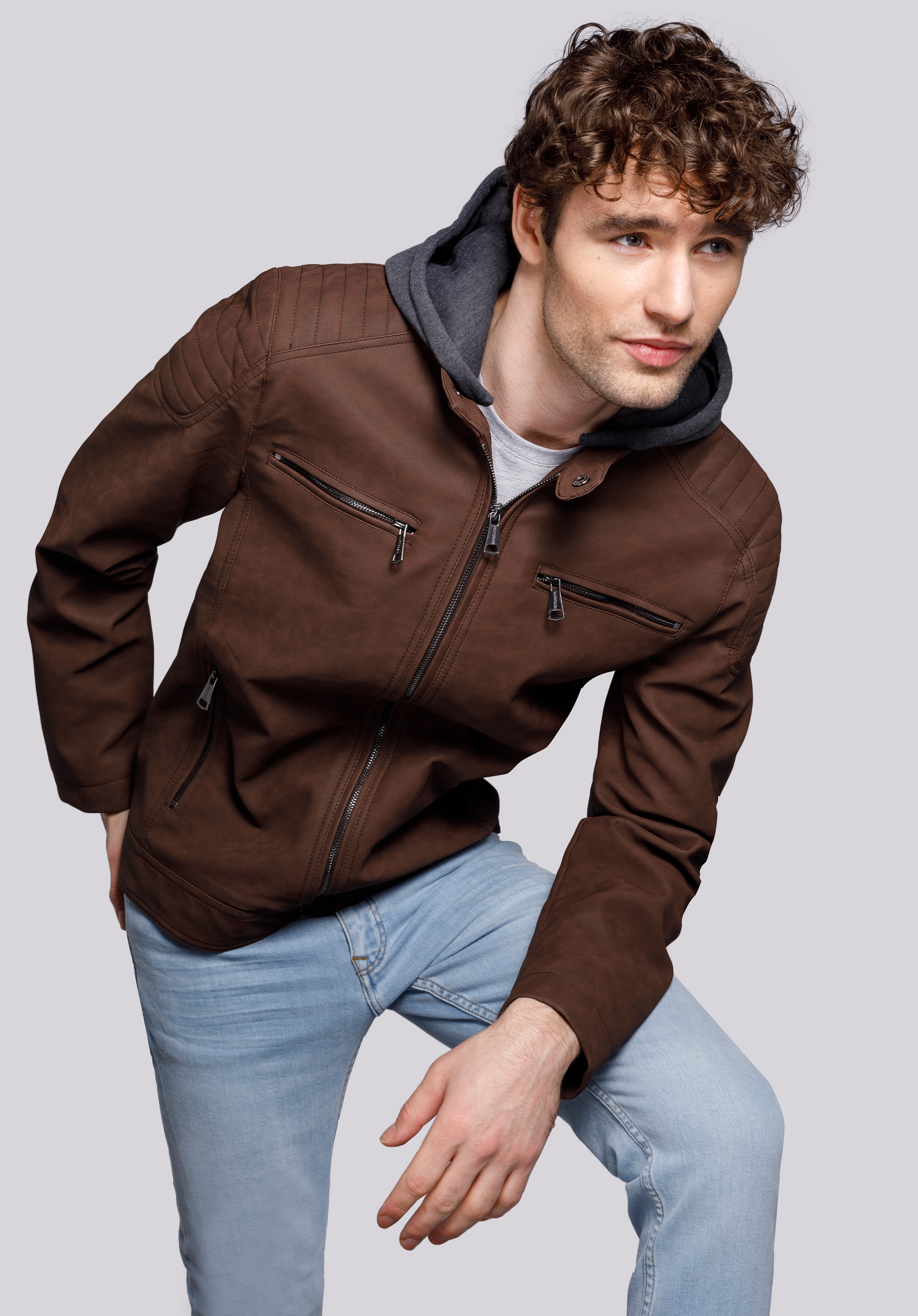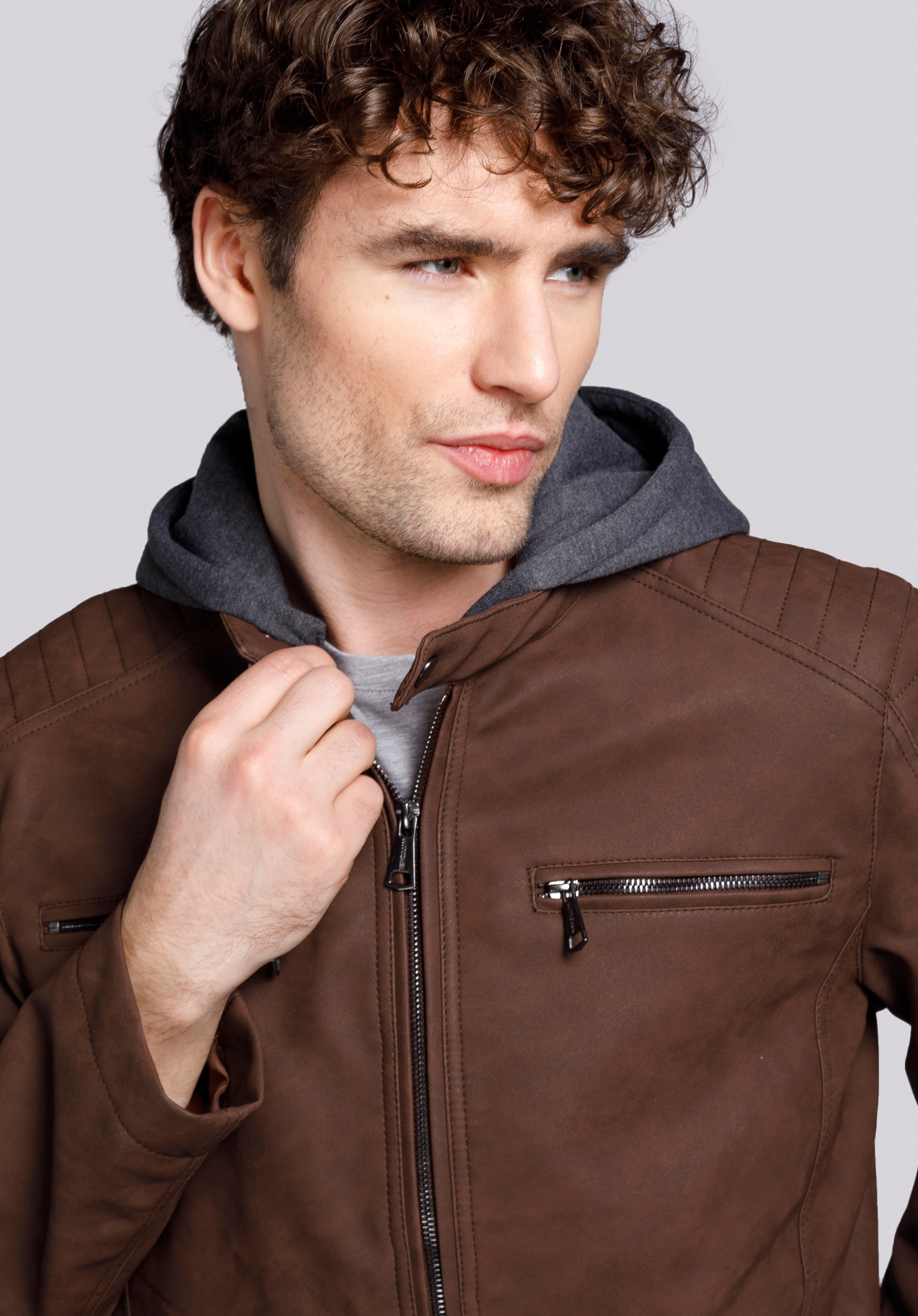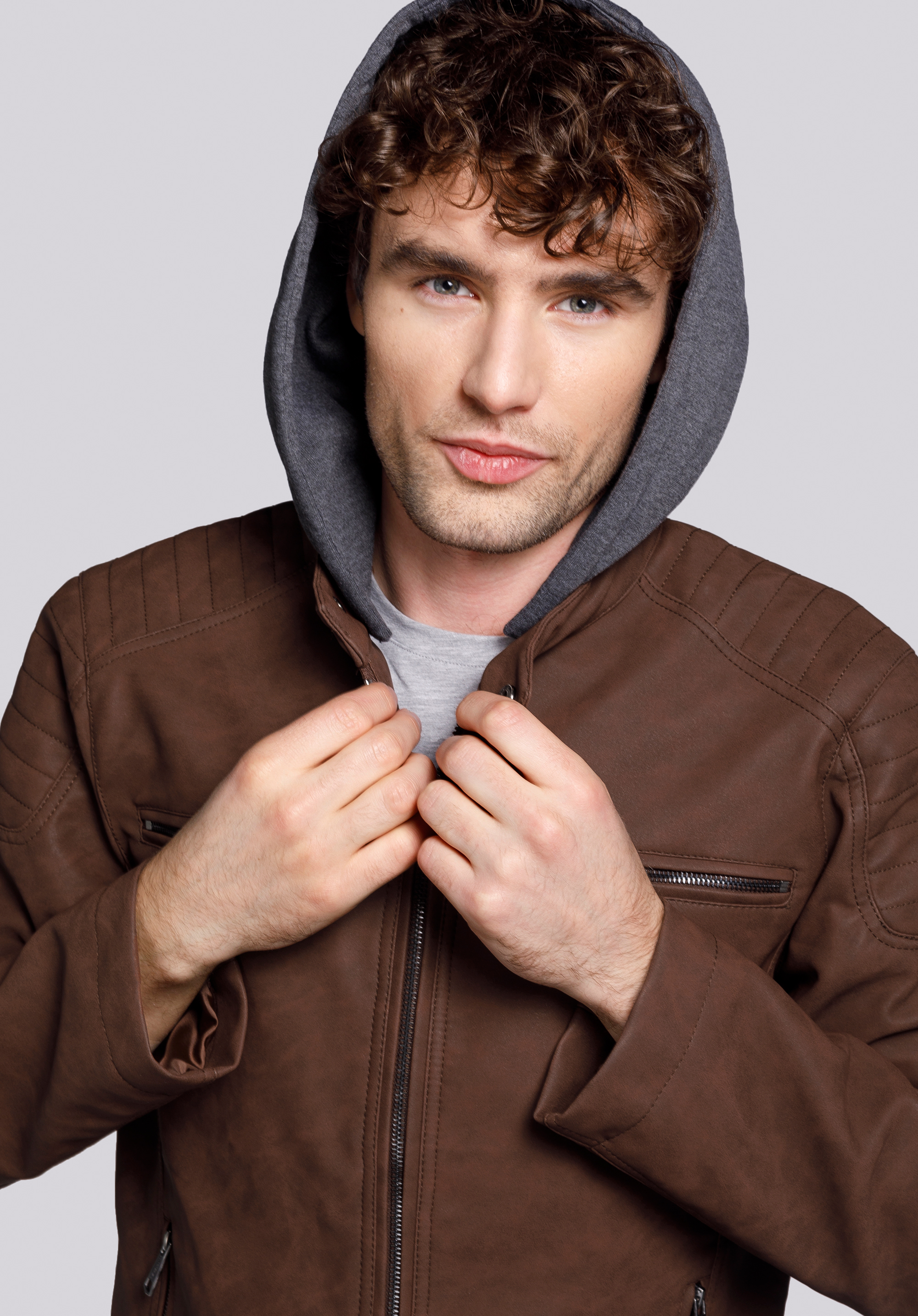 Wygodna, a jednocześnie stylowa kurtka z kapturem. Jest uszyta z ciekawej w dotyku, matowej skóry ekologicznej najwyższej jakości. Gruby dzianinowy kaptur można odpiąć – jest na zatrzaski. Telefon czy portfel schowasz do zamykanej na zatrzask wewnętrznej kieszeni. Kurtka ma na ramionach pikowane wzmocnienia, które kojarzą się z modą rock and rollową. Do pionowych kieszeni bocznych wygodnie wsuniesz ręce lub kilka drobiazgów. Ta casualowa kurtka będzie pasować do wielu strojów, które masz w szafie: ulubionych dżinsów i bluzy czy chinosów z t-shirtem.