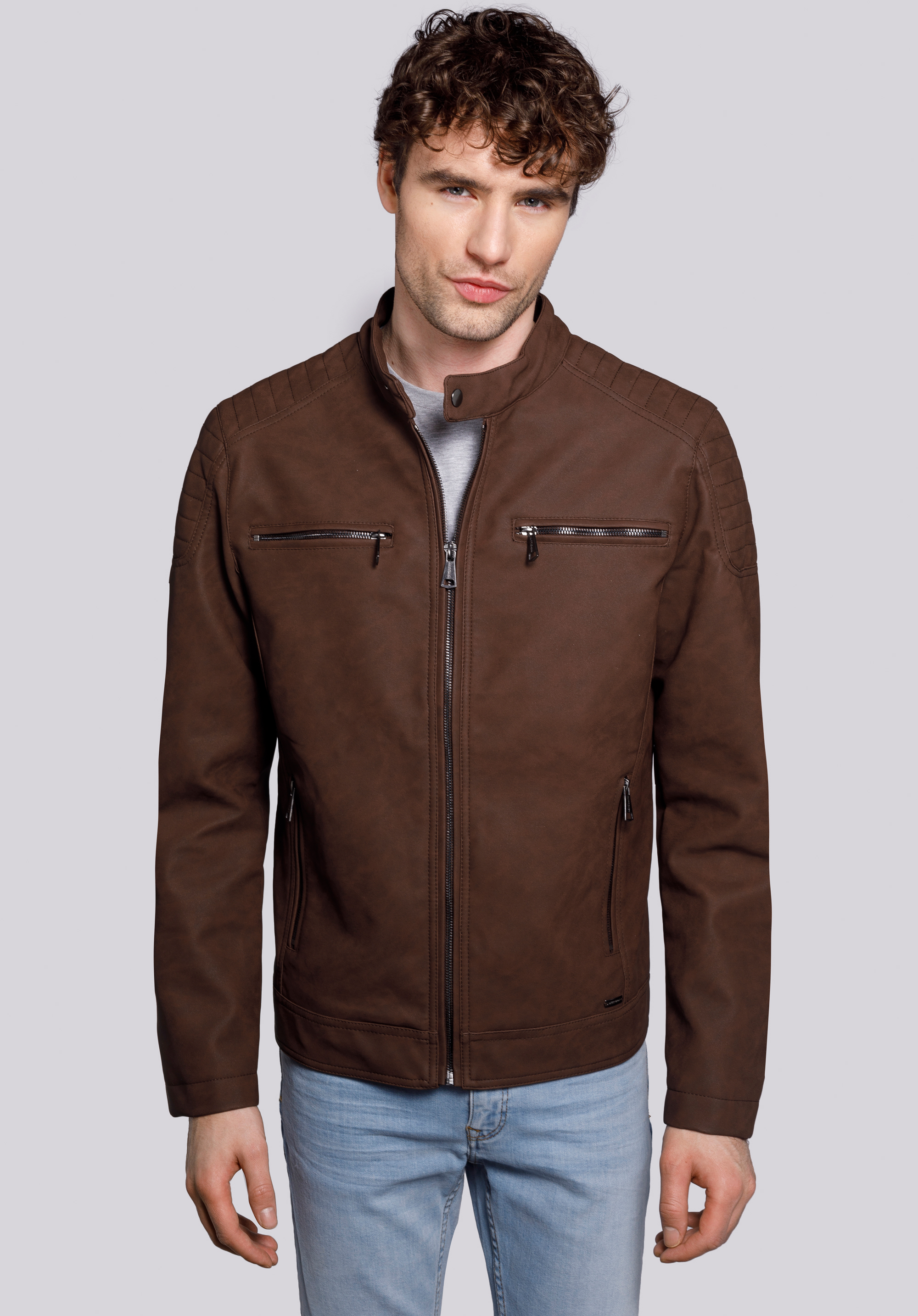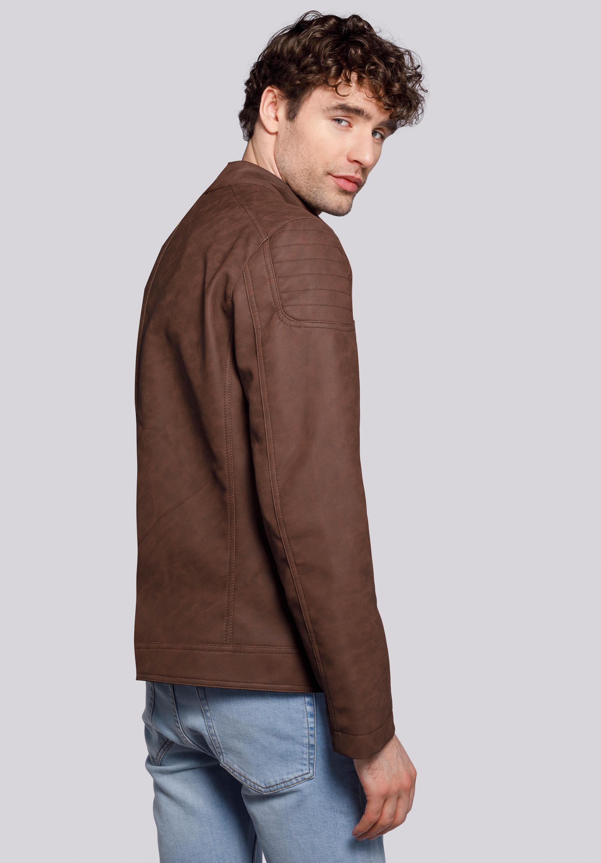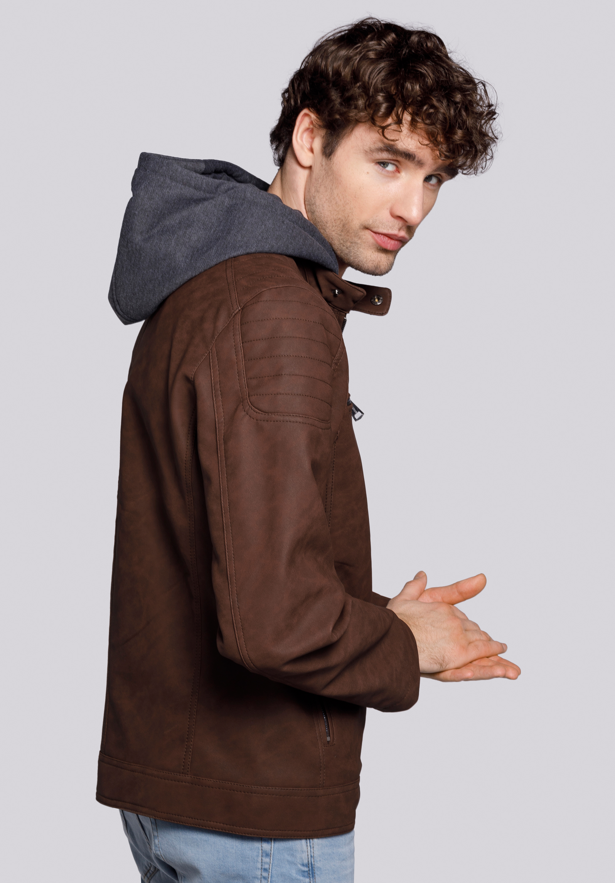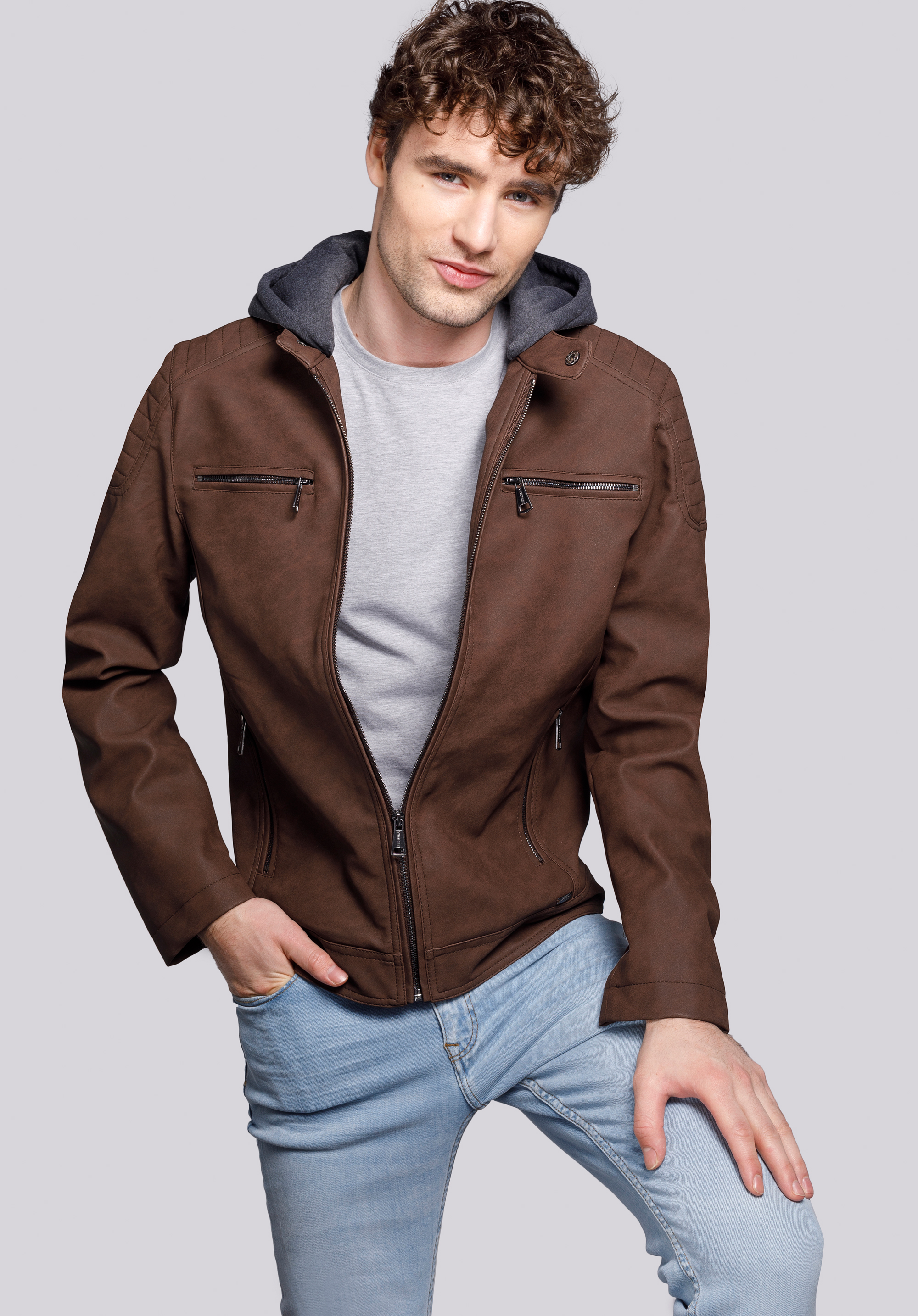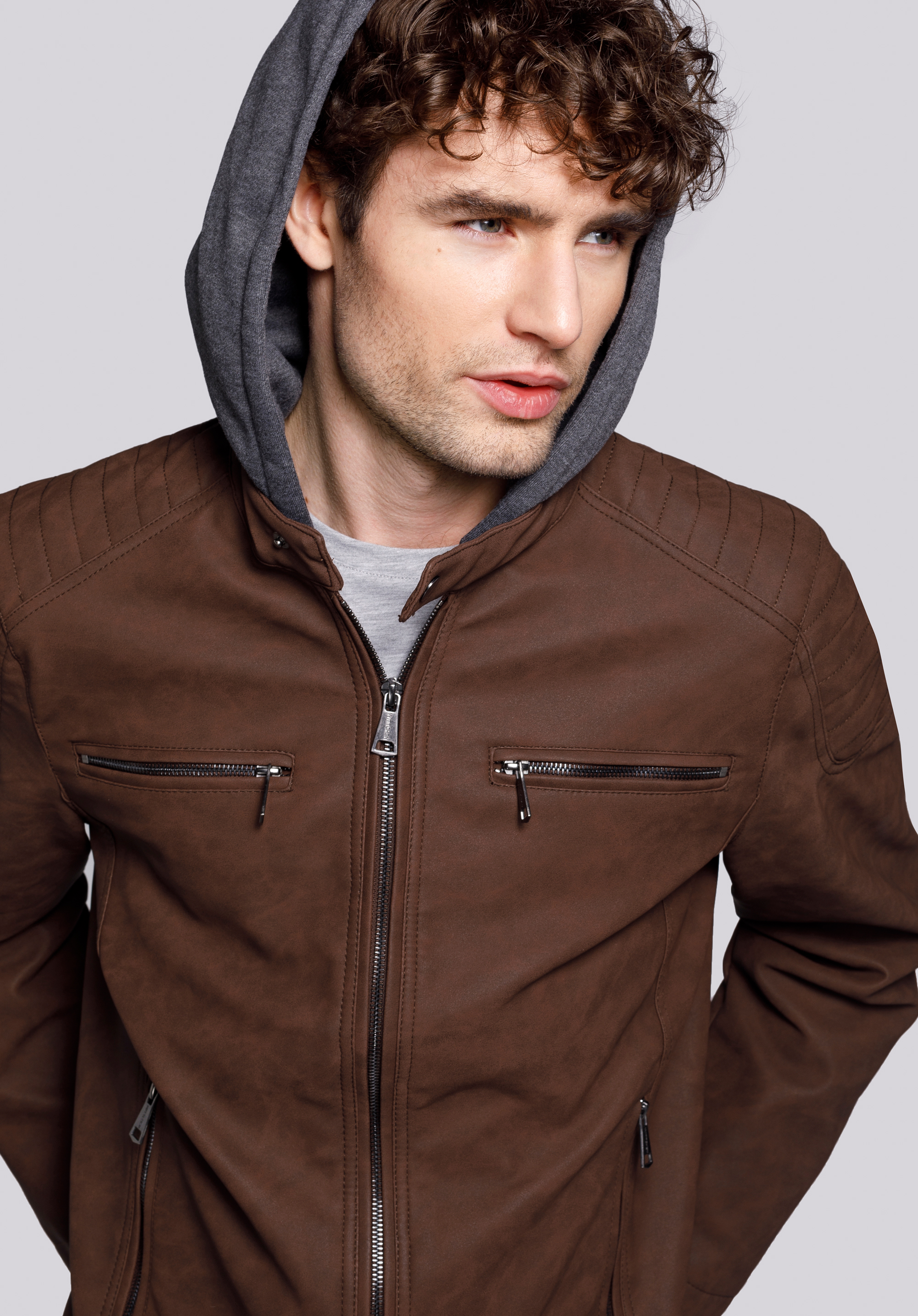 Wygodna, a jednocześnie stylowa kurtka z kapturem. Jest uszyta z ciekawej w dotyku, matowej skóry ekologicznej najwyższej jakości. Gruby dzianinowy kaptur można odpiąć – jest na zatrzaski. Telefon czy portfel schowasz do zamykanej na zatrzask wewnętrznej kieszeni. Kurtka ma na ramionach pikowane wzmocnienia, które kojarzą się z modą rock and rollową. Do pionowych kieszeni bocznych wygodnie wsuniesz ręce lub kilka drobiazgów. Ta casualowa kurtka będzie pasować do wielu strojów, które masz w szafie: ulubionych dżinsów i bluzy czy chinosów z t-shirtem.
