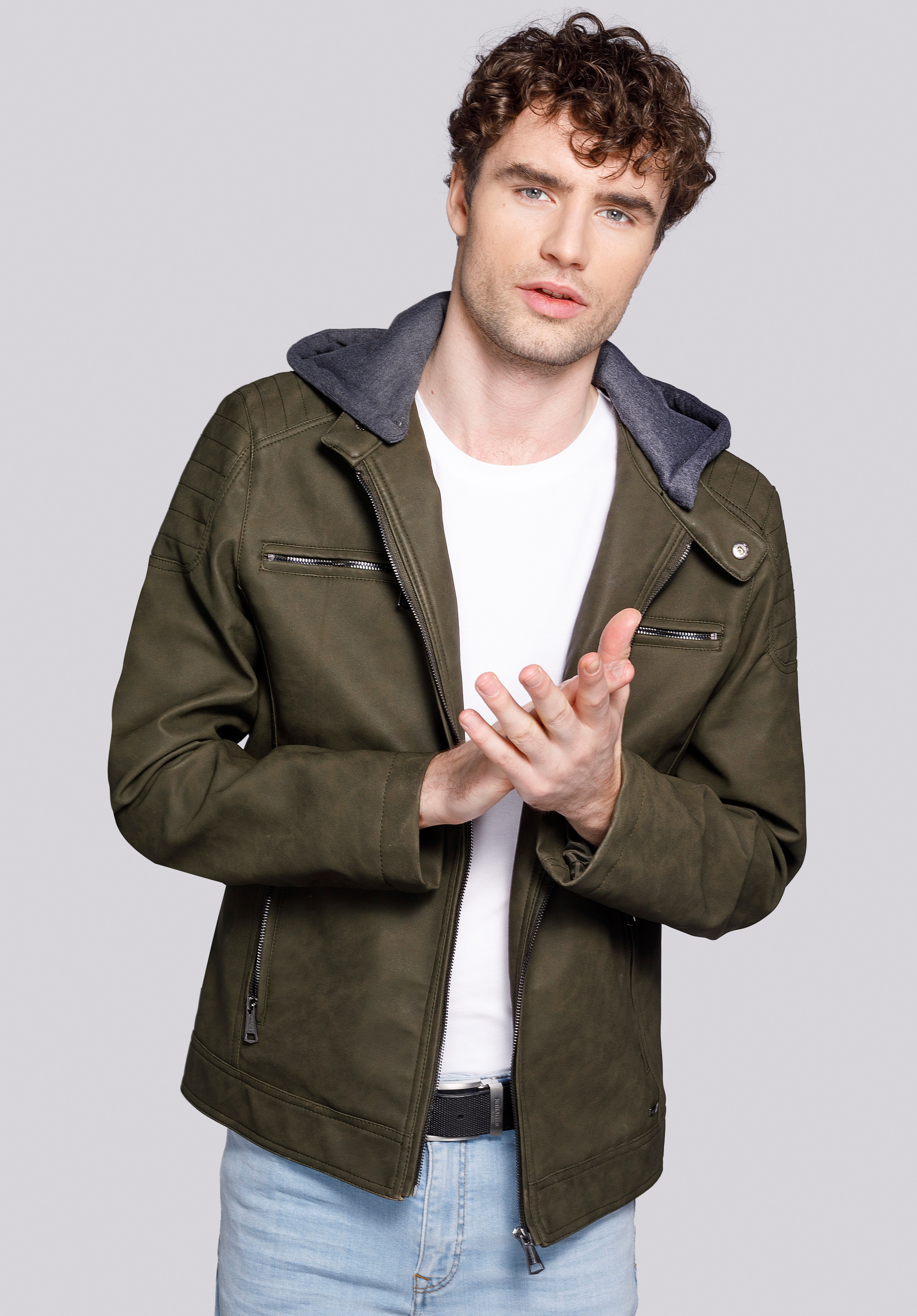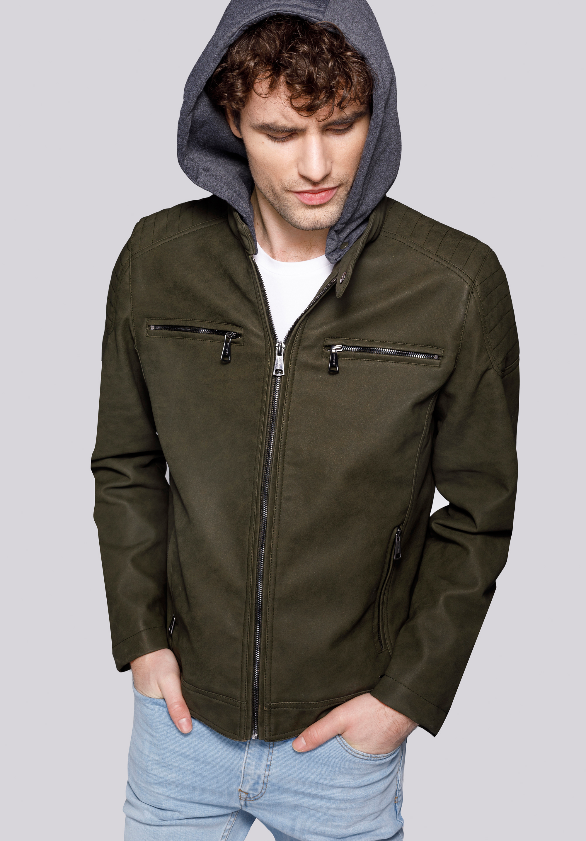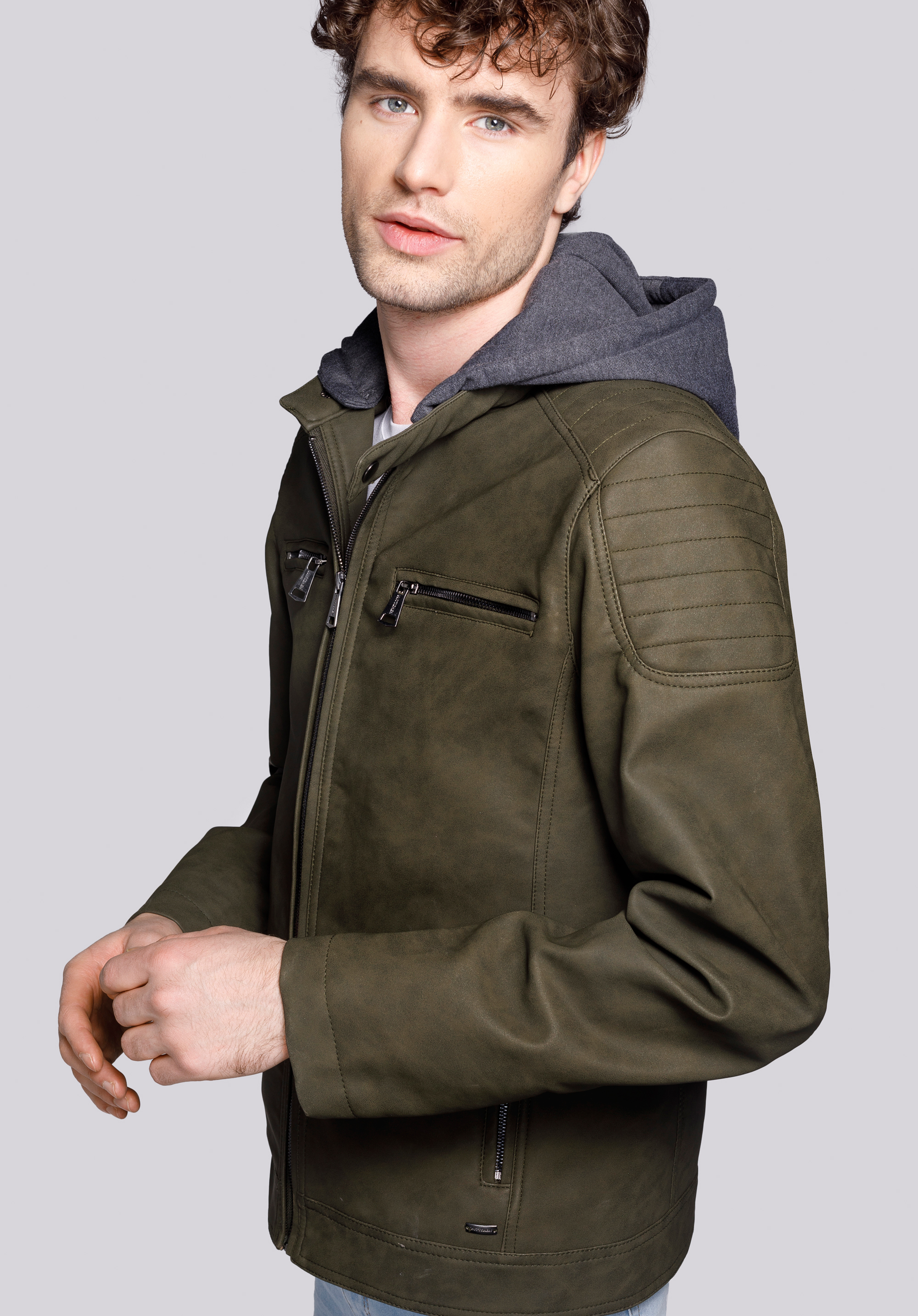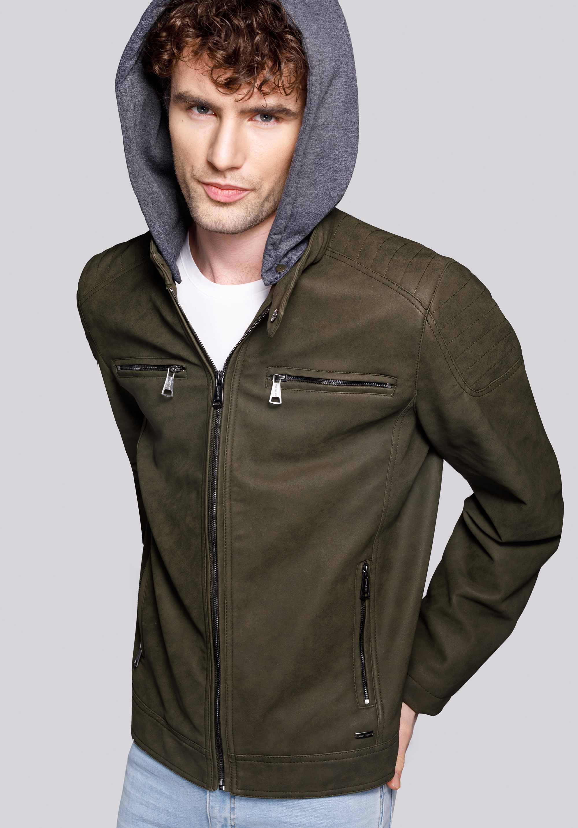 Wygodna, a jednocześnie stylowa kurtka z kapturem. Jest uszyta z ciekawej w dotyku, matowej skóry ekologicznej najwyższej jakości. Gruby dzianinowy kaptur można odpiąć – jest na zatrzaski. Telefon czy portfel schowasz do zamykanej na zatrzask wewnętrznej kieszeni. Kurtka ma na ramionach pikowane wzmocnienia, które kojarzą się z modą rock and rollową. Do pionowych kieszeni bocznych wygodnie wsuniesz ręce lub kilka drobiazgów. Ta casualowa kurtka będzie pasować do wielu strojów, które masz w szafie: ulubionych dżinsów i bluzy czy chinosów z t-shirtem.