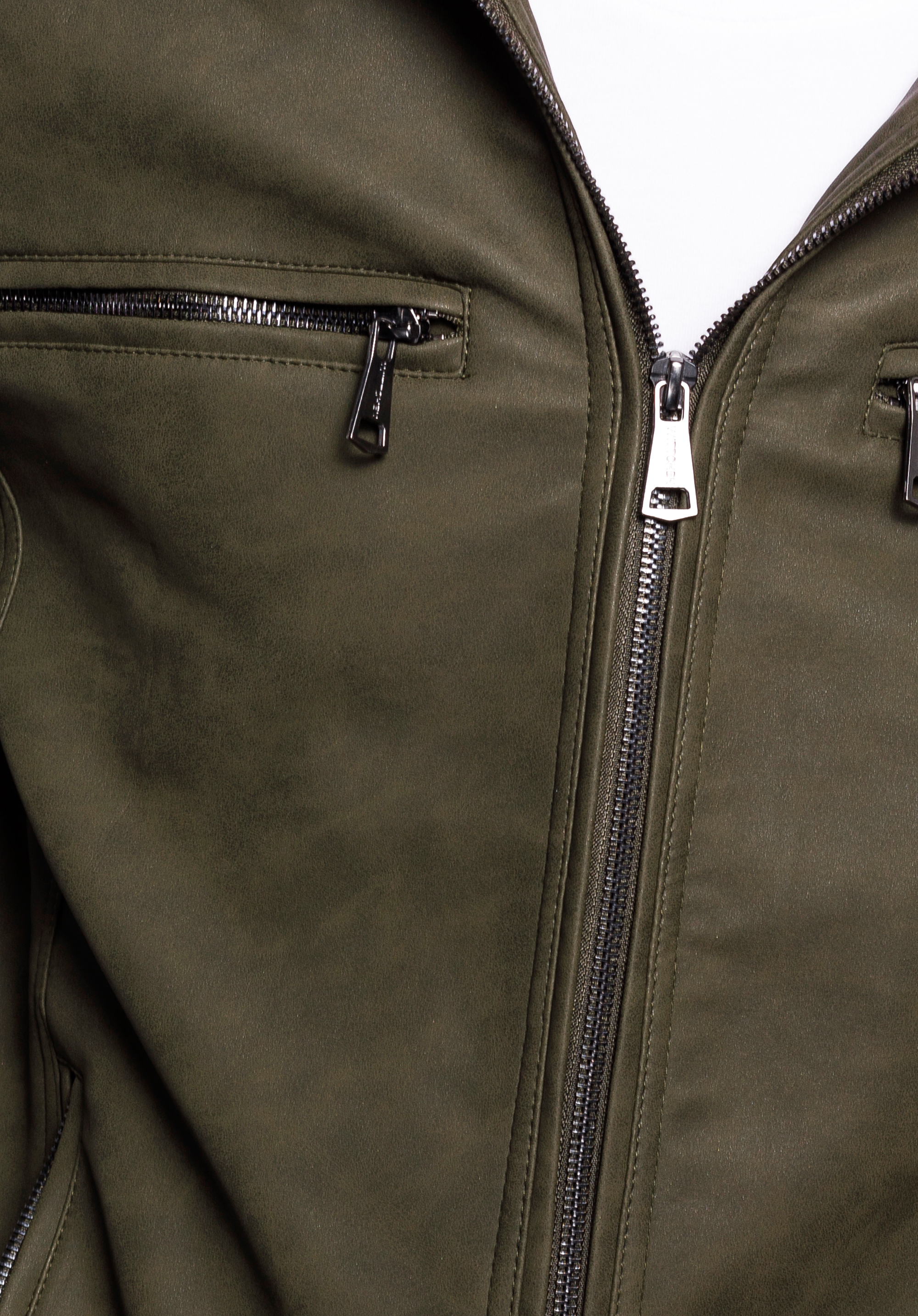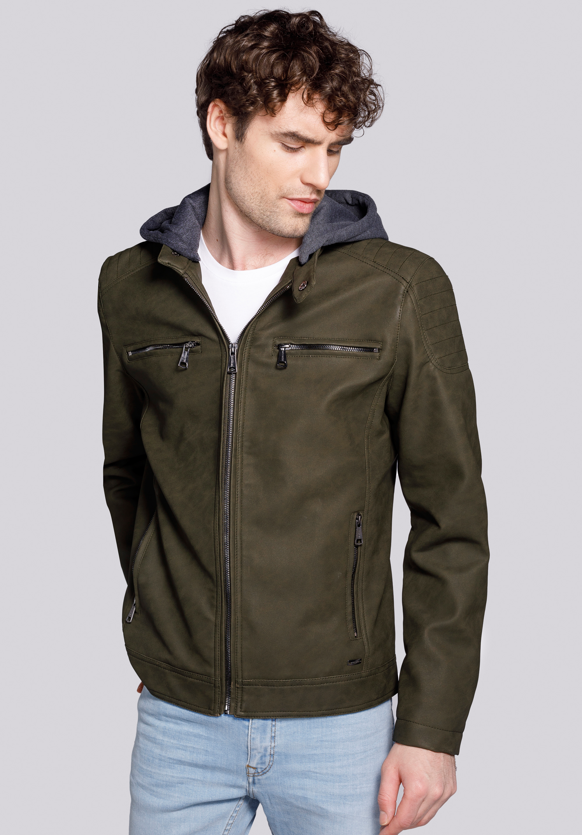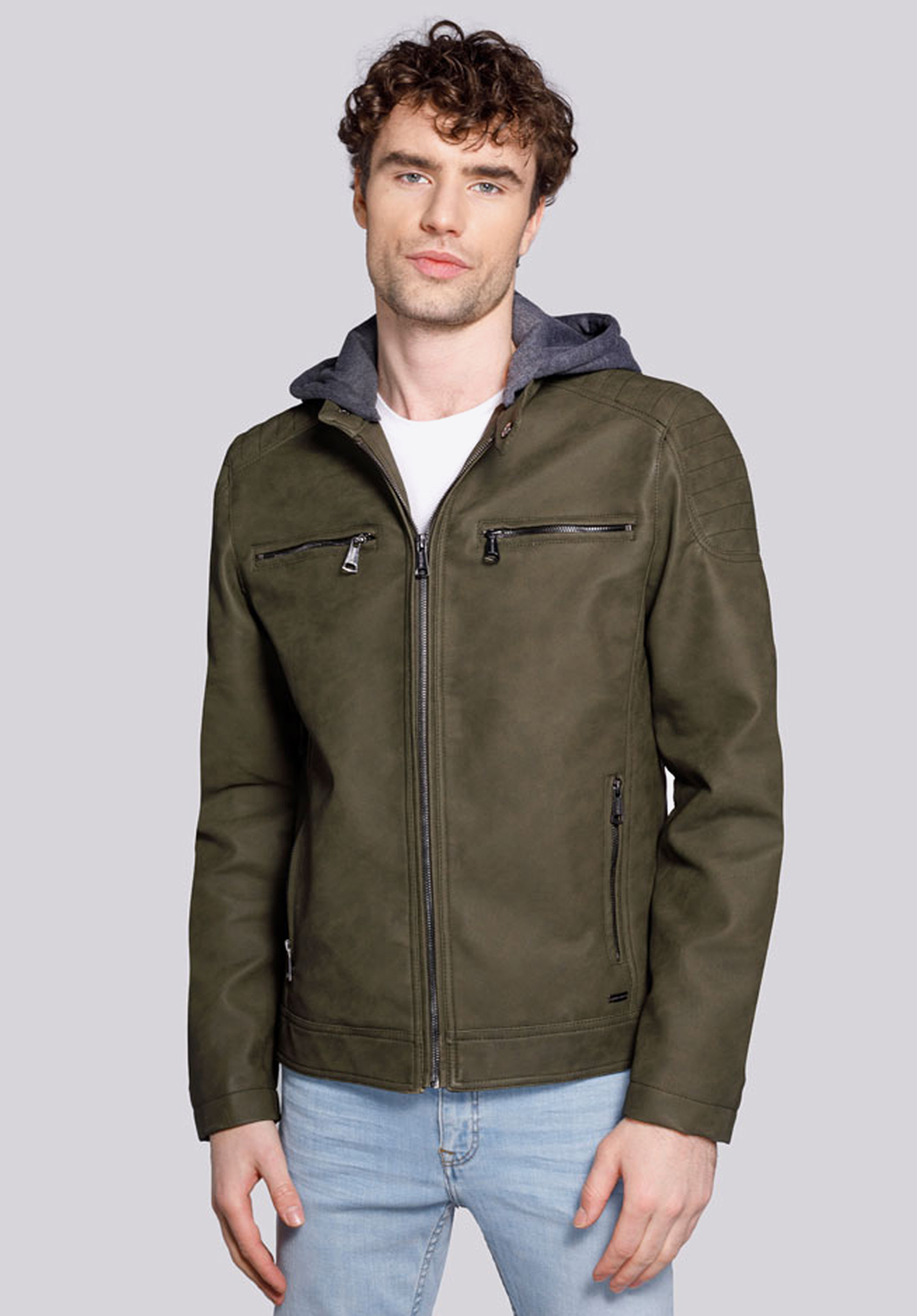 Wygodna, a jednocześnie stylowa kurtka z kapturem. Jest uszyta z ciekawej w dotyku, matowej skóry ekologicznej najwyższej jakości. Gruby dzianinowy kaptur można odpiąć – jest na zatrzaski. Telefon czy portfel schowasz do zamykanej na zatrzask wewnętrznej kieszeni. Kurtka ma na ramionach pikowane wzmocnienia, które kojarzą się z modą rock and rollową. Do pionowych kieszeni bocznych wygodnie wsuniesz ręce lub kilka drobiazgów. Ta casualowa kurtka będzie pasować do wielu strojów, które masz w szafie: ulubionych dżinsów i bluzy czy chinosów z t-shirtem.