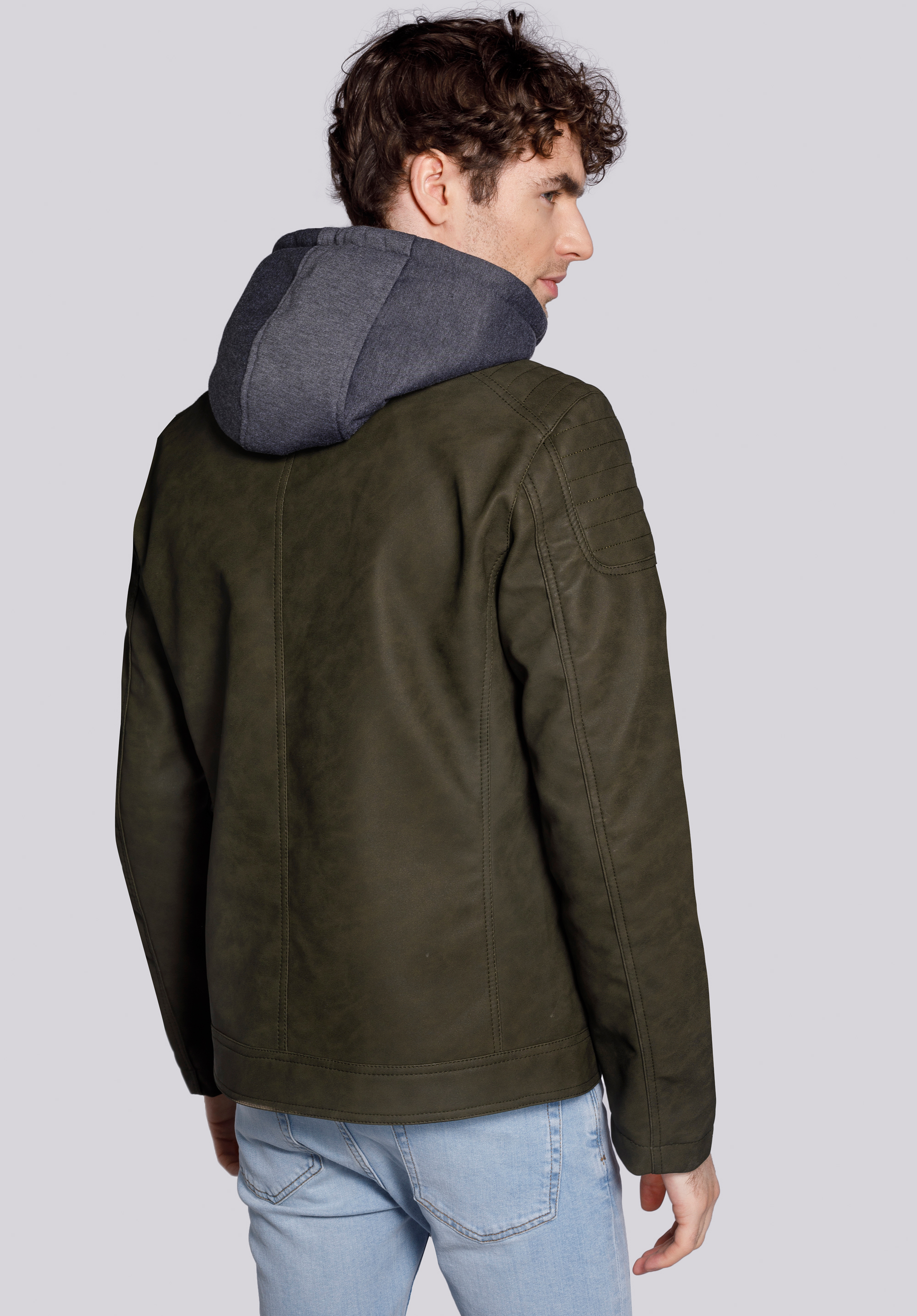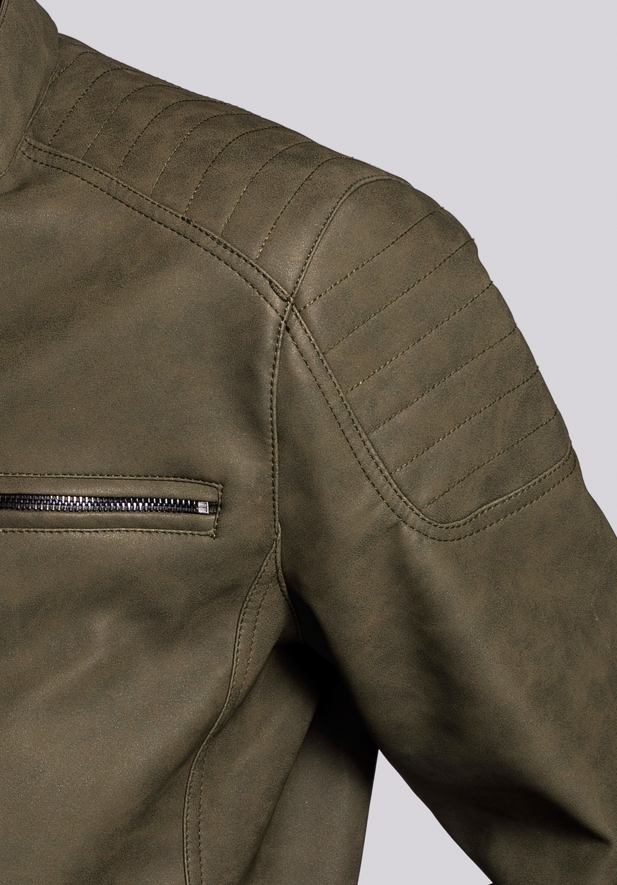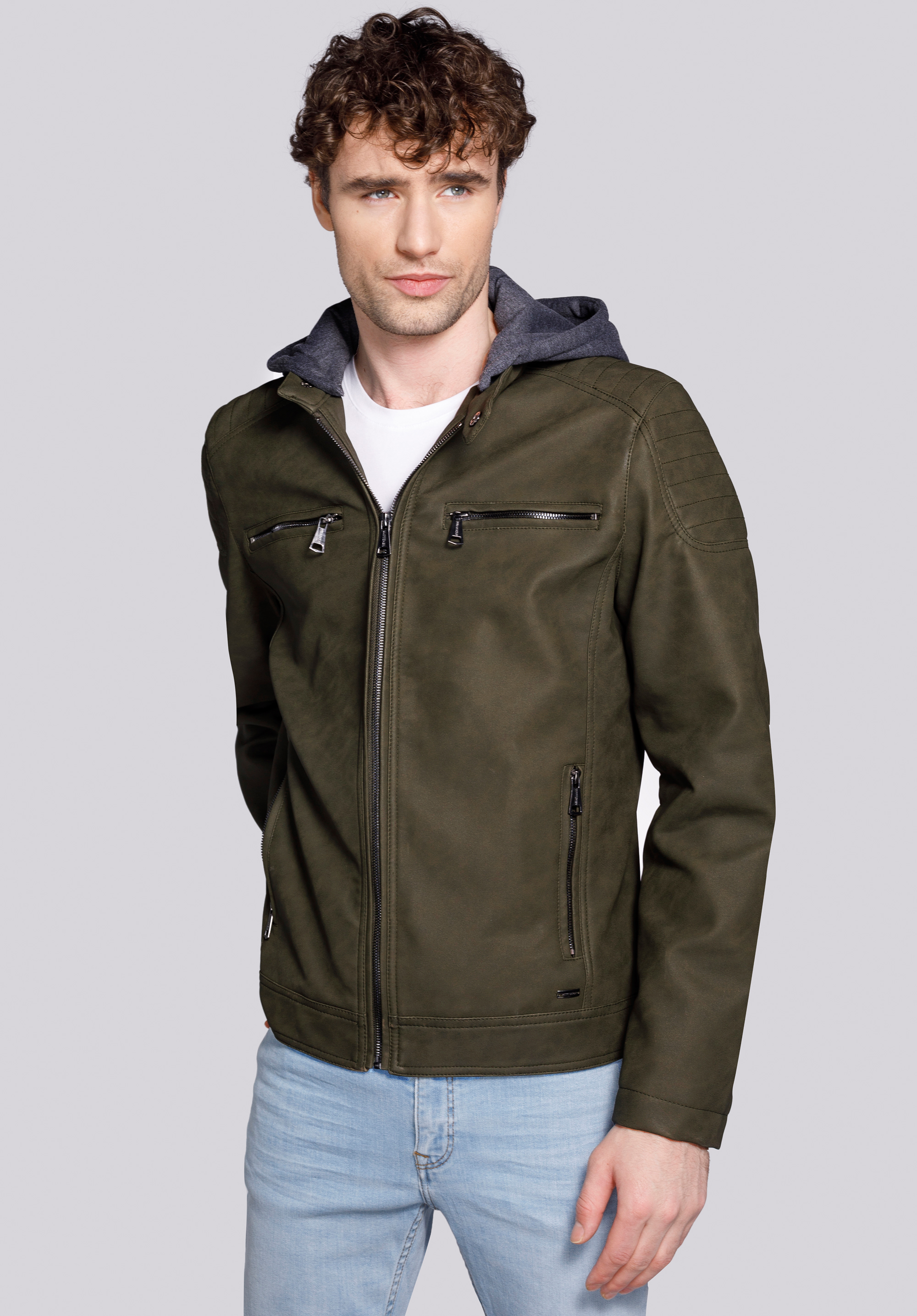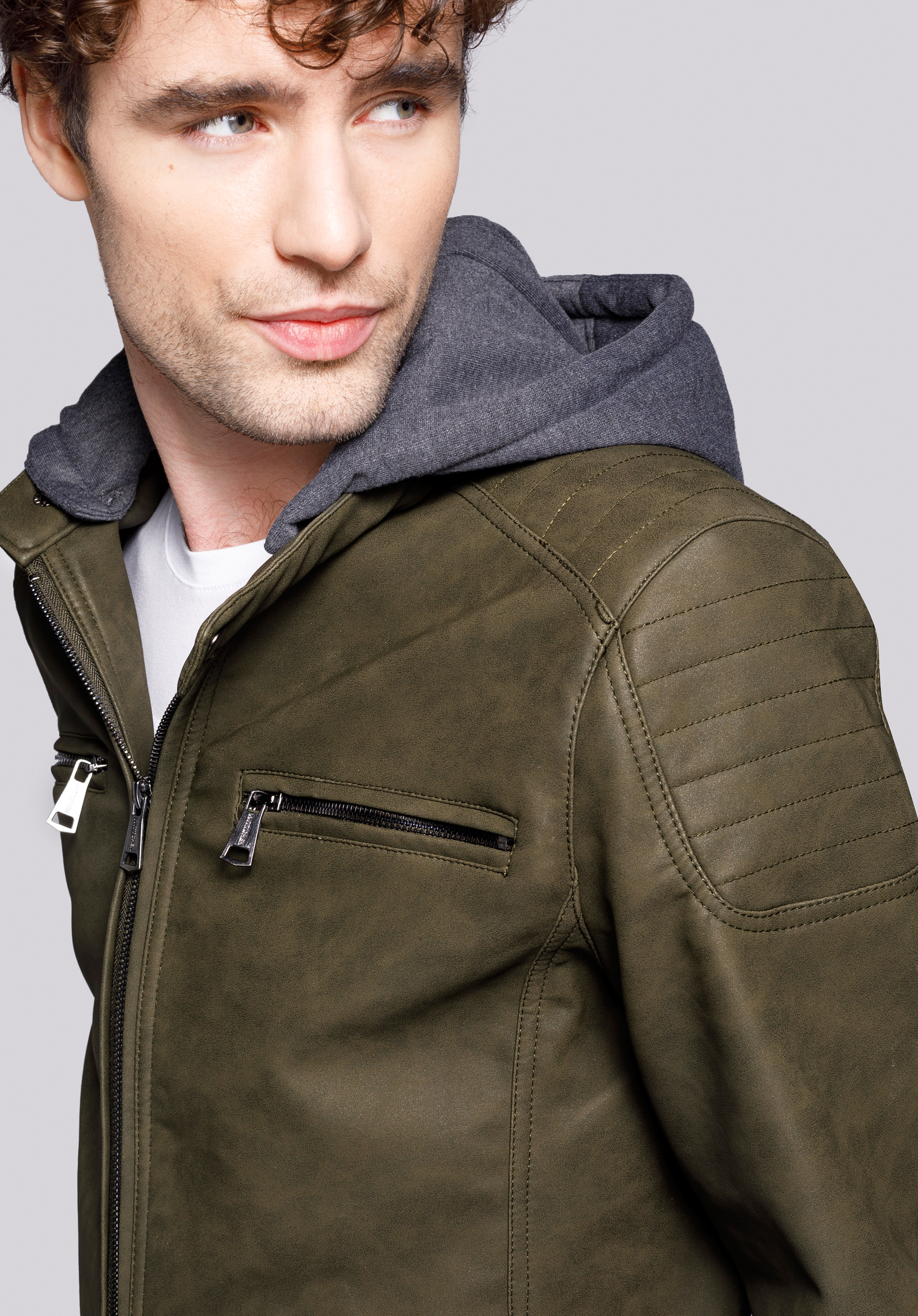 Wygodna, a jednocześnie stylowa kurtka z kapturem. Jest uszyta z ciekawej w dotyku, matowej skóry ekologicznej najwyższej jakości. Gruby dzianinowy kaptur można odpiąć – jest na zatrzaski. Telefon czy portfel schowasz do zamykanej na zatrzask wewnętrznej kieszeni. Kurtka ma na ramionach pikowane wzmocnienia, które kojarzą się z modą rock and rollową. Do pionowych kieszeni bocznych wygodnie wsuniesz ręce lub kilka drobiazgów. Ta casualowa kurtka będzie pasować do wielu strojów, które masz w szafie: ulubionych dżinsów i bluzy czy chinosów z t-shirtem.