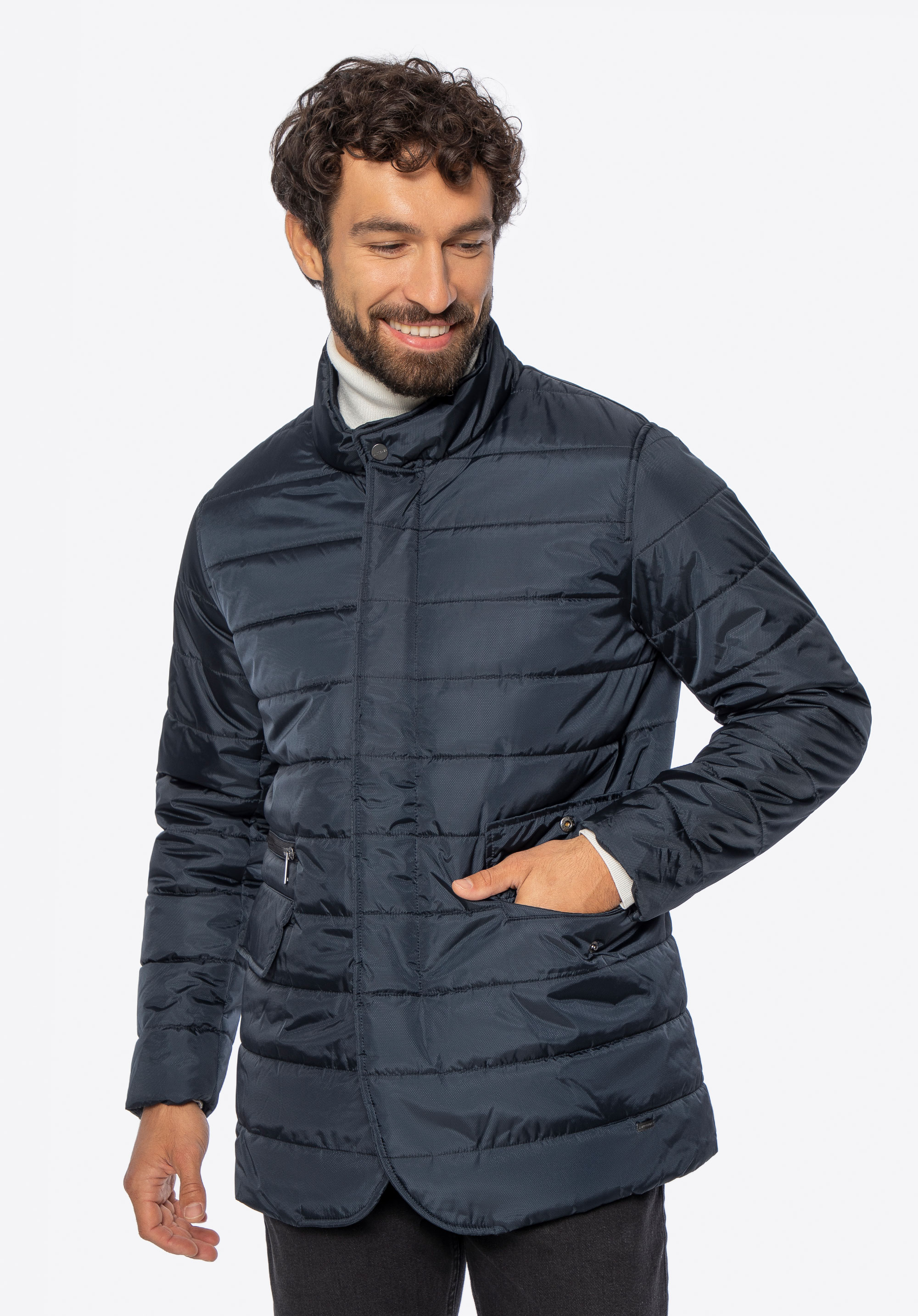 Męska kurtka z nylonu pikowana będzie idealna na chłodne poranki i wieczory, kiedy cenisz elegancję w praktycznym wydaniu. Nylon o delikatnym połysku, stójka na zatrzask oraz zamek ukryty pod listwą chronią przed wiatrem, a funkcjonalne kieszenie pozwalają wygodnie ogrzać dłonie i mieć drobiazgi przy sobie.