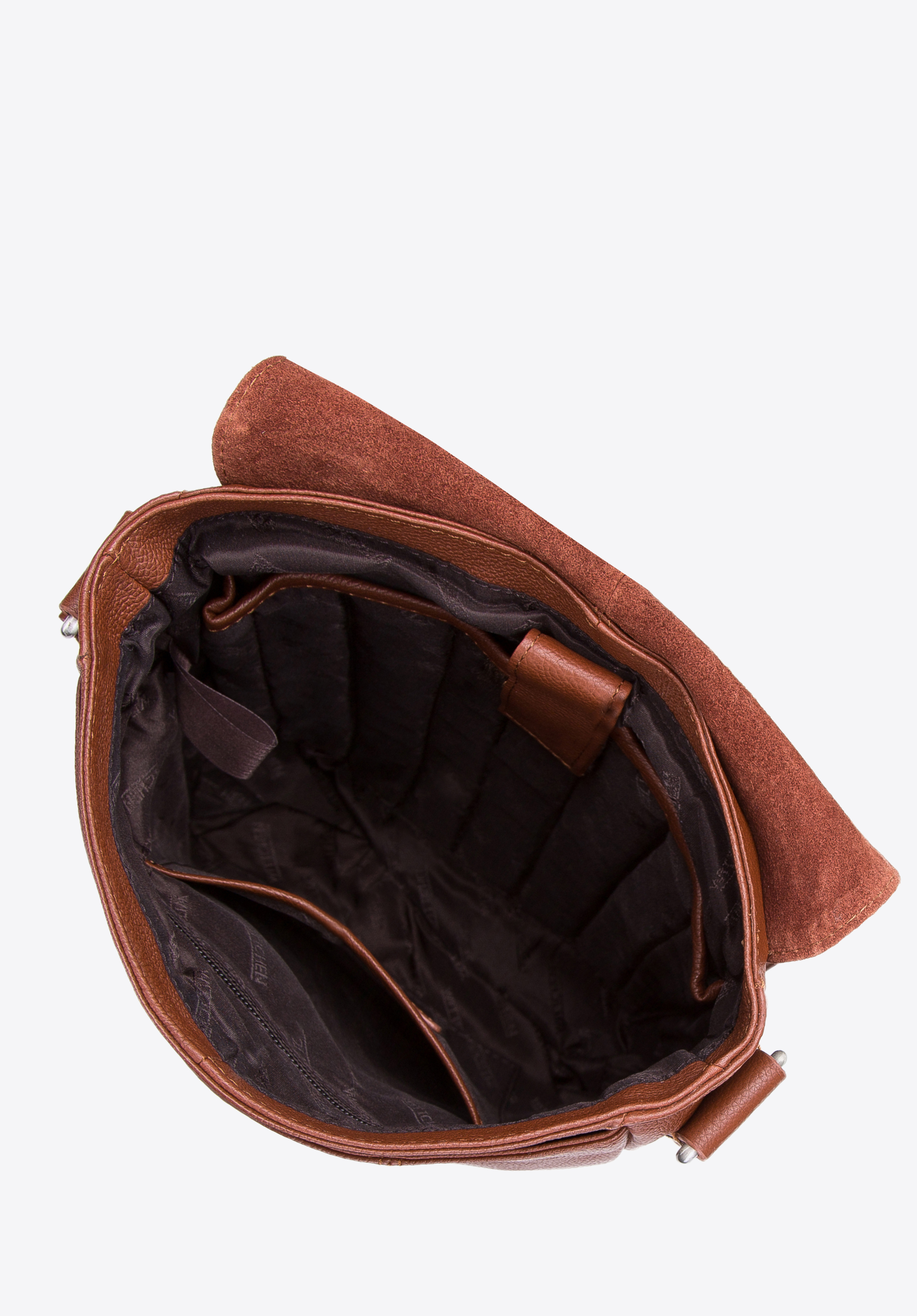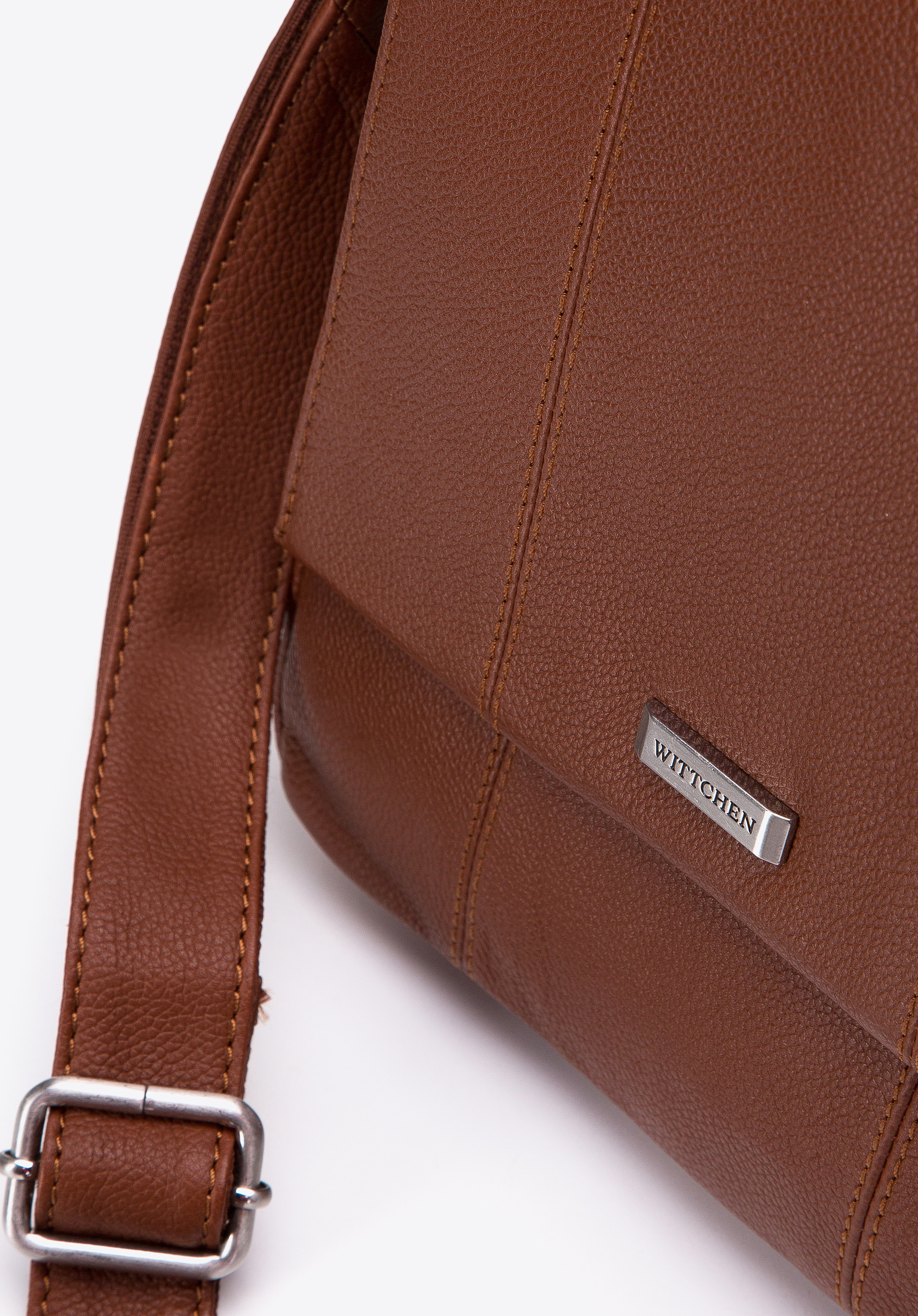 z miękkiej w dotyku skóry naturalnej o groszkowanej fakturze. Klapa zamykana na magnes kryje pod spodem dużą kieszeń, w której możesz schować to, co chcesz mieć szybko pod ręką. W głównej komorze zmieścisz portfel, kalendarz, telefon i kilka drobiazgów, a