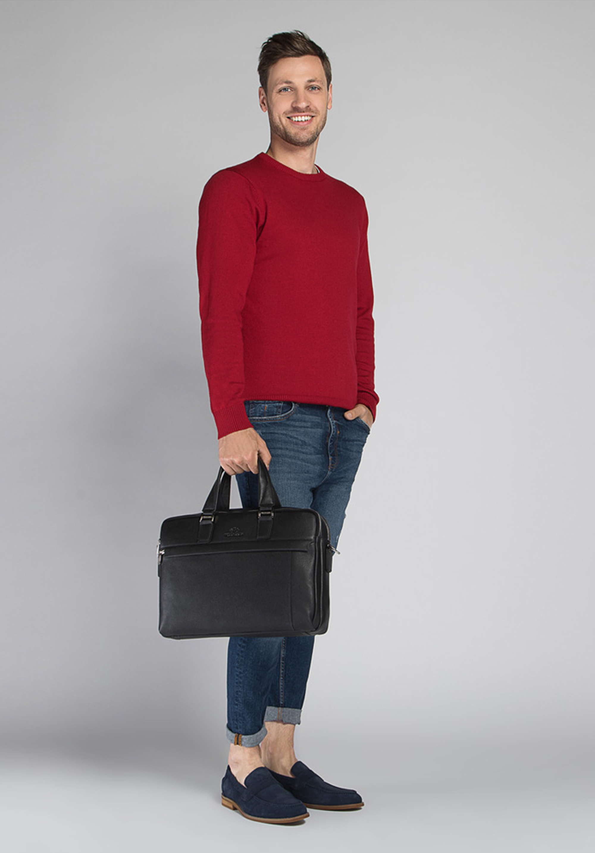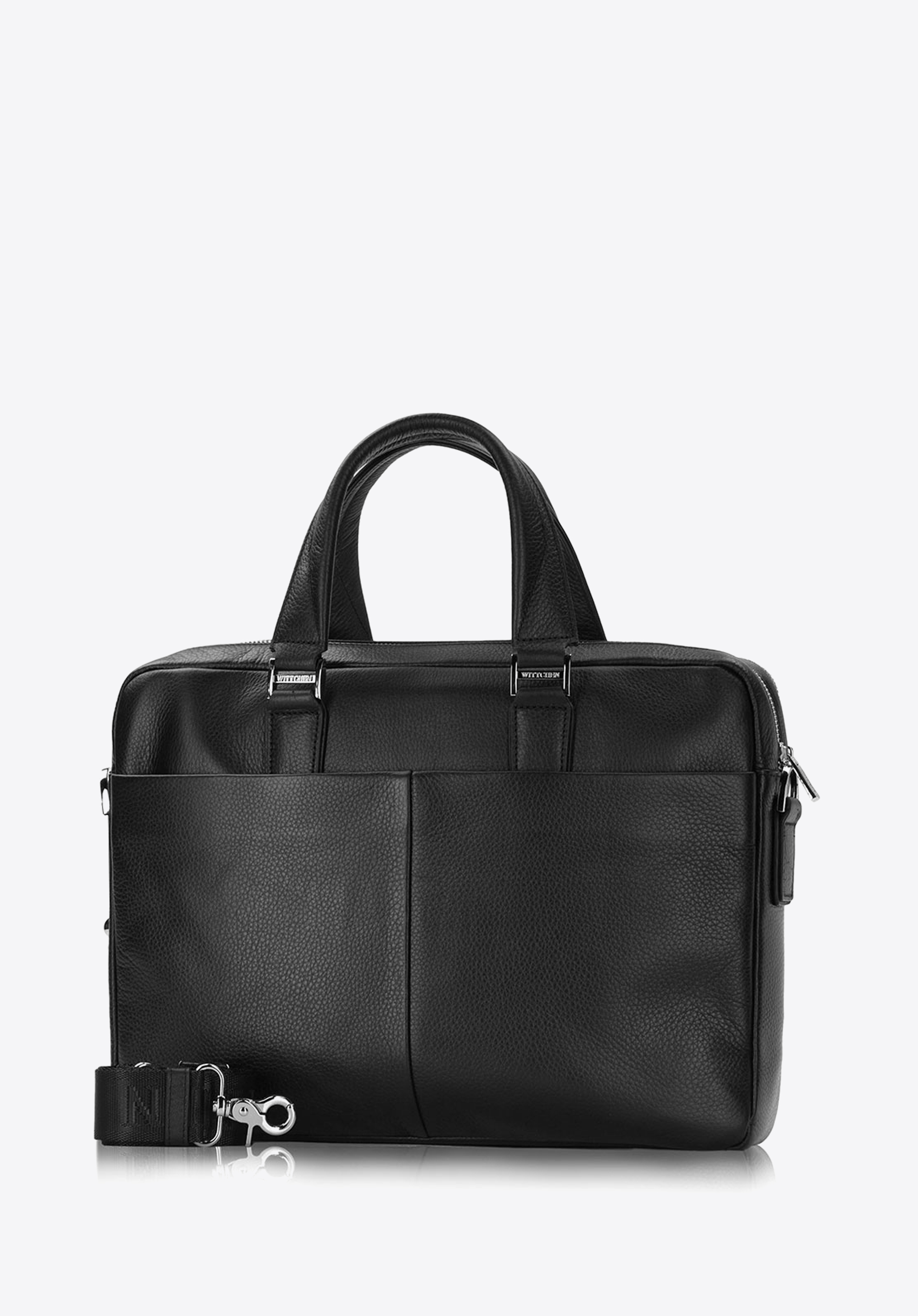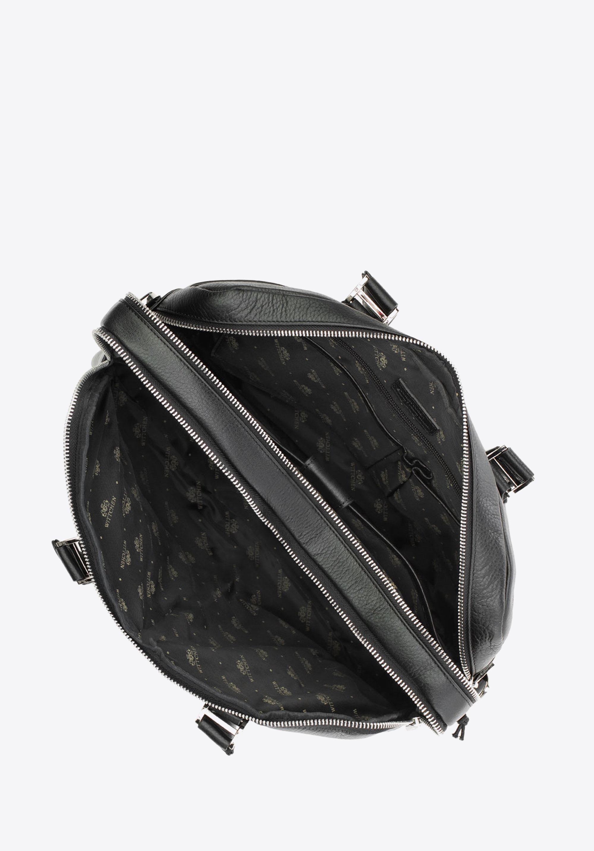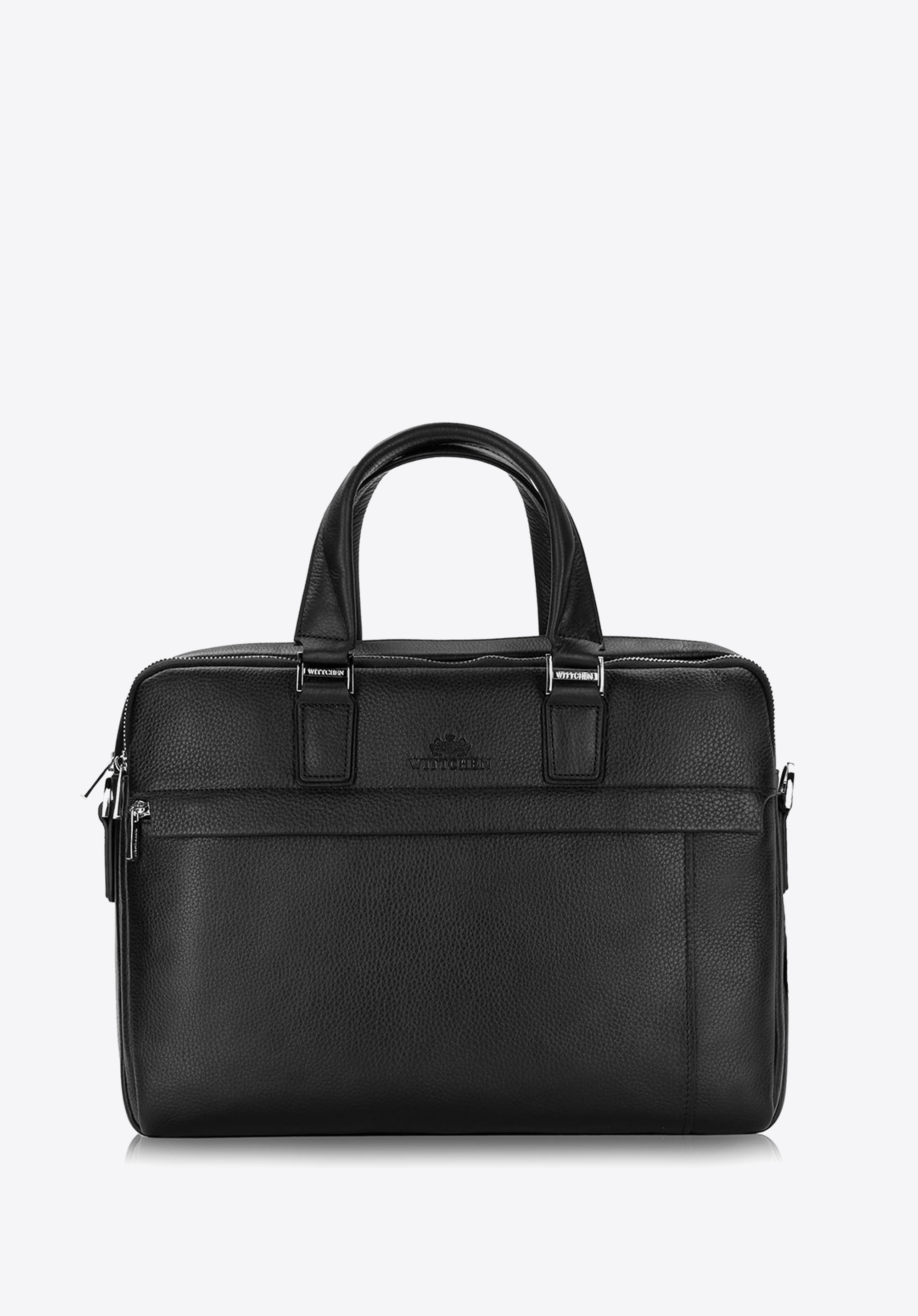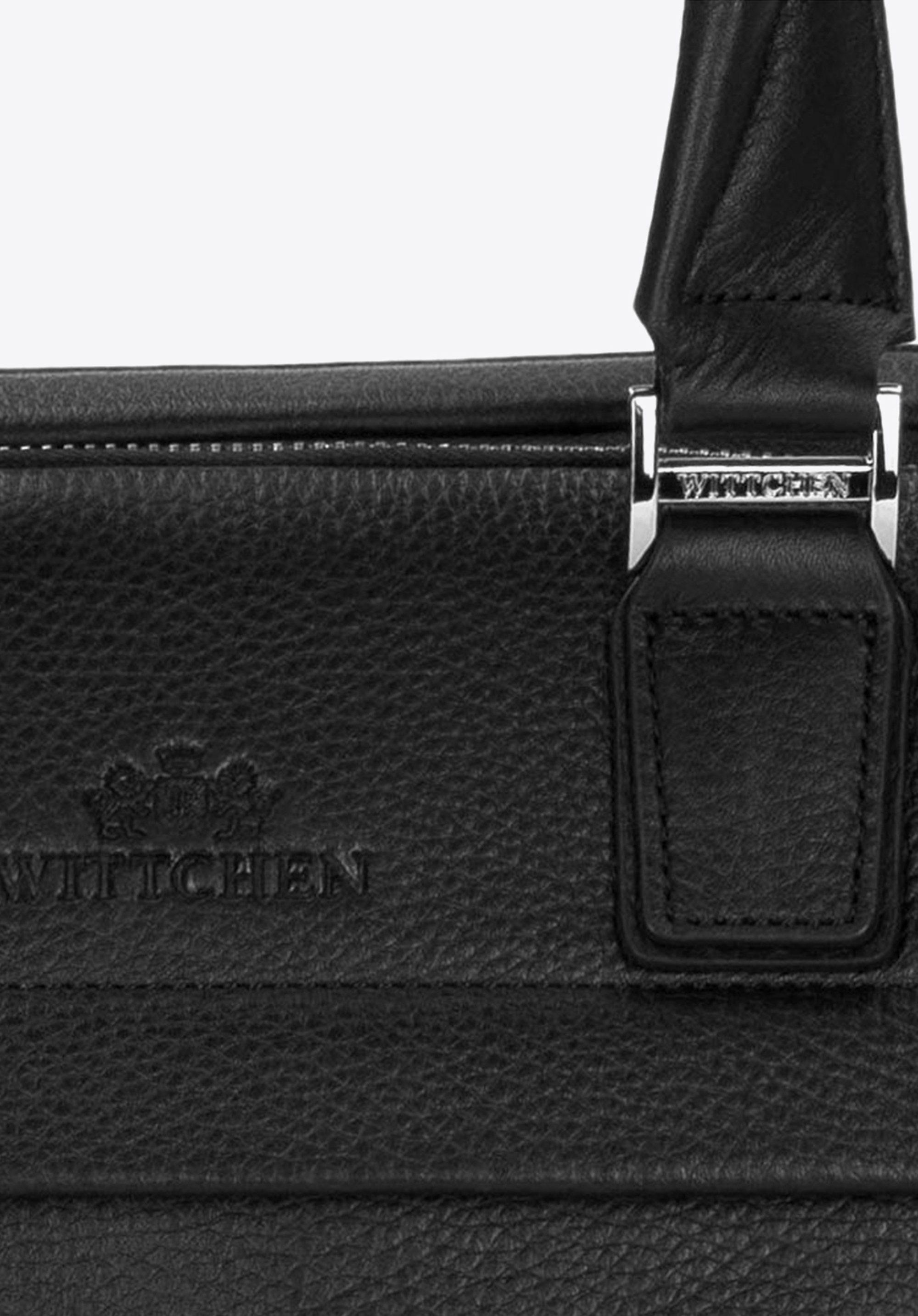 Czarna torba na komputer przenośny wykonana z cielęcej skóry o wyraziście groszkowanej strukturze. Stylowy, klasyczny krój ozdobiony jest srebrnymi wykończeniami oraz tłoczeniem z herbem WITTCHEN. Wysokiej klasy model pomieści nie tylko sprzęt elektroniczny, ale również akcesoria i format A4. Nasza rada: zadbaj o elegancję i profesjonalizm Twojego wizerunku.