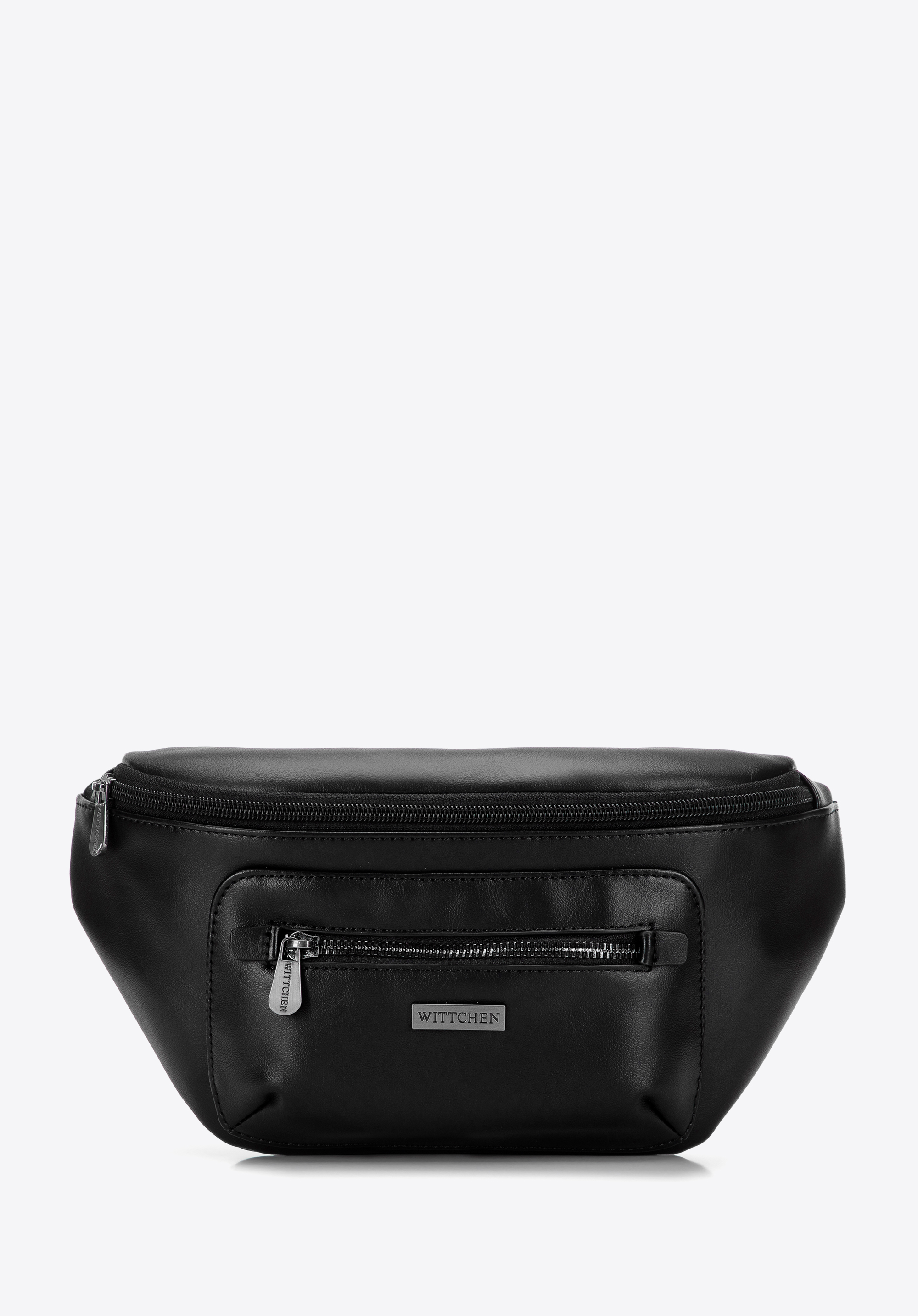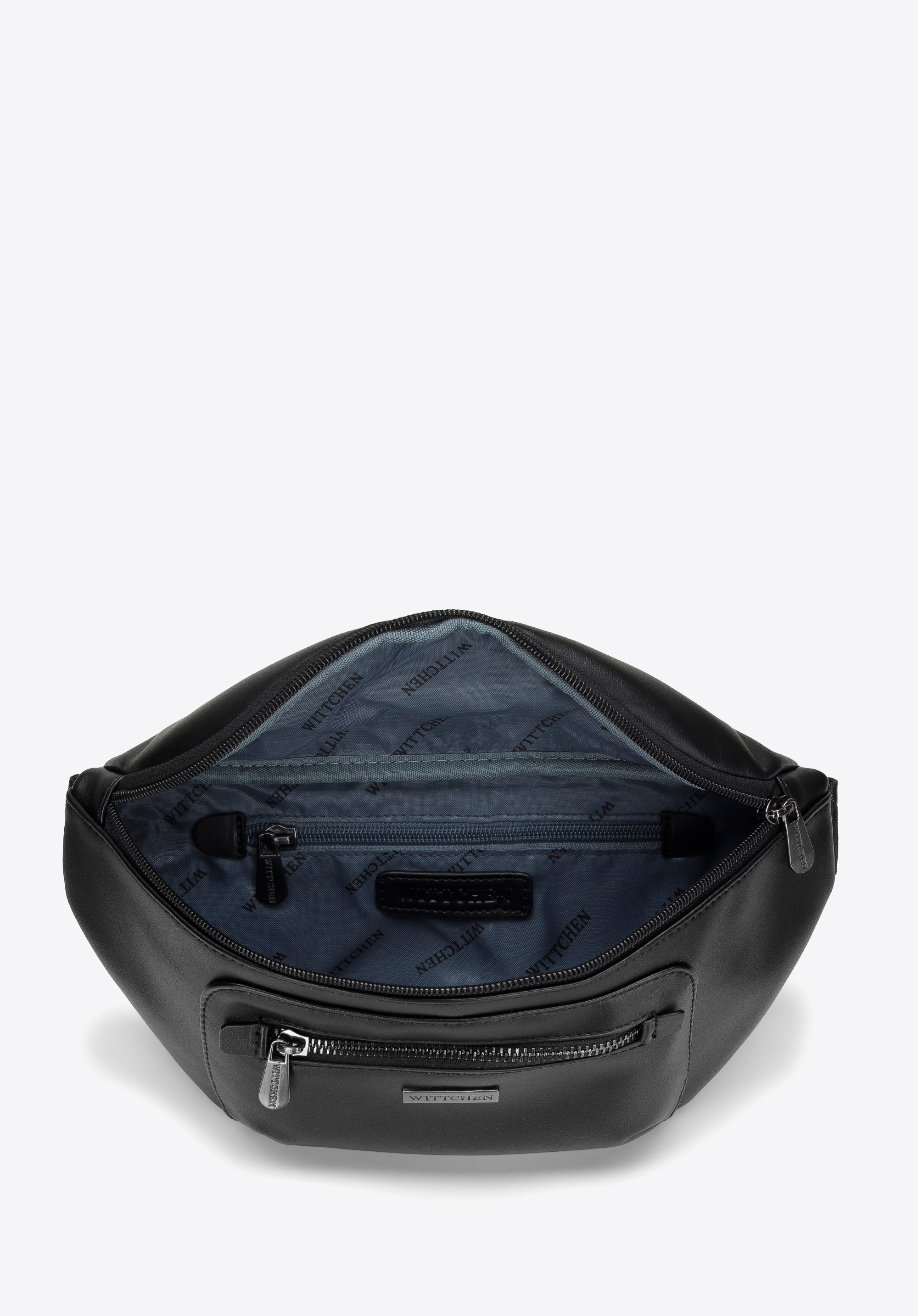 Męska torebka nerka z ekoskóry z błyszczącym suwakiem z przodu to ponadczasowy dodatek na wiele sezonów.