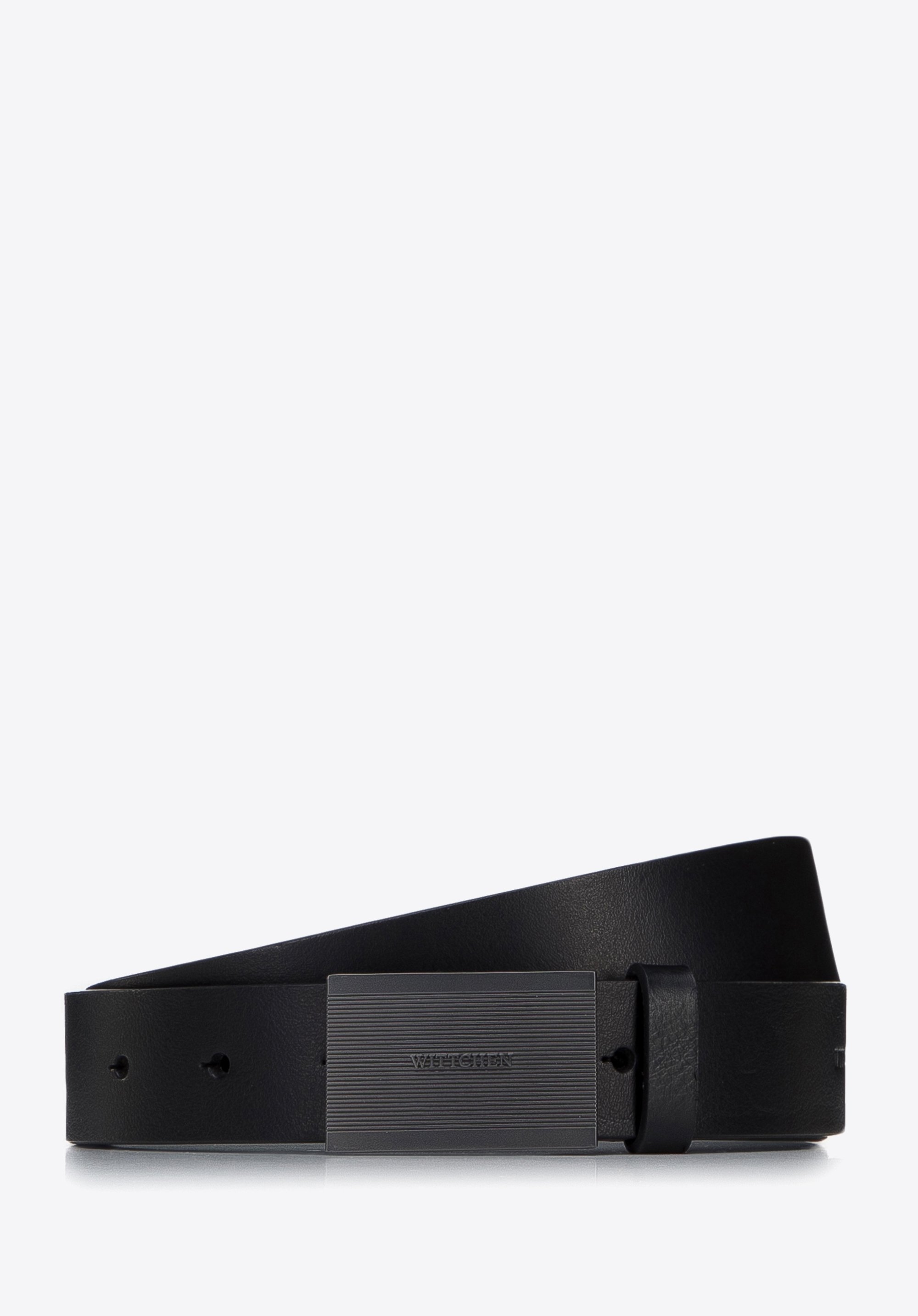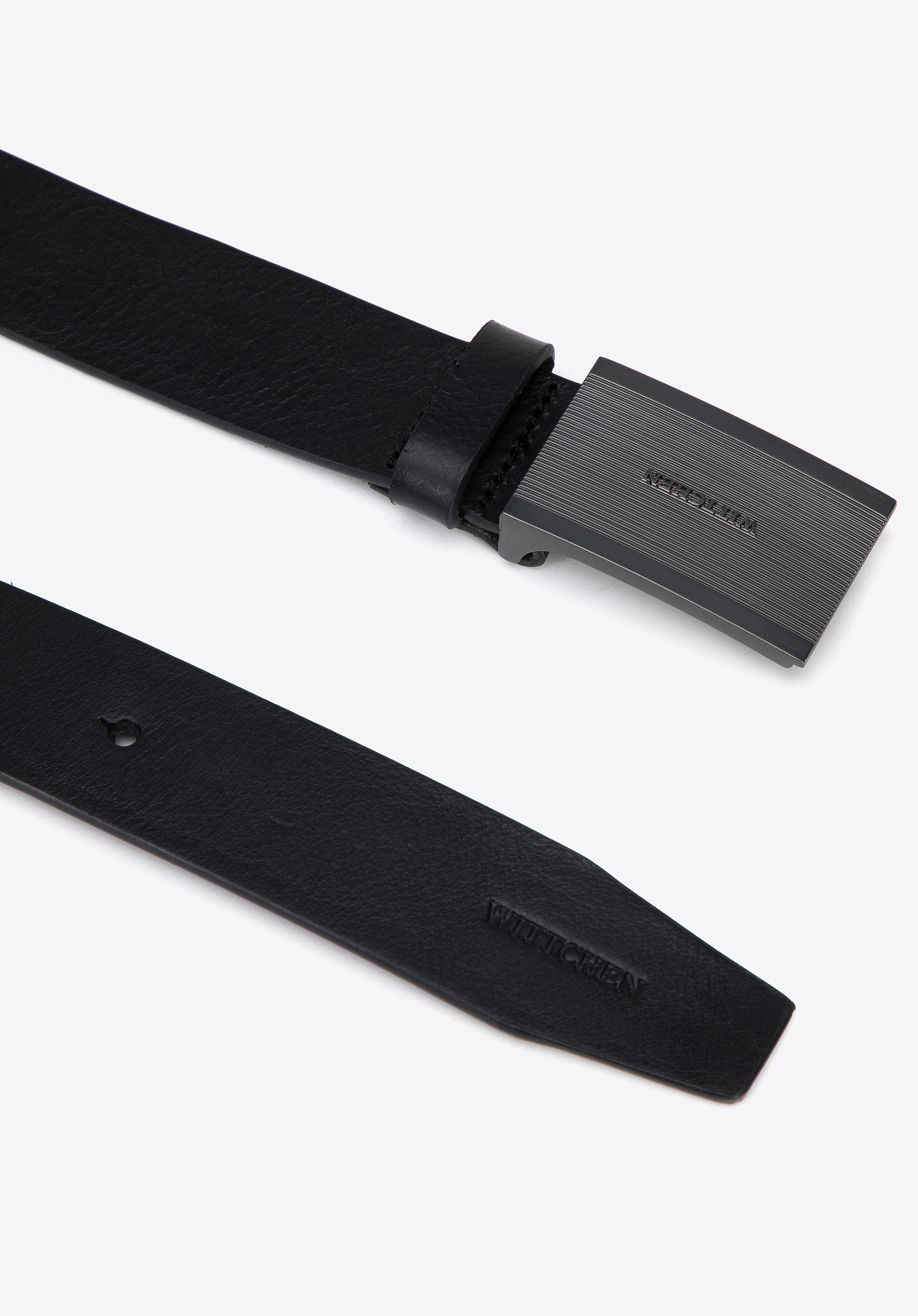 pełna klamra z matowego metalu w kolorze grafitowym, tłoczona w poziome paseczki. Męski pasek skórzany z pełną klamrą tłoczoną w paski to dyskretny, a charakterystyczny dodatek, który możesz nosić codziennie.