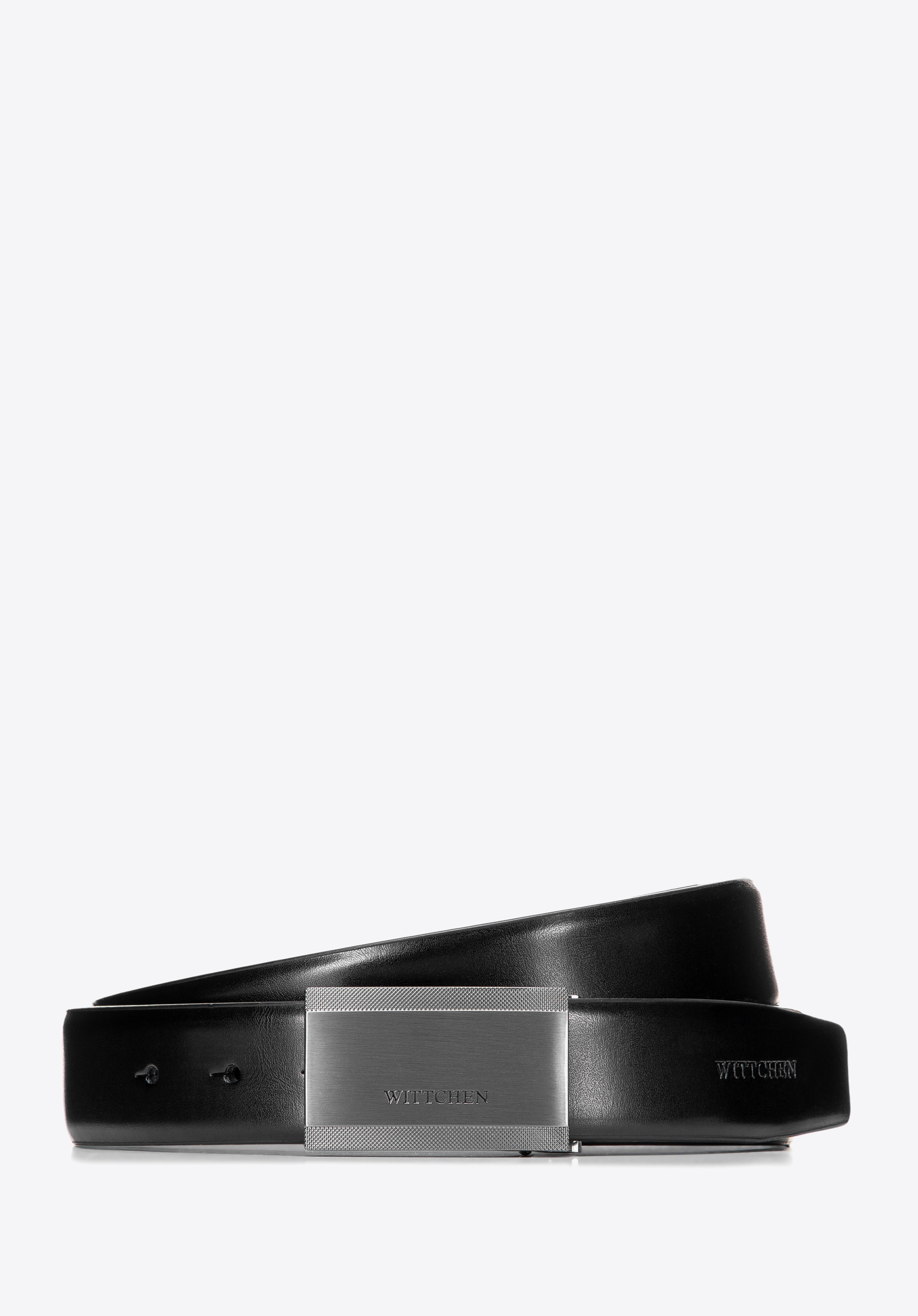 Nowoczesna elegancja – męski pasek skórzany z pełną klamrą i logo producenta