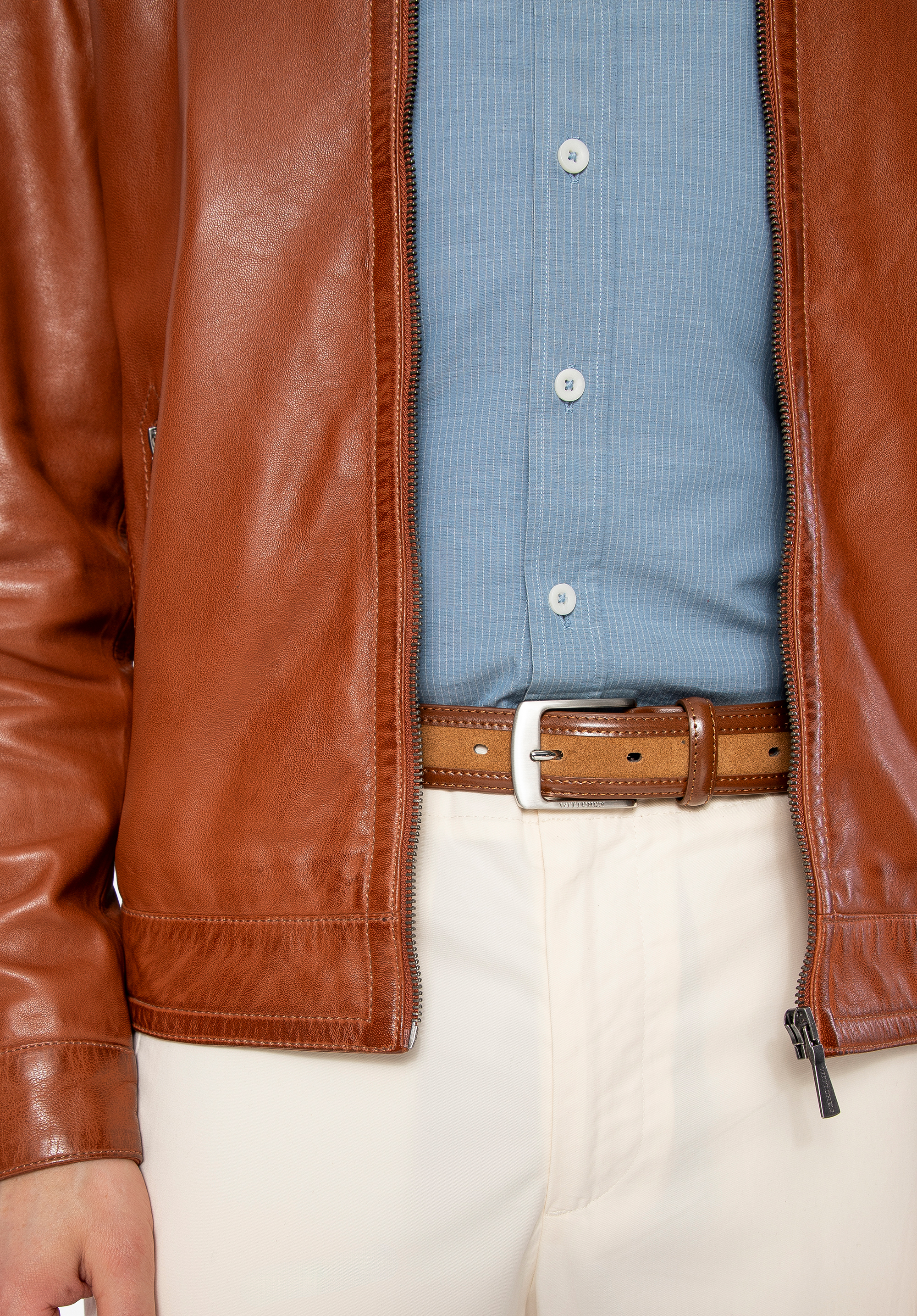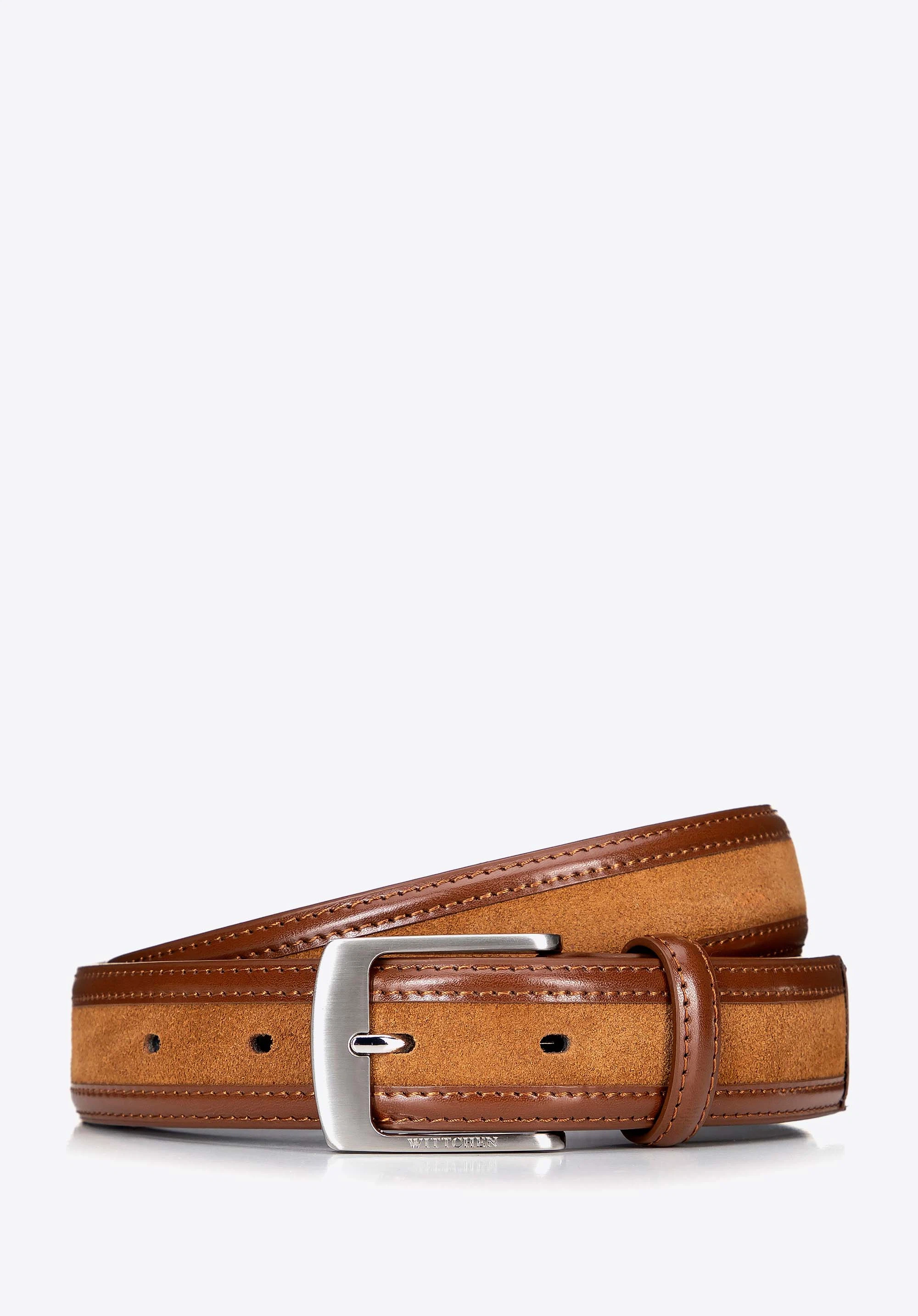 Męski pasek ze skóry w dwie faktury dopełni garnitur i chinosy, gdy chcesz podkreślić styl bez nadmiernej ostentacji. Połączenie gładkiej skóry z zamszowym wykończeniem, podwójne stębnowanie oraz możliwość skrócenia zapewniają dopasowanie i dopracowaną elegancję na lata.