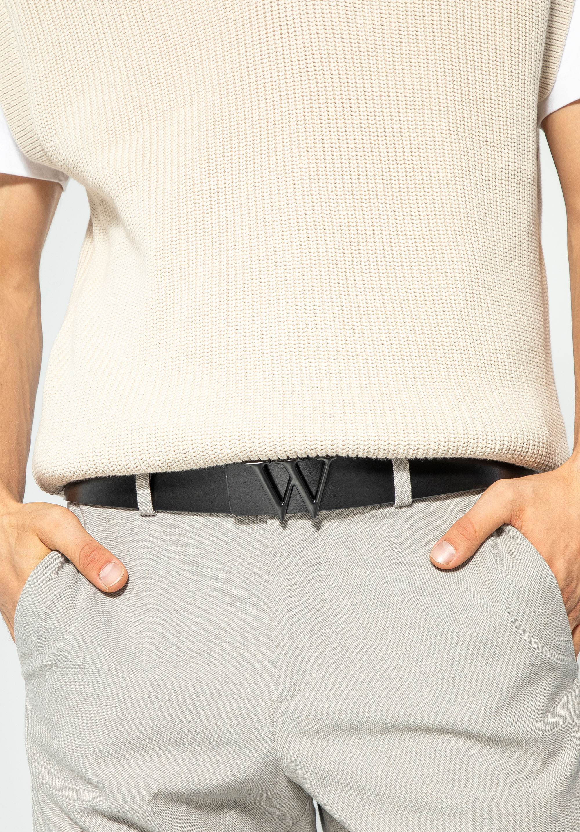 Odkryj elegancję i wszechstronność naszego gładkiego paska ze skóry naturalnej, który doskonale dopełni każdą stylizację. Duża klamra w kształcie litery "W" przyciąga wzrok i dodaje charakteru, a kontrastowy kolor wewnątrz klamry wprowadza subtelną nutę zaskoczenia.