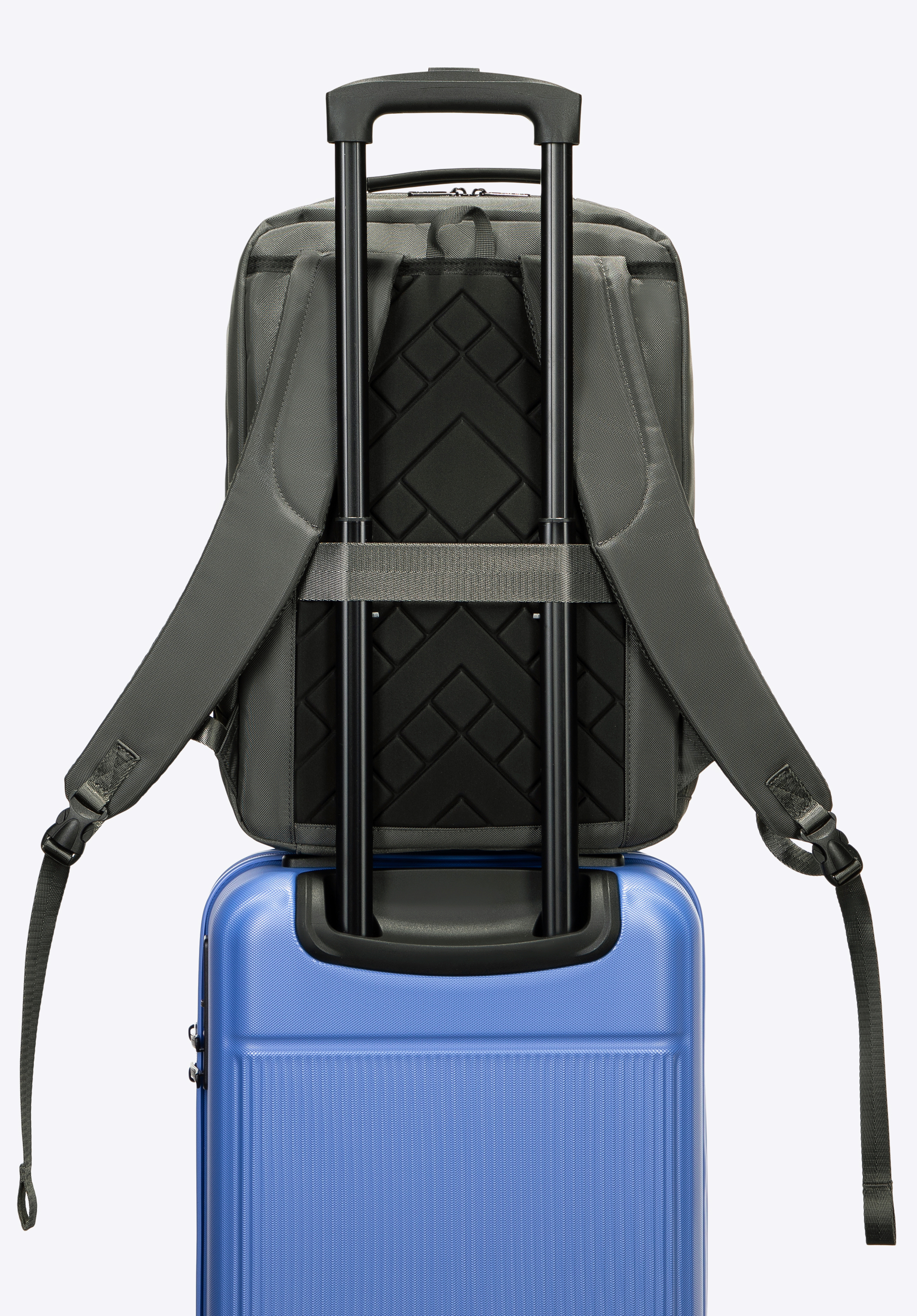 - Pasek do zaczepienia na uchwycie walizki: Ułatwia podróżowanie – plecak stabilnie trzyma się na stelażu walizki, a Ty masz wolne ręce.