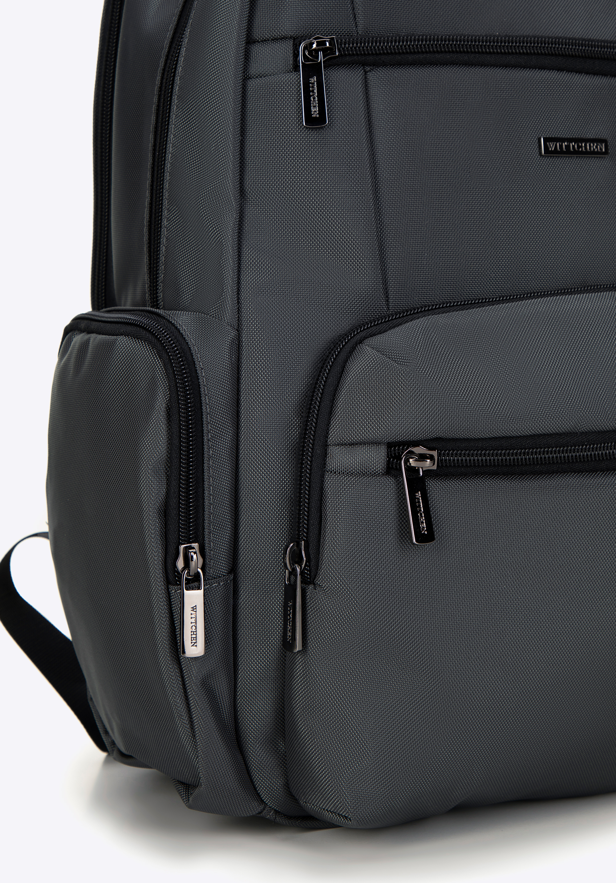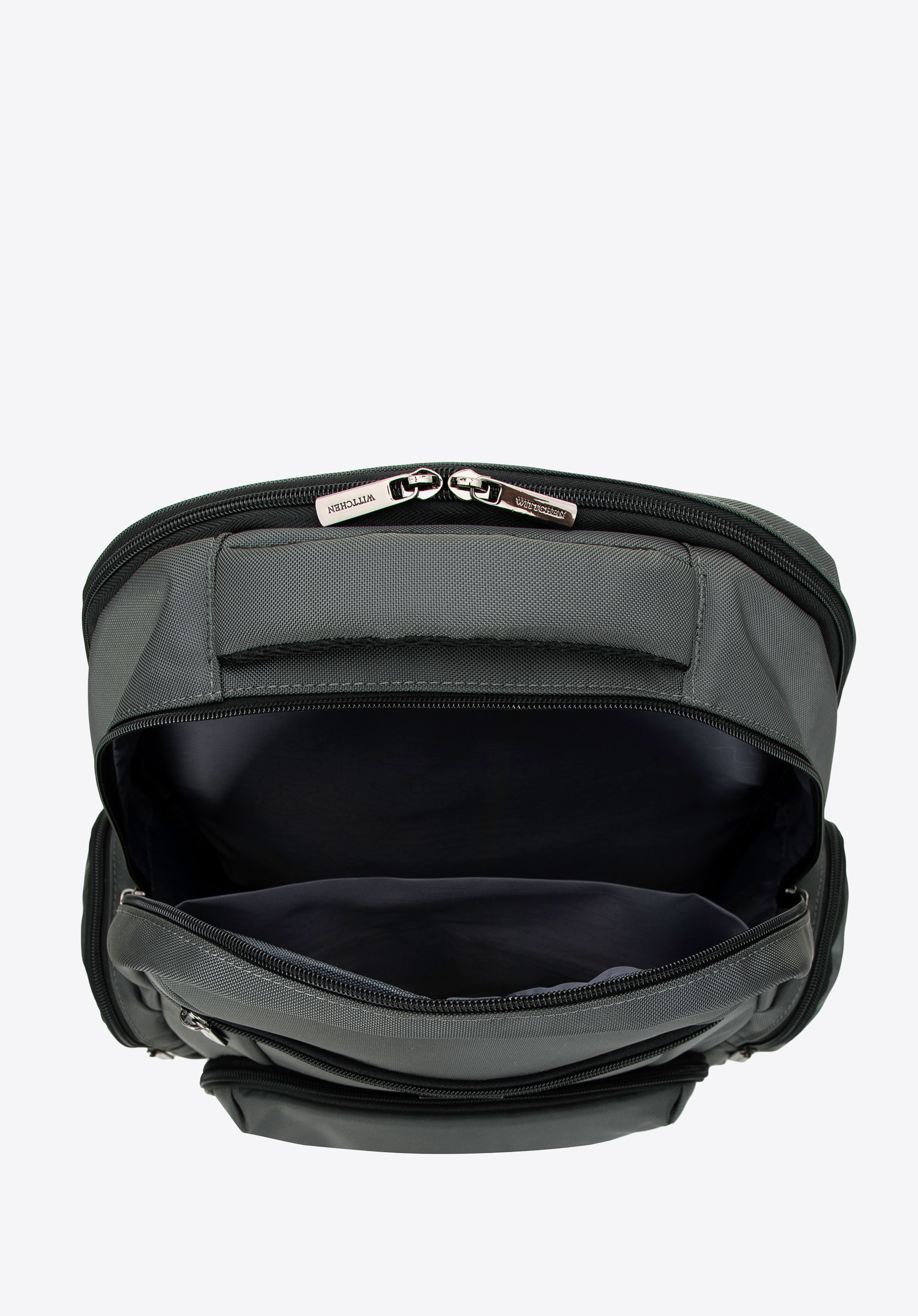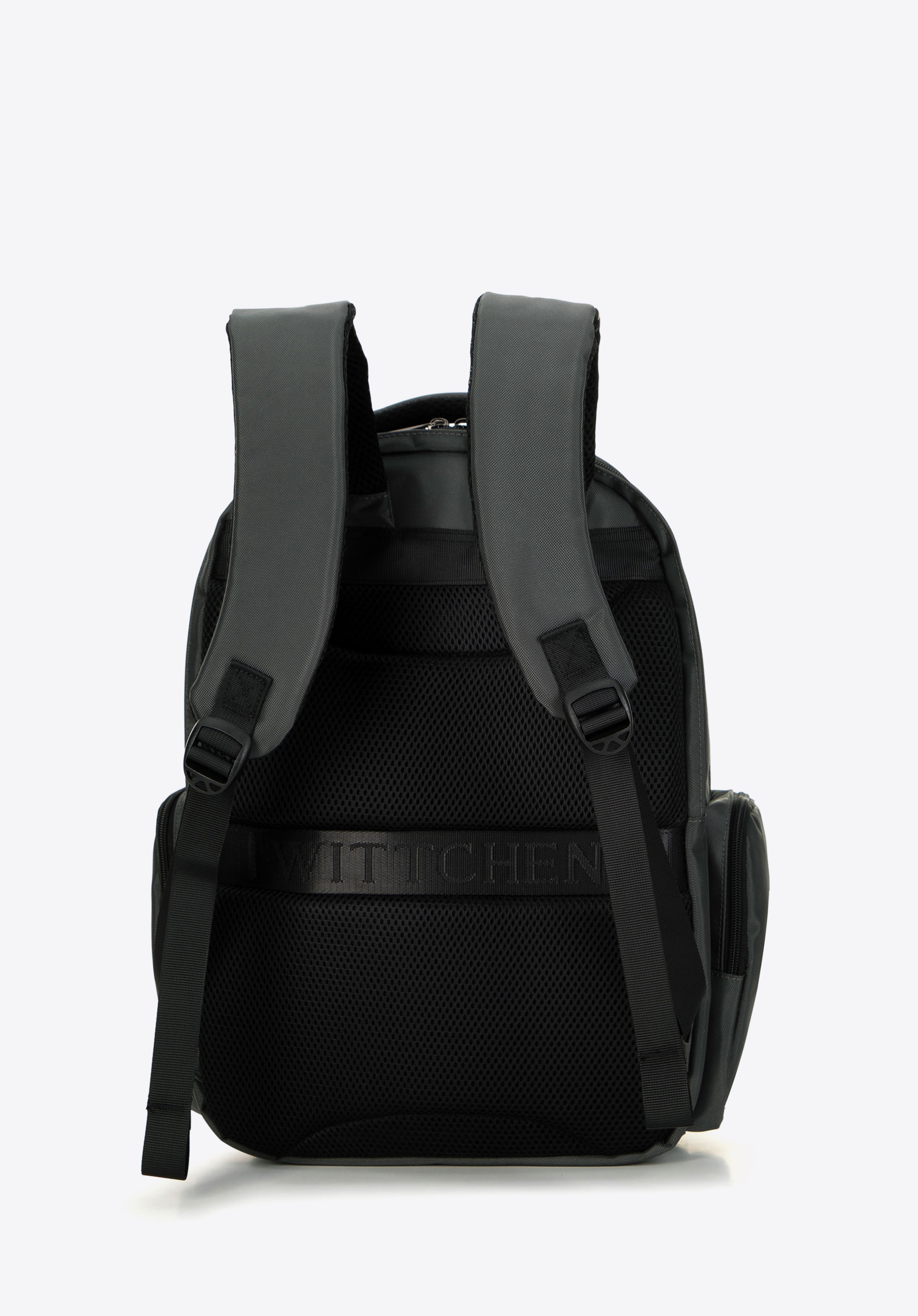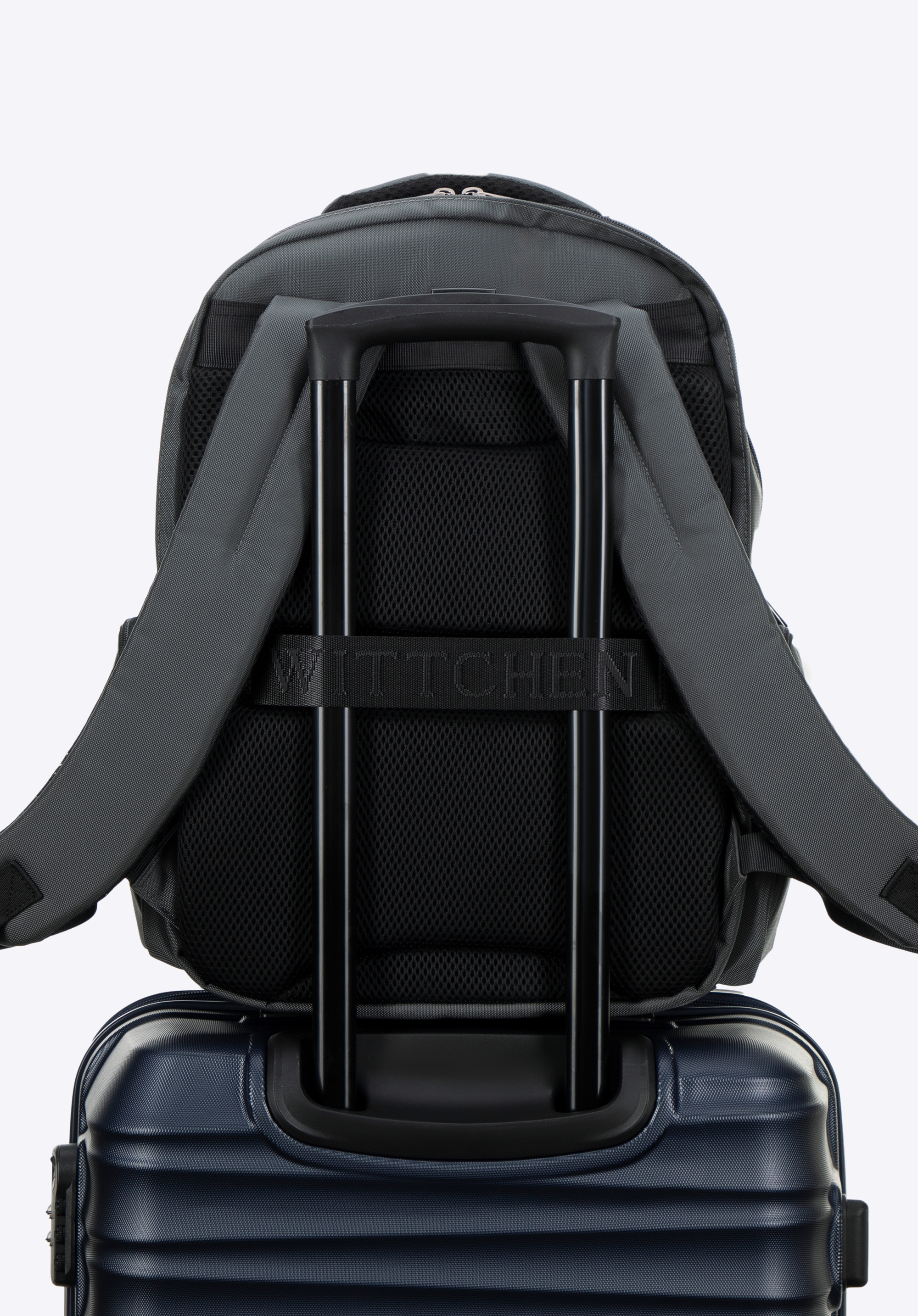 - Uchwyt na walizkę: Umieszczony z tyłu plecaka, z subtelnym logo producenta, umożliwia wygodne przypięcie do walizki podczas podróży.