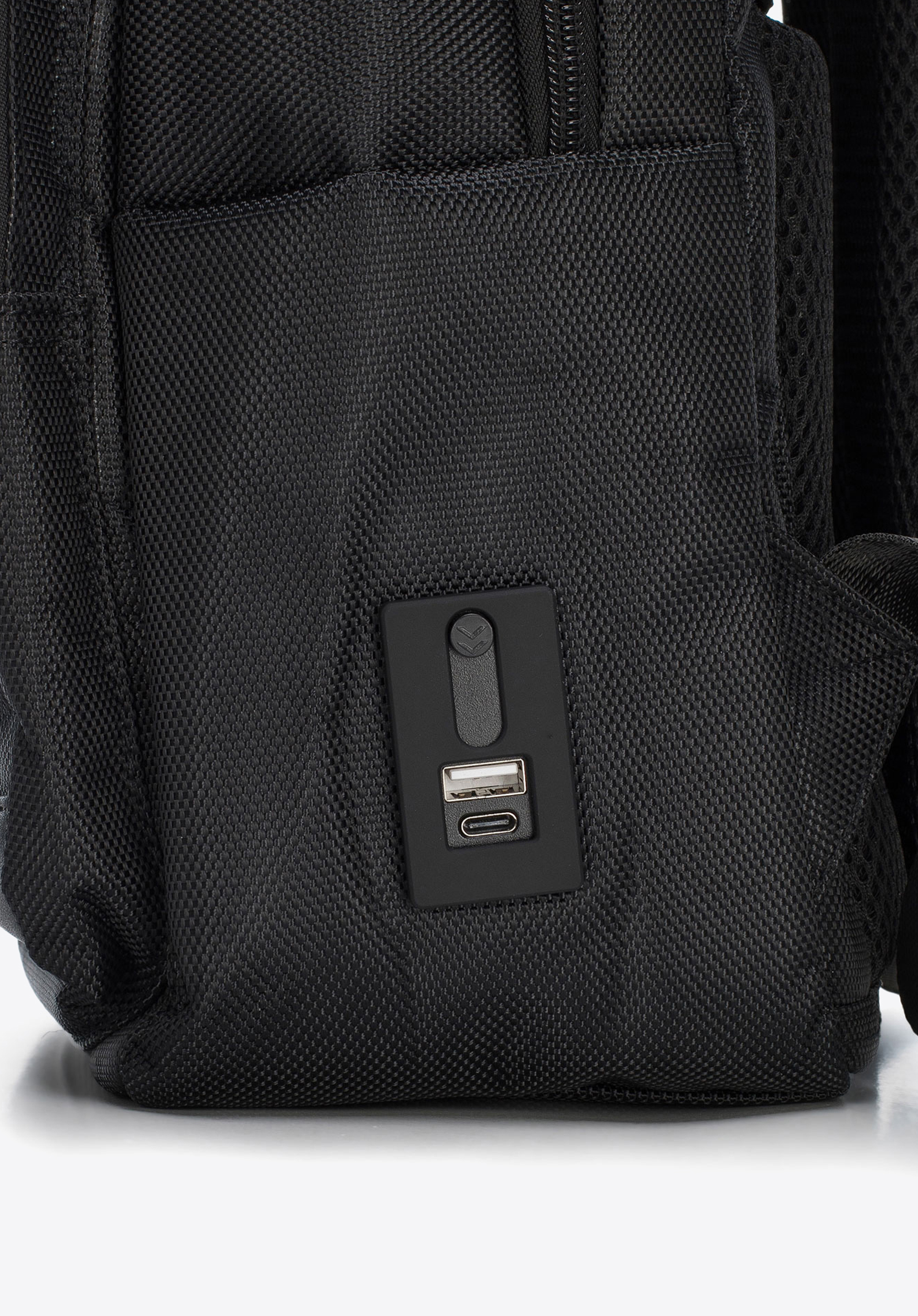 port USB do którego możesz podpiąć powerbank i umieścić go wewnątrz plecaka. Funkcjonalności dodaje mu
