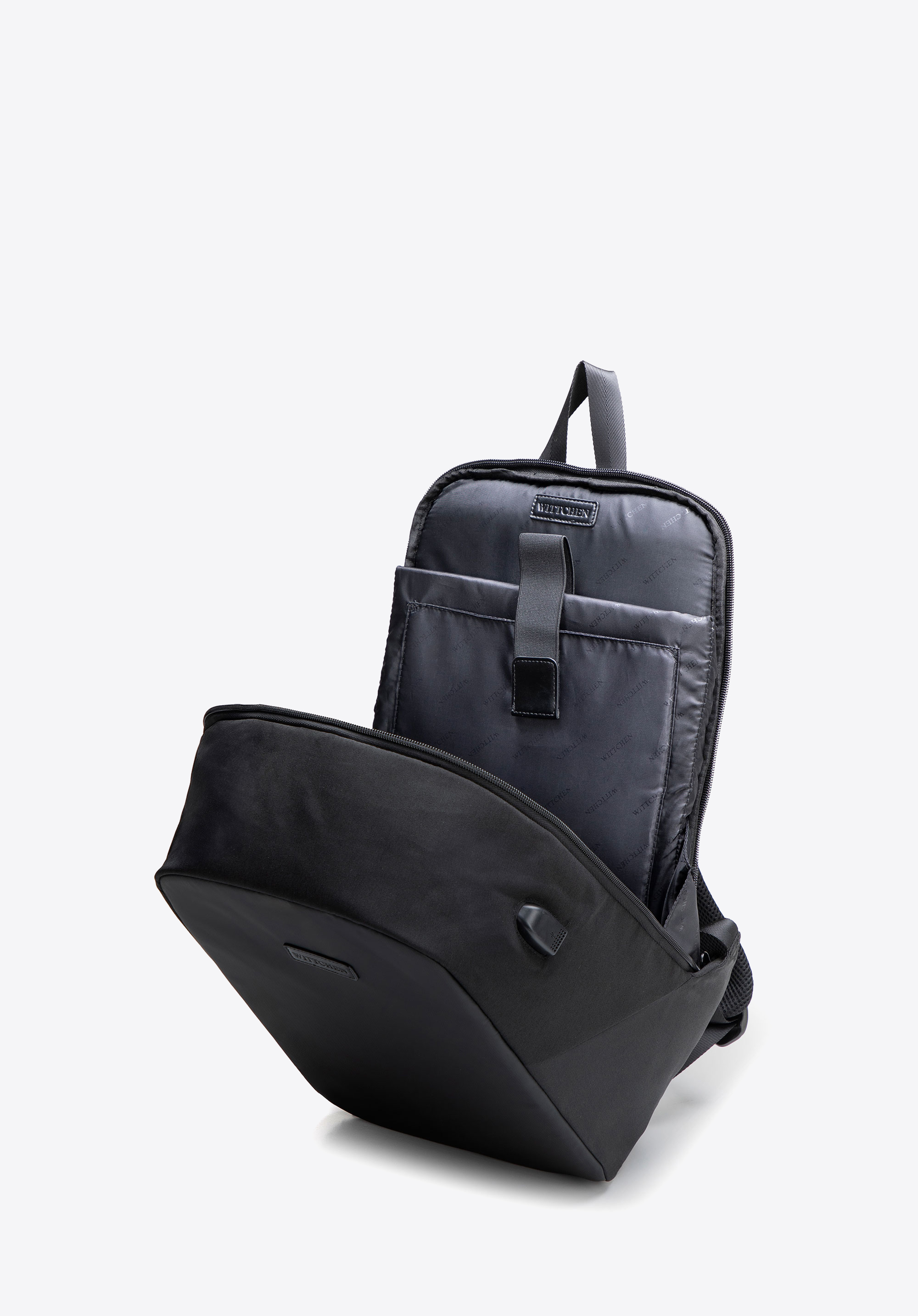 - Główna komora z praktycznym układem kieszeni: Po jednej stronie znajdują się 4 kieszenie (w tym jedna na zamek), a po drugiej — przegroda na laptopa oraz mniejsza kieszonka na drobiazgi.