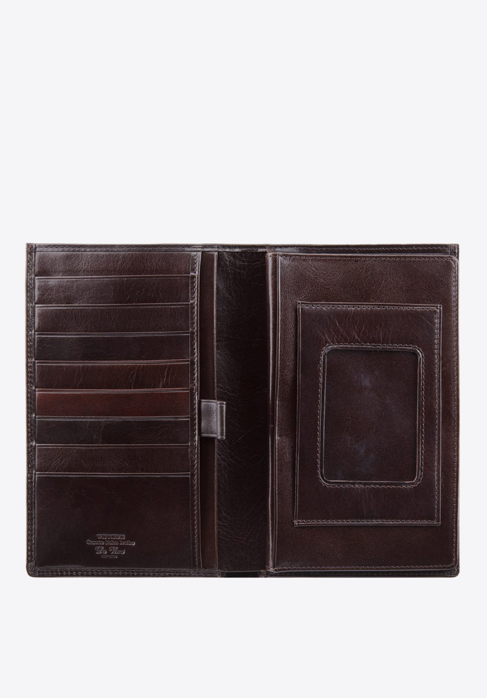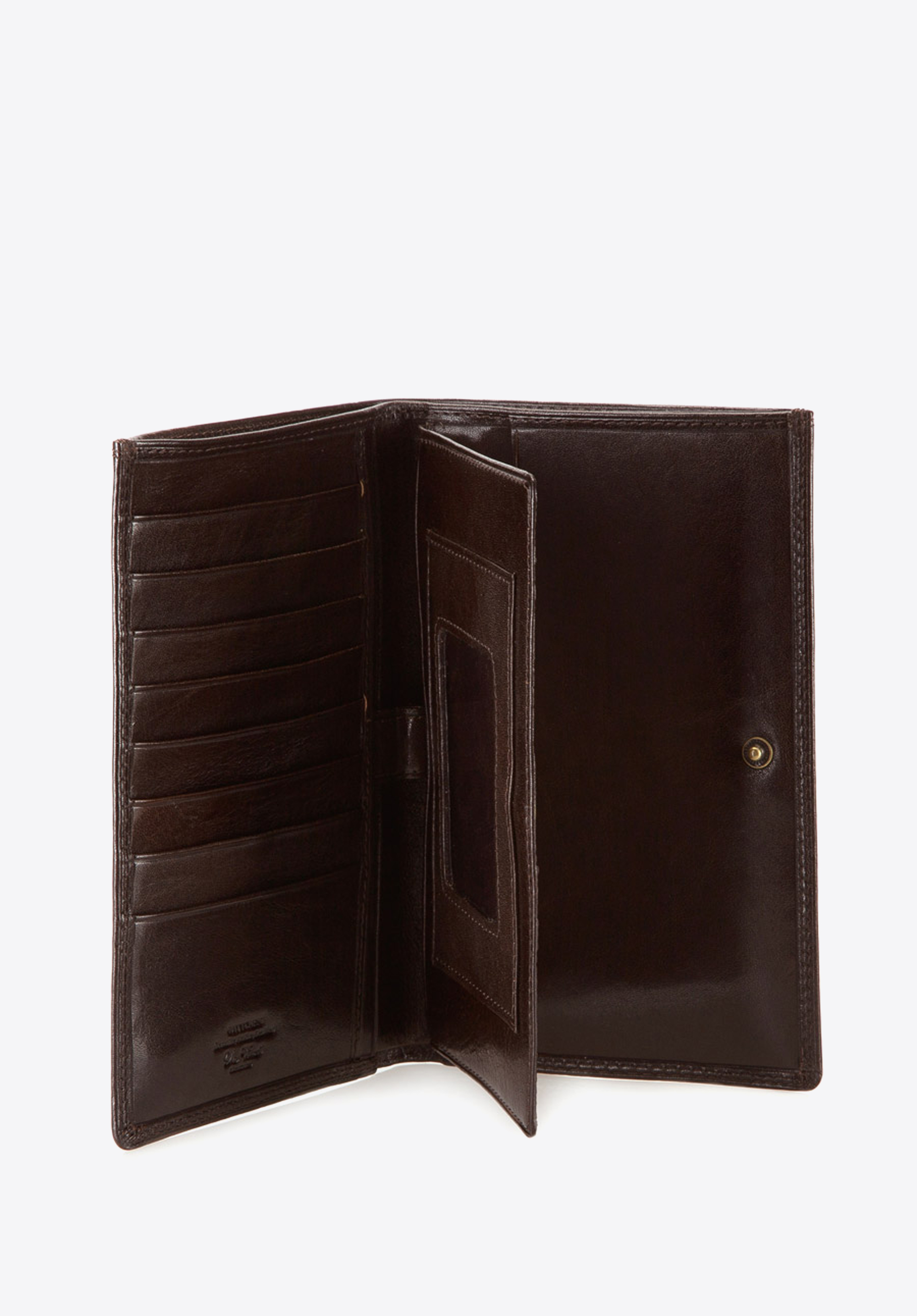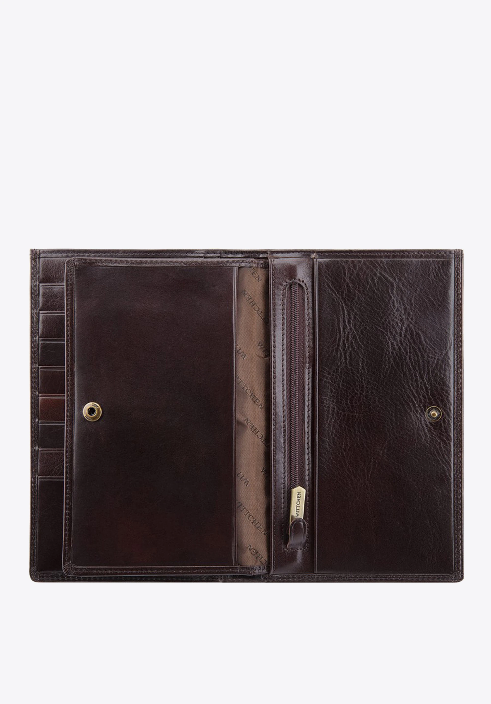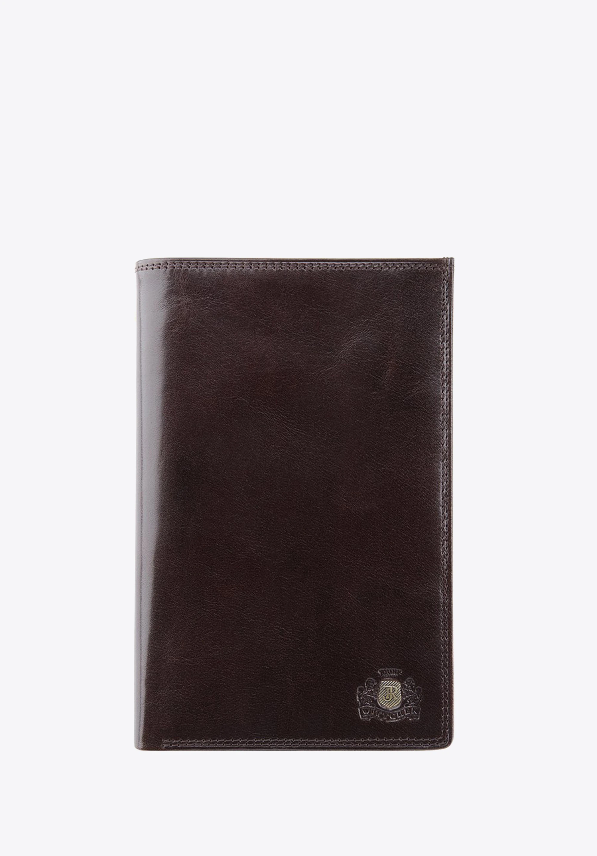 Pojemny portfel męski wykonany z najwyższej jakości skóry cielęcej. Luskusowe wykończenie modelu podkreśla delikatny połysk. Z przodu widoczne logo - inicjały ozdobione tarczą w kolorze starego złota na wytłoczonym herbie.