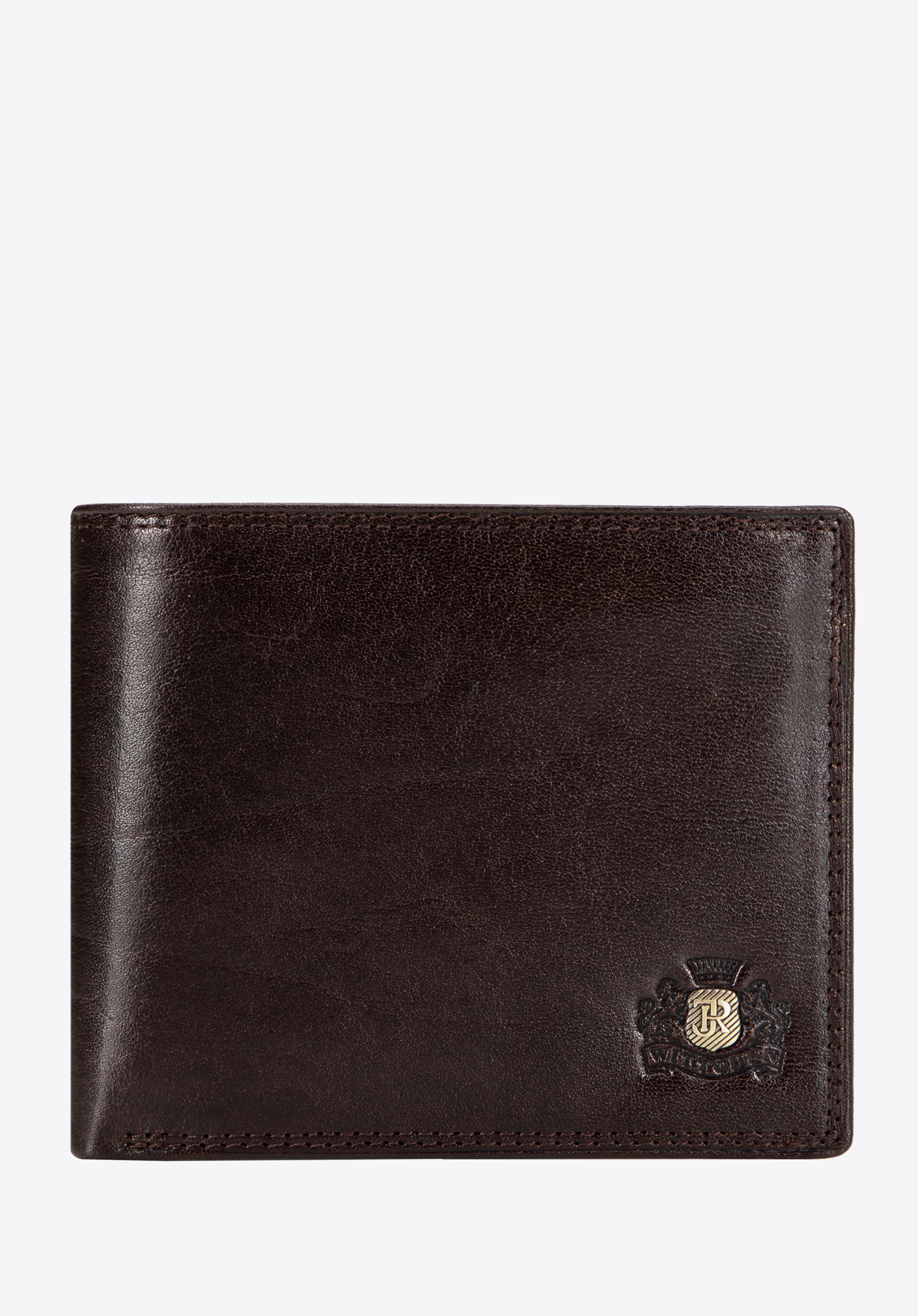 - Logo — inicjały ozdobione tarczą w kolorze starego złota: Elegancki akcent podkreślający luksusowy charakter portfela.