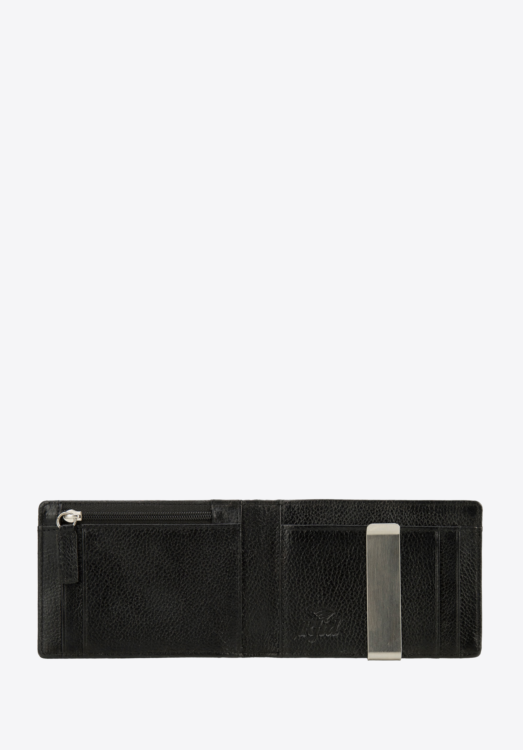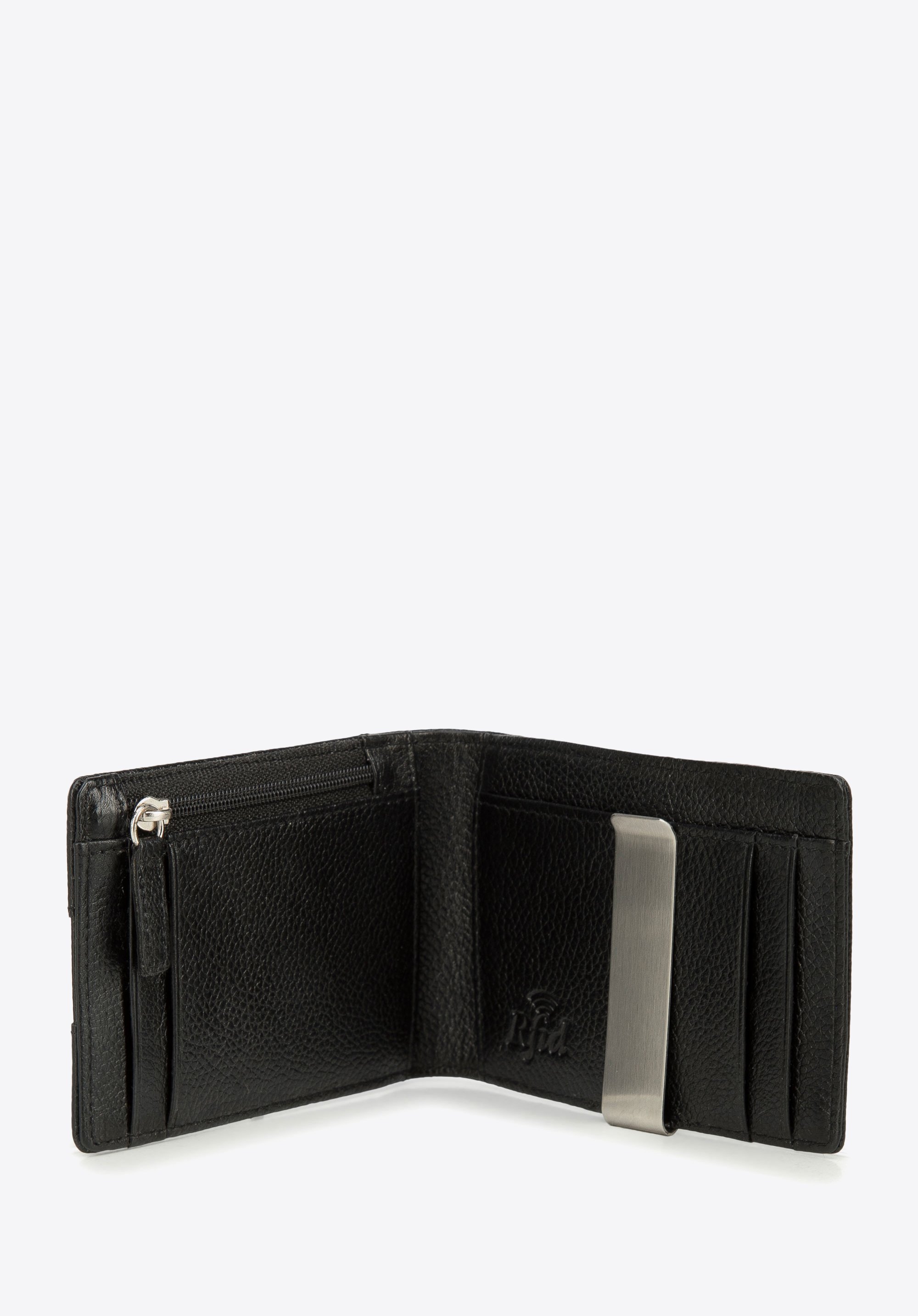 kilka miejsc na karty, zapinana na zamek kieszonka na bilon oraz uchwyt na banknoty. Portfel jest