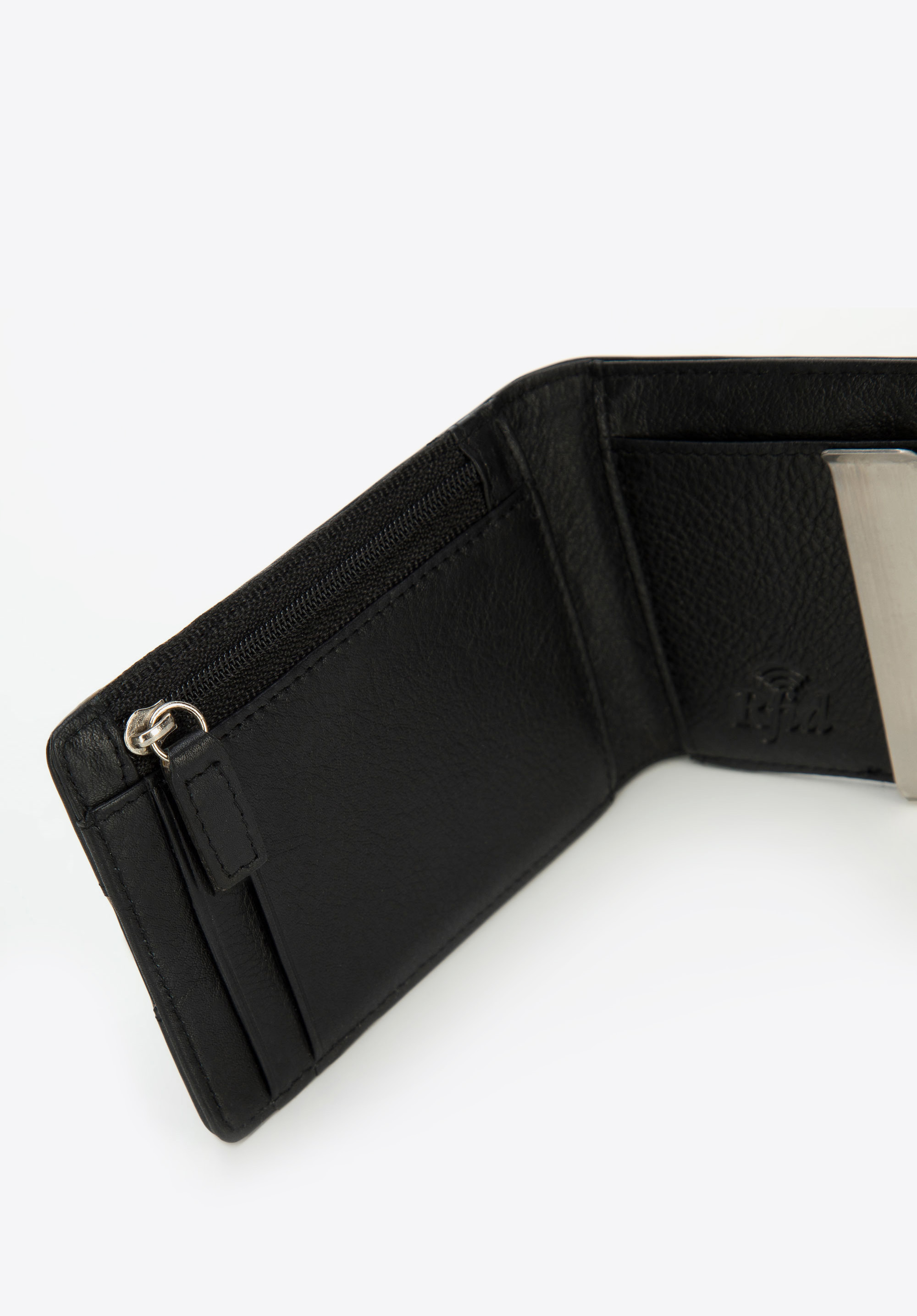kilka miejsc na karty, zapinana na zamek kieszonka na bilon oraz uchwyt na banknoty. Portfel jest