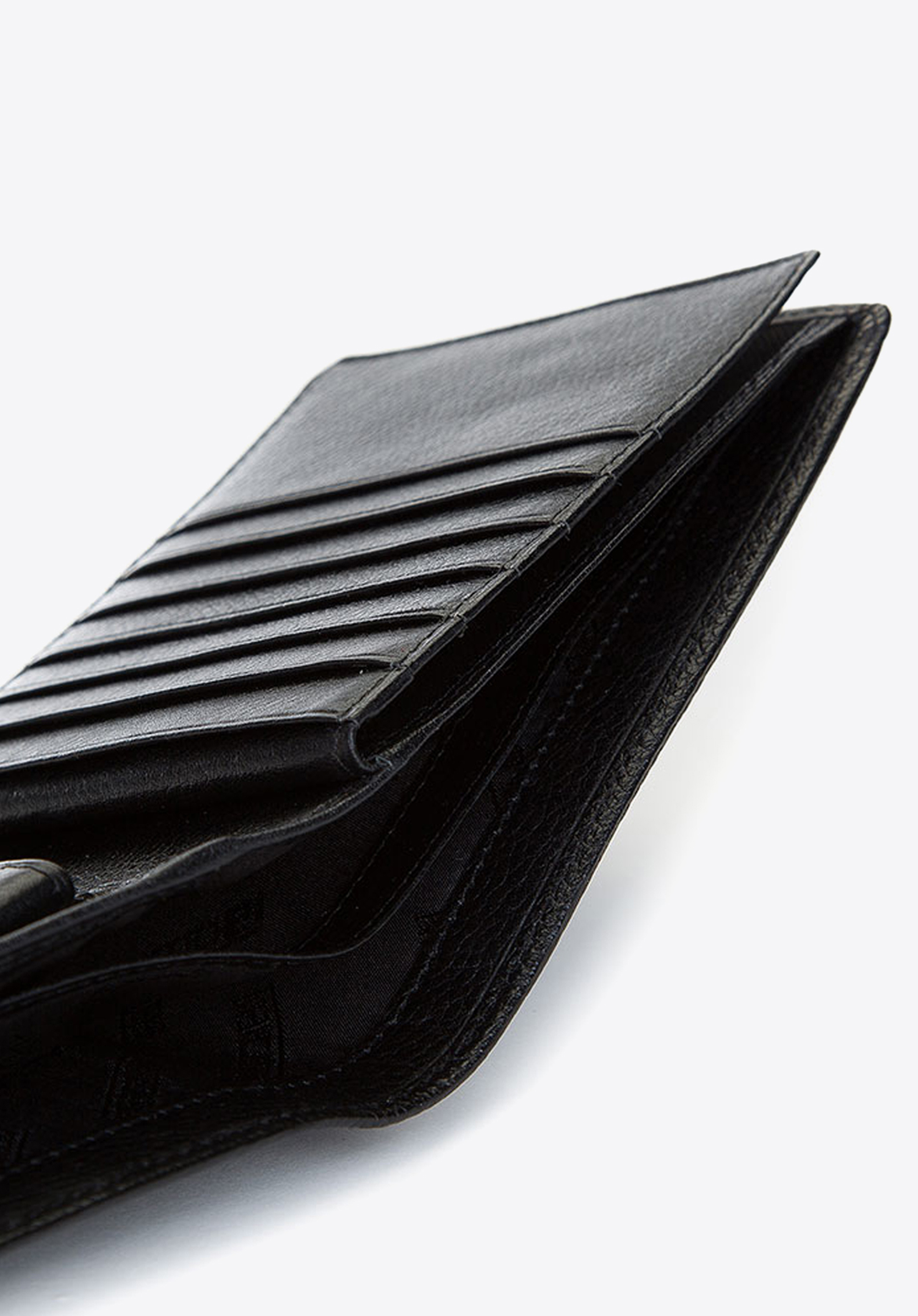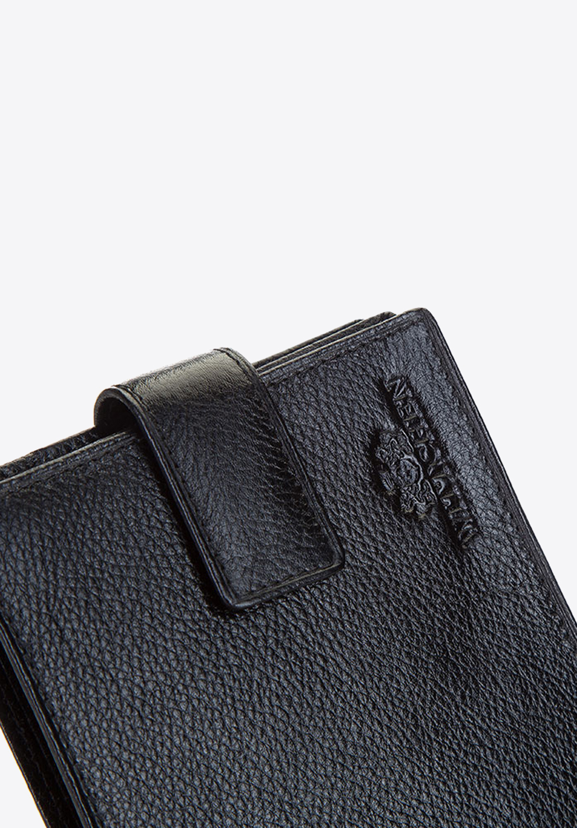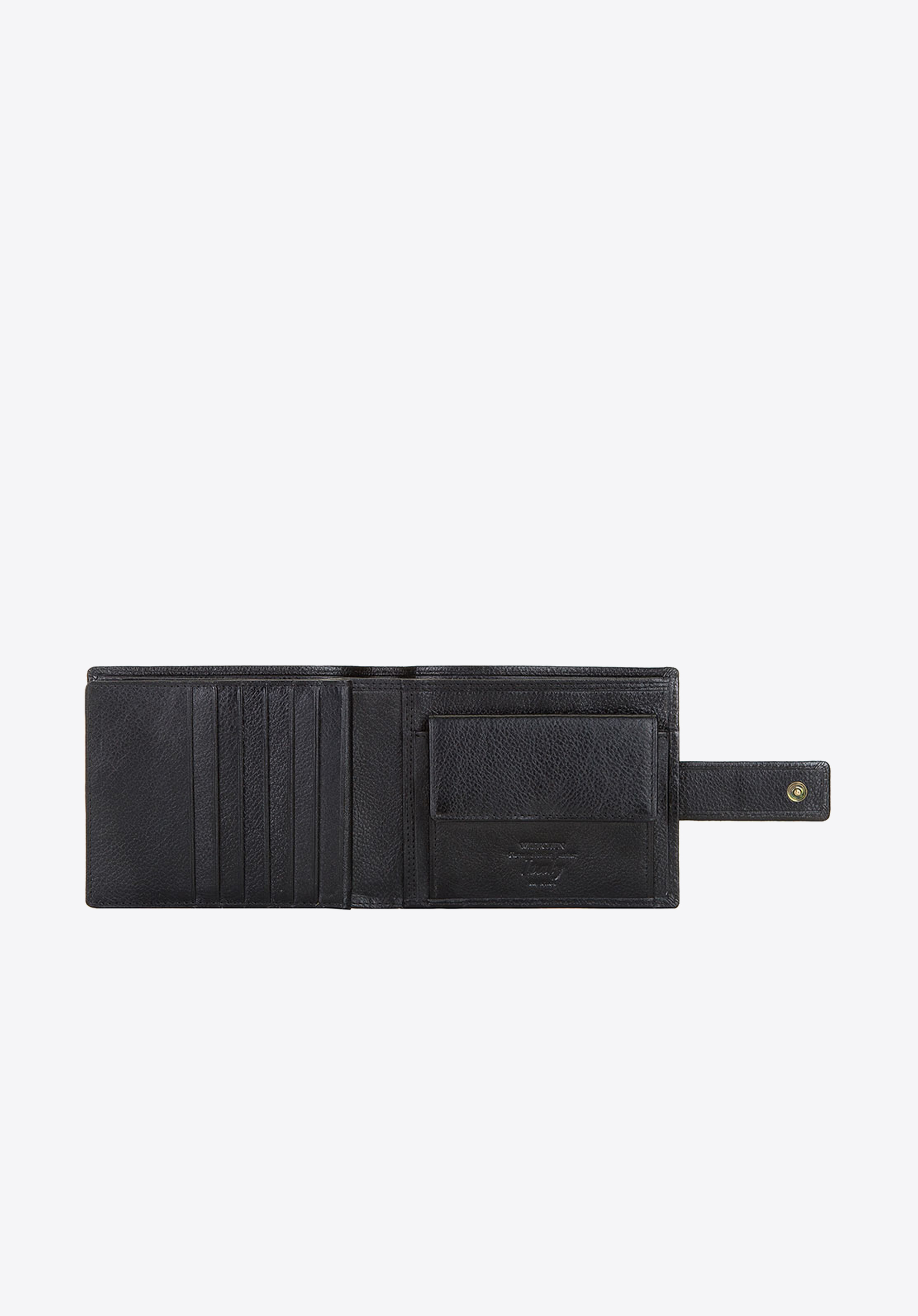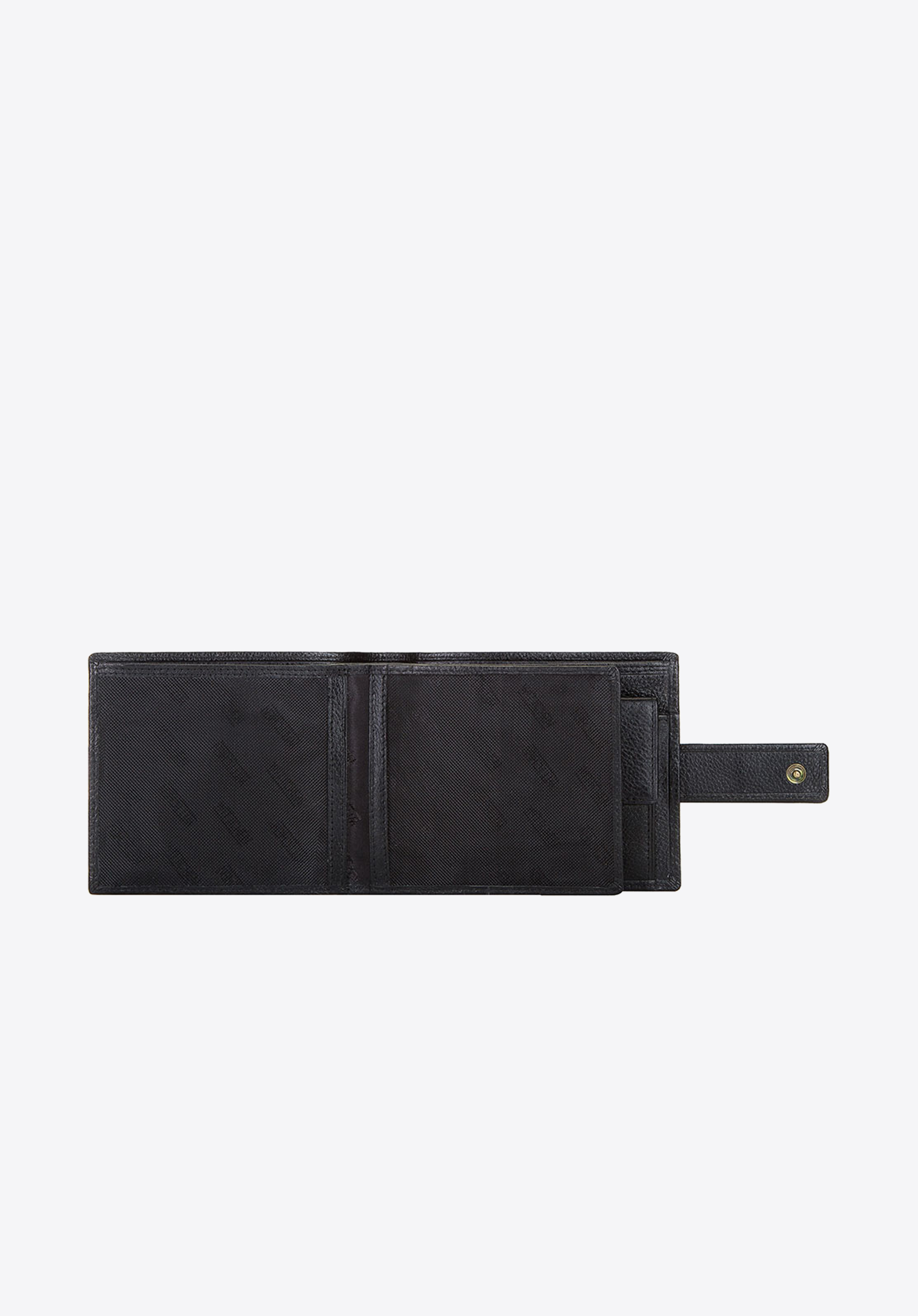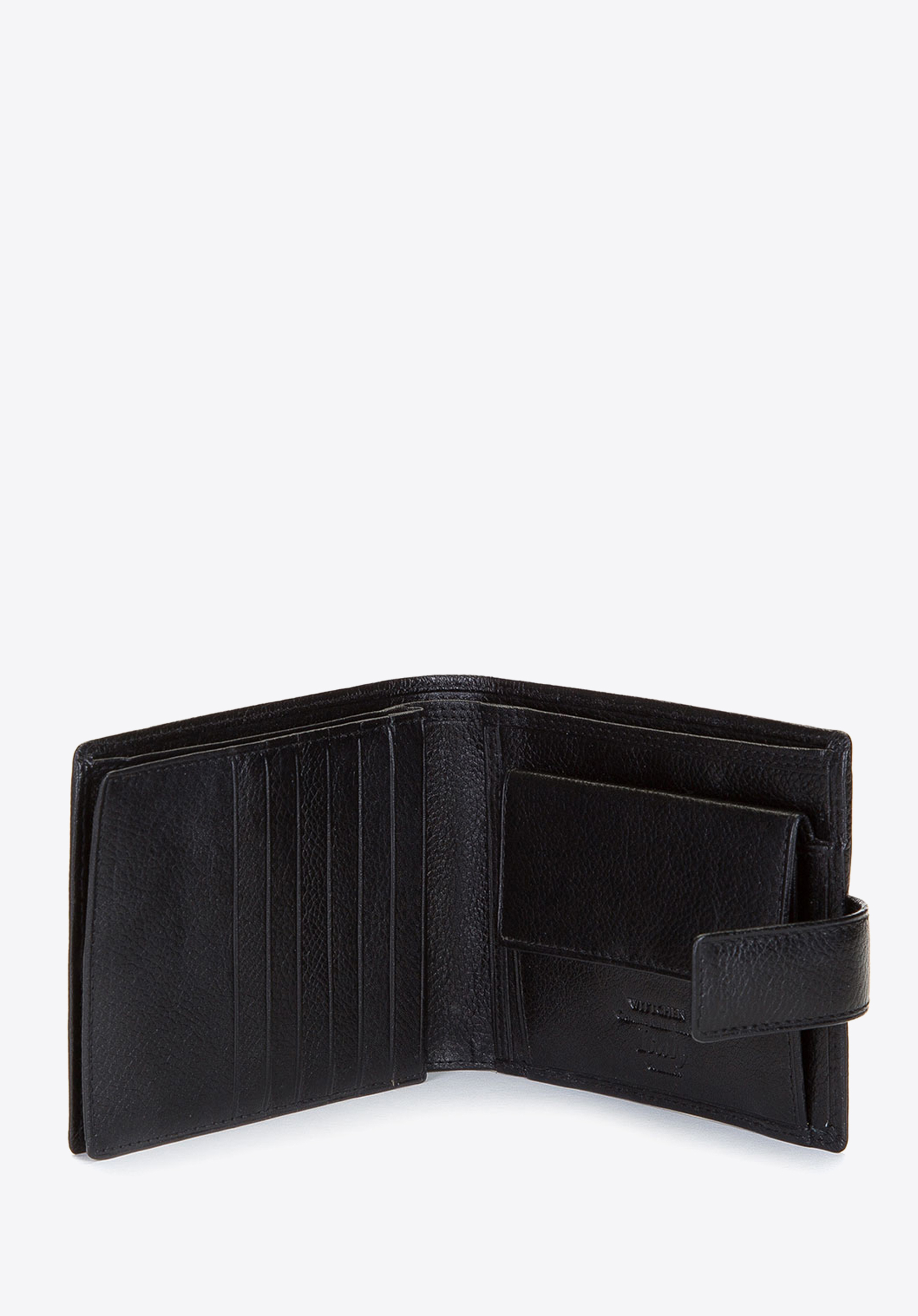 - Praktyczne wnętrze: Portfel posiada 2 kieszenie na banknoty, kieszeń na bilon zapinaną na napę oraz 6 miejsc na karty.