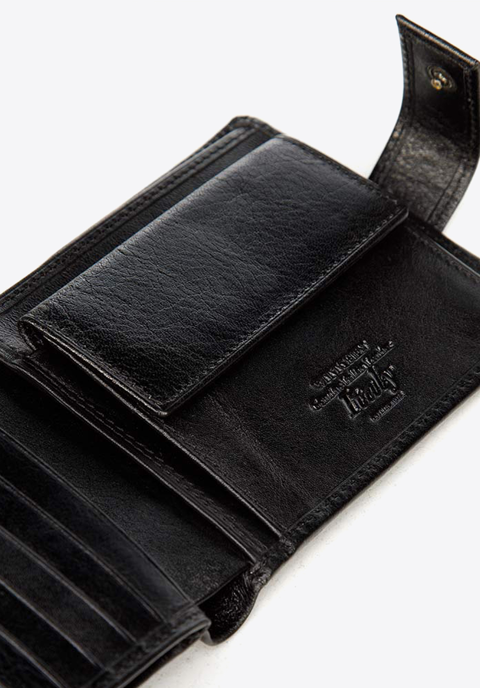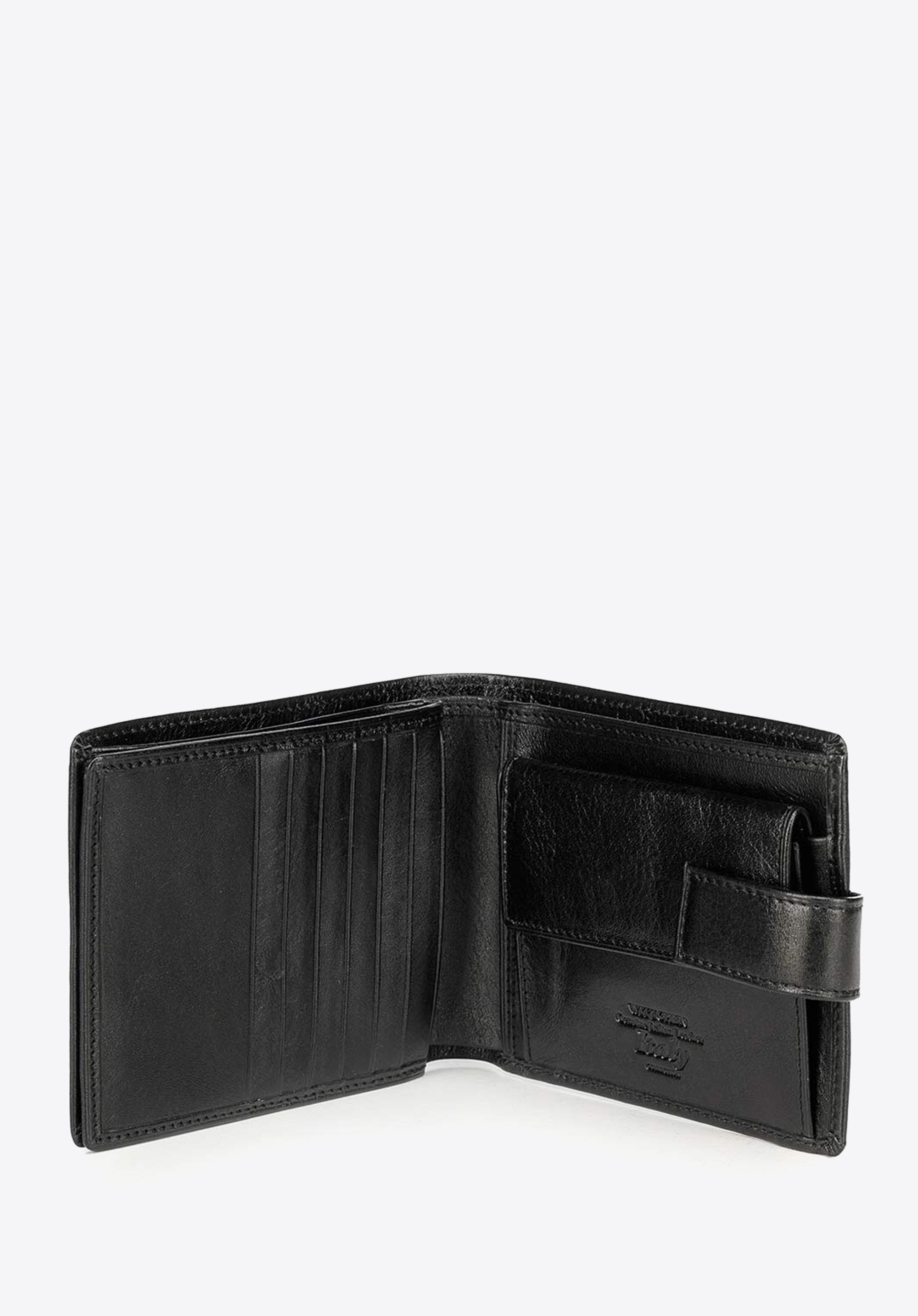 - Praktyczne wnętrze: Portfel posiada 2 kieszenie na banknoty, kieszeń na bilon zapinaną na napę oraz 6 miejsc na karty.