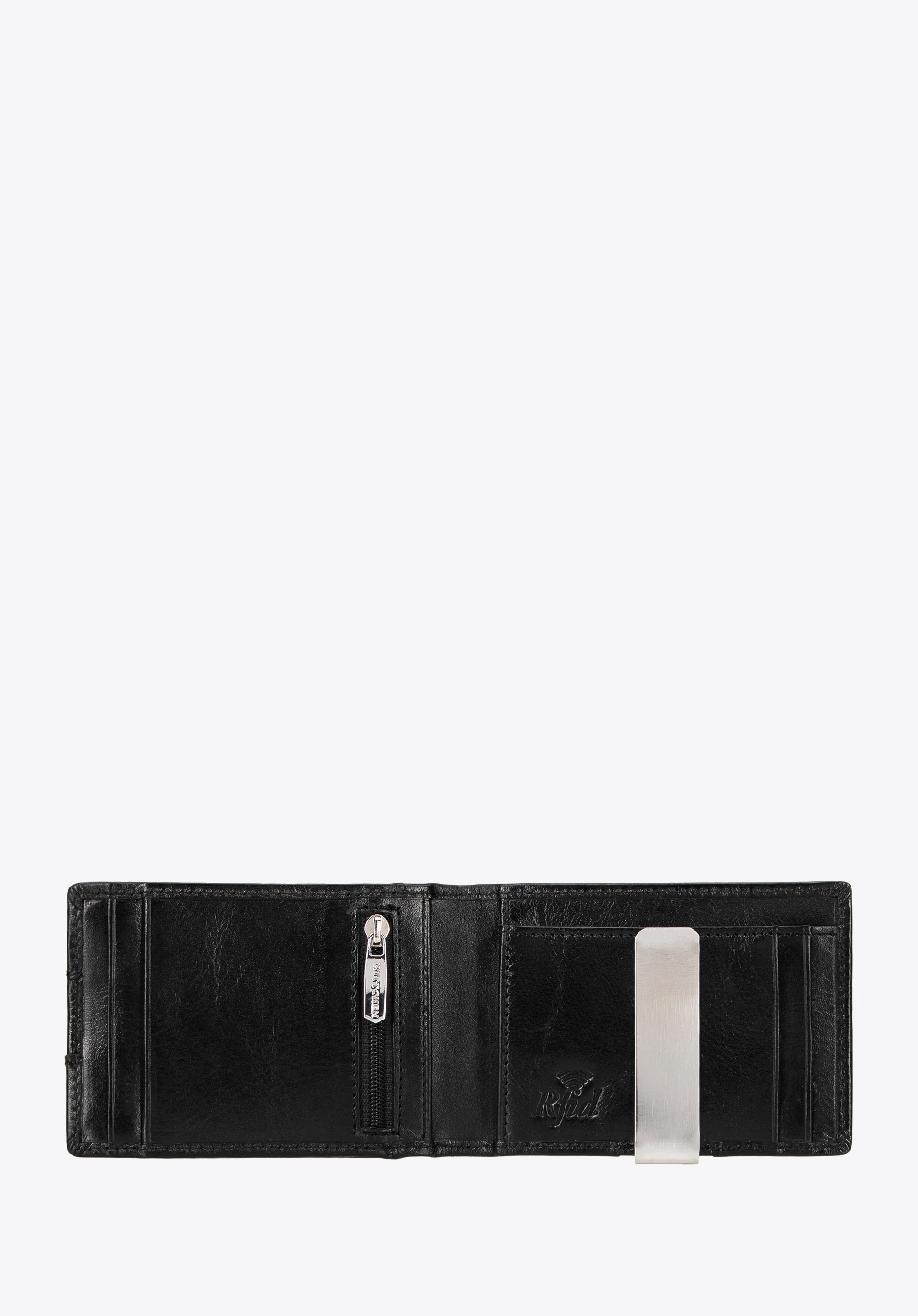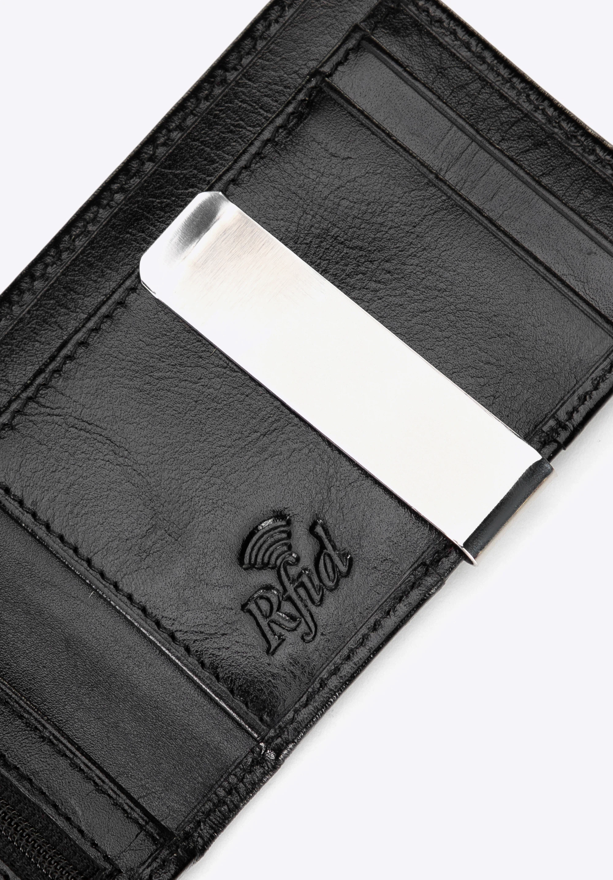 - Metalowy klips na banknoty: Szybki dostęp do gotówki bez konieczności składania jej w osobnej przegrodzie.