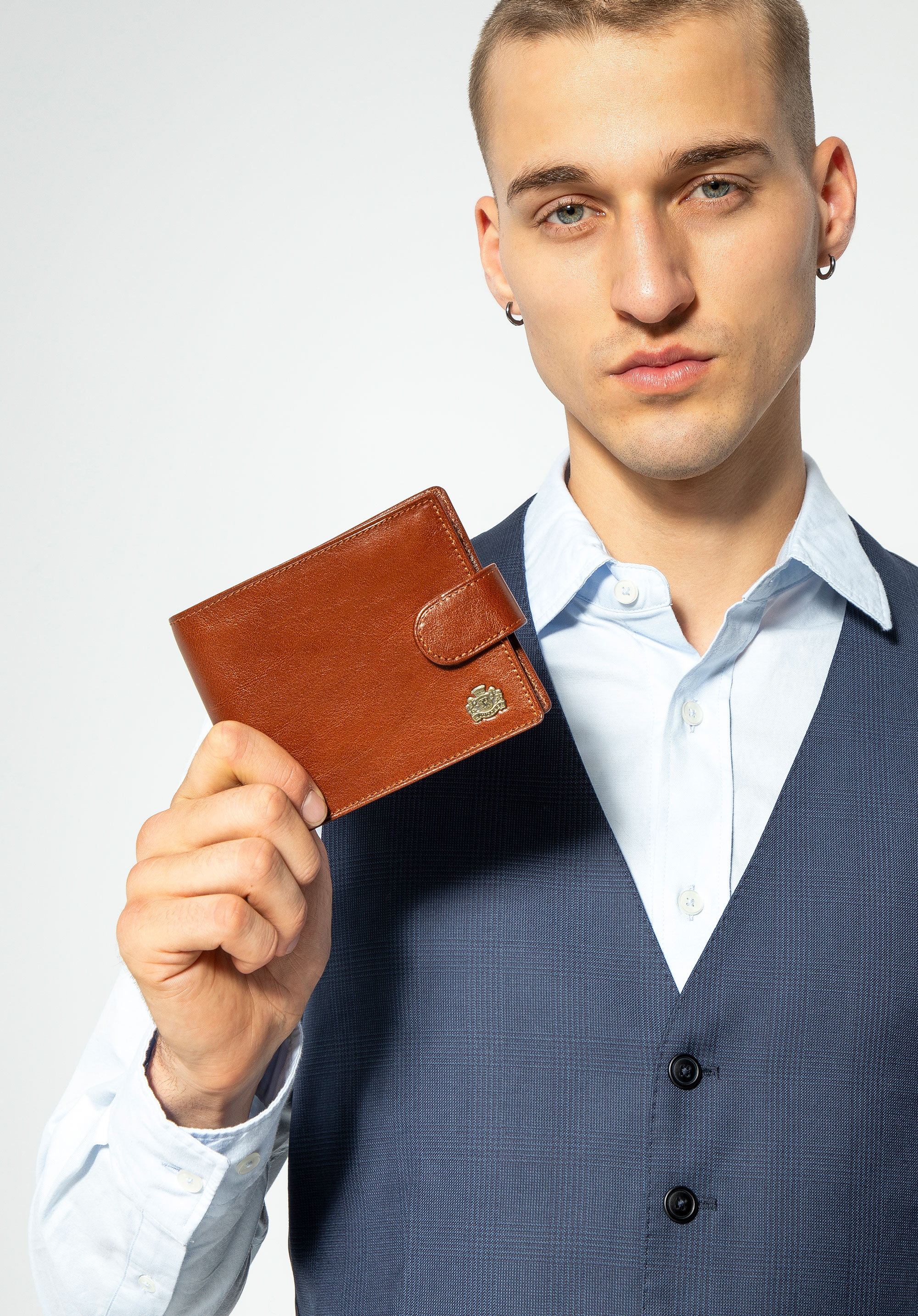 - Materiał: Skóra naturalna gwarantuje trwałość i elegancki wygląd, a z każdym użyciem portfel zyskuje na charakterze.