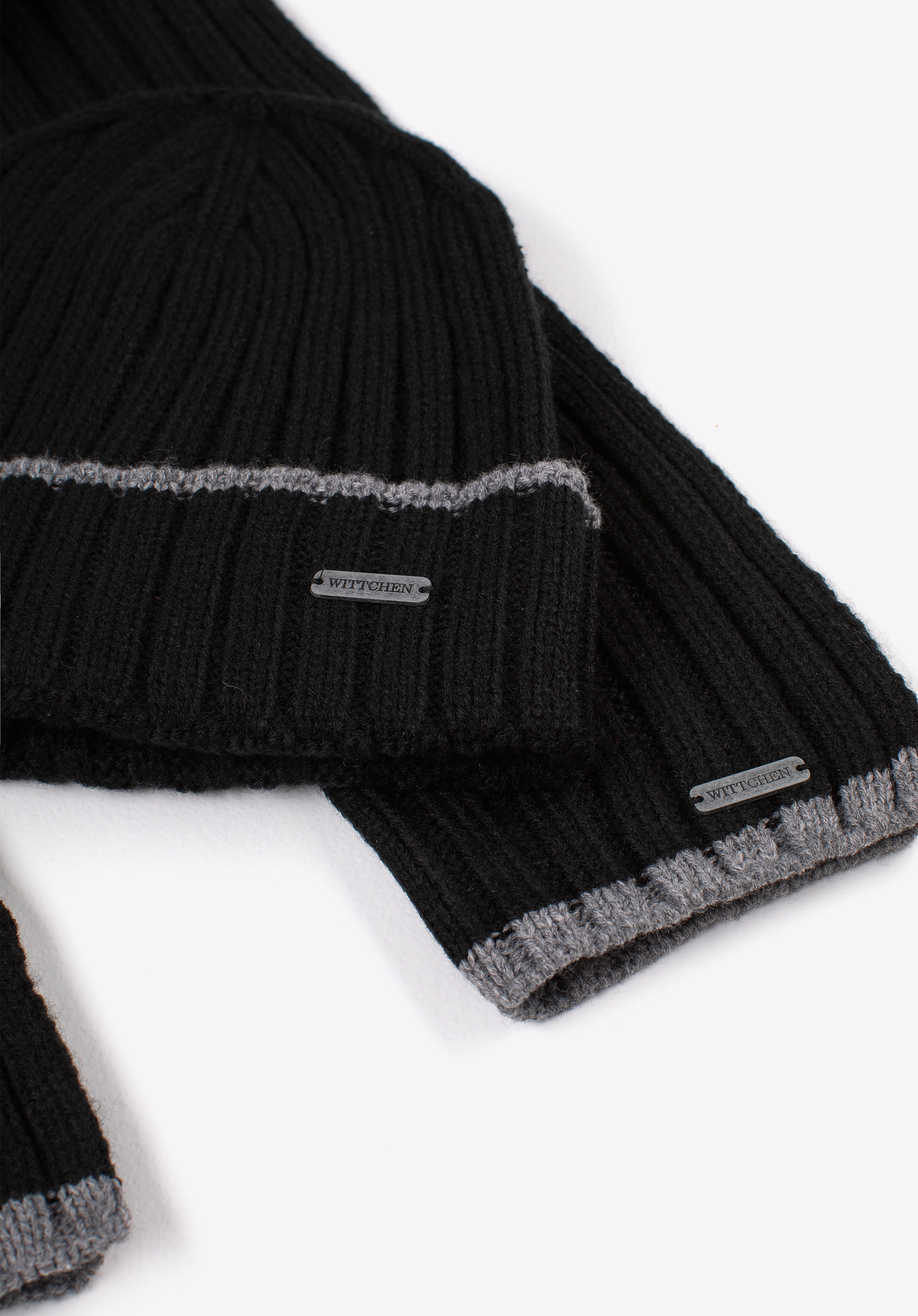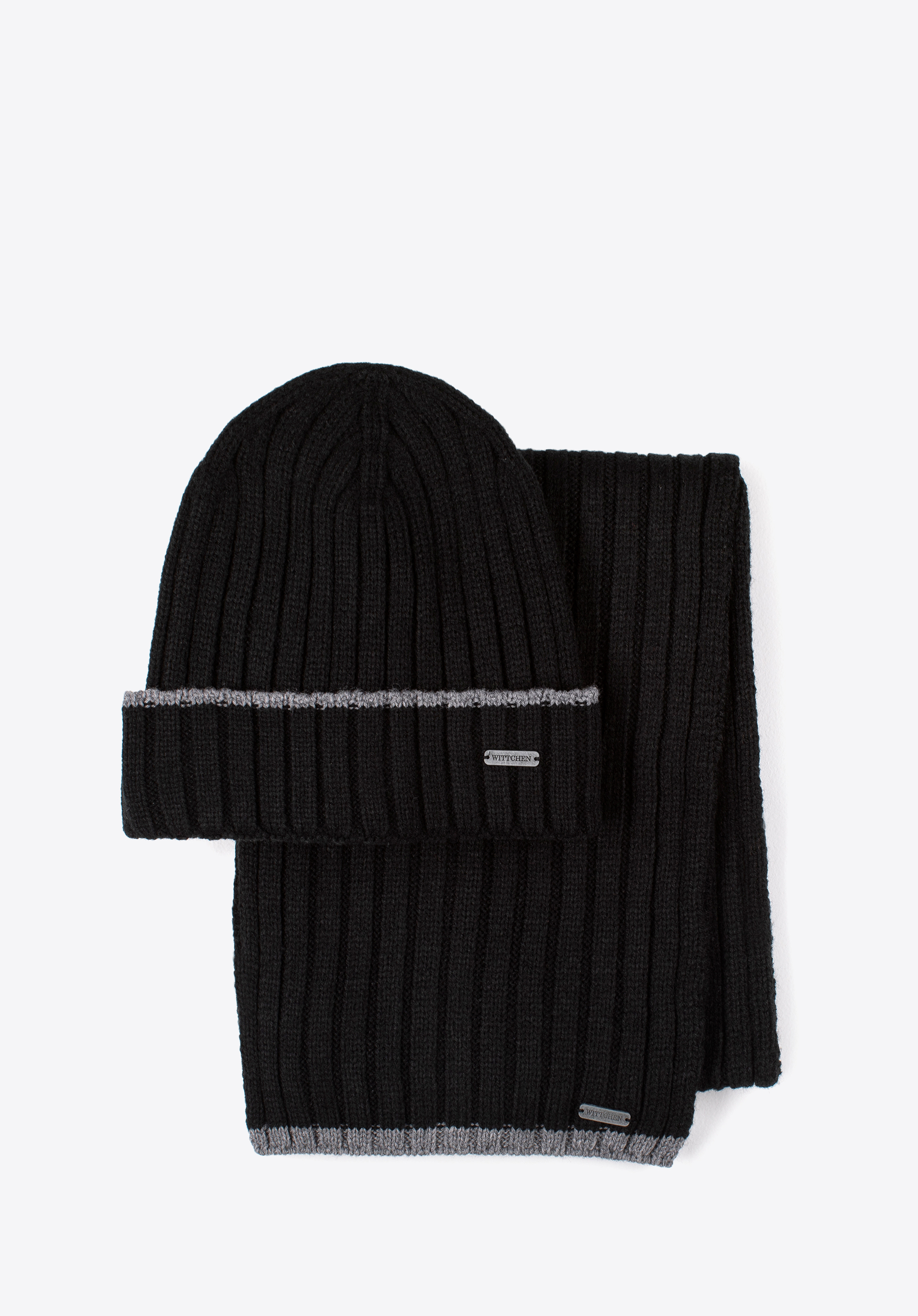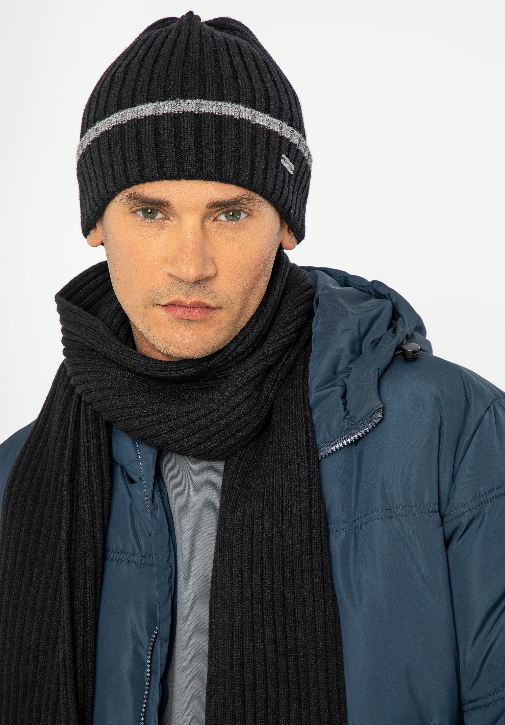 Zimowy komplet dla mężczyzn, który łączy styl i funkcjonalność – elegancka czapka i szalik wykonane z wysokiej jakości mieszanki wiskozy, poliestru i nylonu. Zestaw wyróżnia się kontrastowym wykończeniem na brzegach, co nadaje mu nowoczesny i dynamiczny wygląd, idealny dla mężczyzn ceniących modny design.