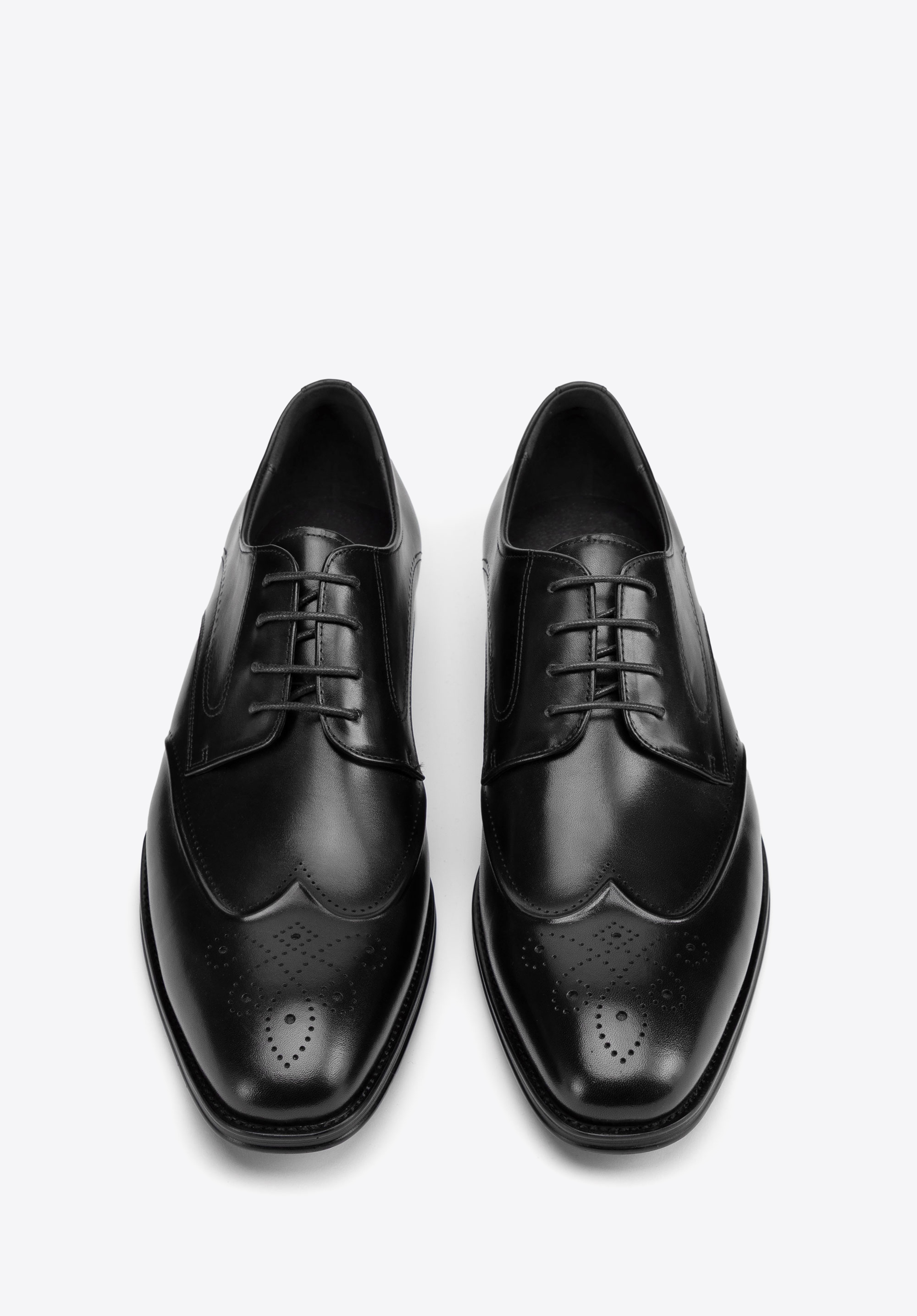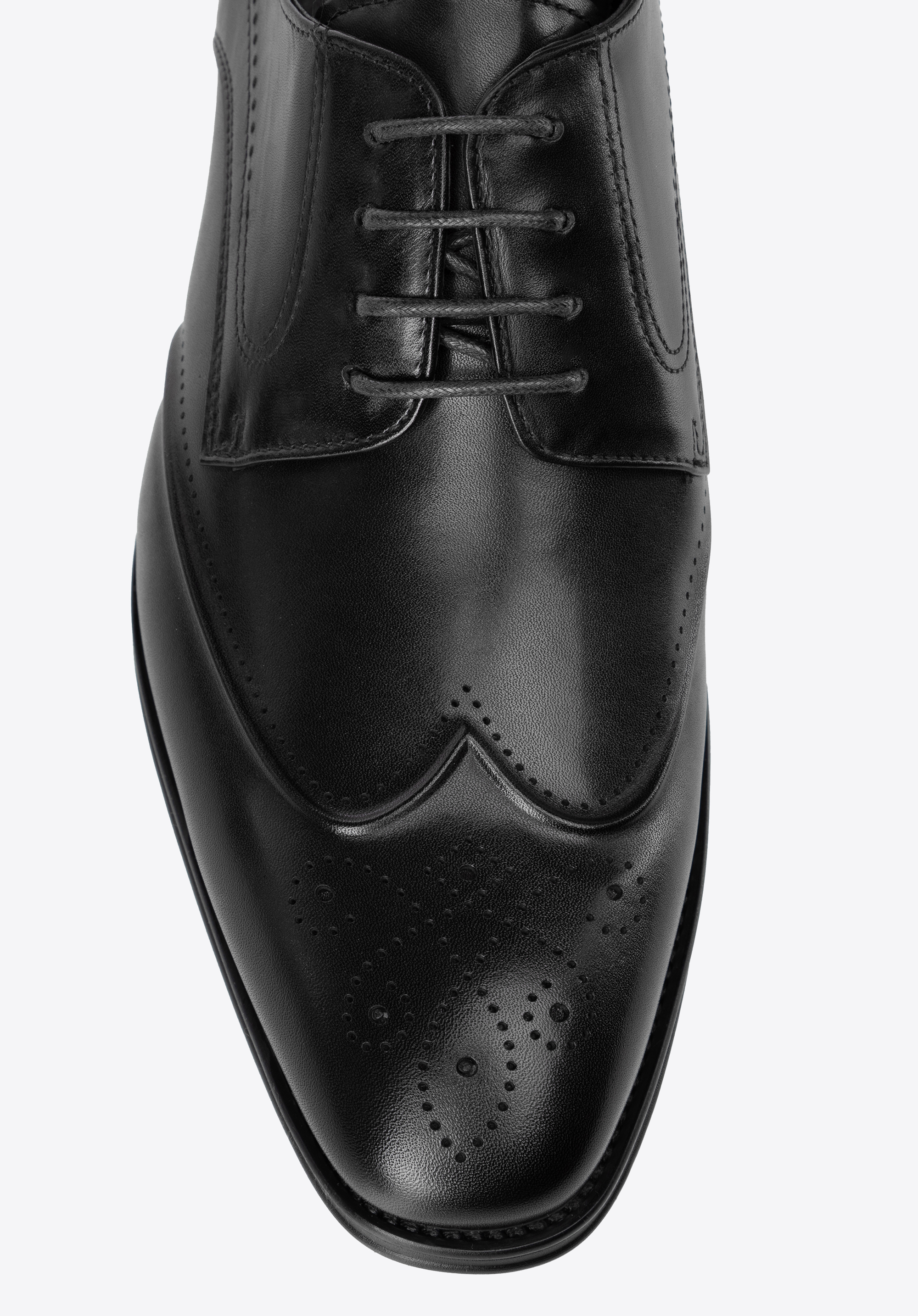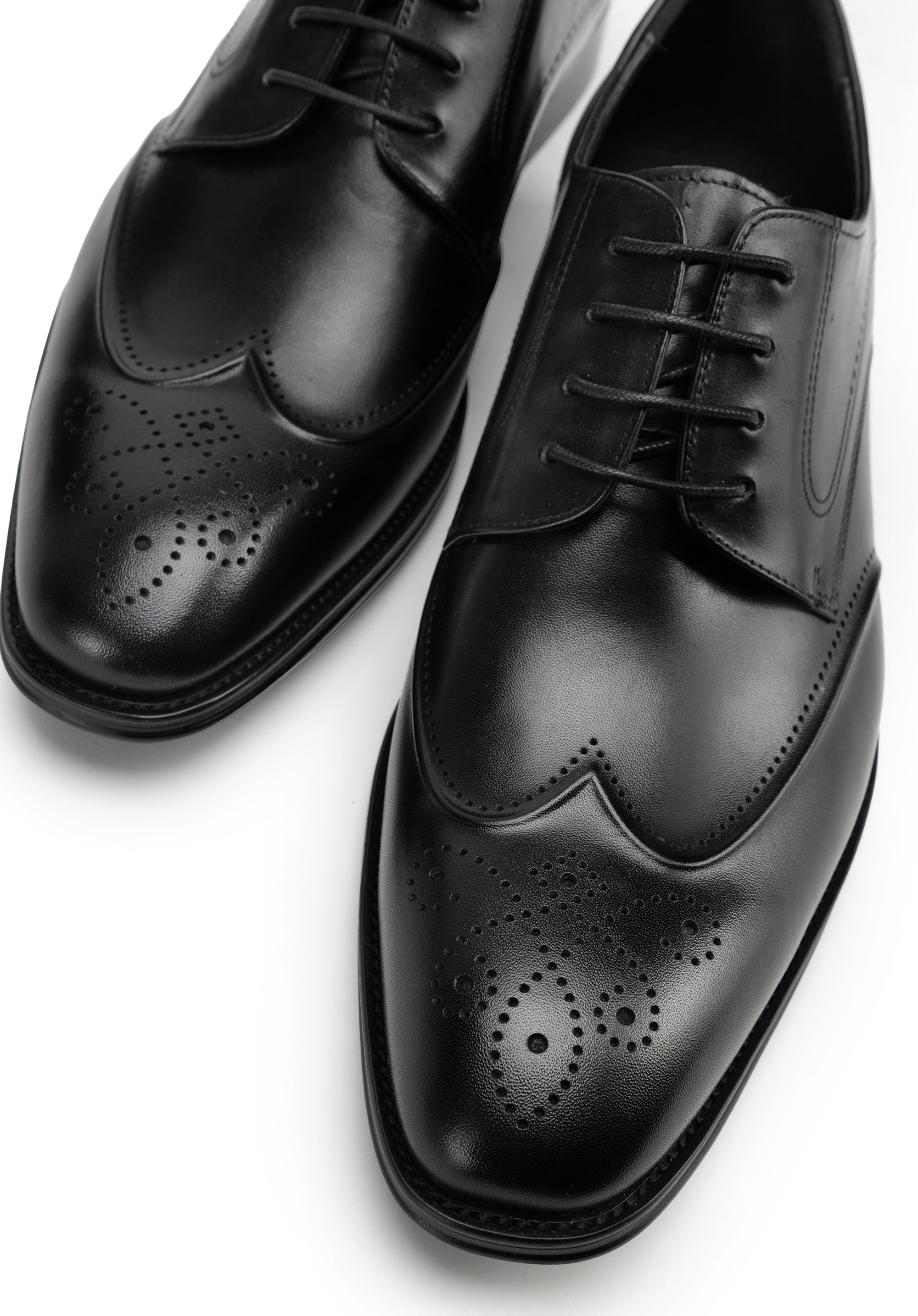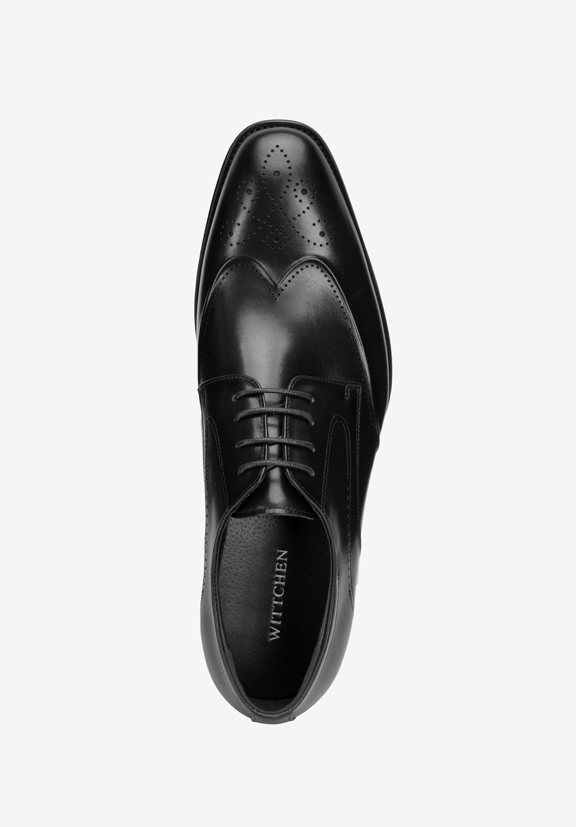 Męskie brogsy ze skóry bydlęcej to połączenie klasyki z nowoczesnym stylem, które nigdy nie wychodzi z mody. Nosek skrzydłowy w kształcie migdała oraz subtelne perforacje sprawiają, że te buty wyróżniają się na tle innych. Skórzana wkładka zapewnia wygodę i komfort przez cały dzień, a gumowa podeszwa z płaskim obcasem gwarantuje stabilność i pewność kroku. Idealne zarówno do eleganckich, jak i codziennych stylizacji.