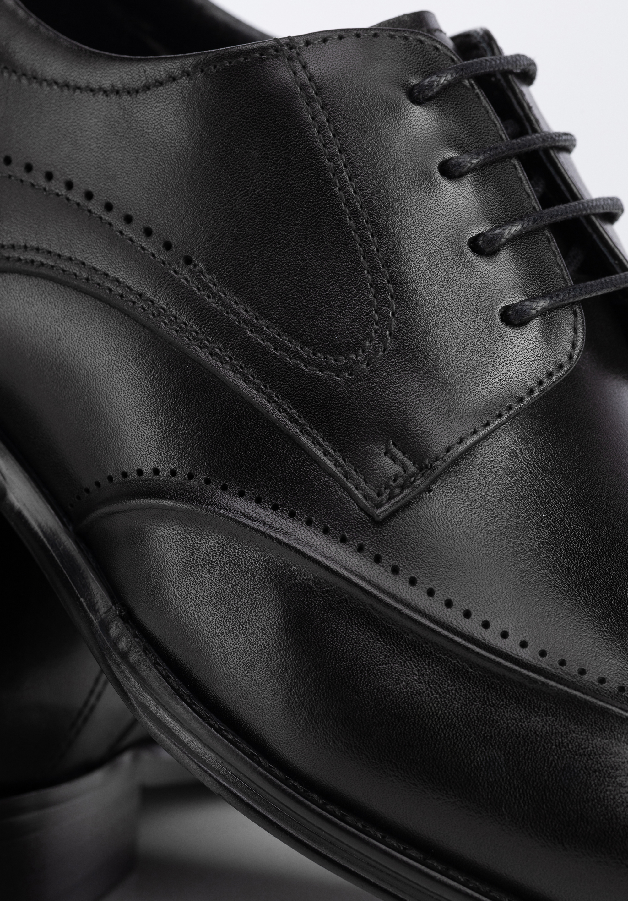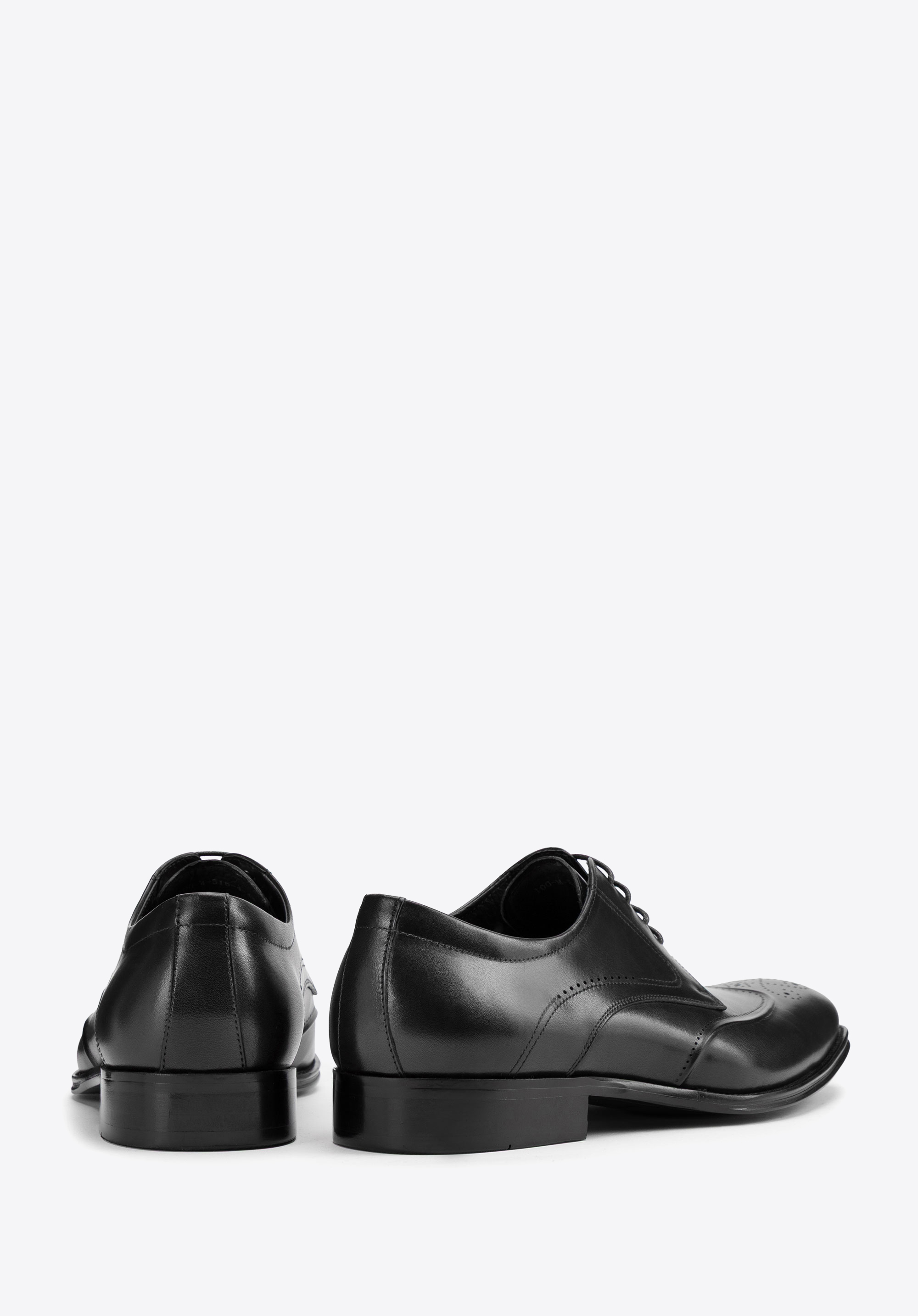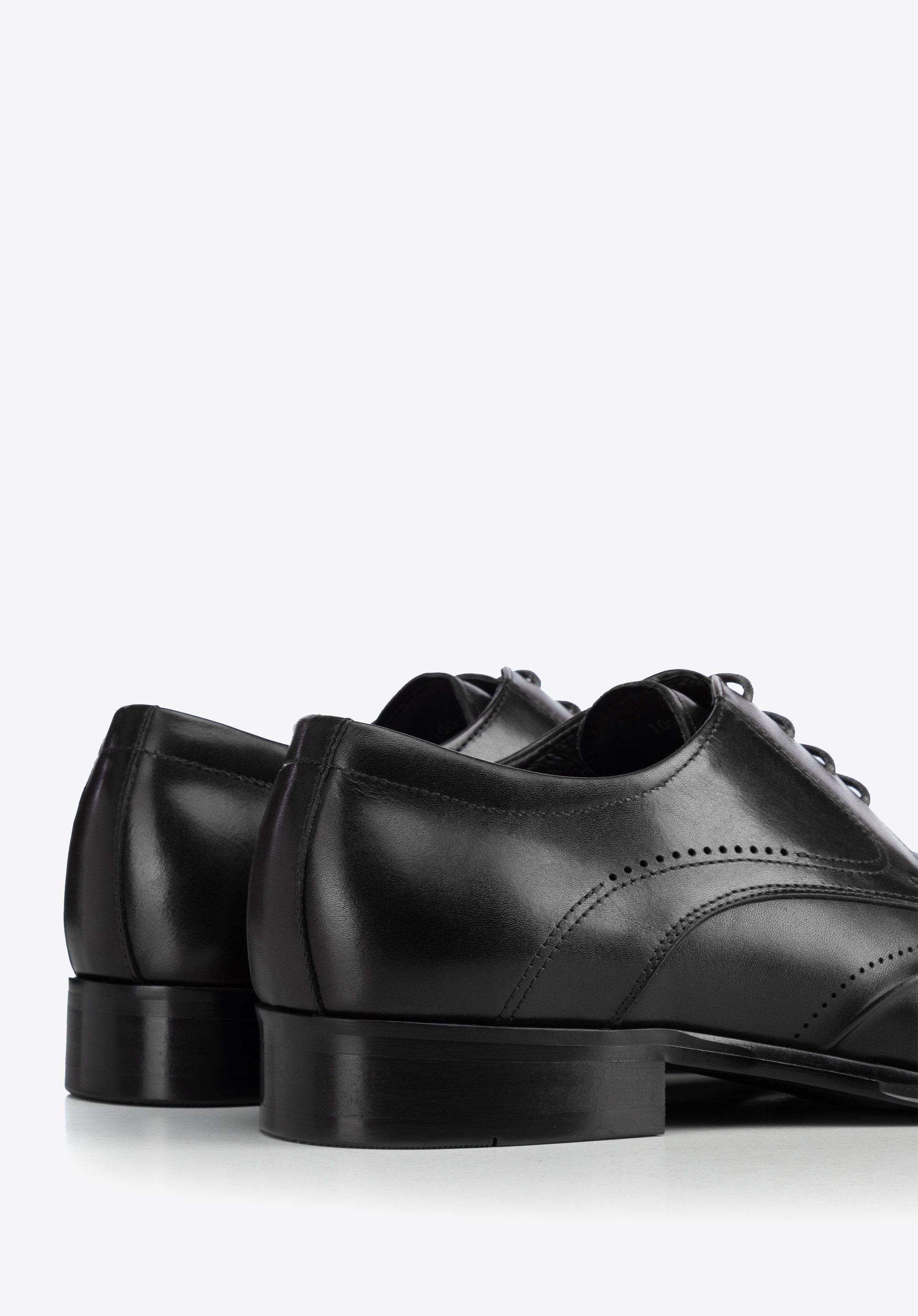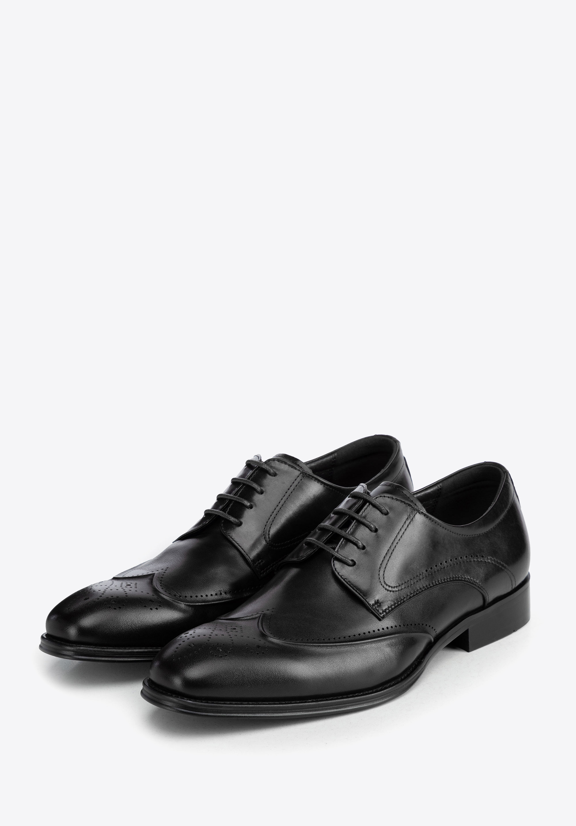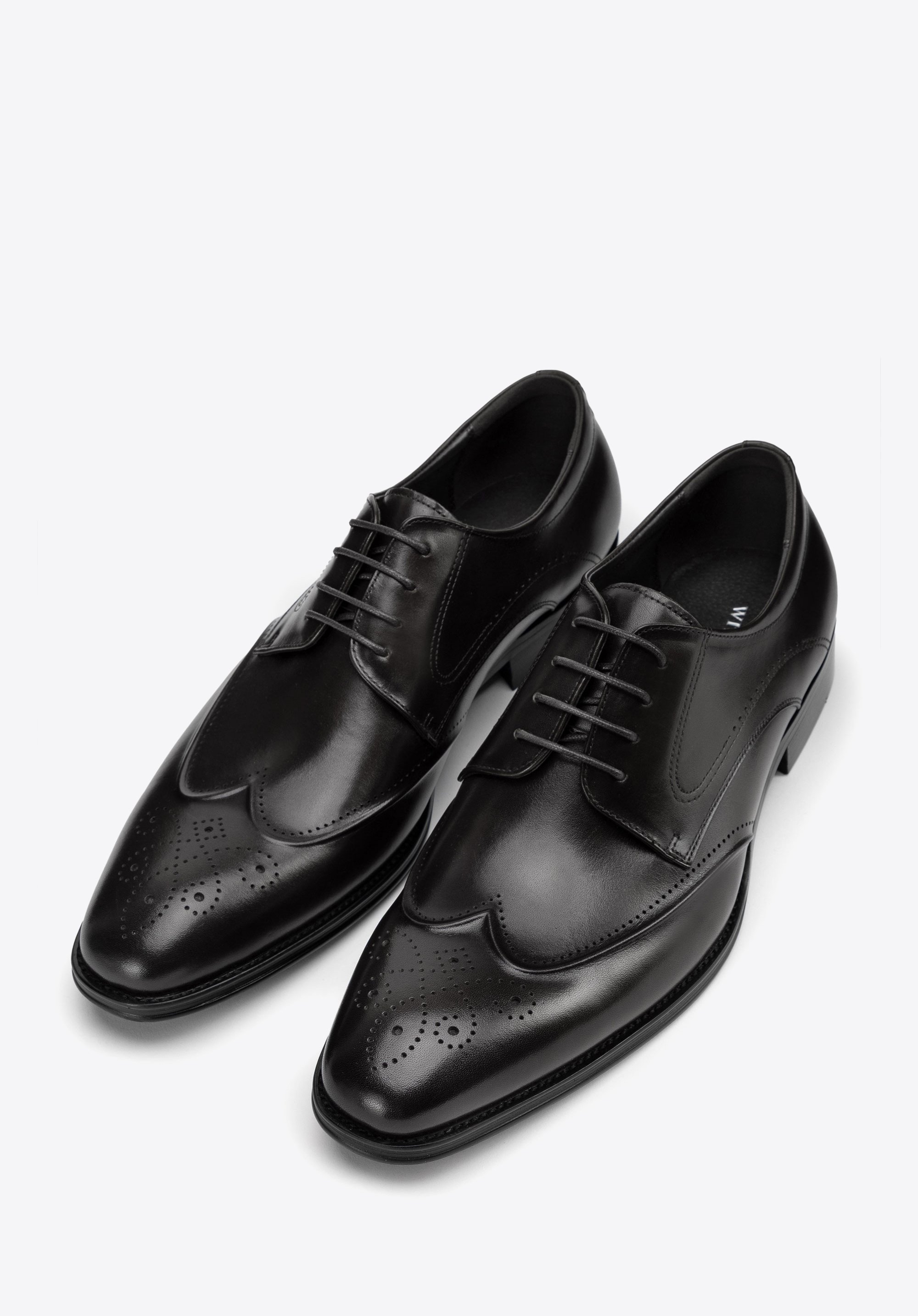 Męskie brogsy ze skóry bydlęcej to połączenie klasyki z nowoczesnym stylem, które nigdy nie wychodzi z mody. Nosek skrzydłowy w kształcie migdała oraz subtelne perforacje sprawiają, że te buty wyróżniają się na tle innych. Skórzana wkładka zapewnia wygodę i komfort przez cały dzień, a gumowa podeszwa z płaskim obcasem gwarantuje stabilność i pewność kroku. Idealne zarówno do eleganckich, jak i codziennych stylizacji.