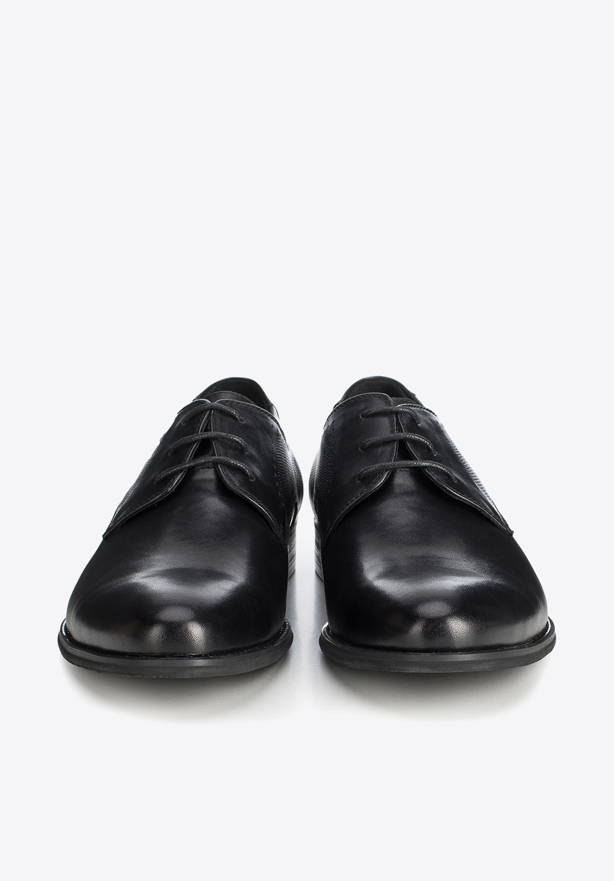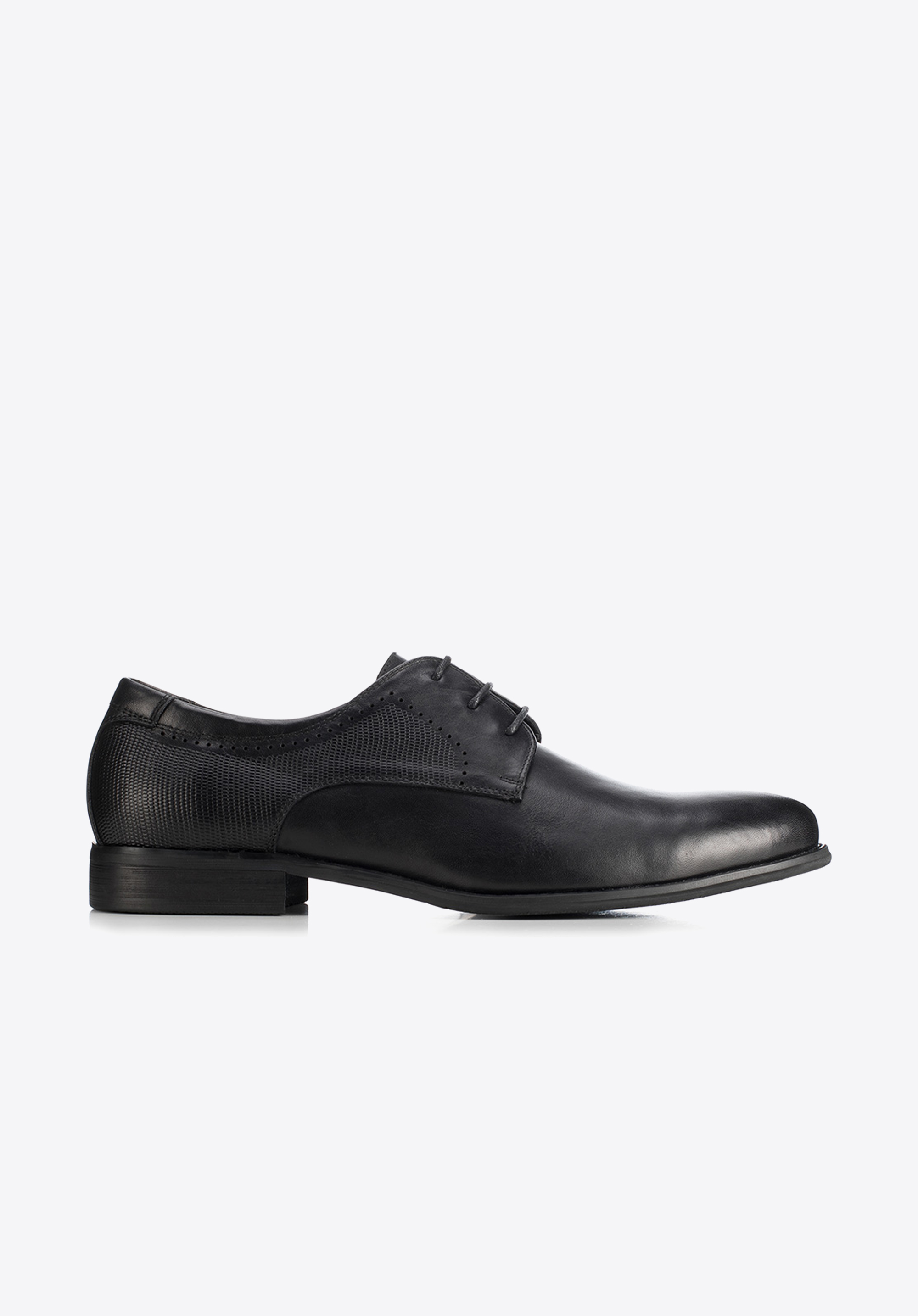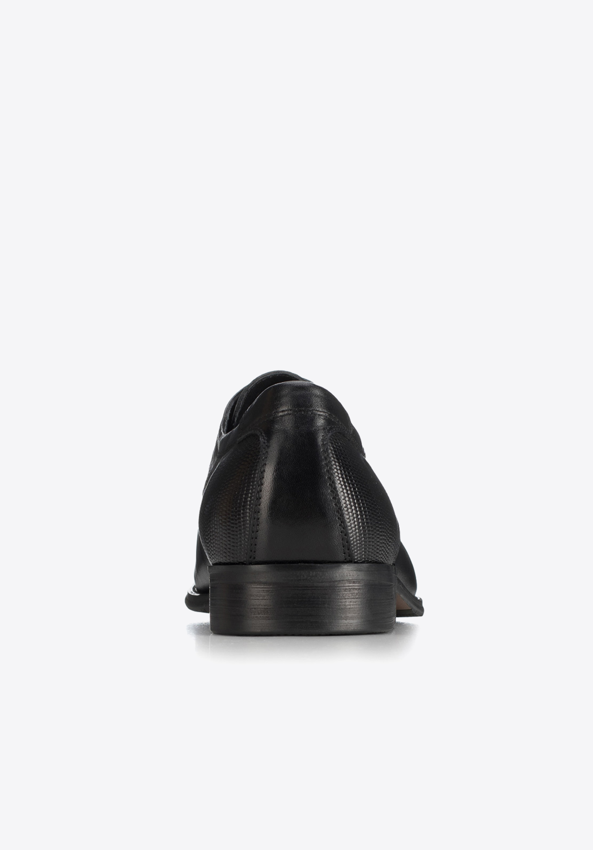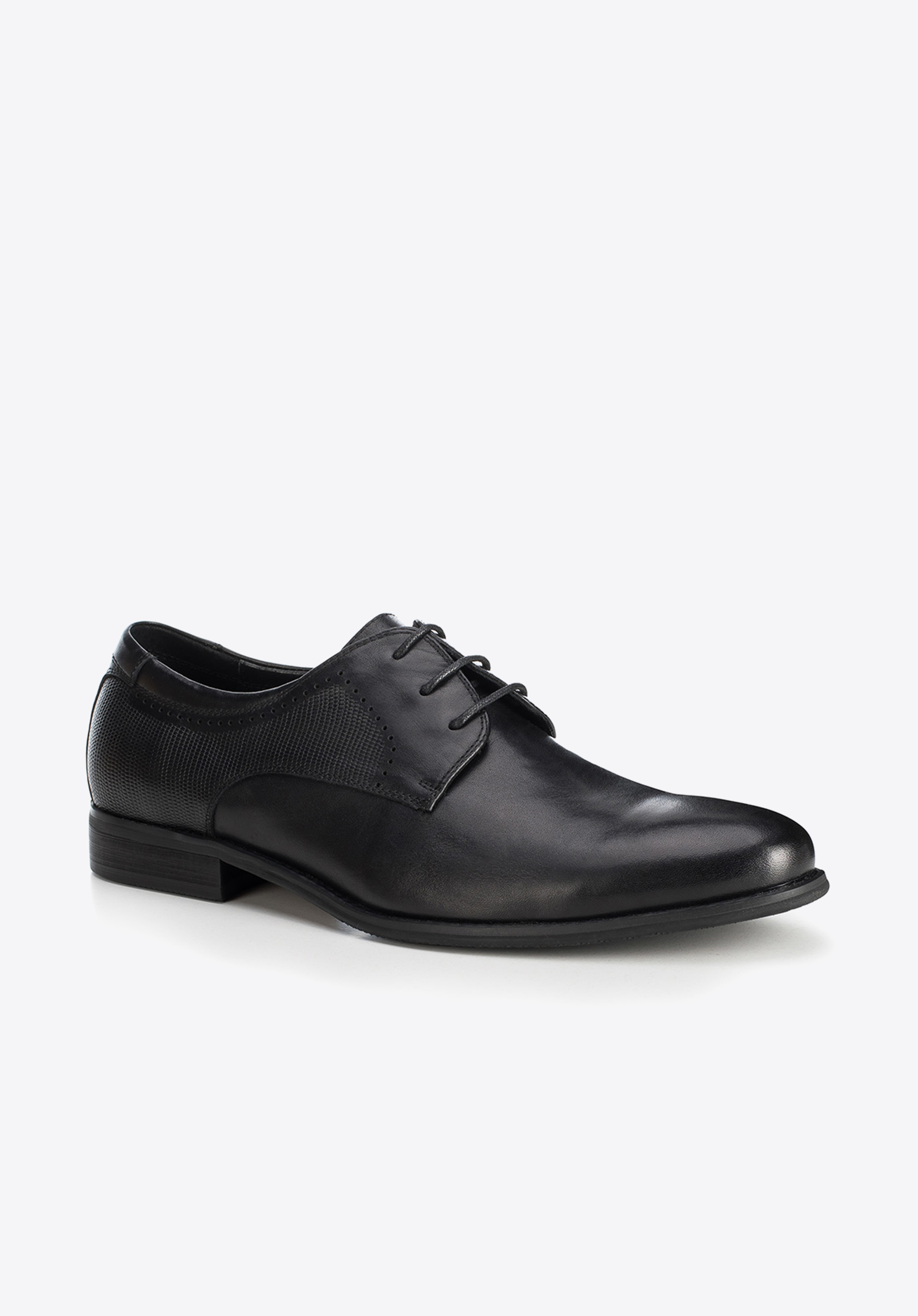 Klasa i elegancja - czy to nie tego wszyscy dzisiaj szukają? Ten model zawiera obie te cechy. Nieprzeciętna para butów męskich, wykonanych zeskóry,zachwyca swoimi zdobieniami w postaci małych dziurek oraz delikatnego wzoru imitującego skórę węża. Buty te nie tylko ładnie prezentują się na nodze, ale również są bardzo wygodne. Co więcej, posiadają niewielki obcas o ciekawym designie przypominającym drewnianą fakturę.