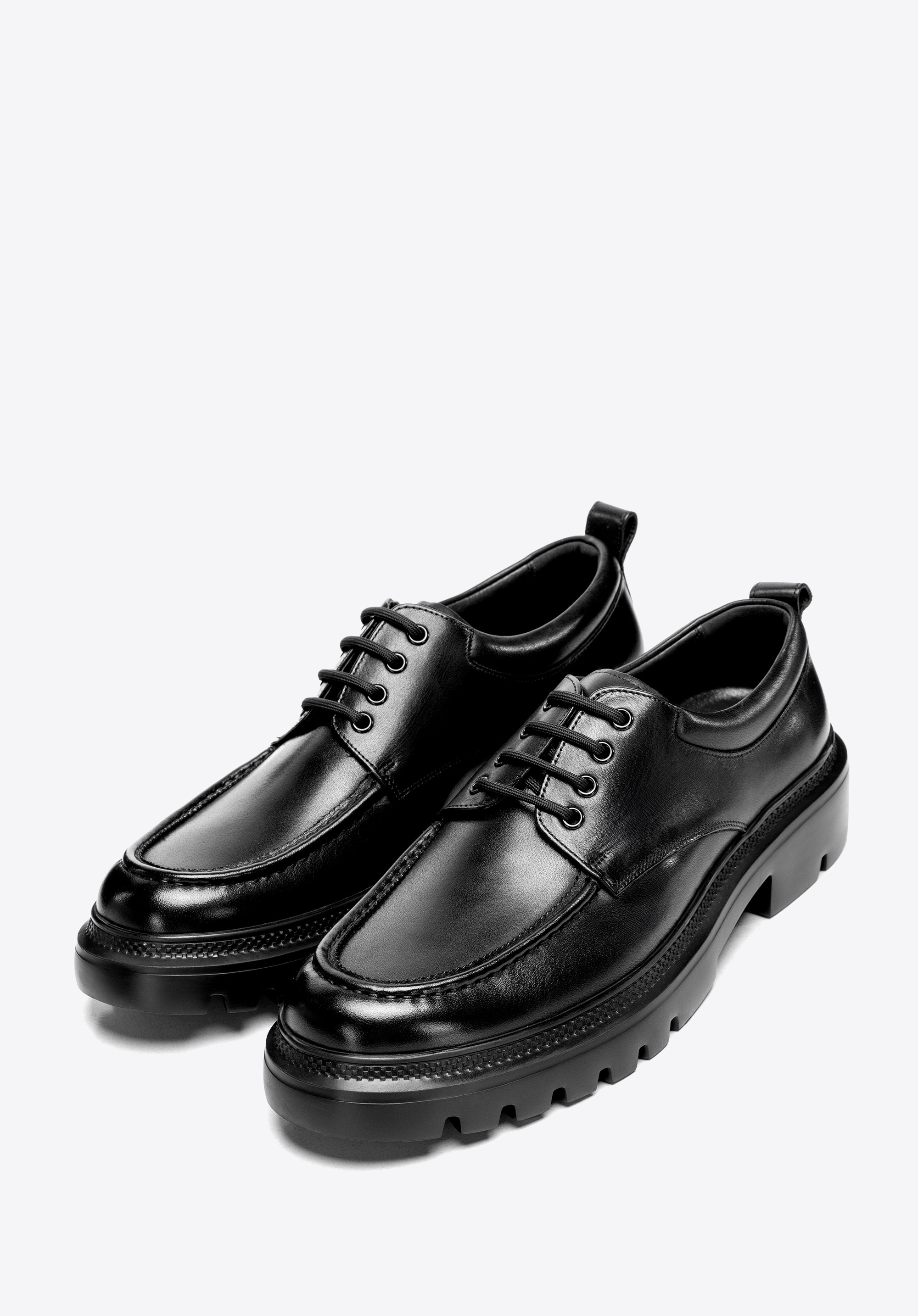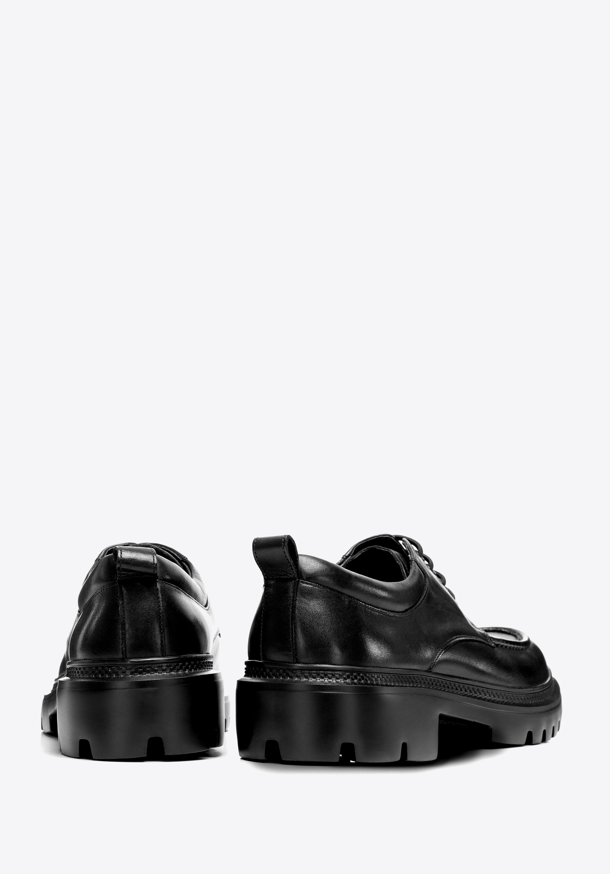 Męskie derby skórzane na podeszwie track sprawdzą się w biurze i w stylizacjach smart casual, kiedy chcesz wyglądać elegancko, ale pewnie stąpać także po mniej przewidywalnym podłożu. Licowa skóra o subtelnym połysku, skórzana wkładka i przyczepna podeszwa typu track dają komfort oraz trwałość w codziennym tempie.