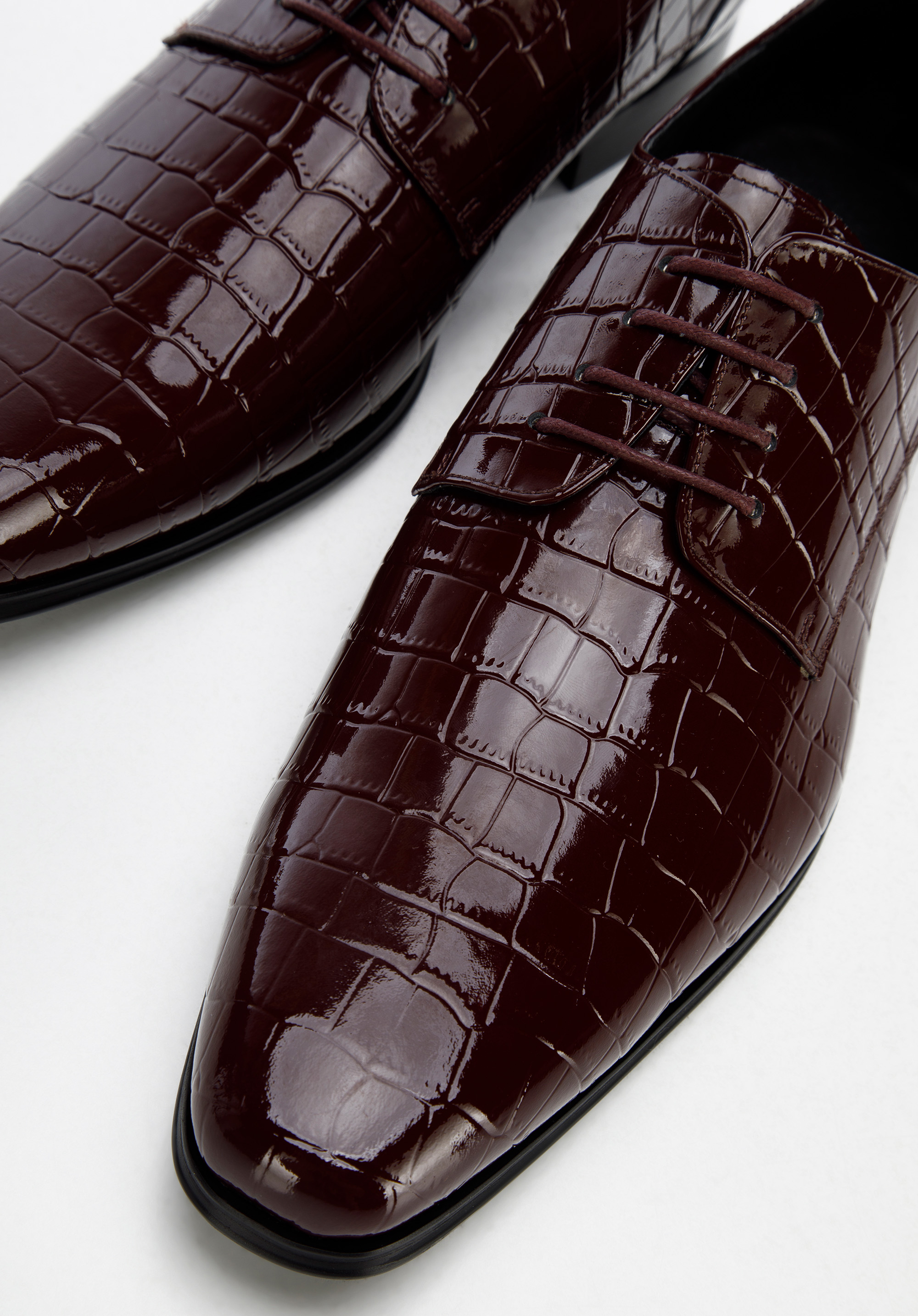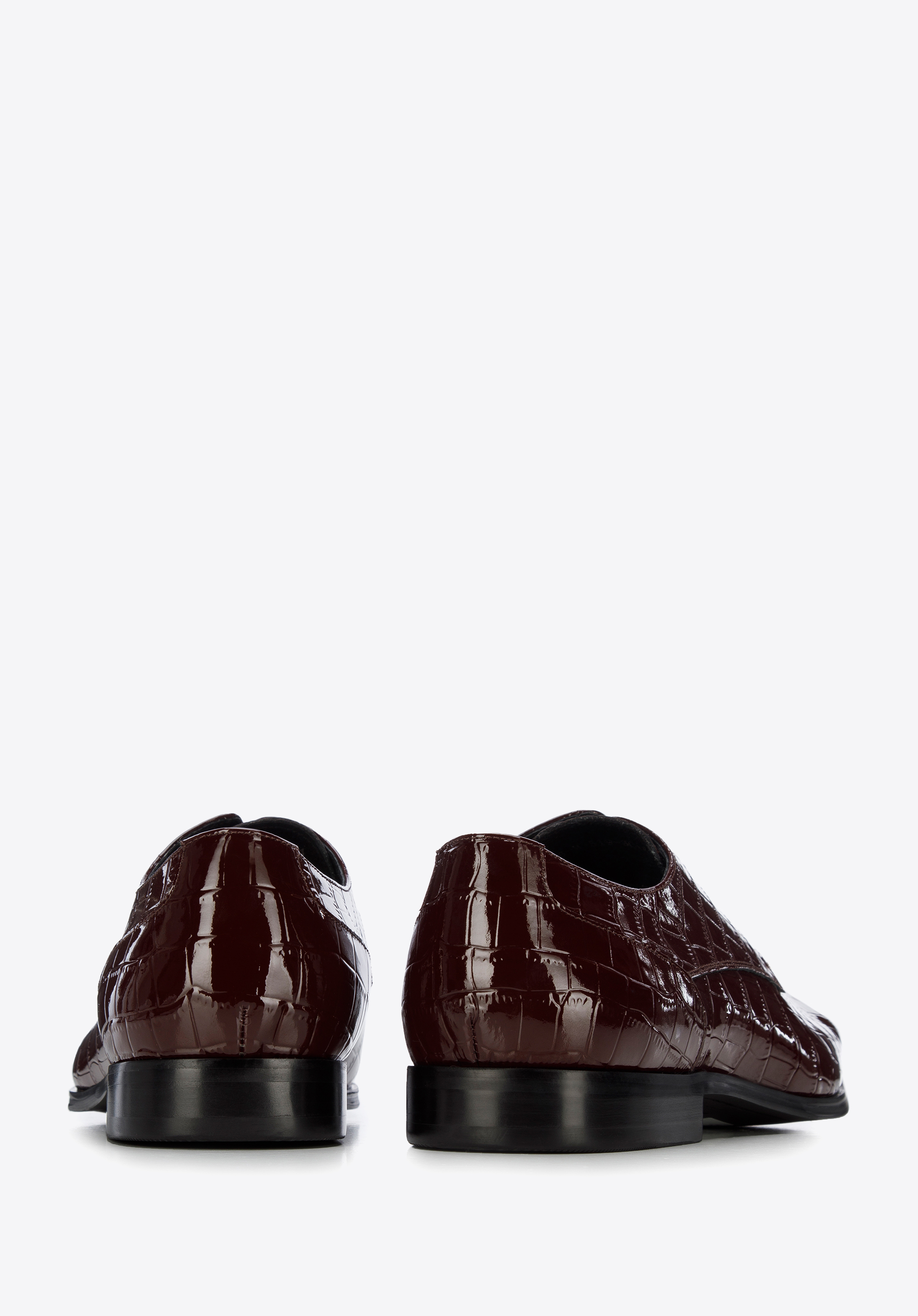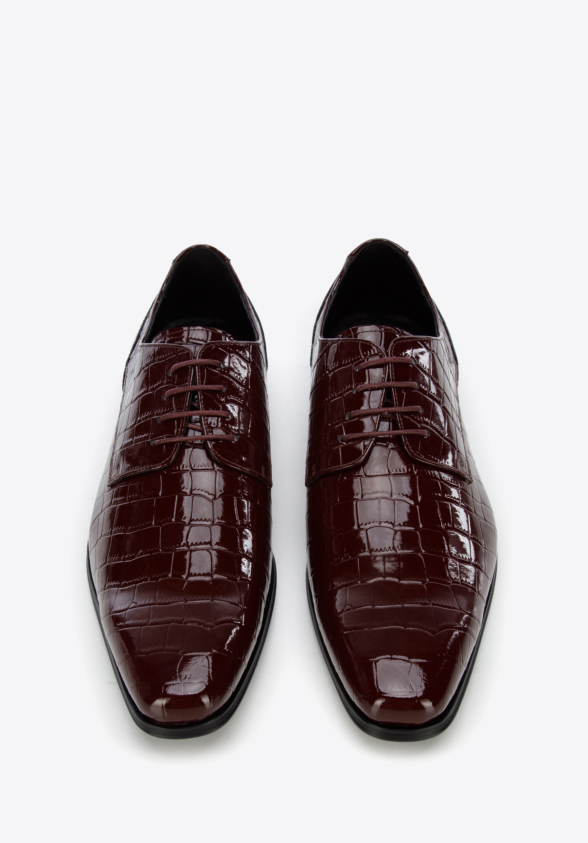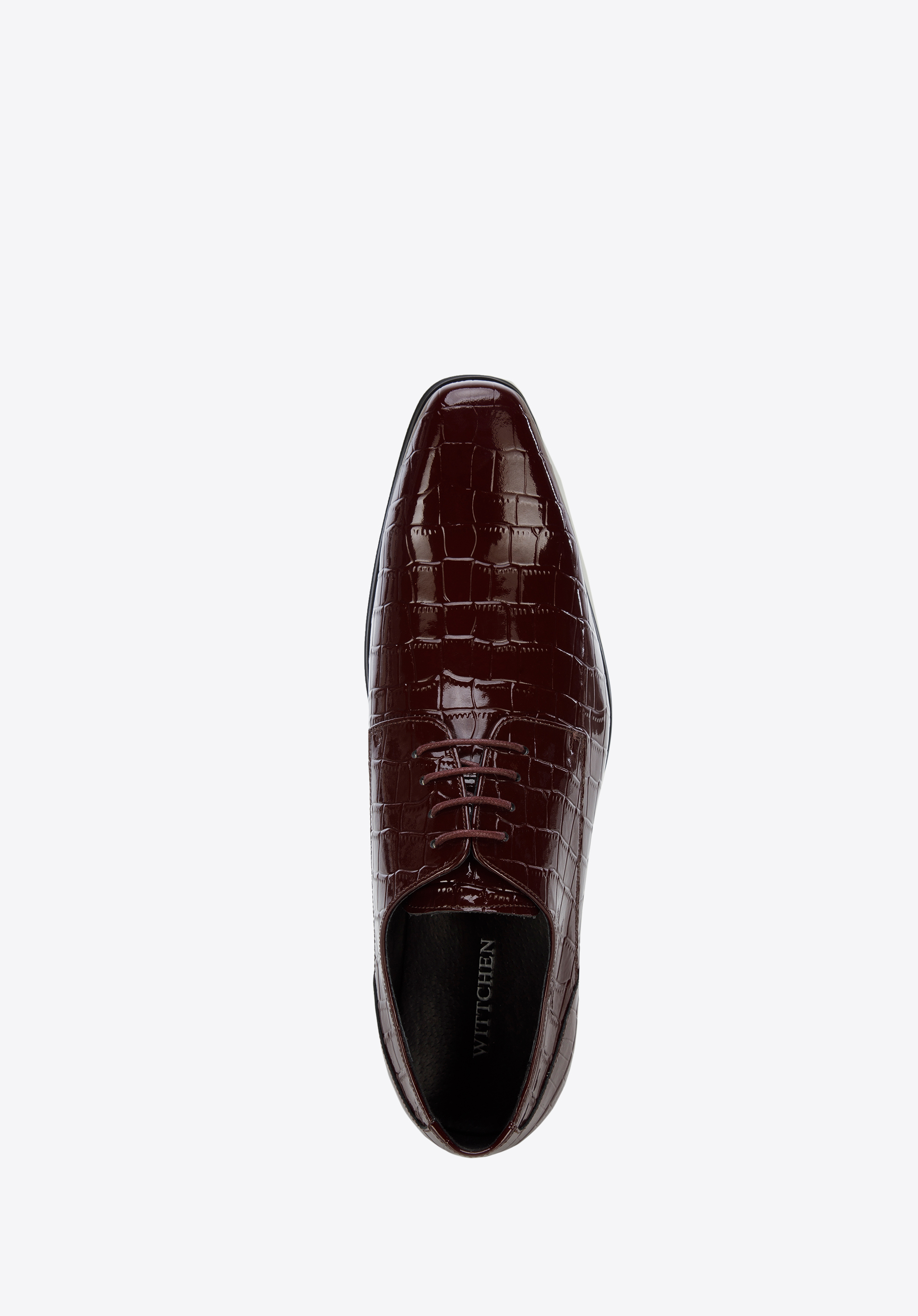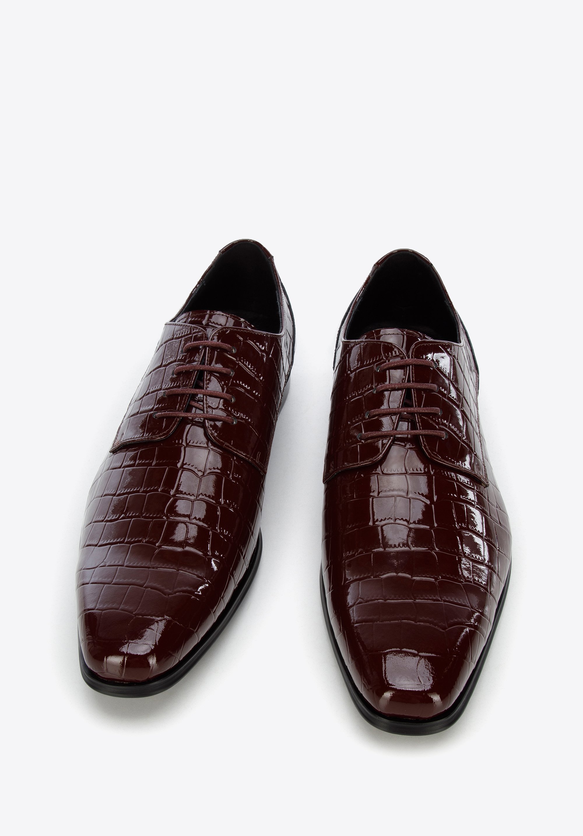 Klasyczny fason typu derby z nowoczesnym wykończeniem, tworzy oryginalny charakter całości. Niezależnie od tego, czy założysz je na ślub, czy wyjście ze znajomymi, w każdej sytuacji będziesz wyglądał wyjątkowo. Męskie derby z lakierowanej skóry o fakturze croco szykownie dopełnią każdy Twój strój.