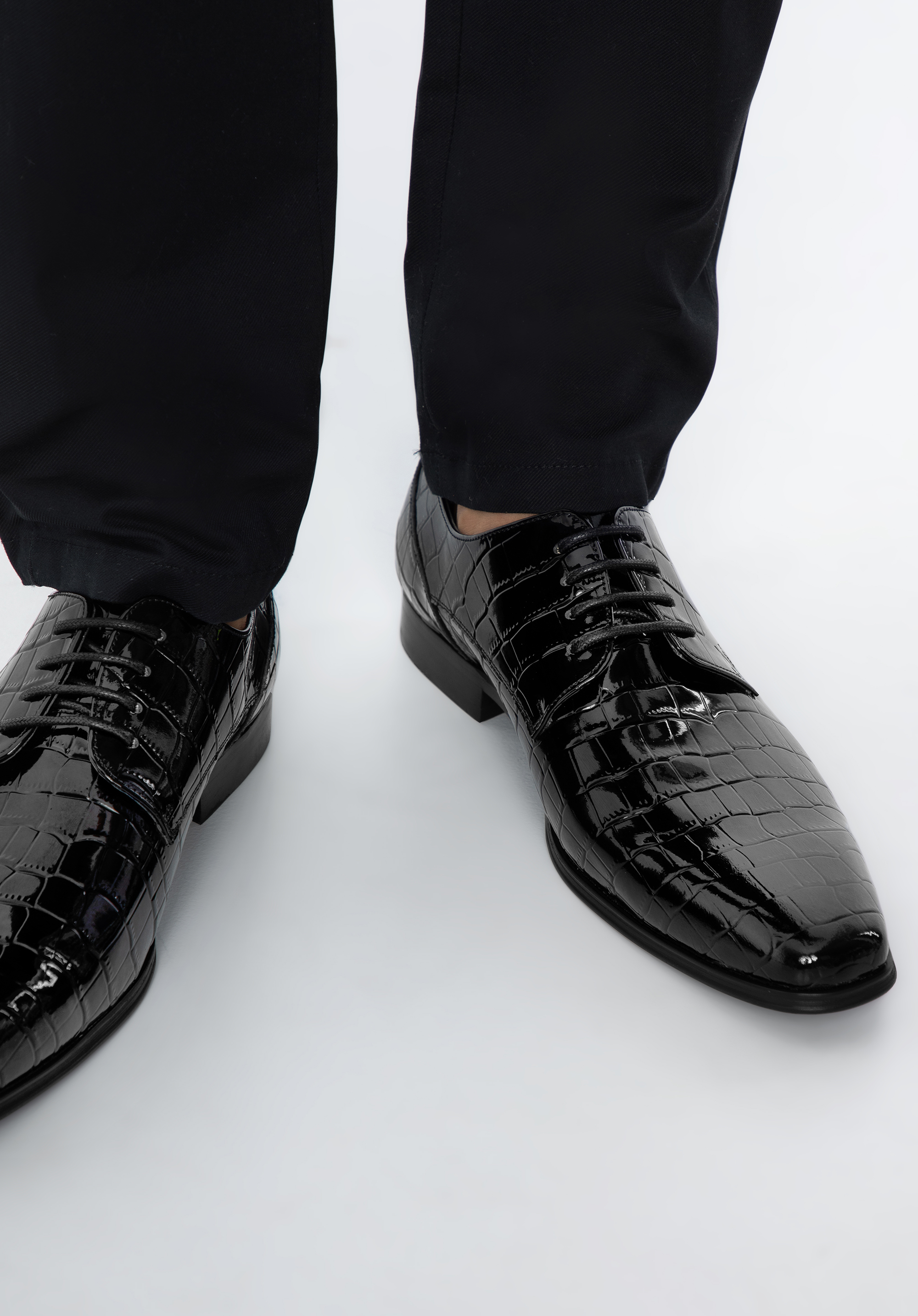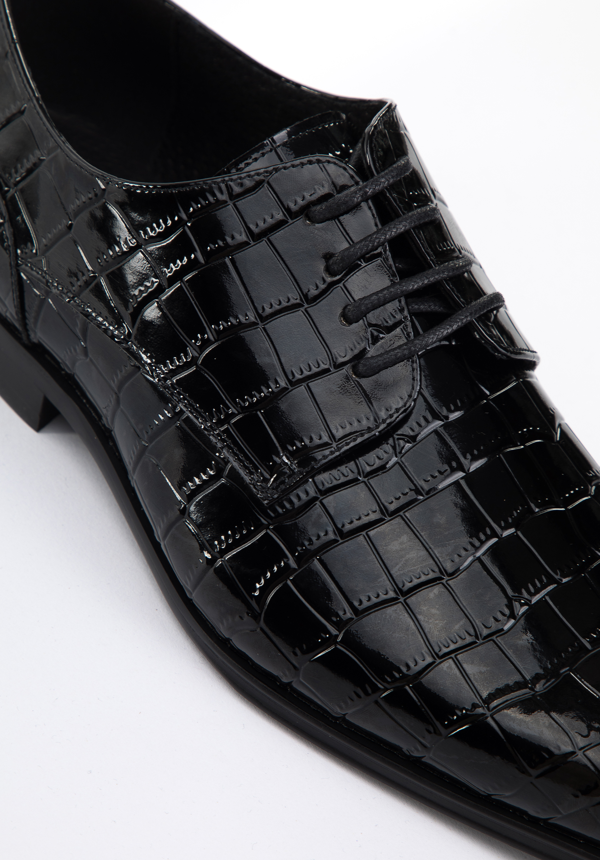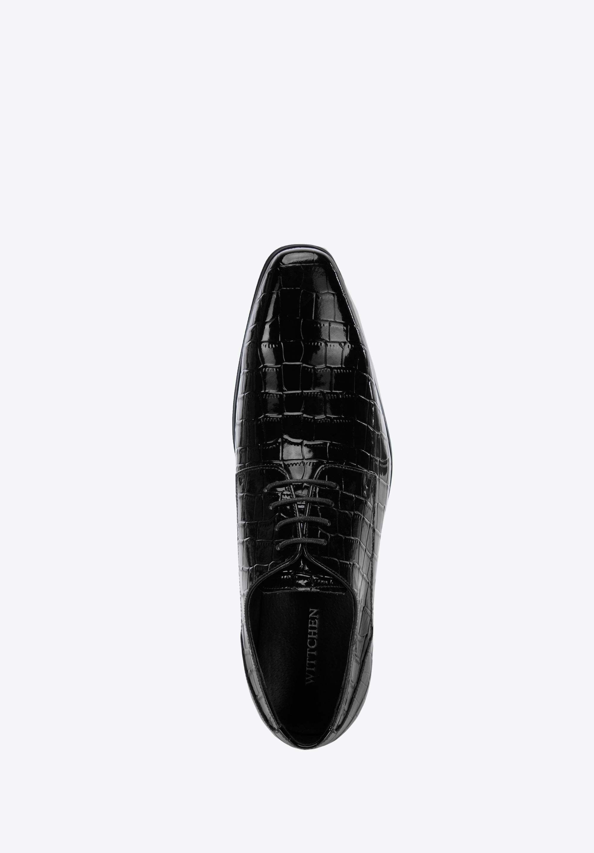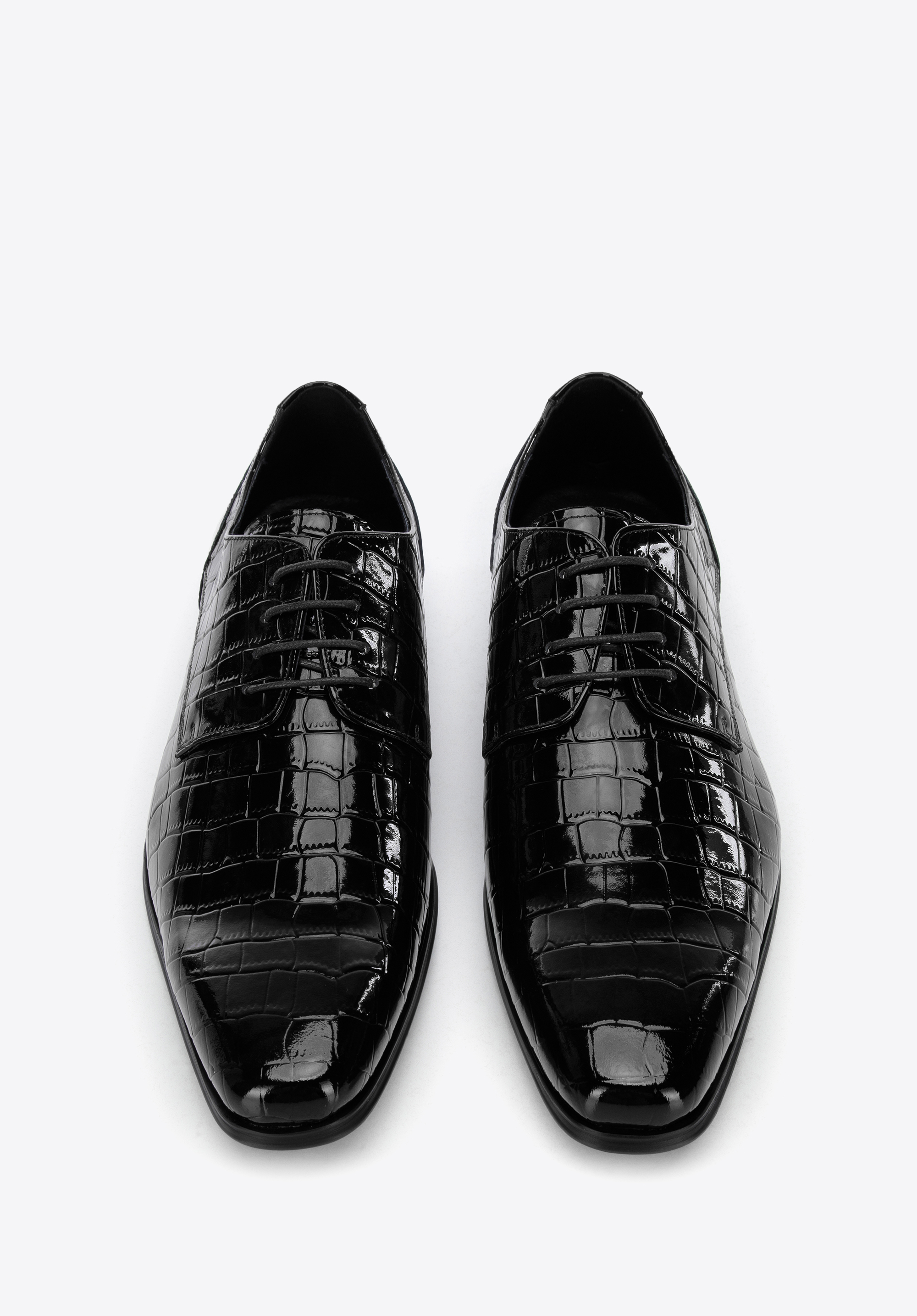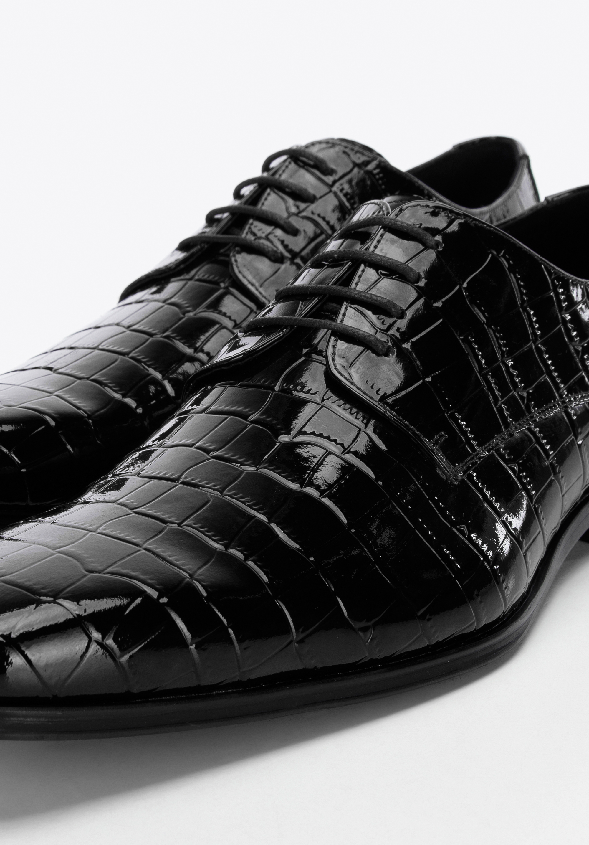 Klasyczny fason typu derby z nowoczesnym wykończeniem, tworzy oryginalny charakter całości. Niezależnie od tego, czy założysz je na ślub, czy wyjście ze znajomymi, w każdej sytuacji będziesz wyglądał wyjątkowo. Męskie derby z lakierowanej skóry o fakturze croco szykownie dopełnią każdy Twój strój.