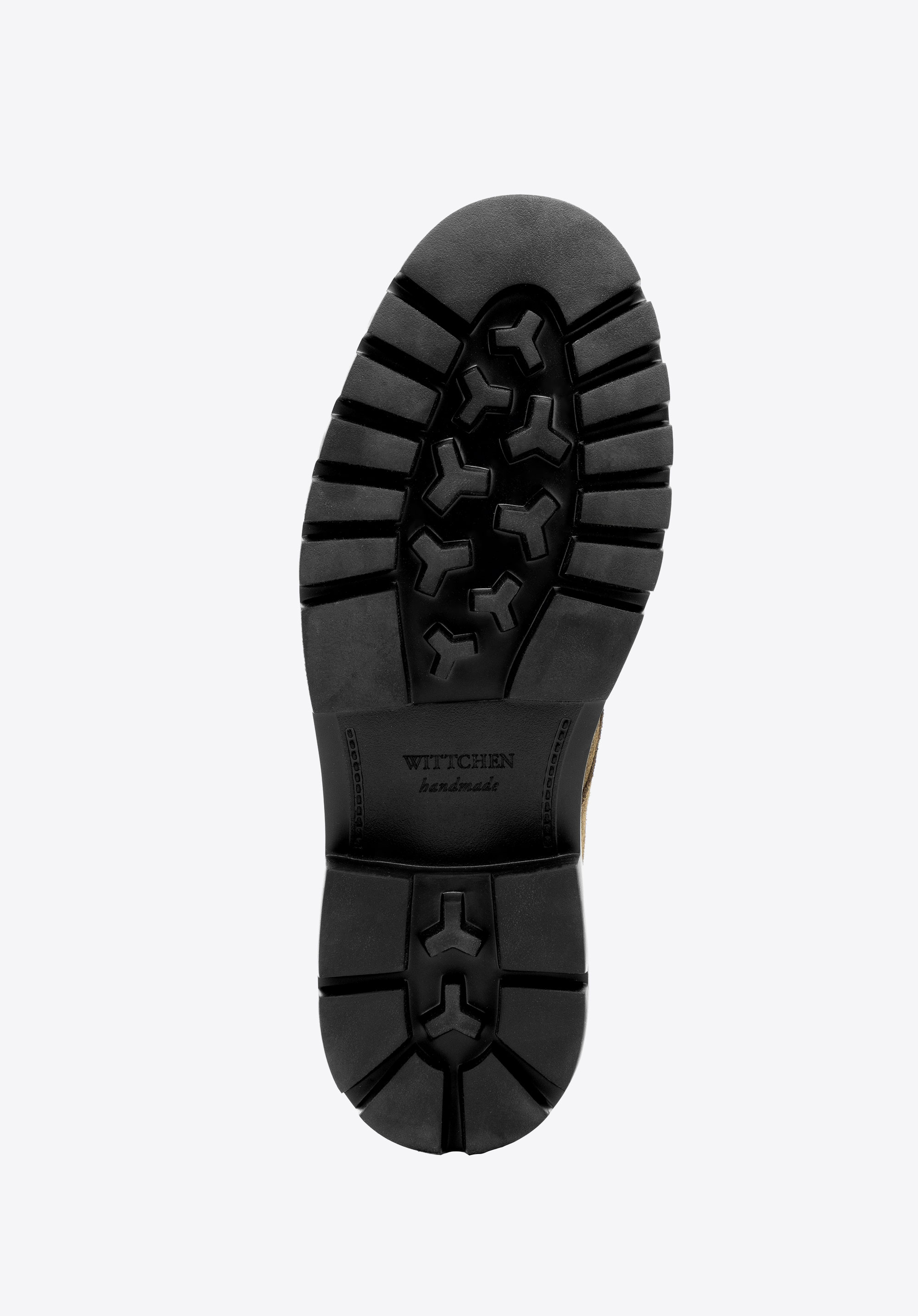 Postaw na połączenie klasyki i nowoczesnego designu z naszymi męskimi półbutami ze skóry zamszowej. Stylowe przeszycia i okrągły nosek nadają butom uniwersalny charakter, dzięki czemu doskonale sprawdzą się zarówno w formalnych, jak i casualowych stylizacjach. Podeszwa typu track zapewnia stabilność i pewny krok, a jednocześnie dodaje subtelnego akcentu, który odświeża klasyczny look.