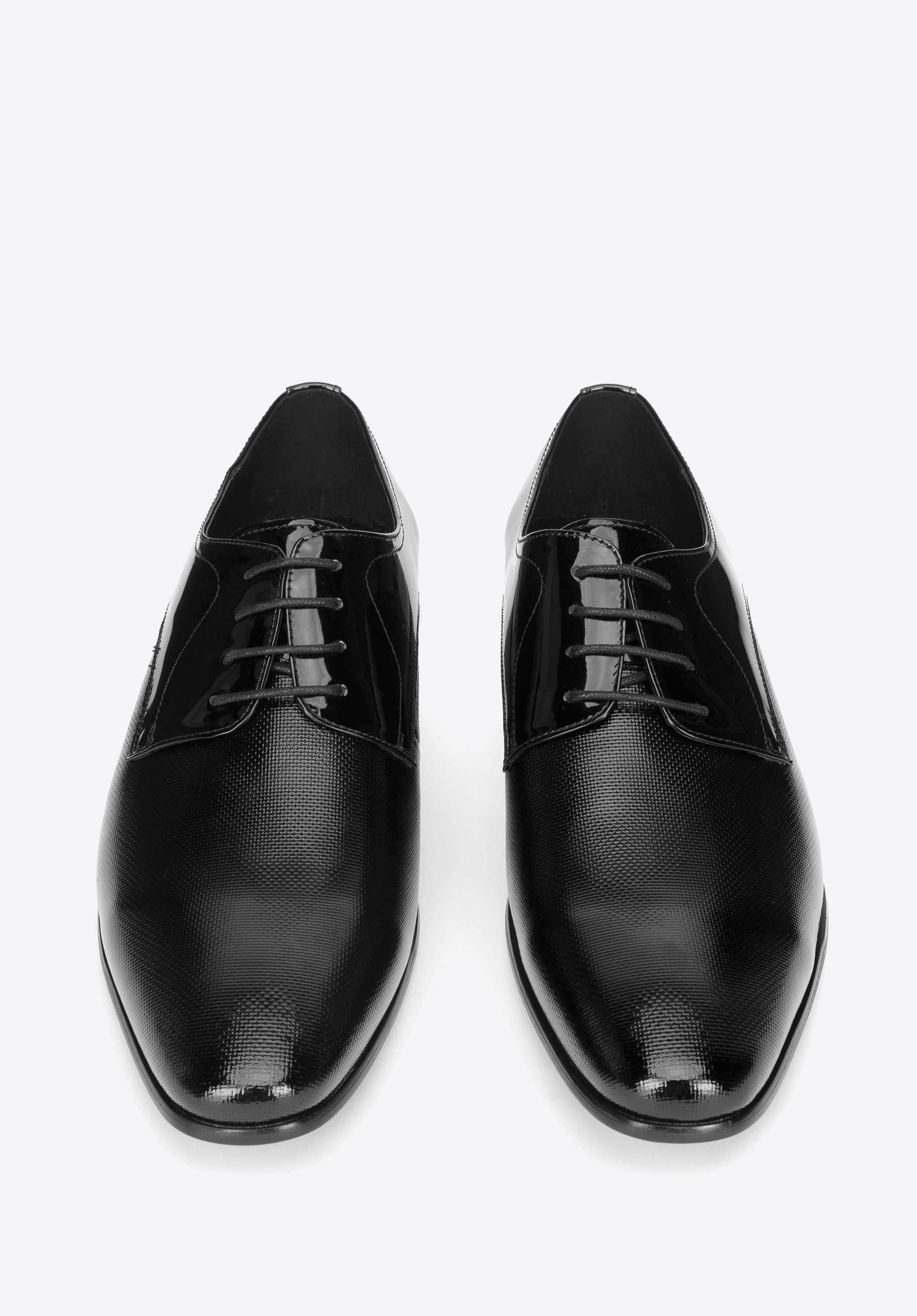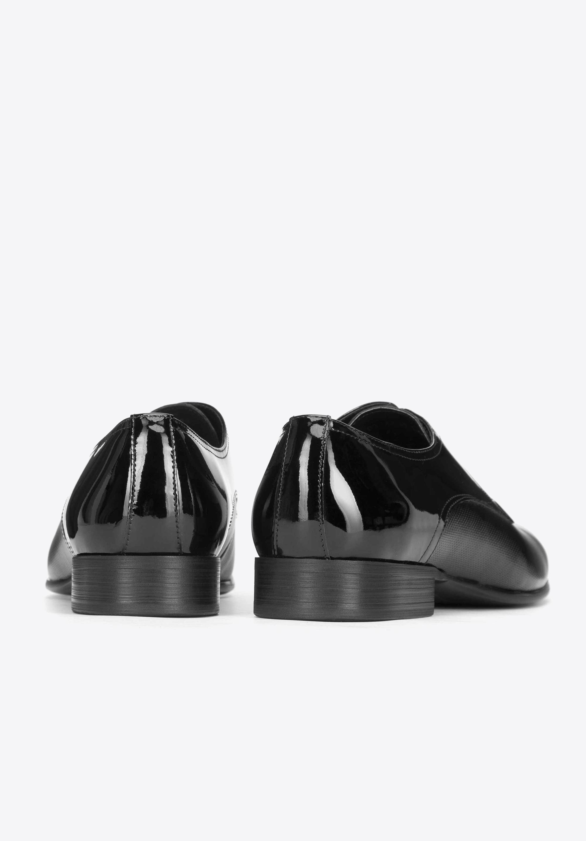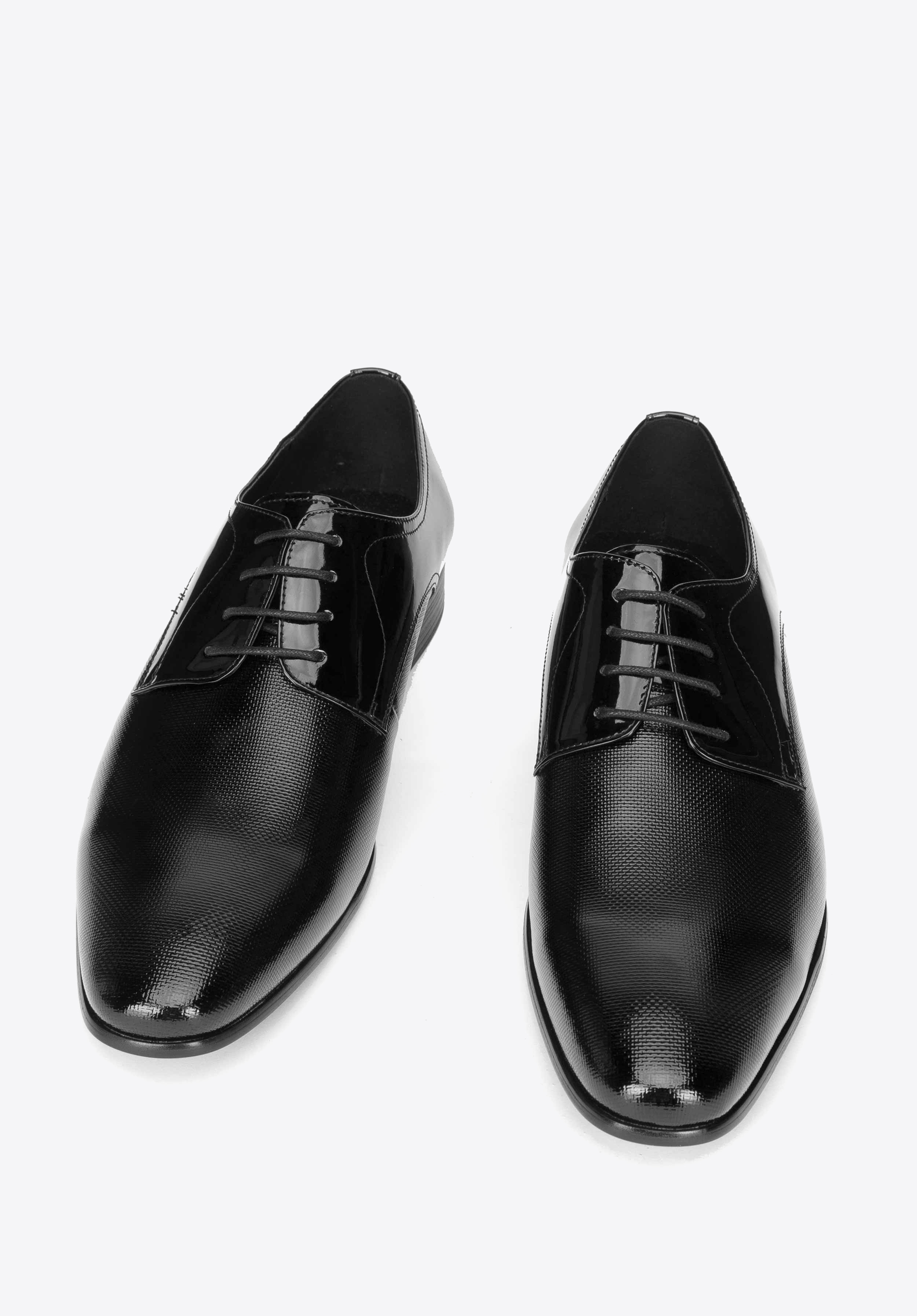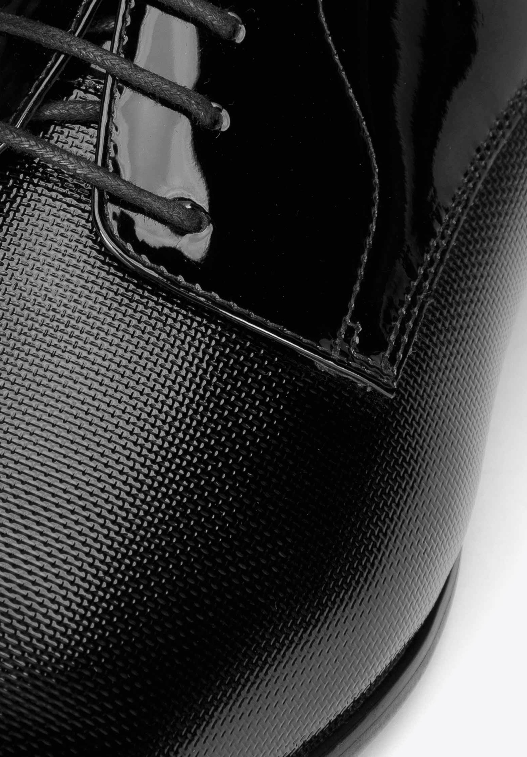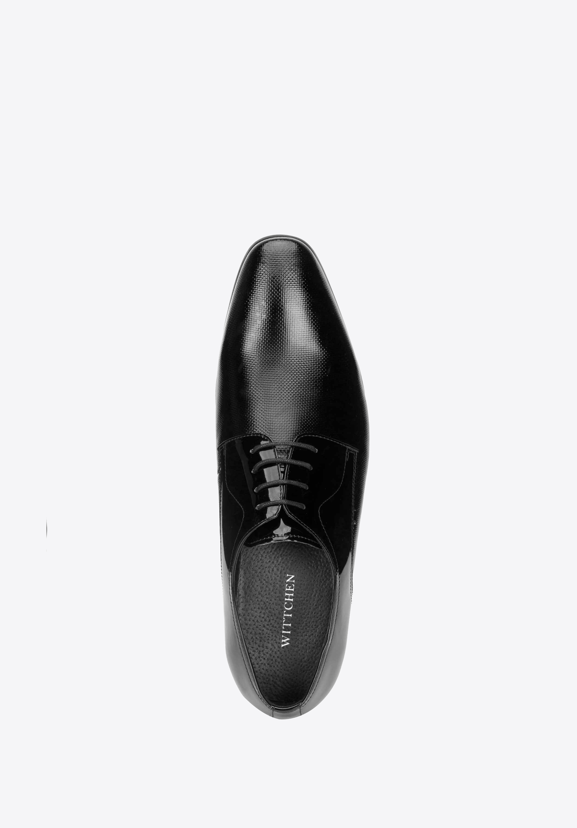 Klasyczne skórzane buty o ponadczasowym kroju derby. Odnajdą się w szafie mężczyzny, który zgadza się z powiedzeniem, że mniej znaczy więcej. Uszyte zostały z wysokiej jakości lakierowanej skóry naturalnej. Mają charakterystyczną dla tego modelu otwartą przyszwę i ponadczasowy, wysmukły profil. Migdałowy nosek buta w dyskretny sposób wyszczupli stopę i nada tym samym całej sylwetce właściwych proporcji. Te minimalistyczne męskie derby ze skóry lakierowanej posłużą Ci przez długi czas, będąc jednocześnie zawsze na czasie. Założysz je zarówno na swój ślub, wesele przyjaciela, jak i spotkanie biznesowe.