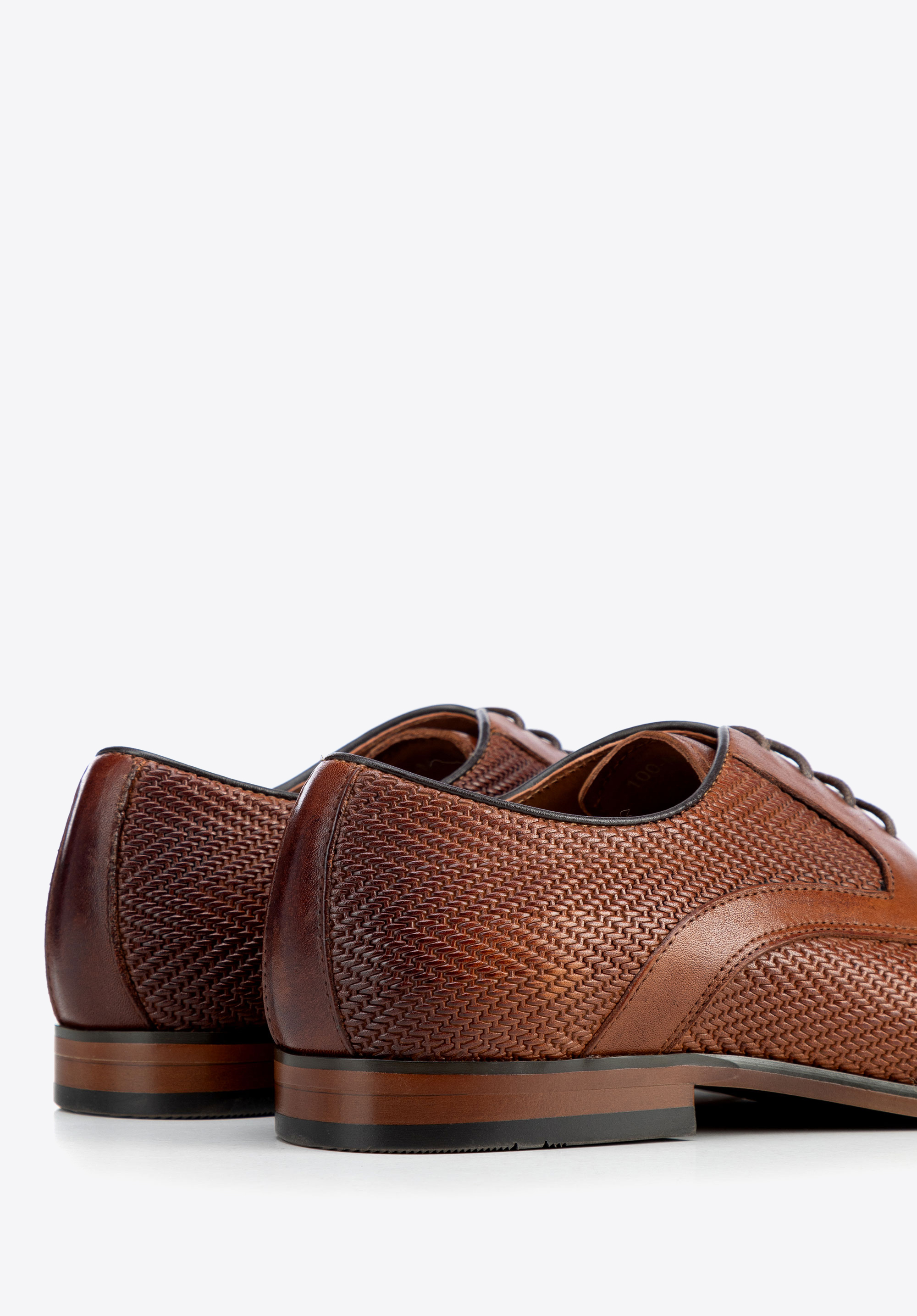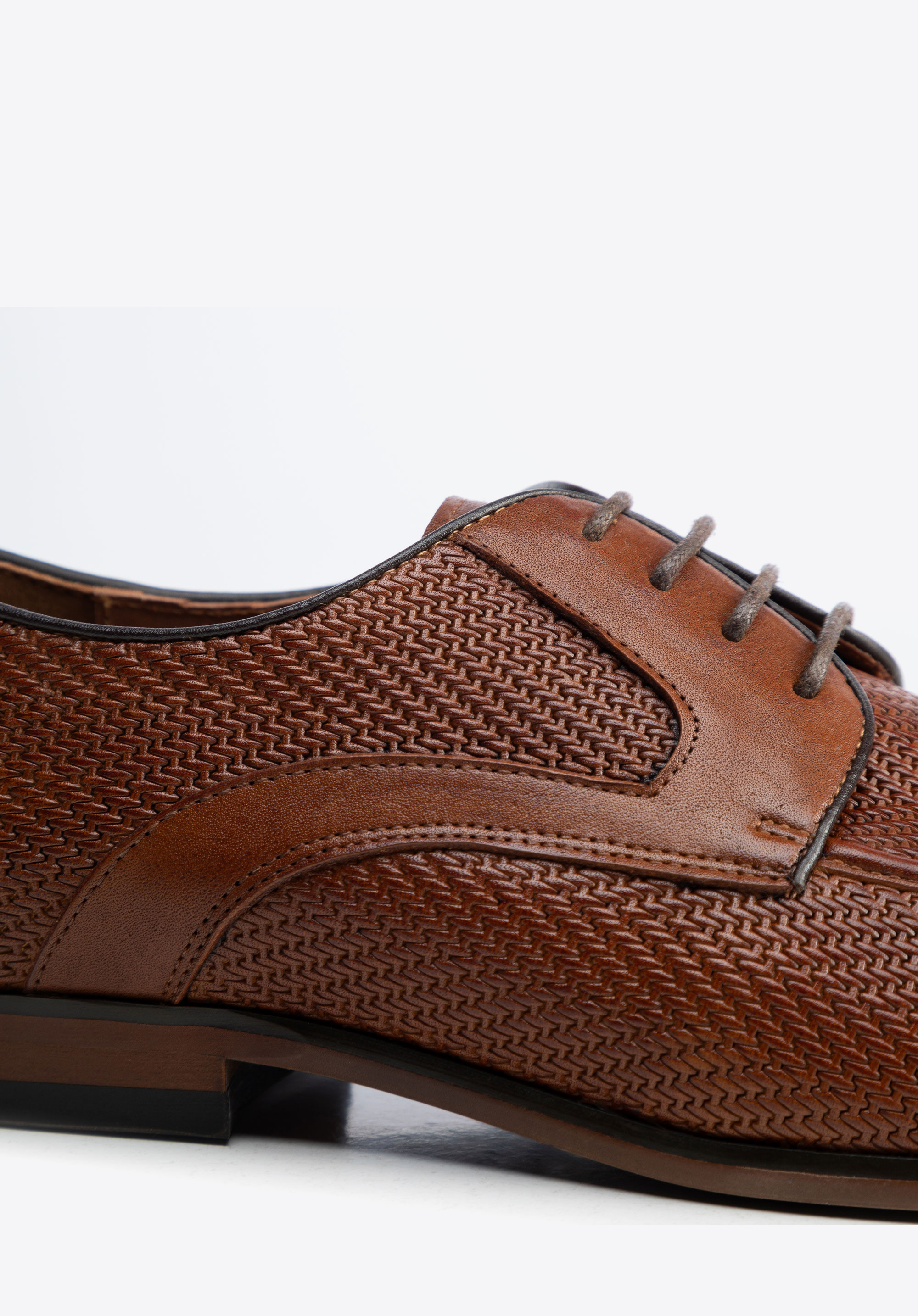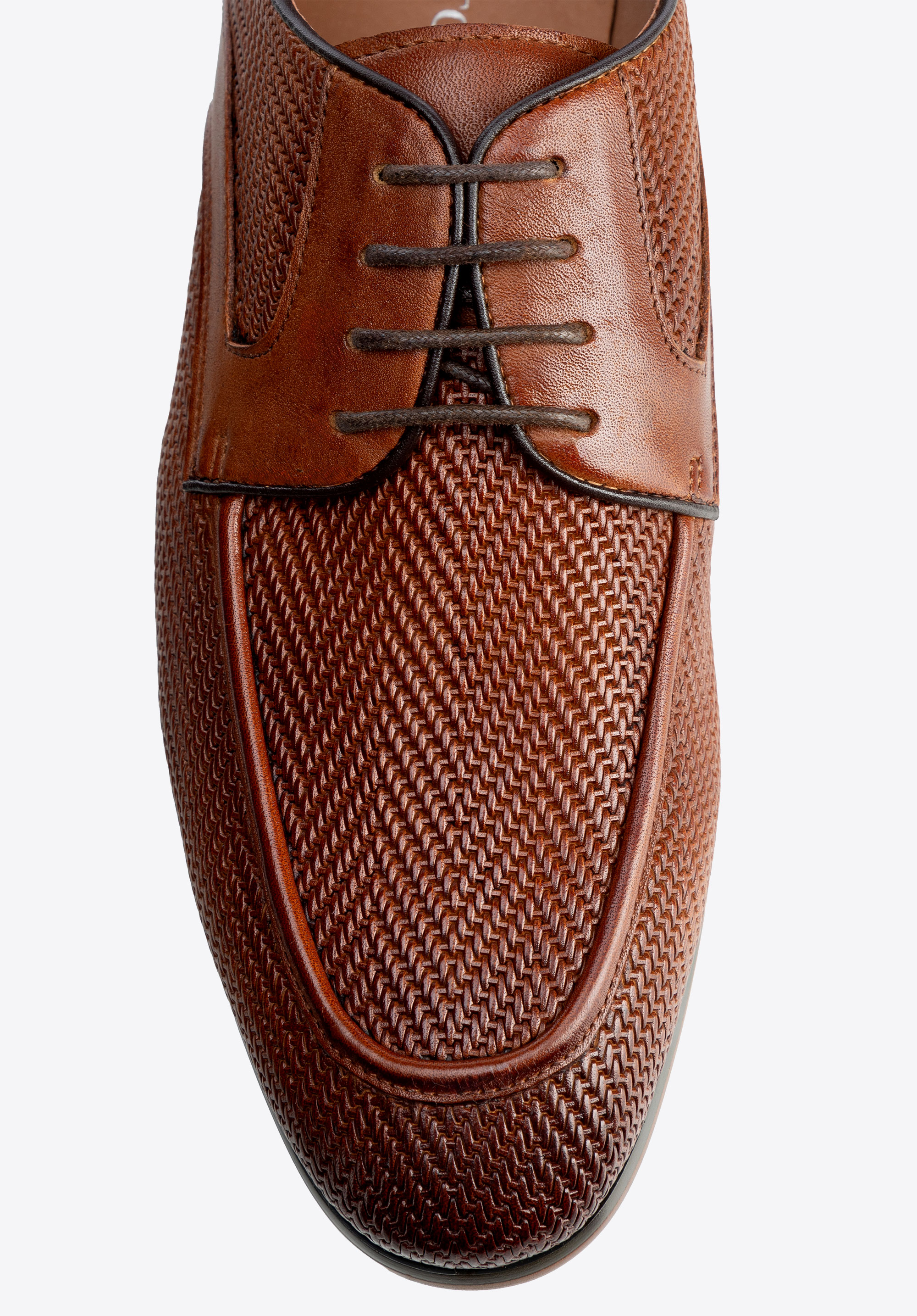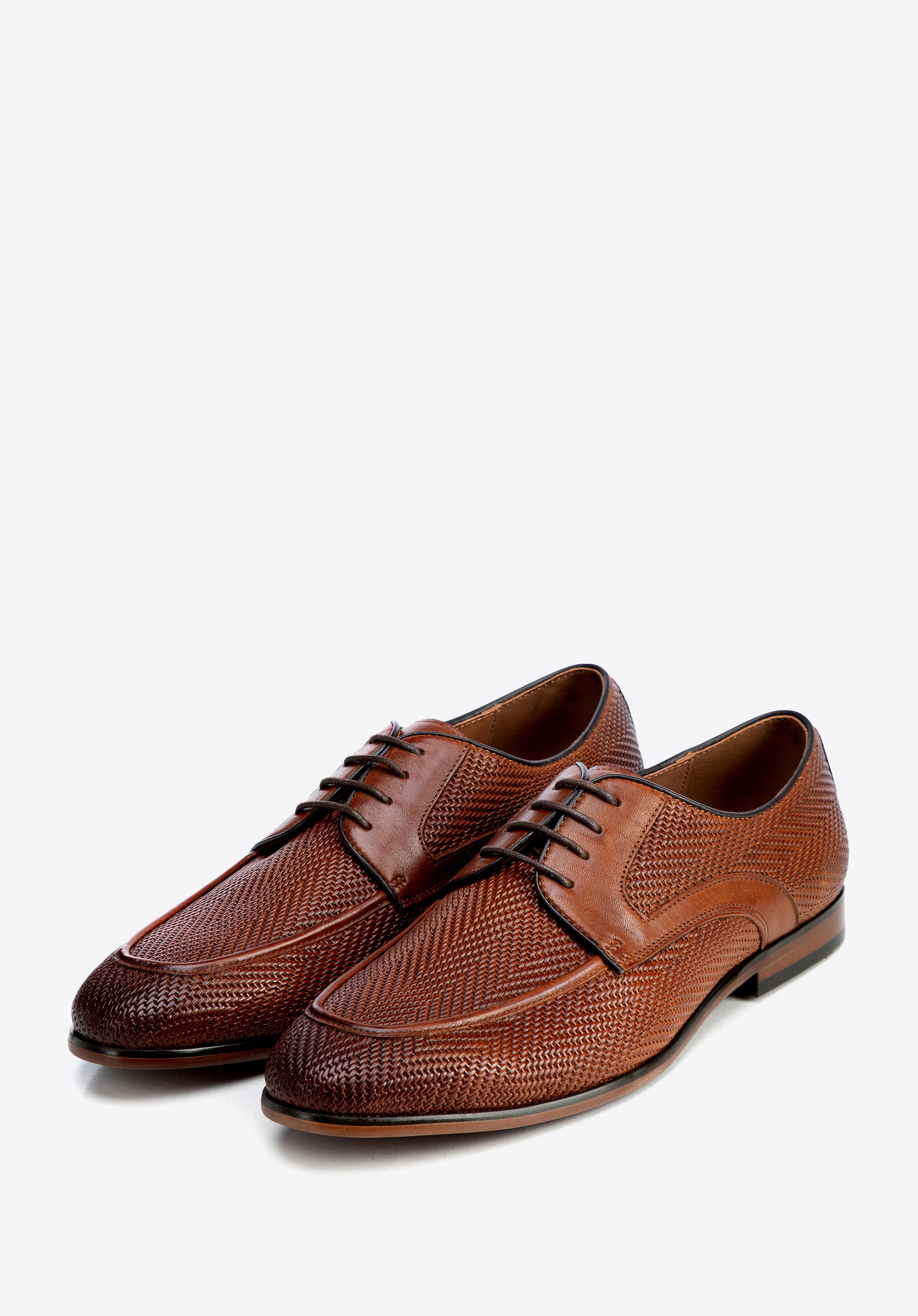 Męskie derby ze skóry naturalnej z plecionką będą idealne do garnituru i chinosów, jeśli chcesz klasykę z nowoczesnym twistem. Otwarta przyszwa, migdałowy nosek, pleciony wzór w jodełkę, sznurowanie dla dopasowania oraz skórzana wkładka i gumowa podeszwa na cały dzień.
