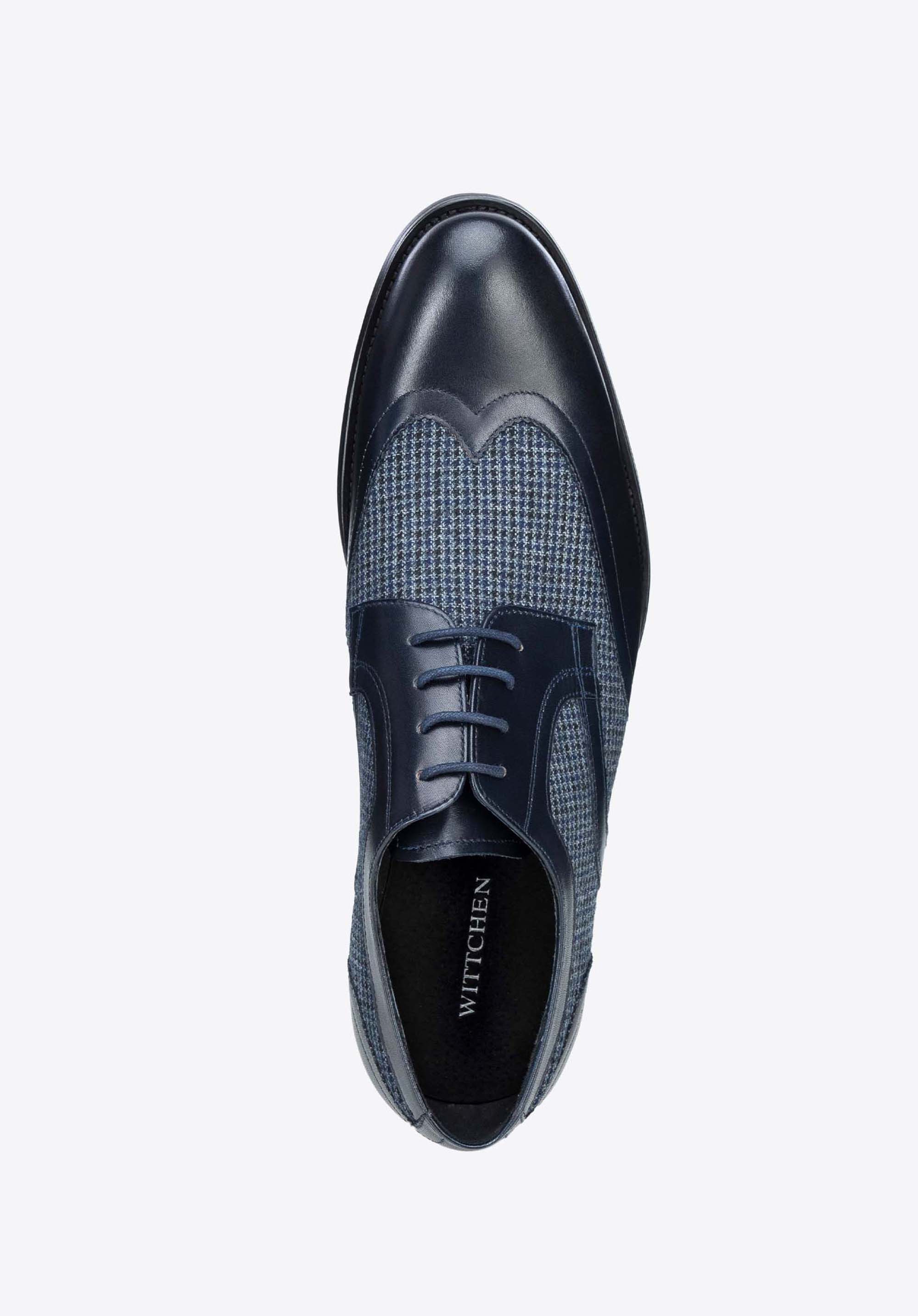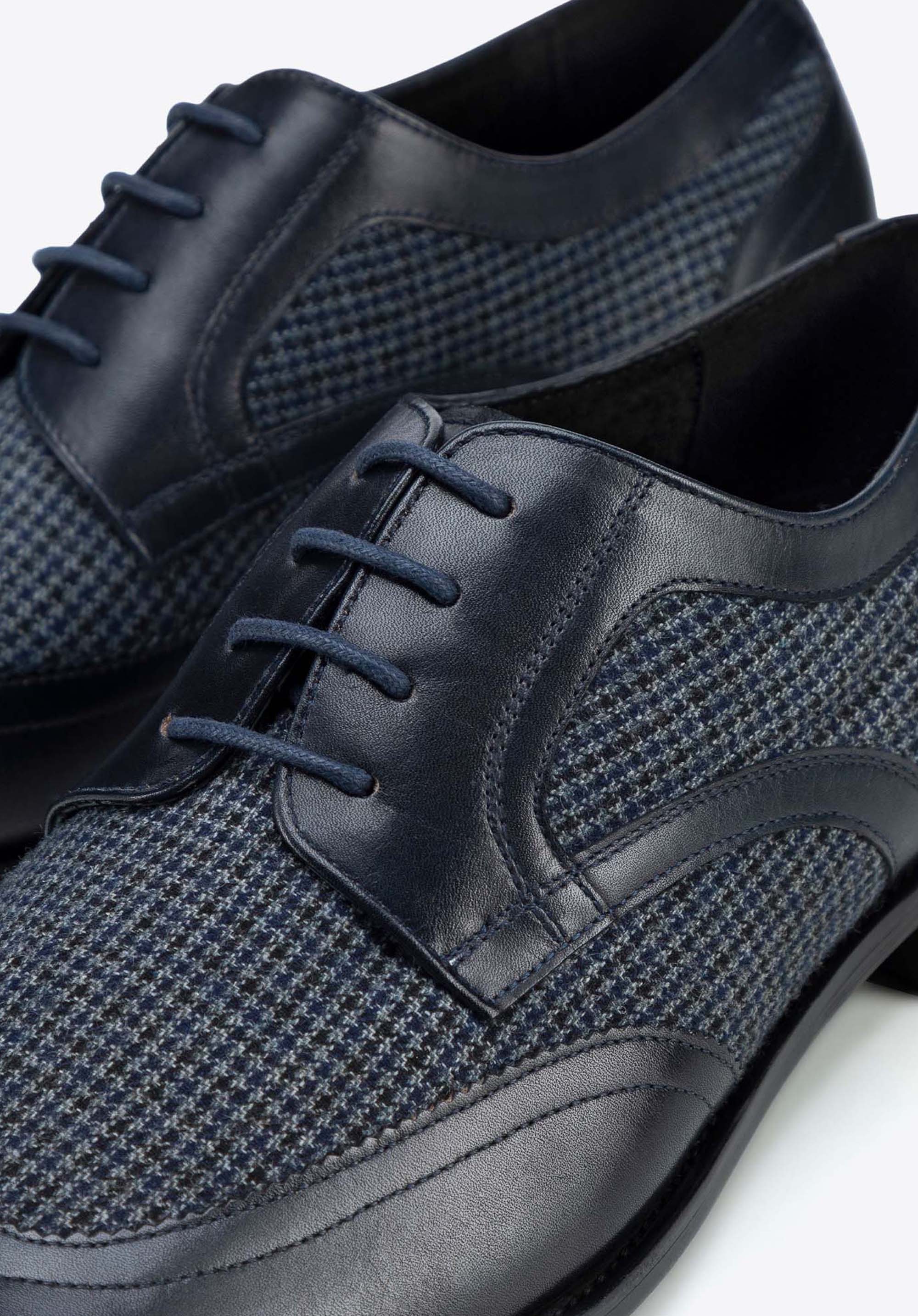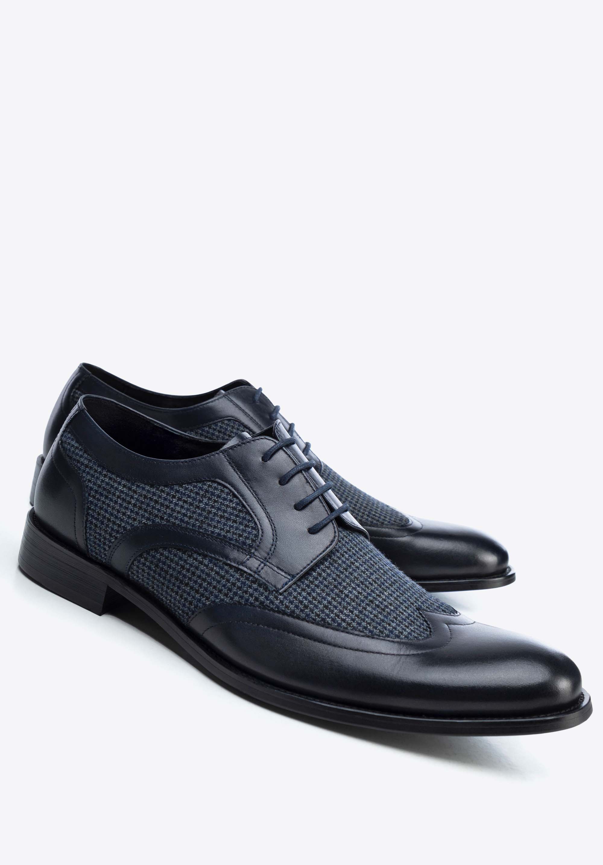 Męskie derby ze skóry z tekstylnymi wstawkami granatowe