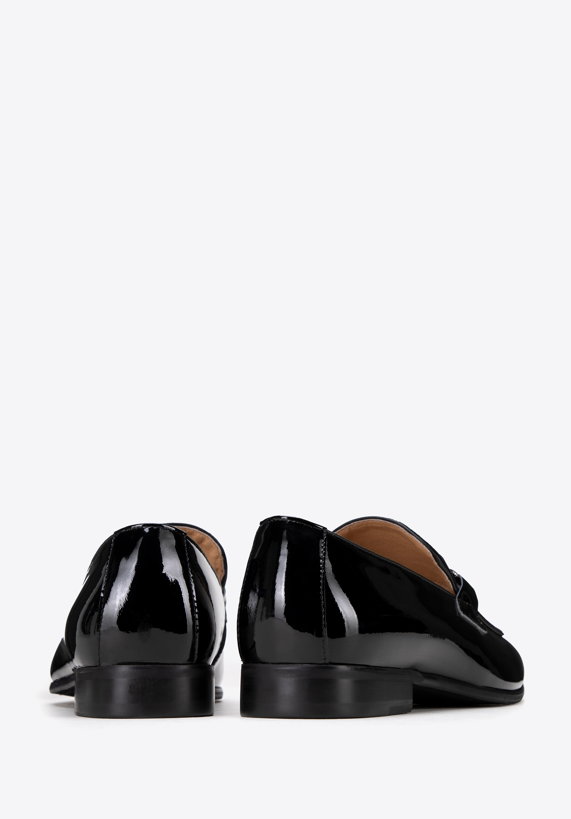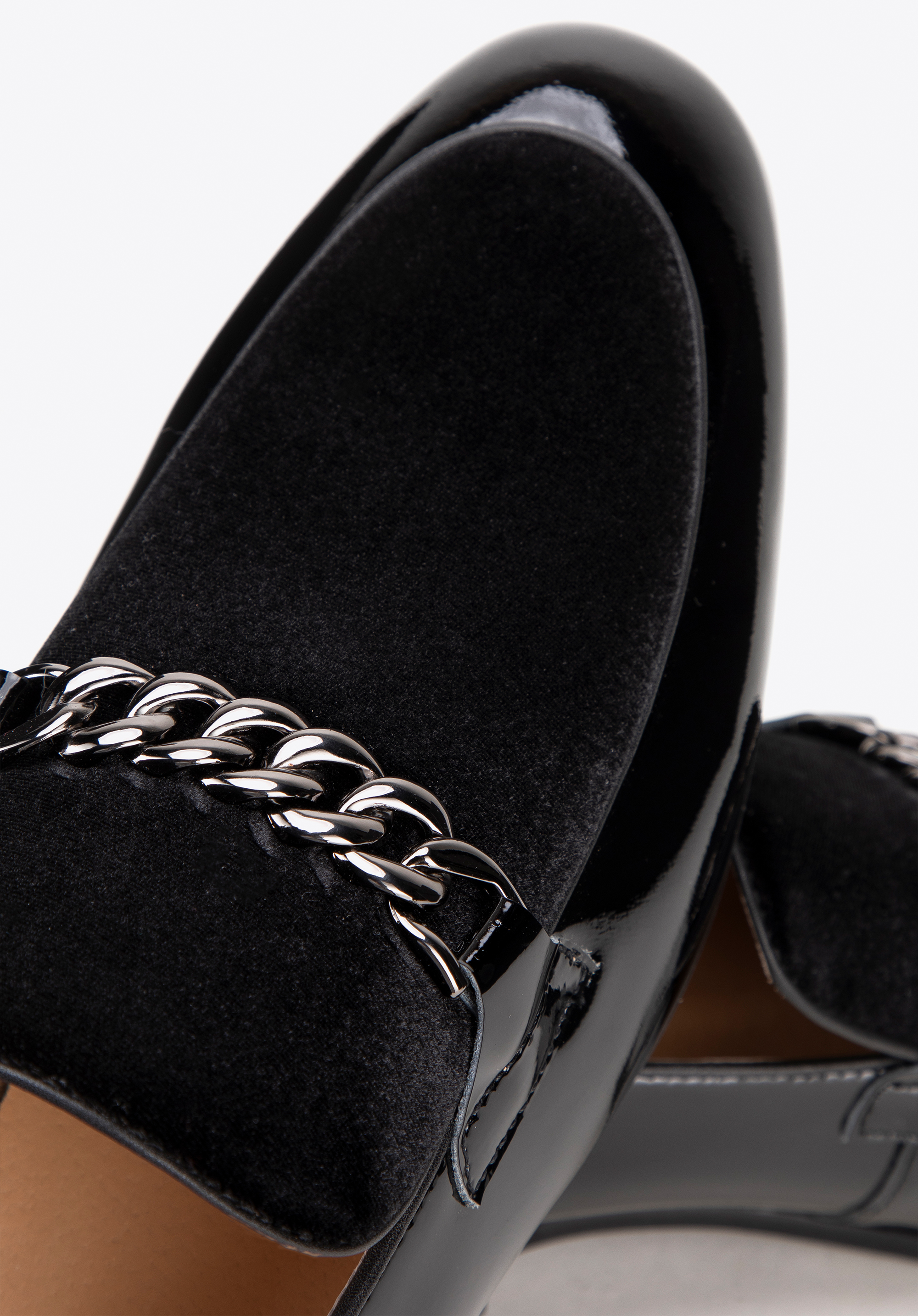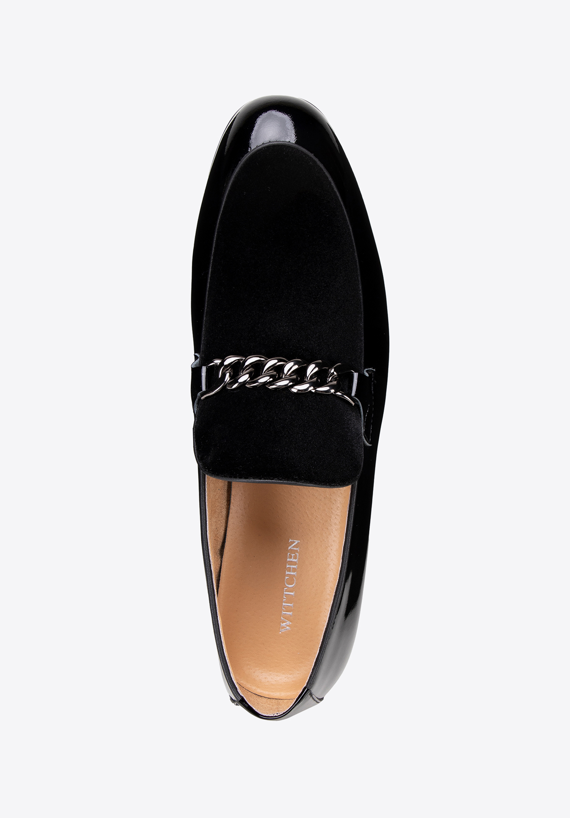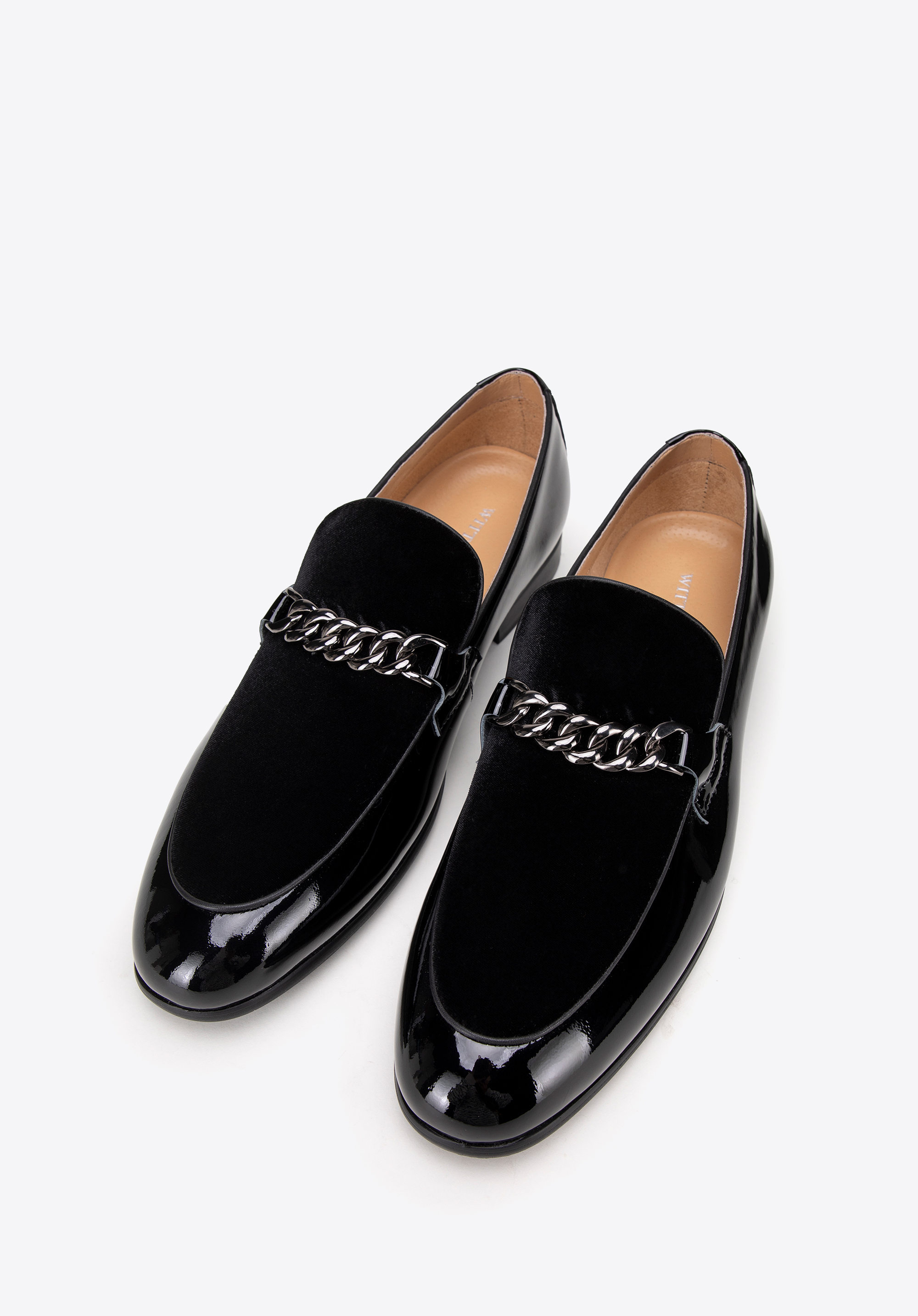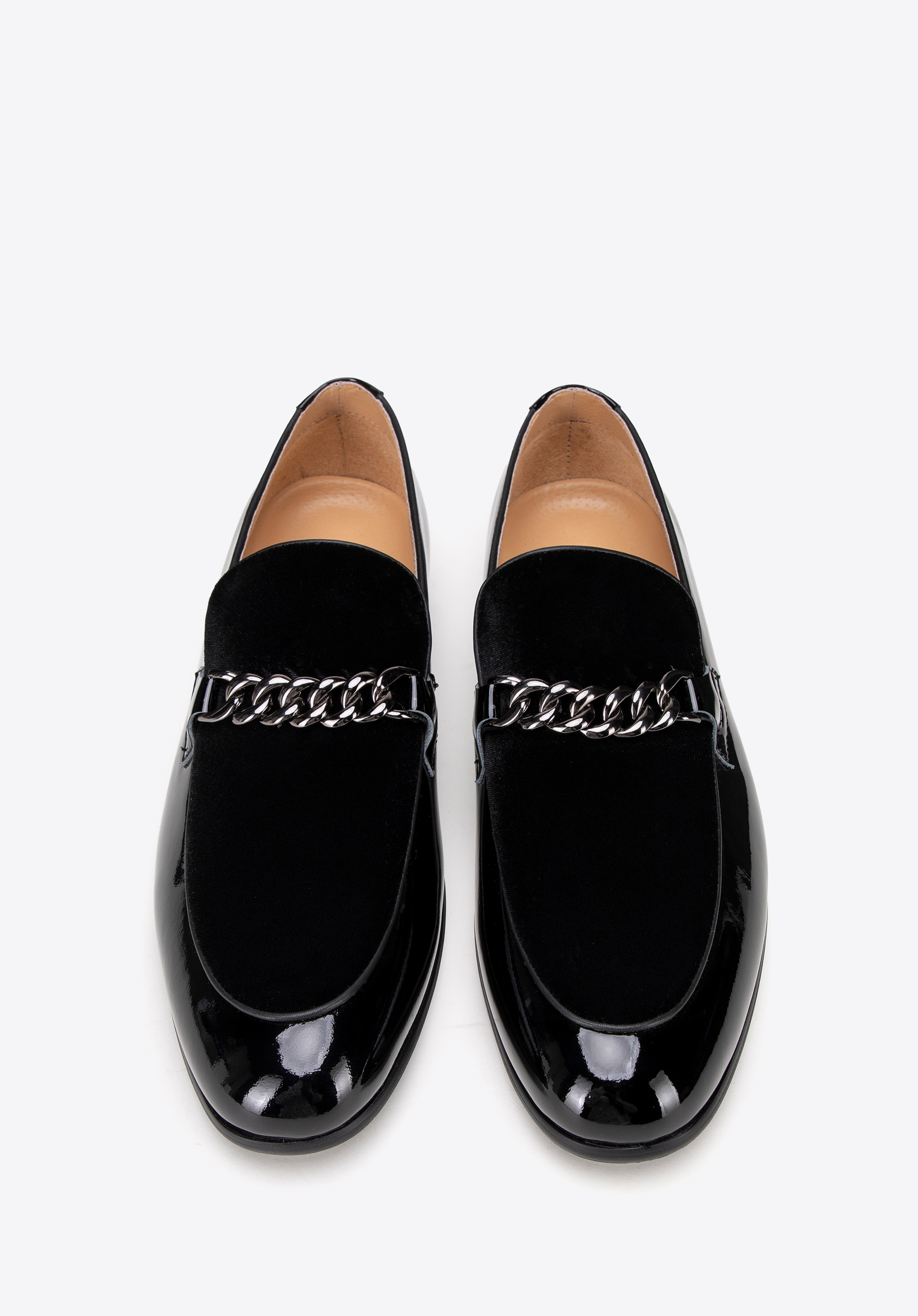 Zanurz się w świecie luksusu, dzięki kolekcji męskich skórzanych mokasynów. Te buty są nie tylko symbolem elegancji, ale także połączenie wysokiej jakości materiałów i perfekcyjnego wykończenia. Wykonane z naturalnej skóry lakierowanej prezentują się niezwykle ekskluzywnie, przyciągając wzrok swoim połyskiem. O maksymalny komfort i idealne dopasowanie do stopy dba skórzana wyściółka, a solidna podeszwa butów zapewnia stabilność i pewność każdego kroku, niezależnie od nawierzchni. Klasyczny model, z eleganckim noskiem o migdałowym kształcie i praktycznym wsuwanym fasonie, umożliwia łatwe zakładanie i zdejmowanie butów. Dodatkowym elementem, podkreślającym wyjątkowy styl tych butów, jest dekoracyjny łańcuch na przodzie, który doskonale komponuje się ze lakierowaną skórą.